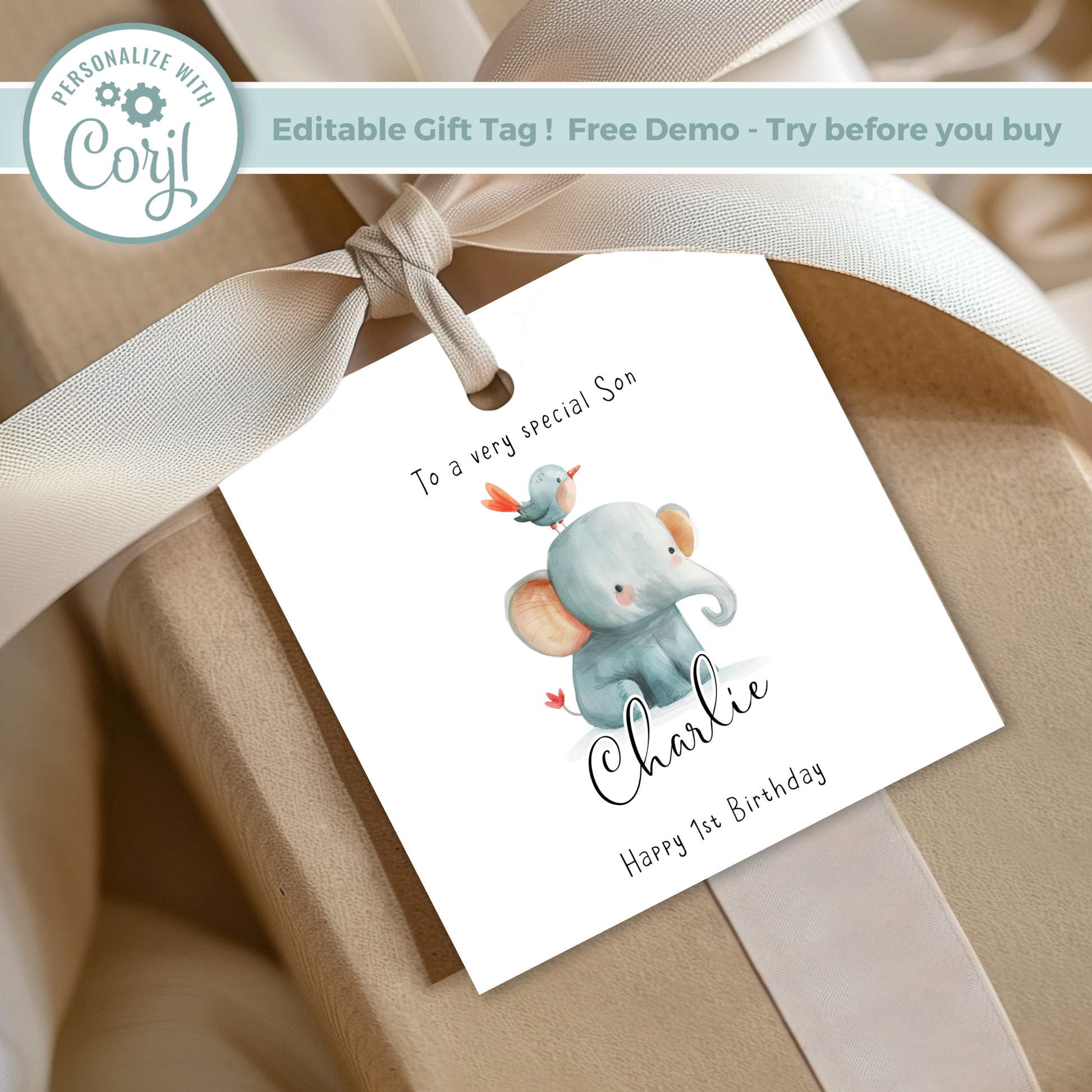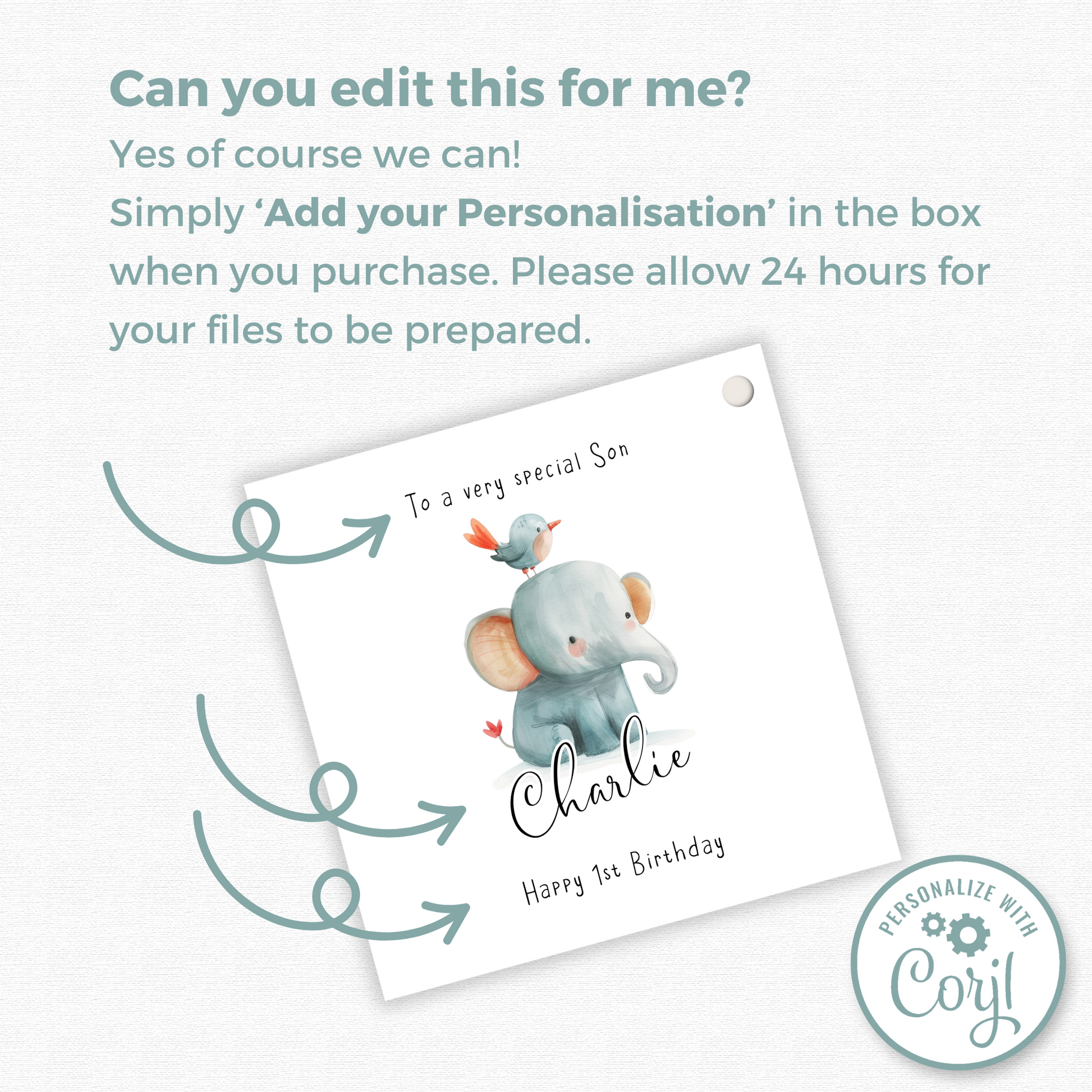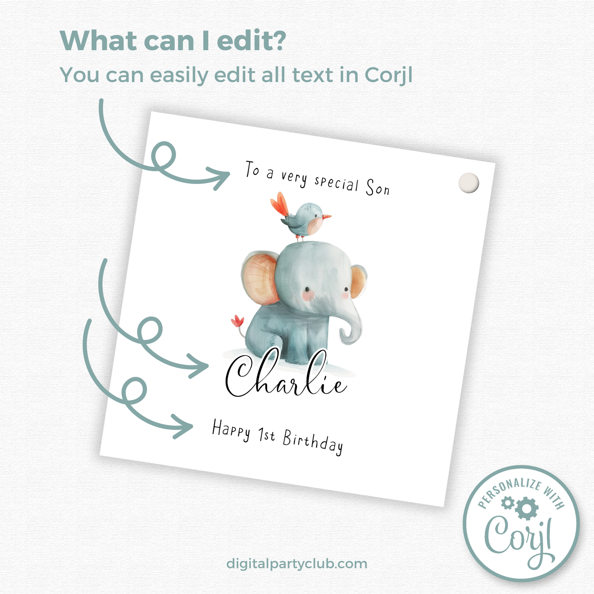 Make your gift extra special with this adorable Editable Elephant Birthday Gift Tag! Perfect for a 1st birthday, this cute watercolour design can be easily personalised with your child's name and a sweet message using Corjl.