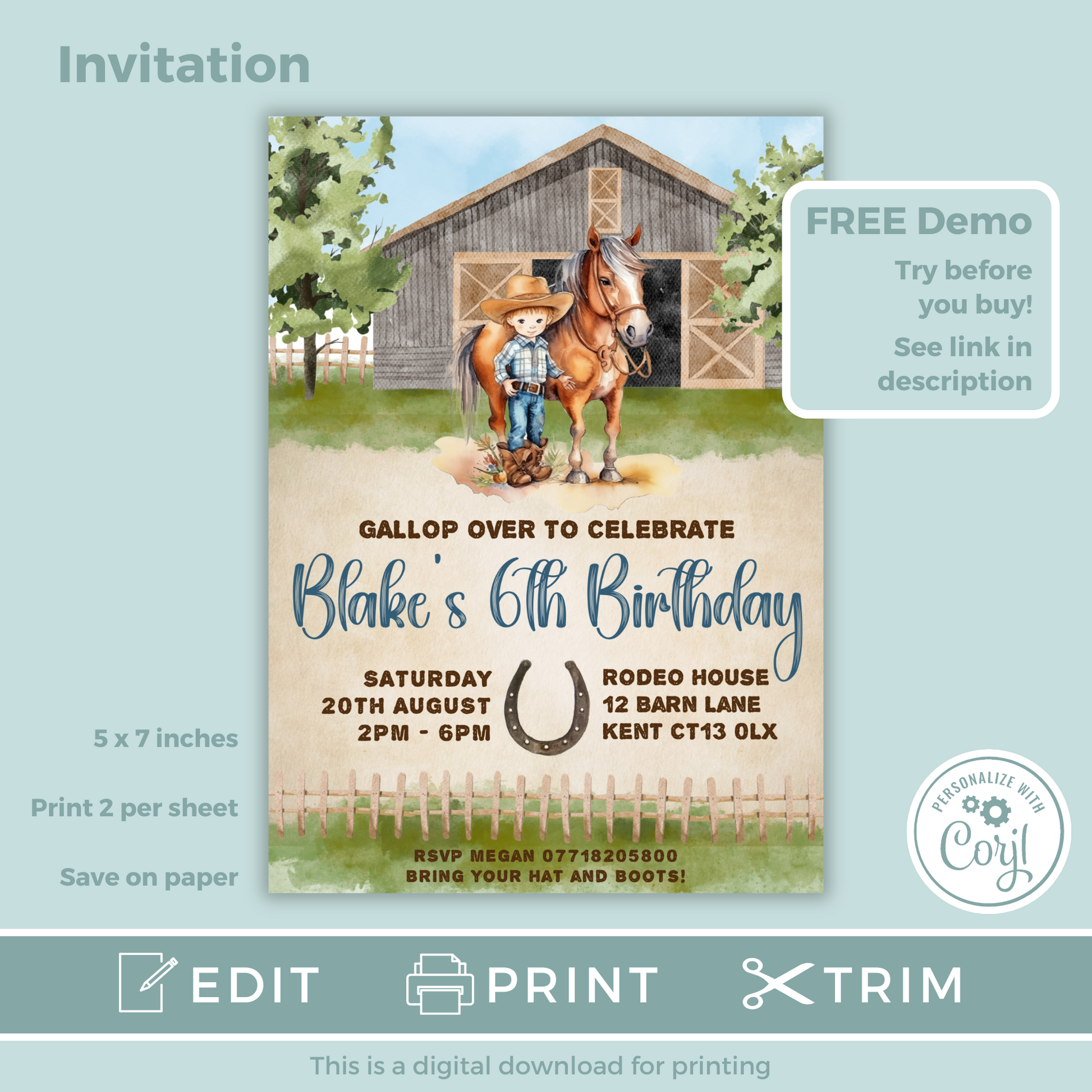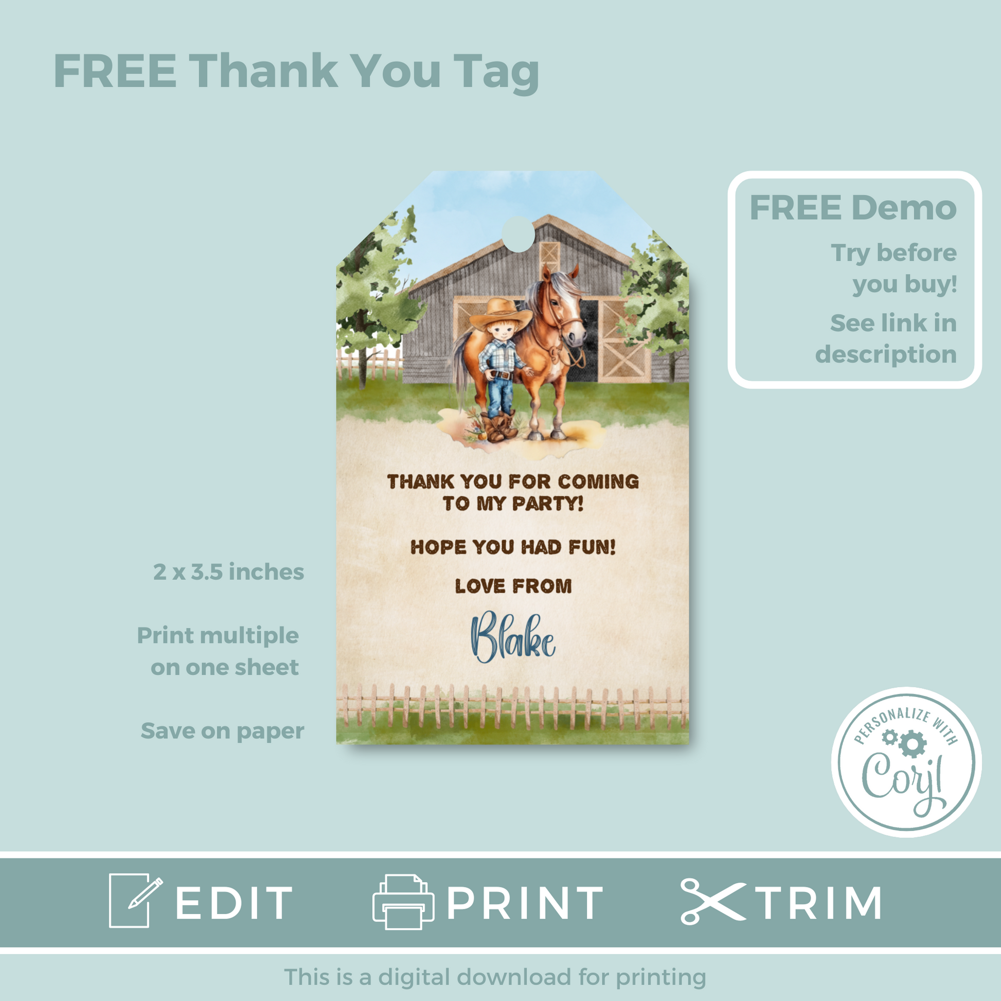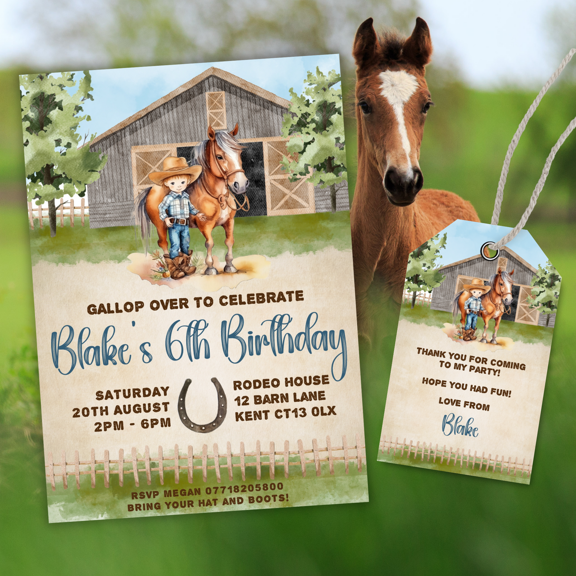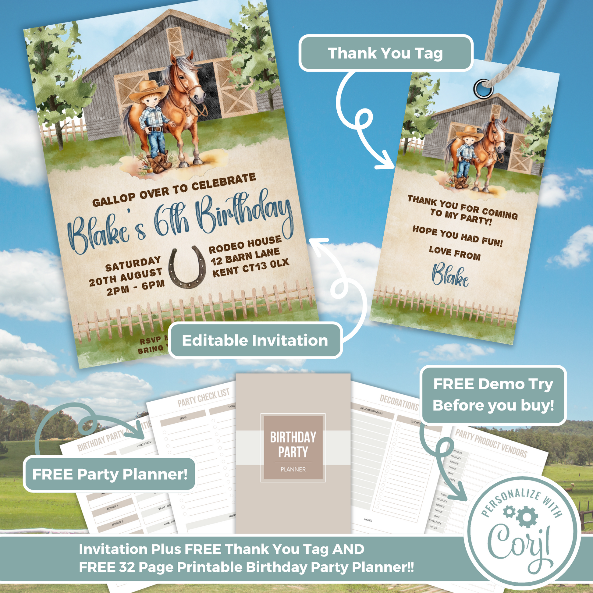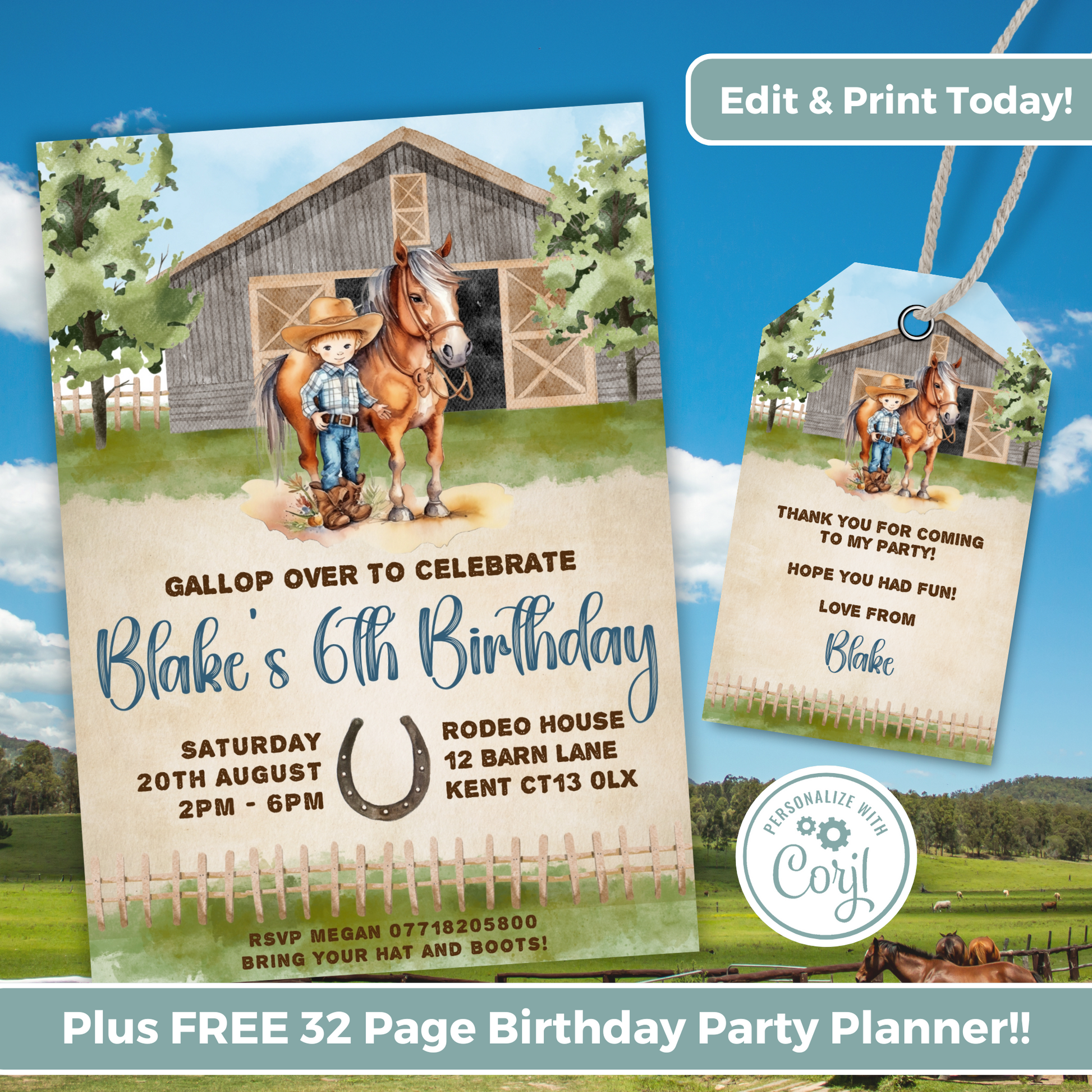 Editable Birthday Invitation and FREE Thank You Tag - Cowboy