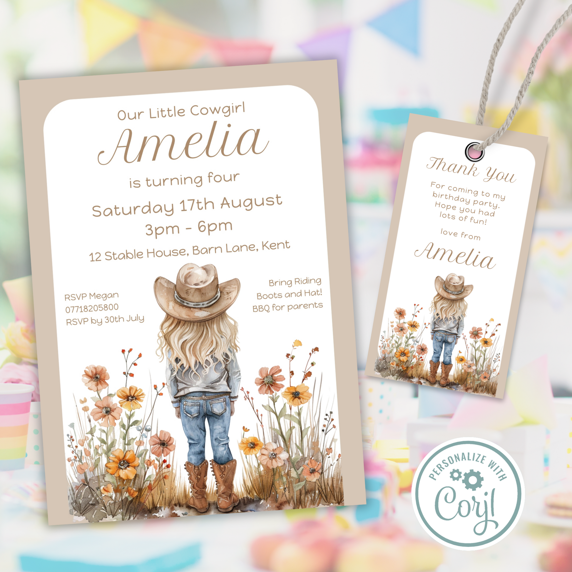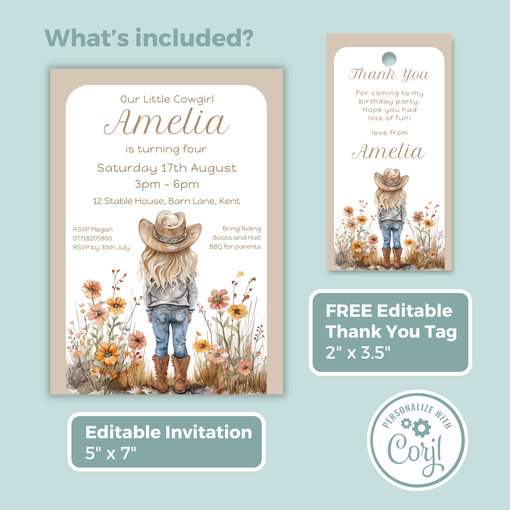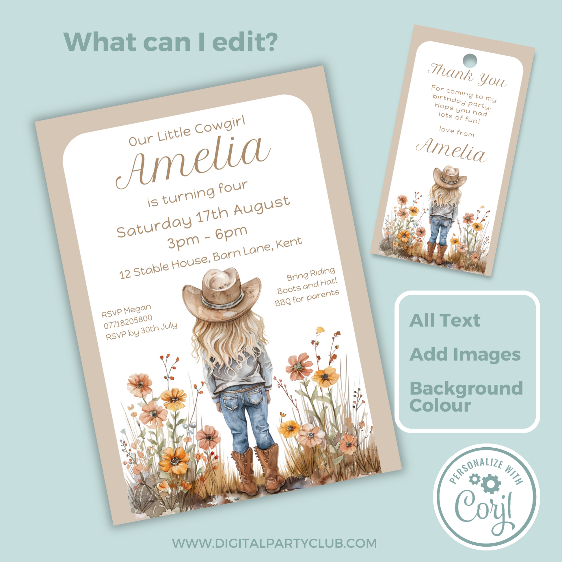Editable Birthday Invitation and FREE Thank You Tag - Cowgirl Beige