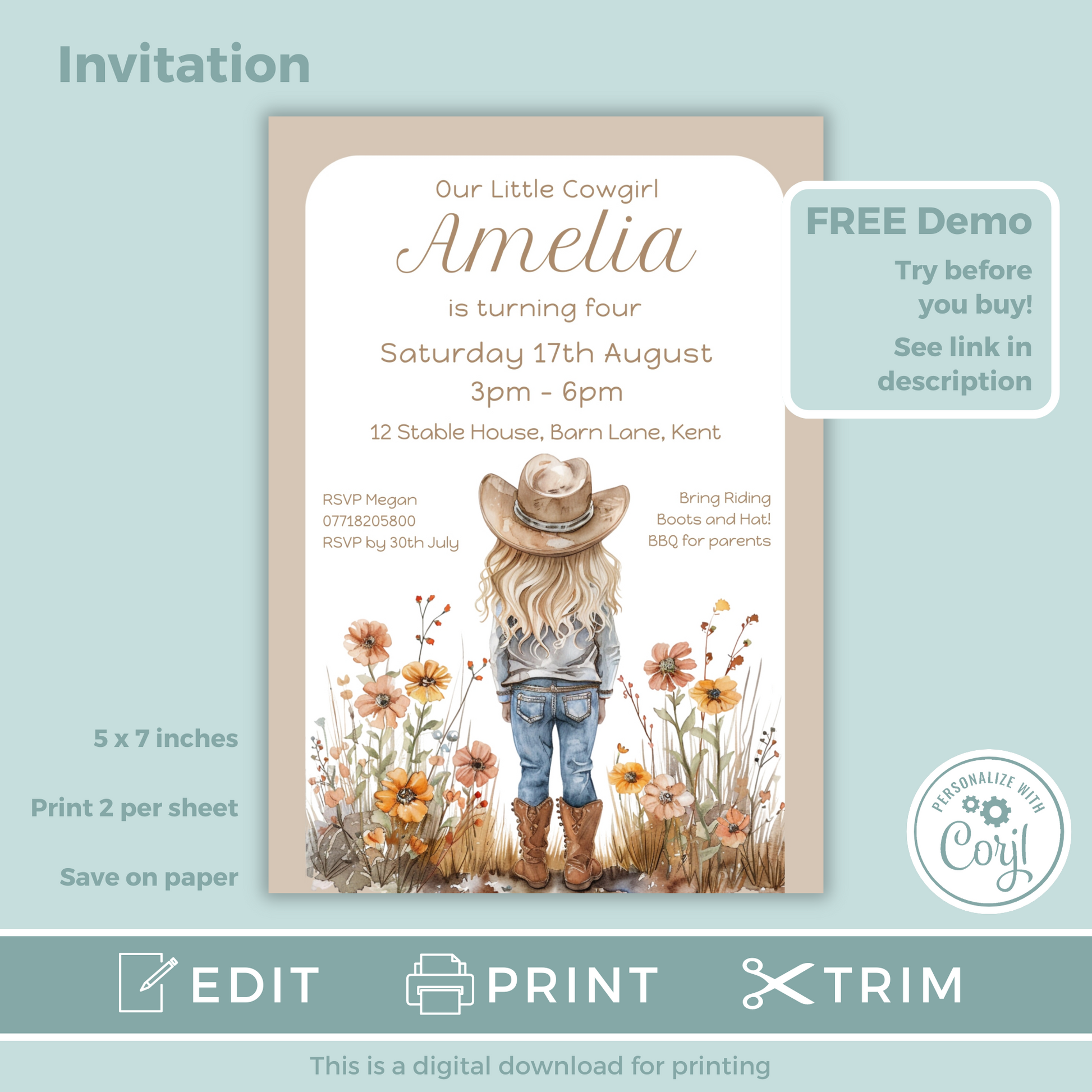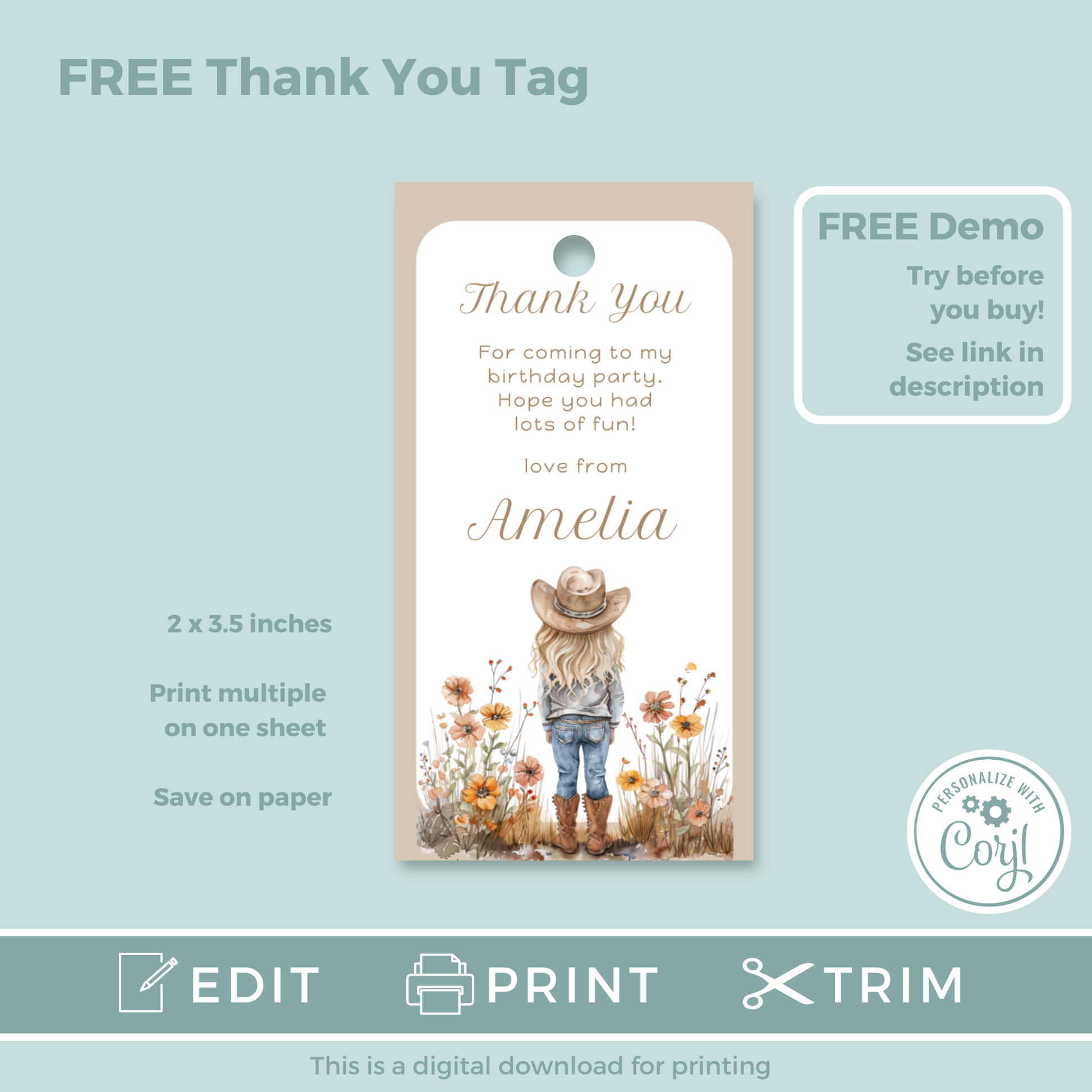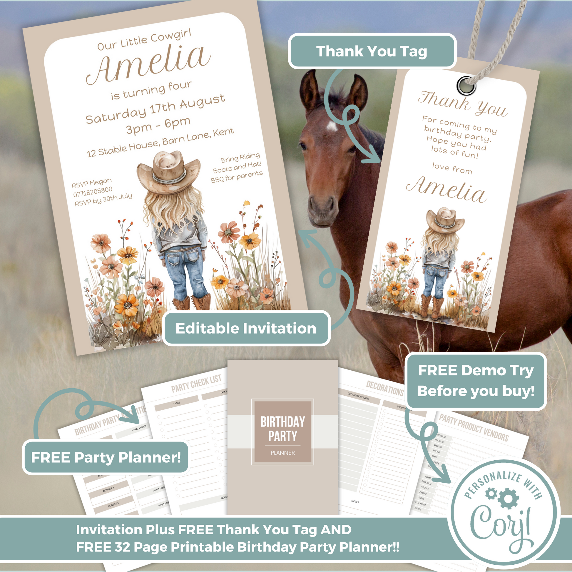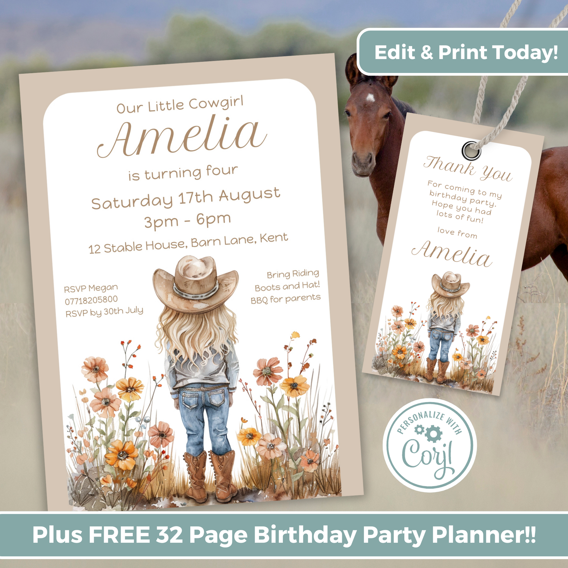 Editable Birthday Invitation and FREE Thank You Tag - Cowgirl Beige