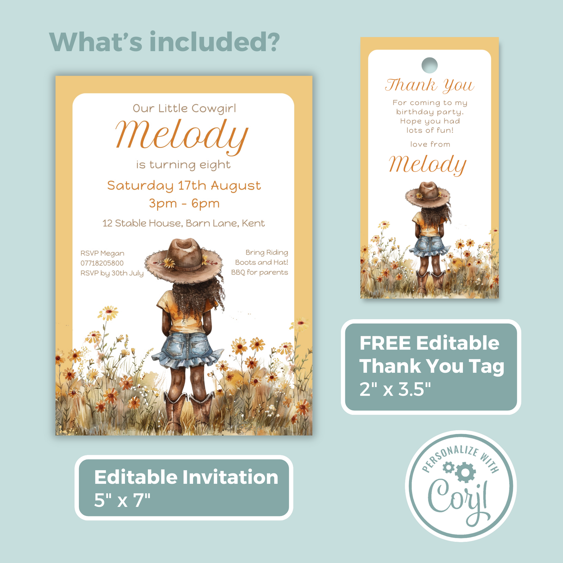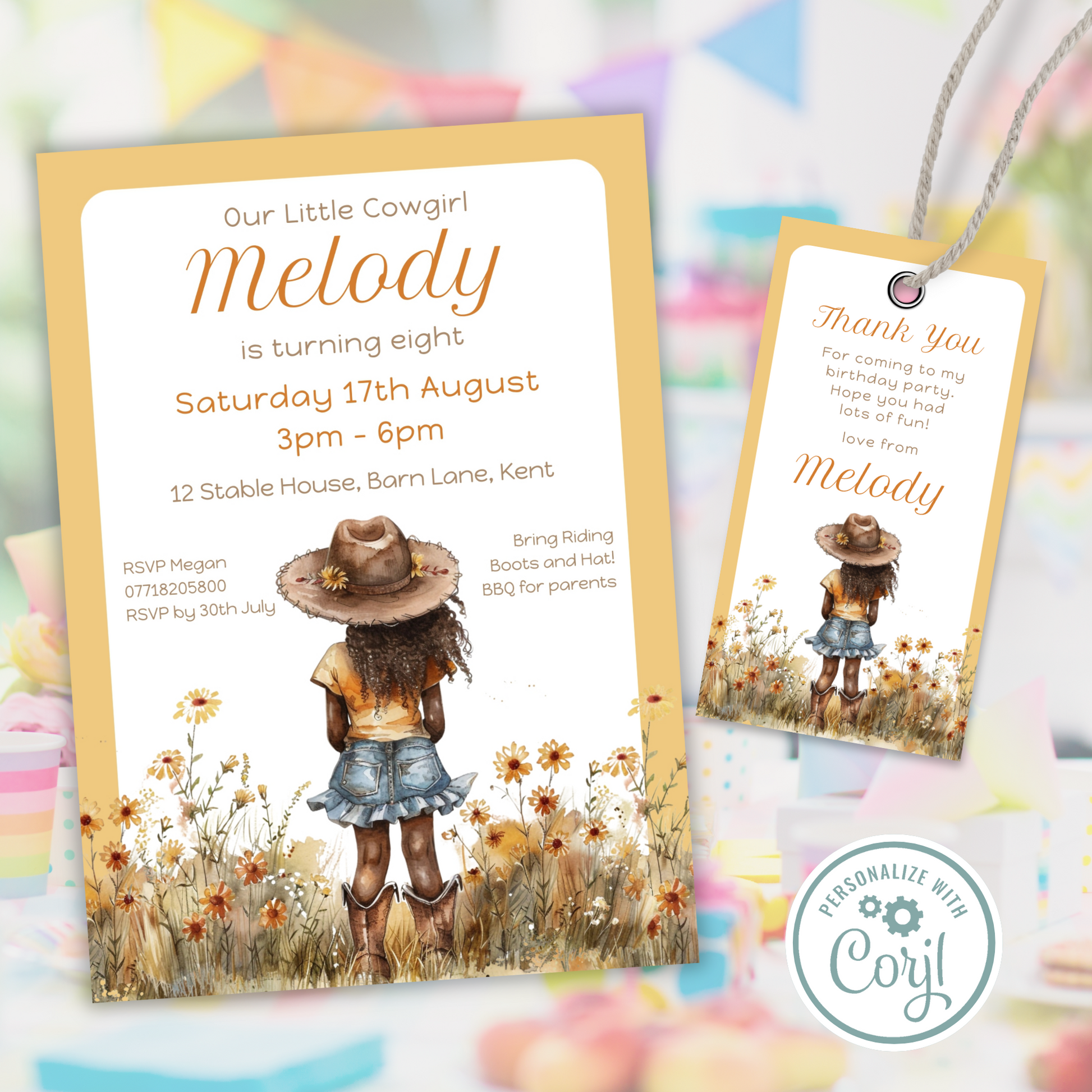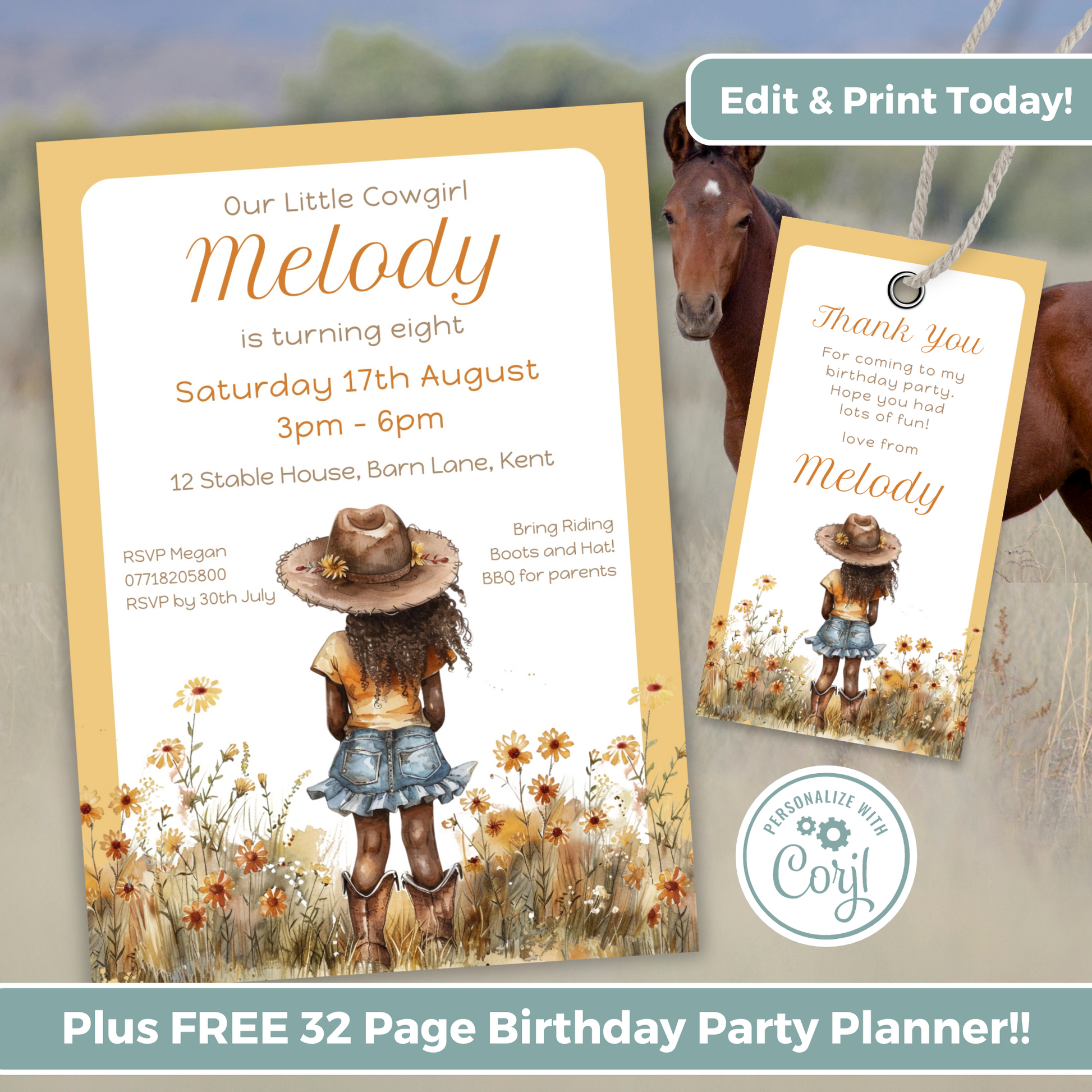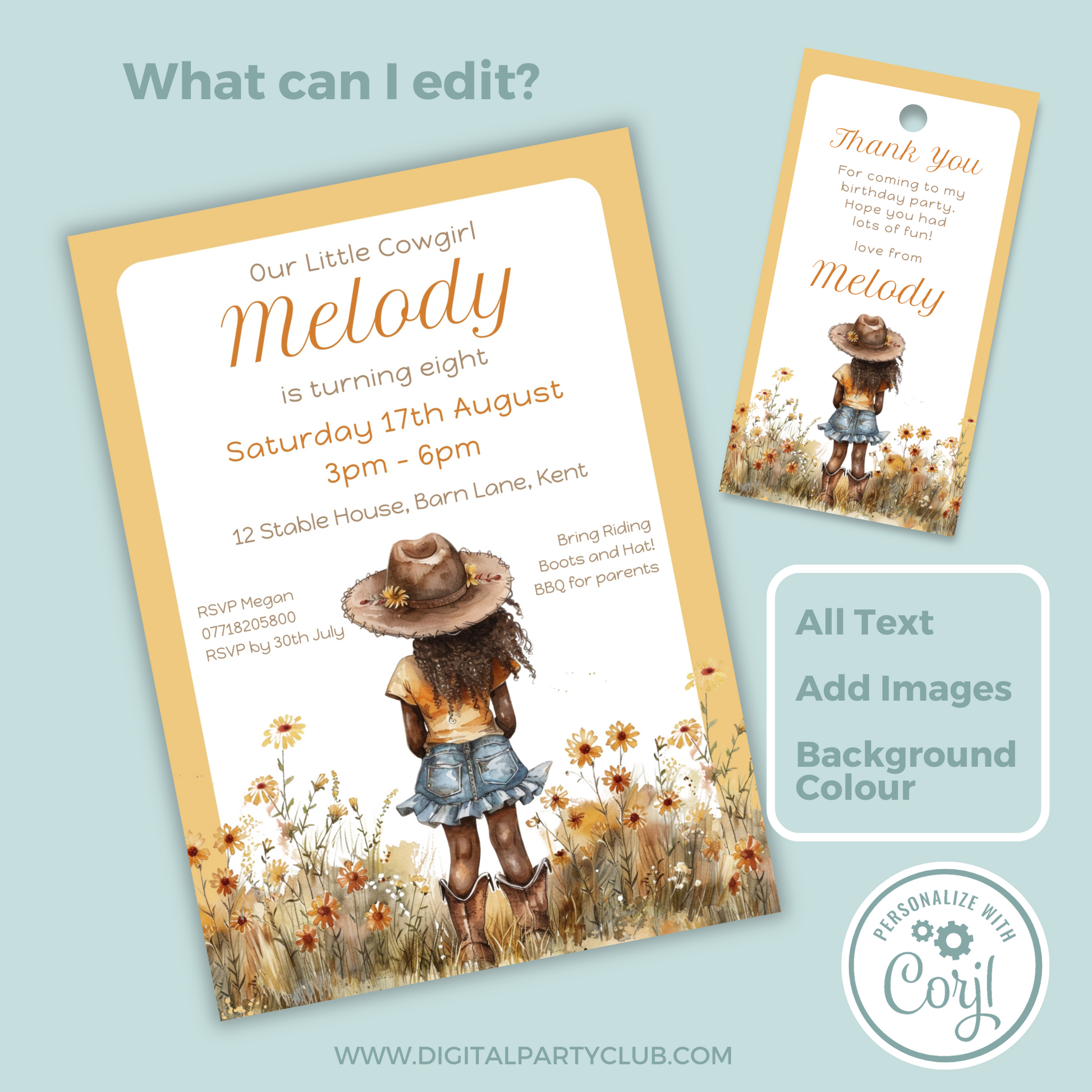 Editable Birthday Invitation and FREE Thank You Tag - Cowgirl Peach