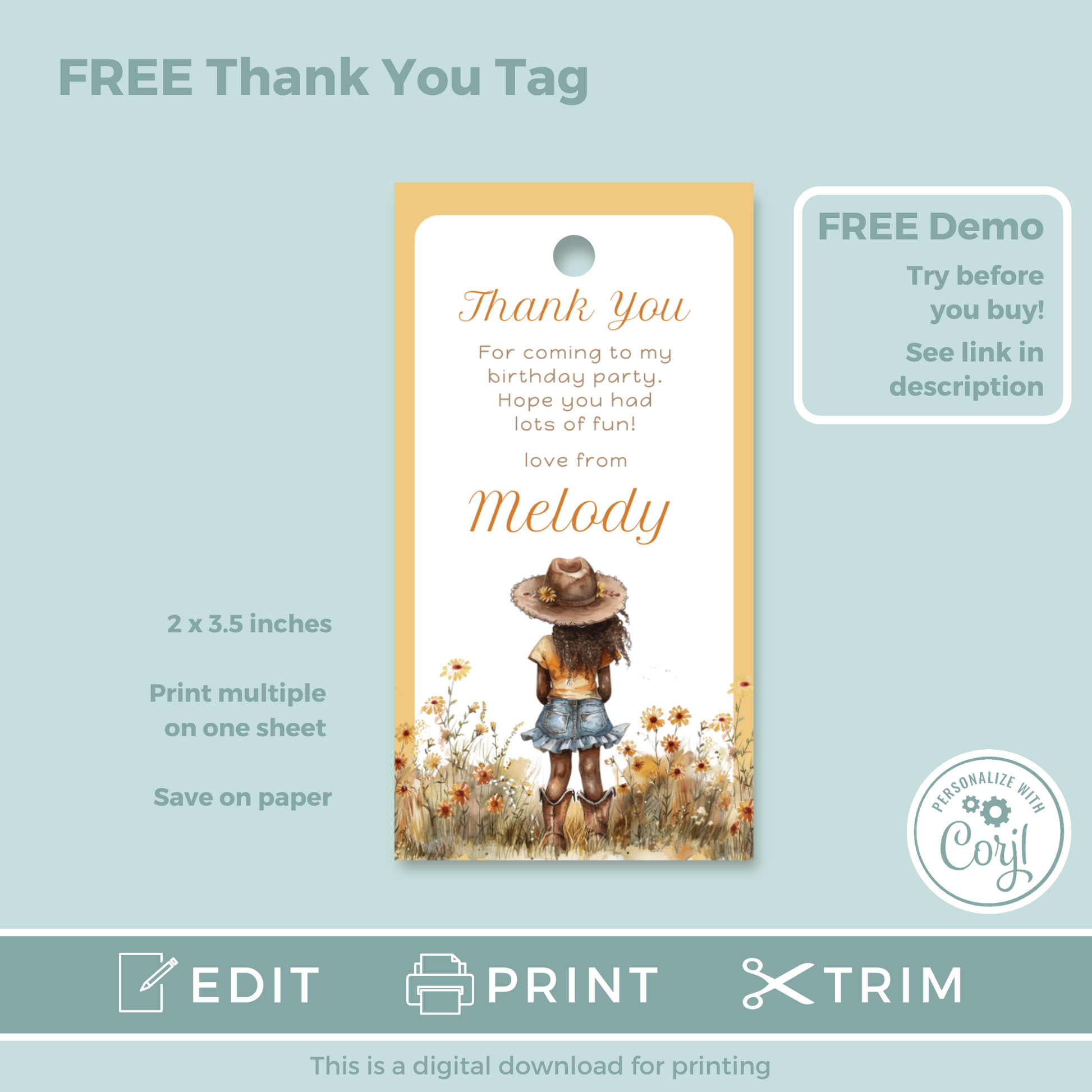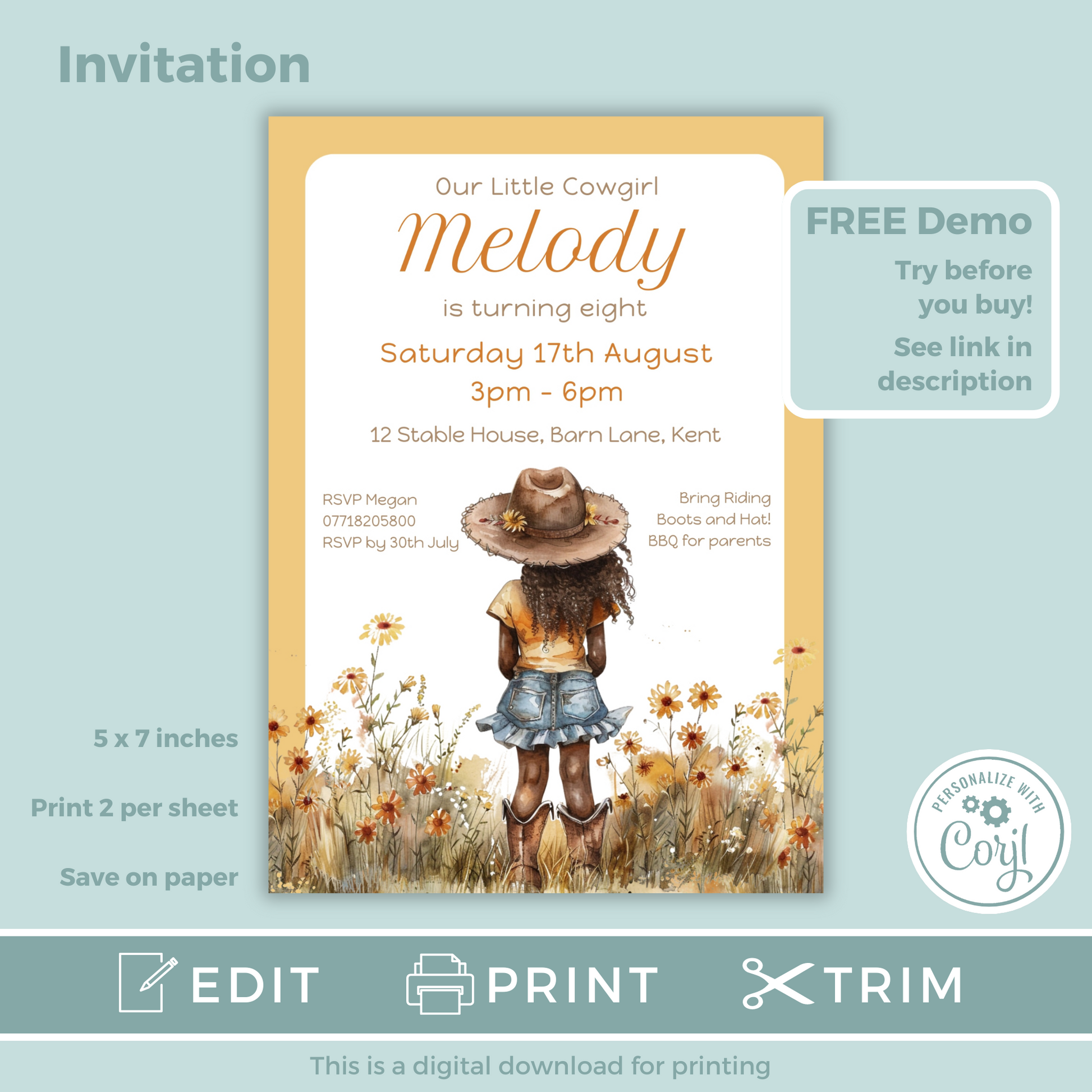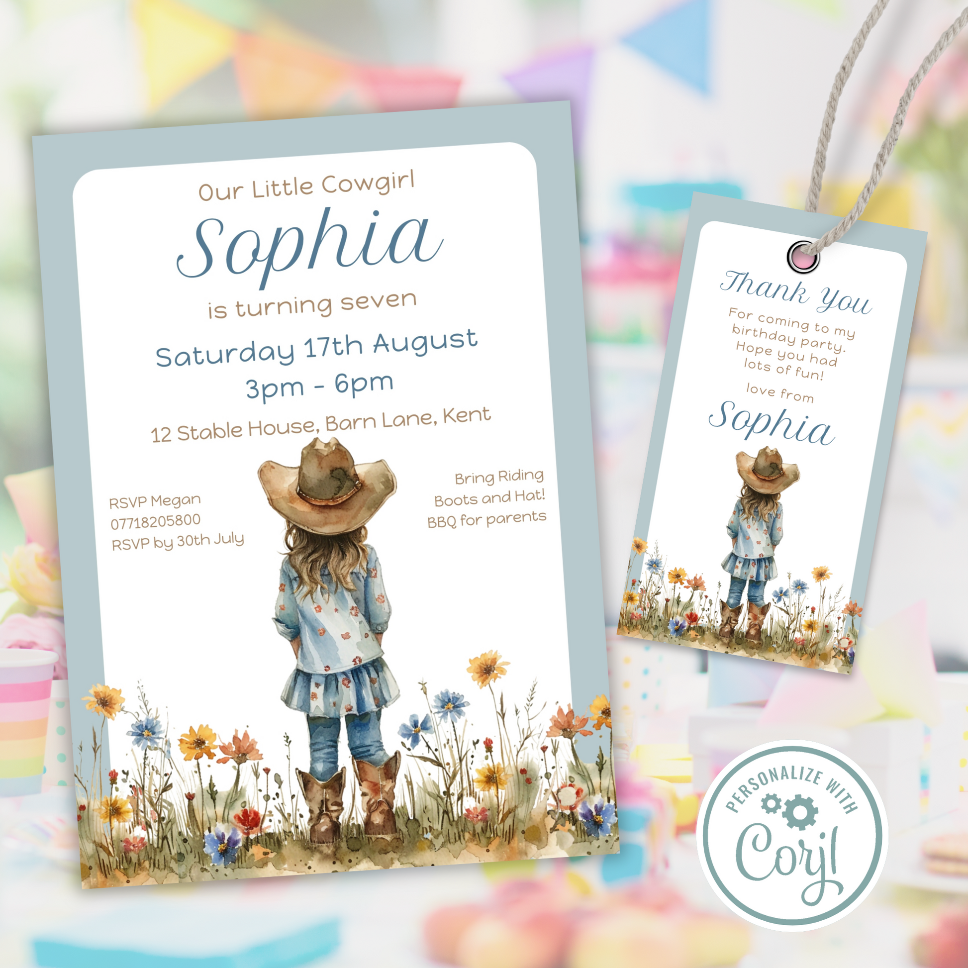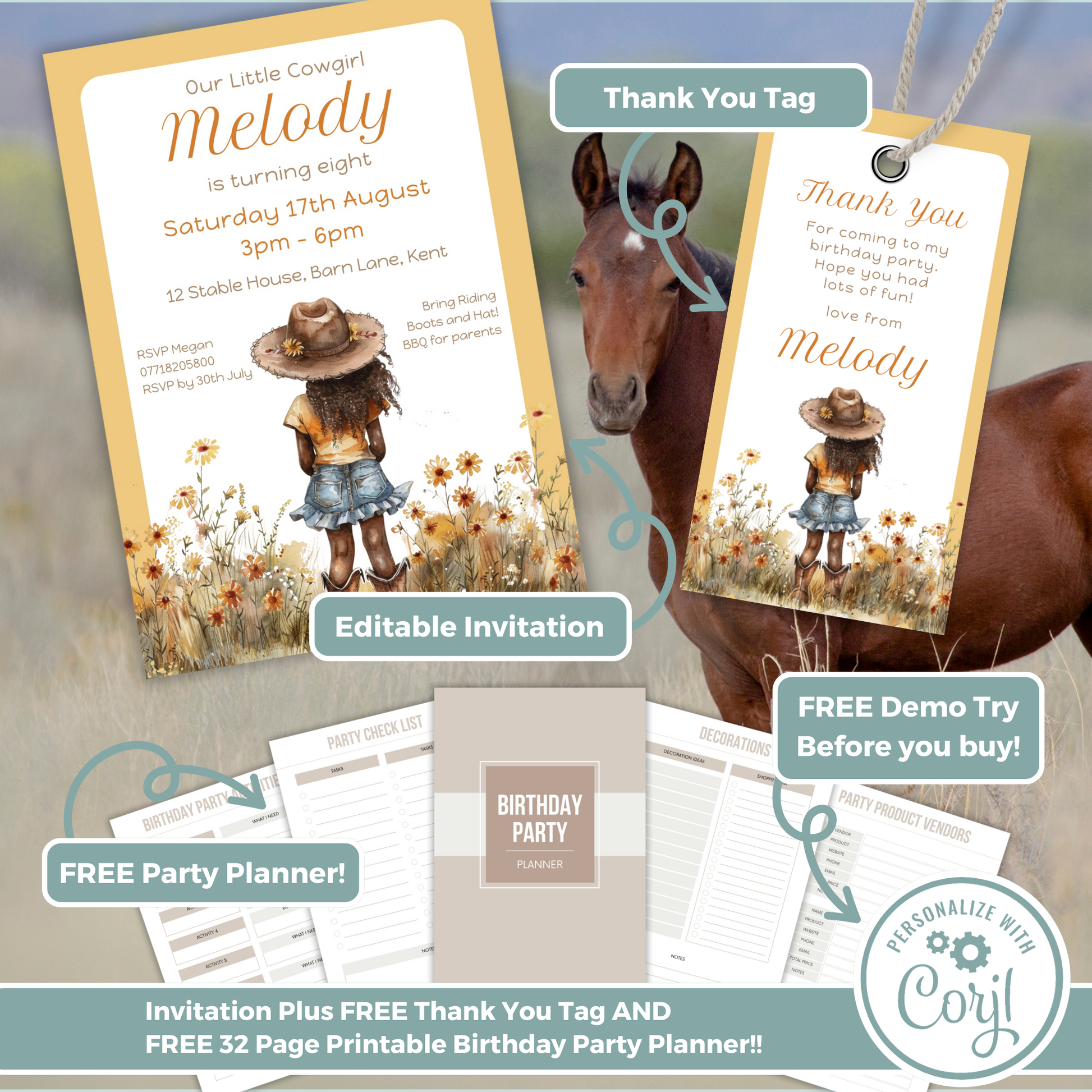Editable Birthday Invitation and FREE Thank You Tag - Cowgirl Peach