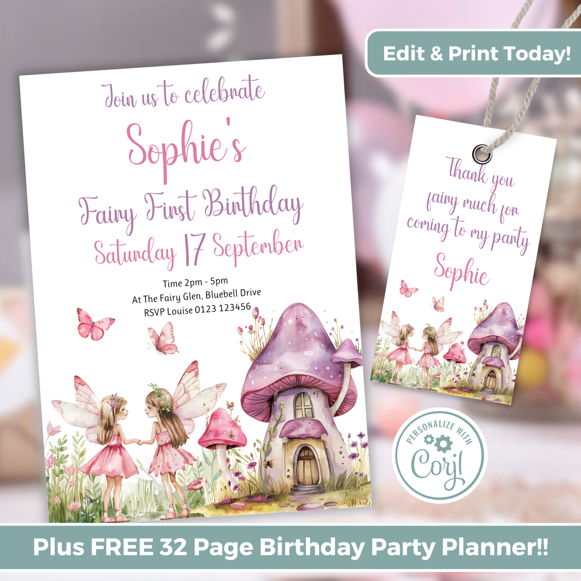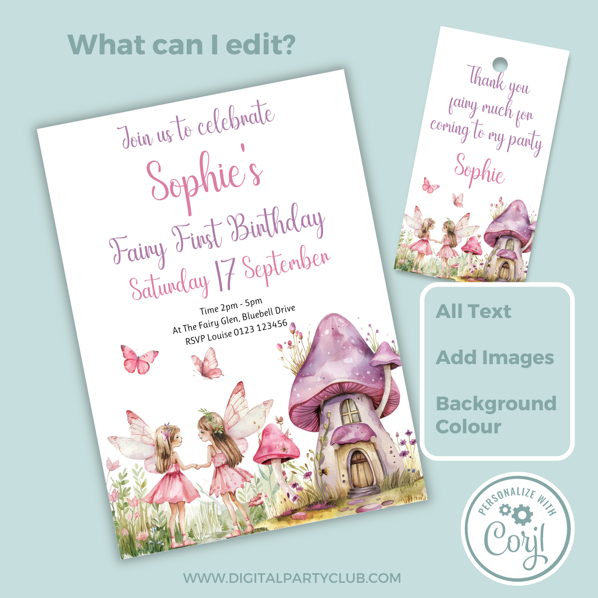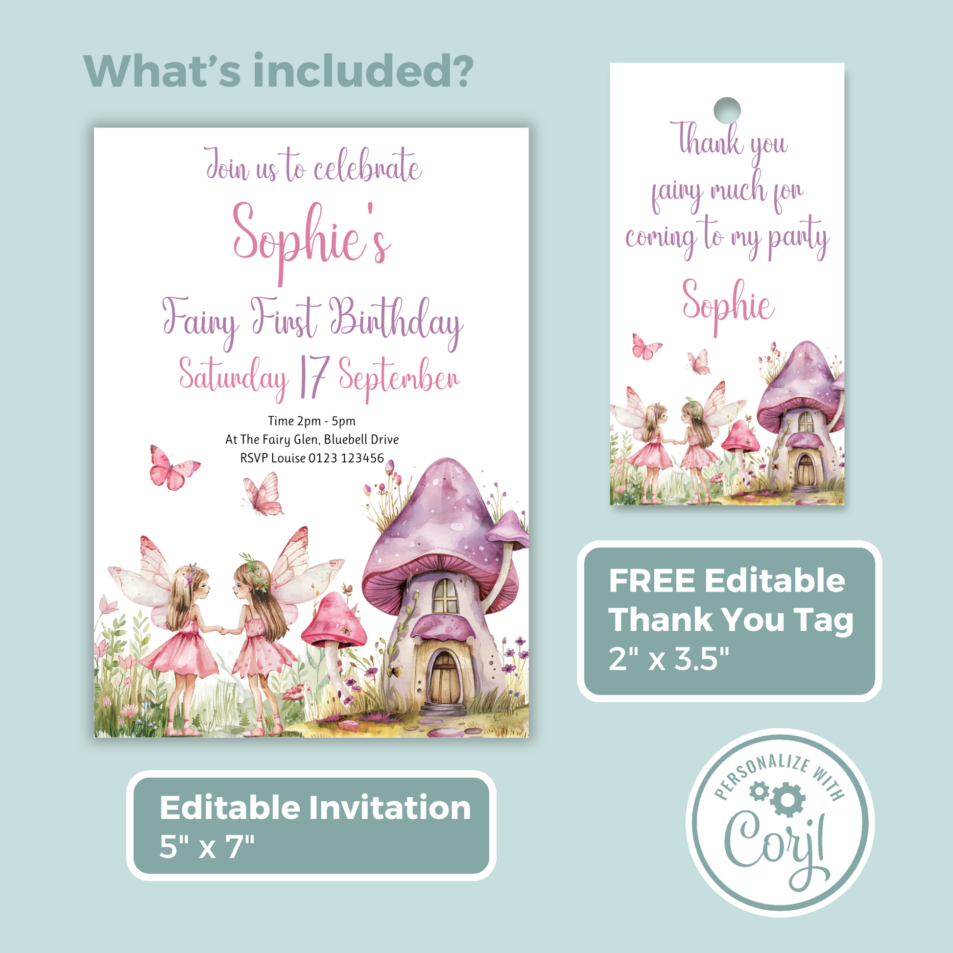 Editable Birthday Invitation and FREE Thank You Tag - Fairy First Birthday