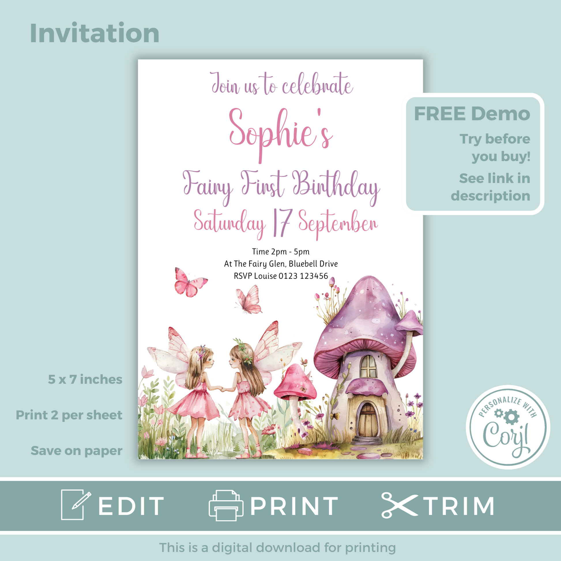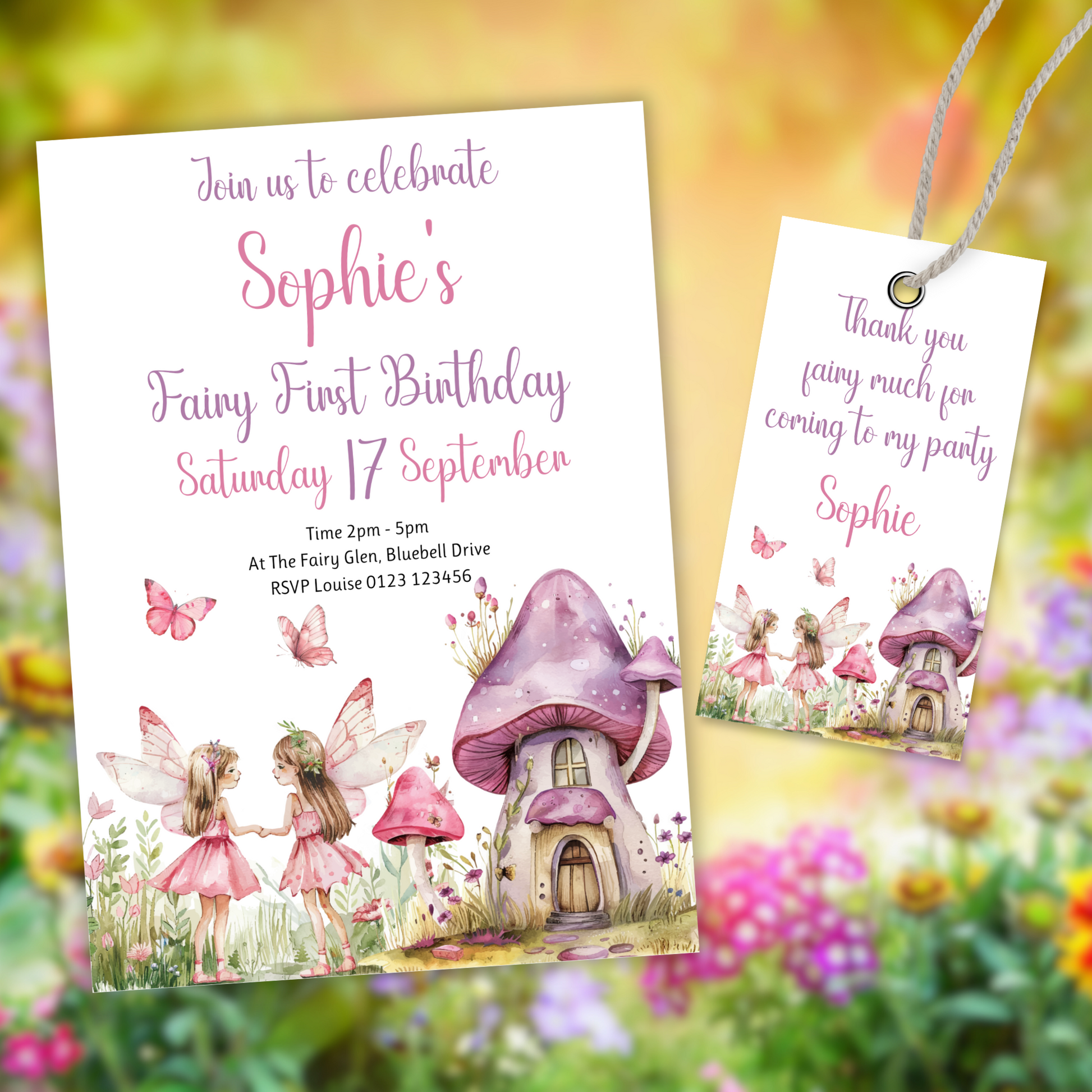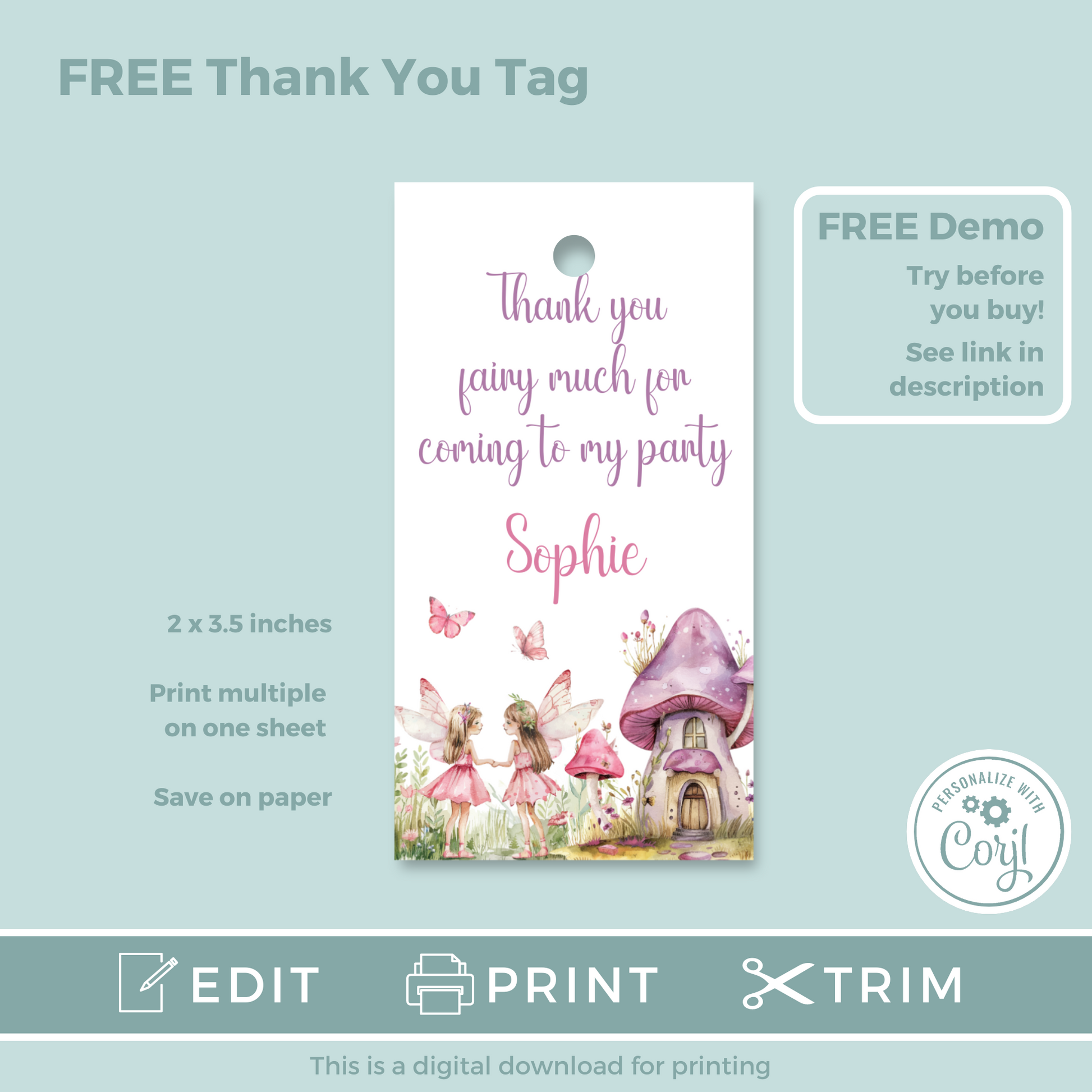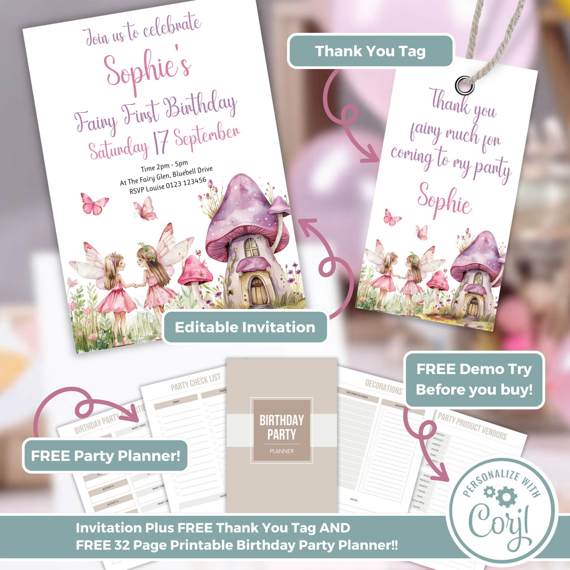 Editable Birthday Invitation and FREE Thank You Tag - Fairy First Birthday