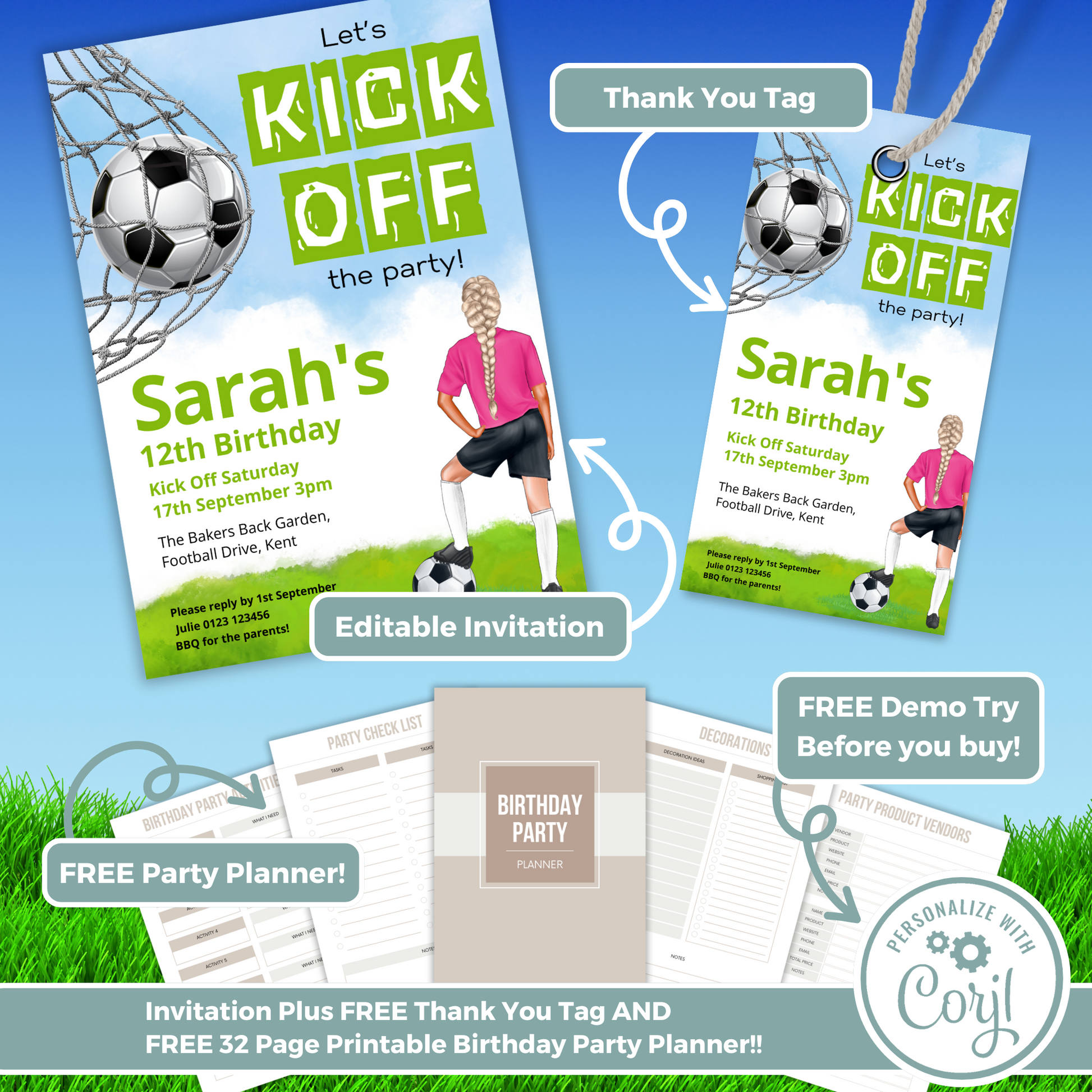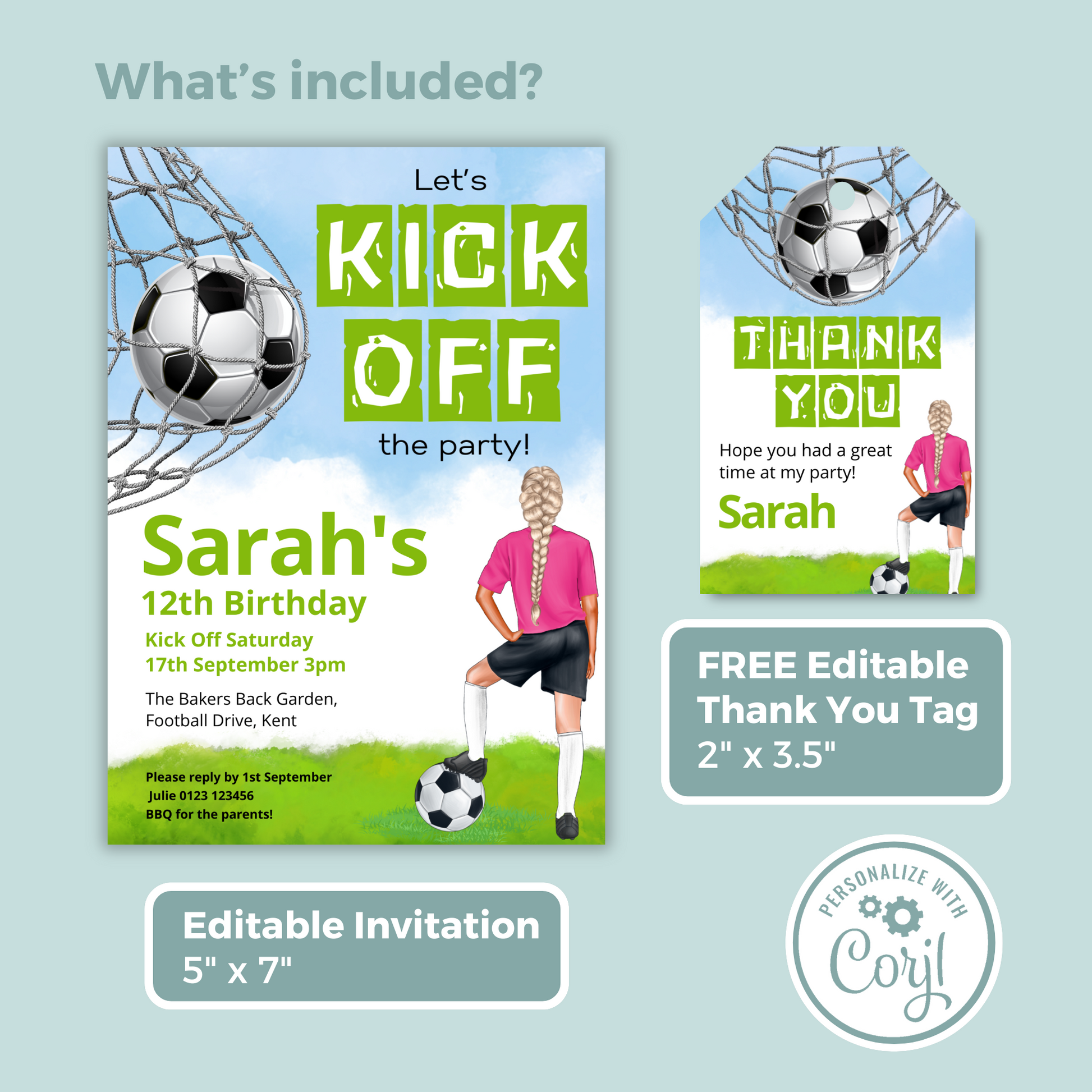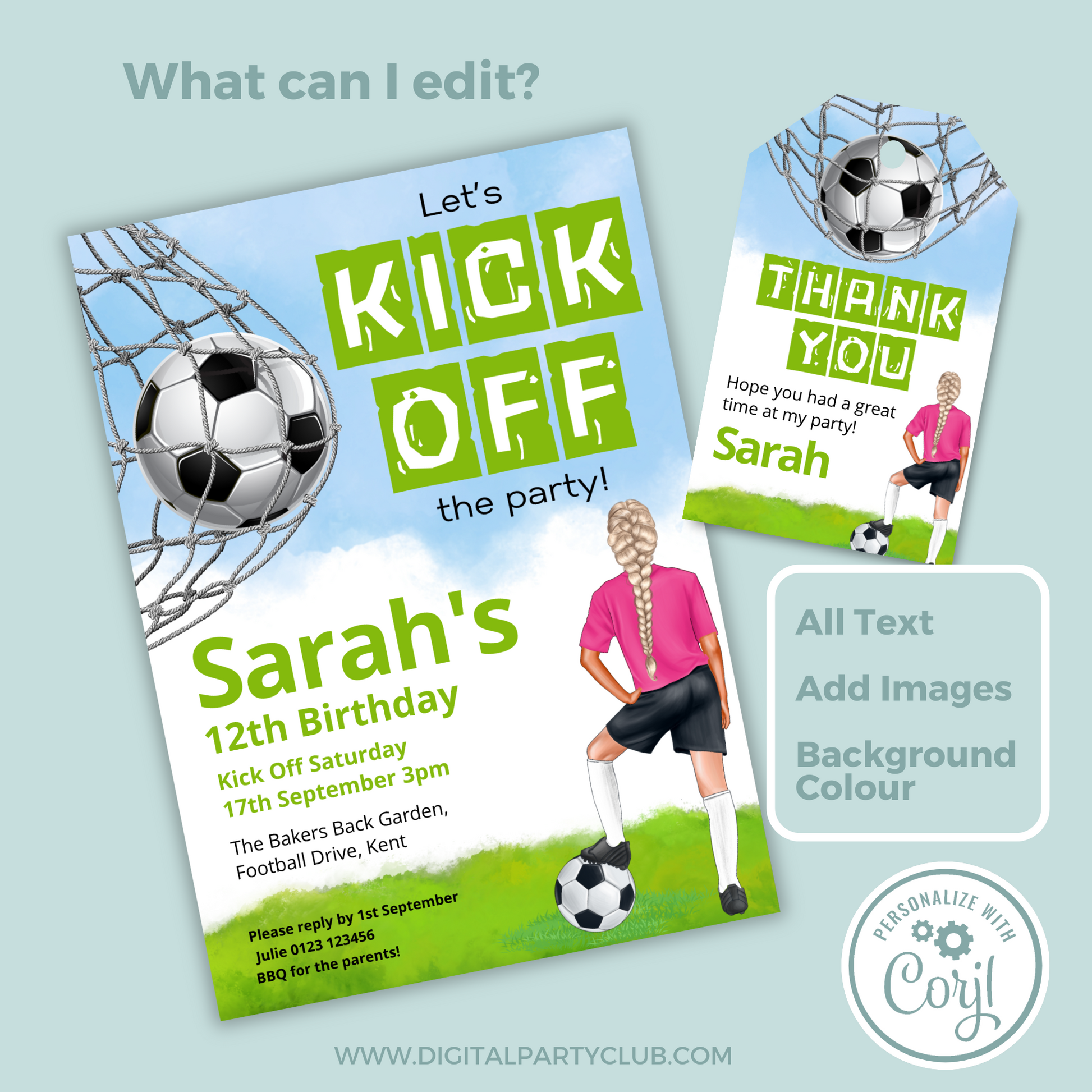 Editable Birthday Invitation and FREE Thank You Tag - Football Girl Pink