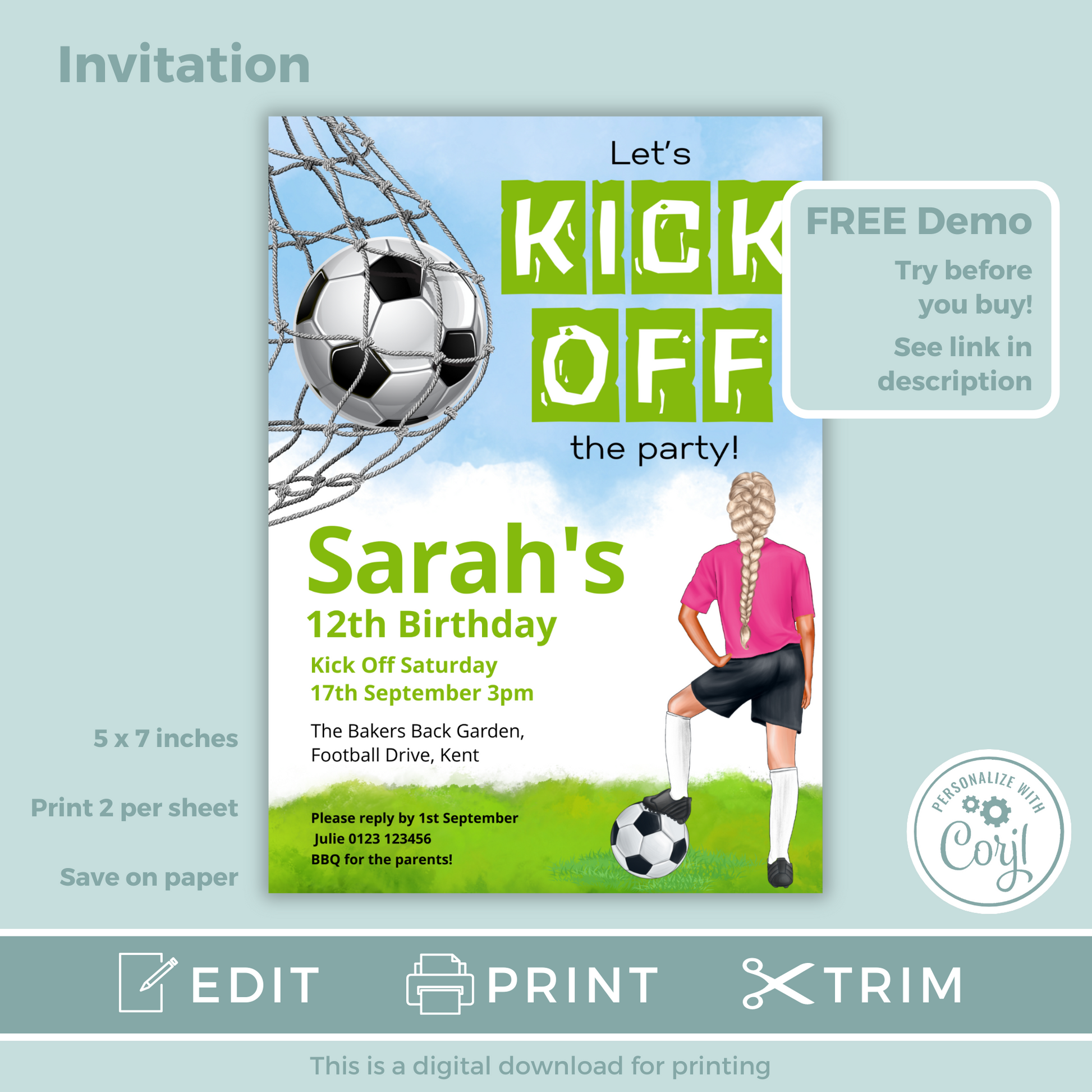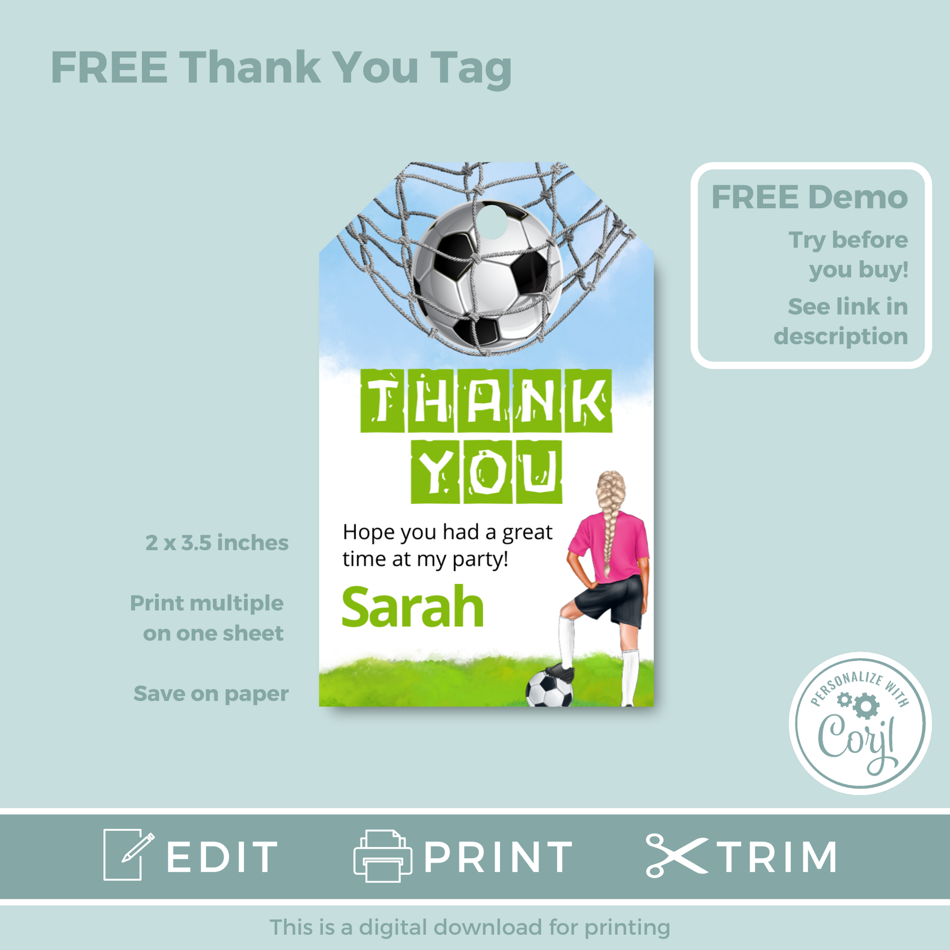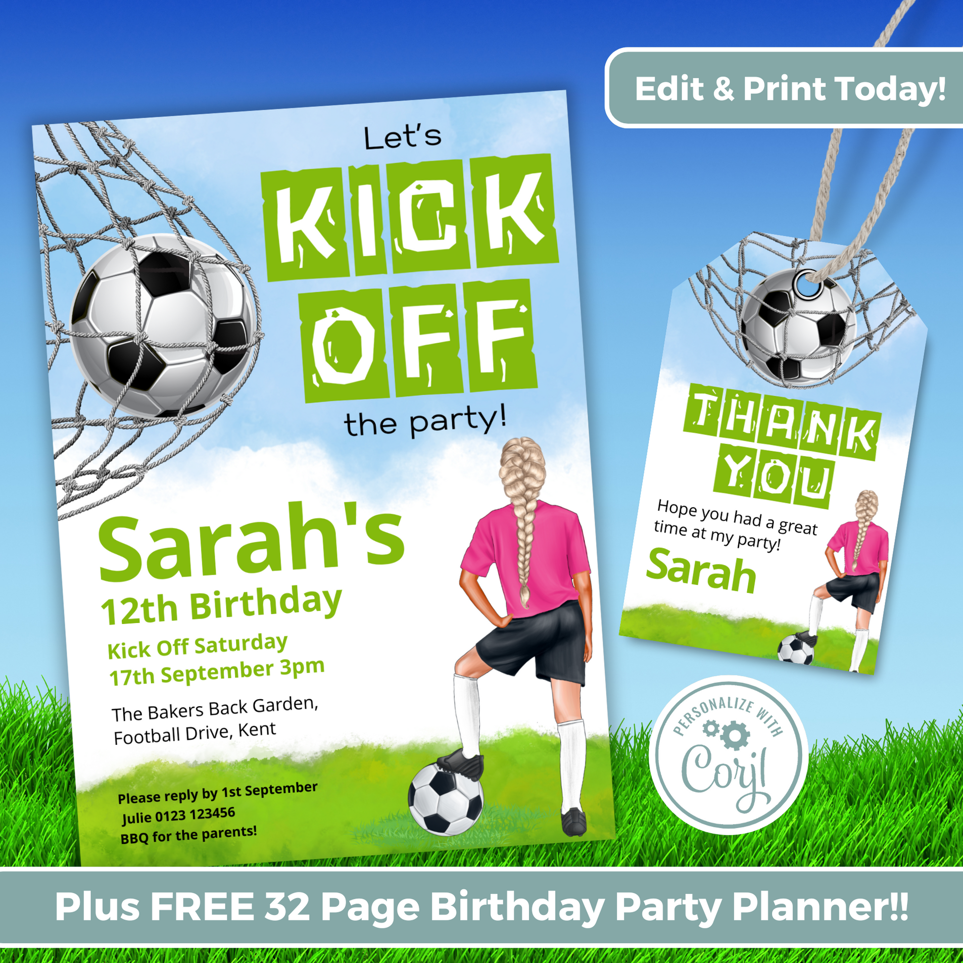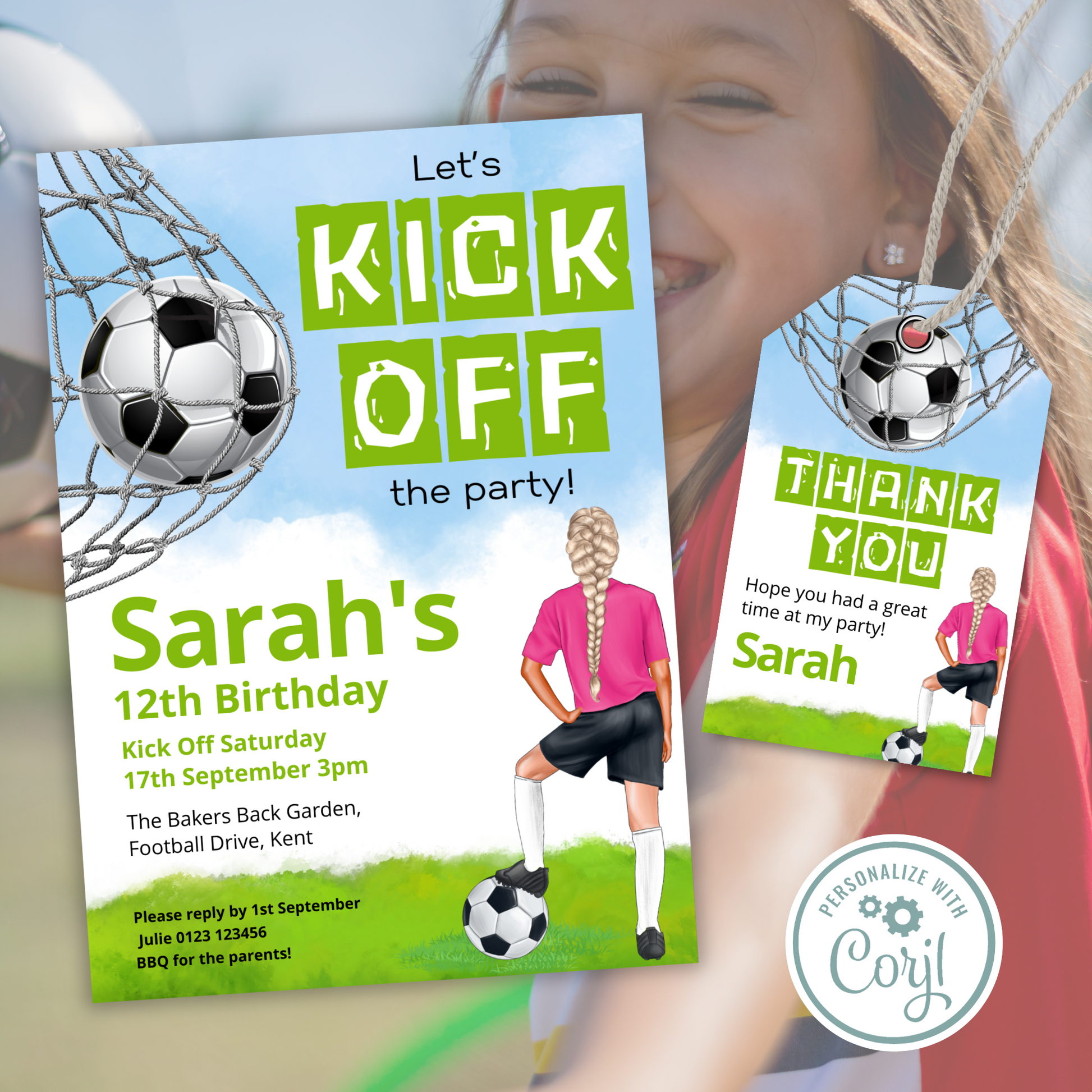 Editable Birthday Invitation and FREE Thank You Tag - Football Girl Pink
