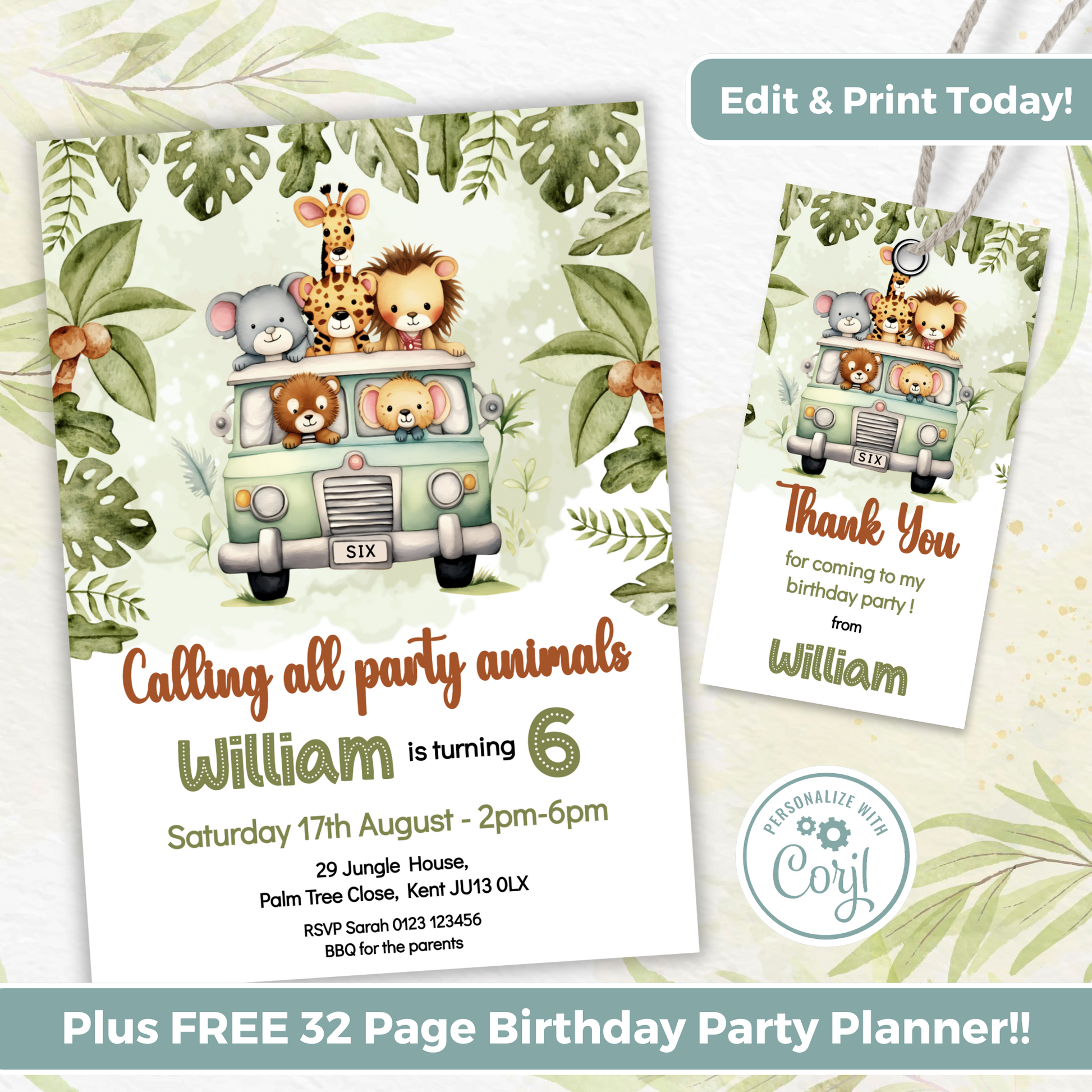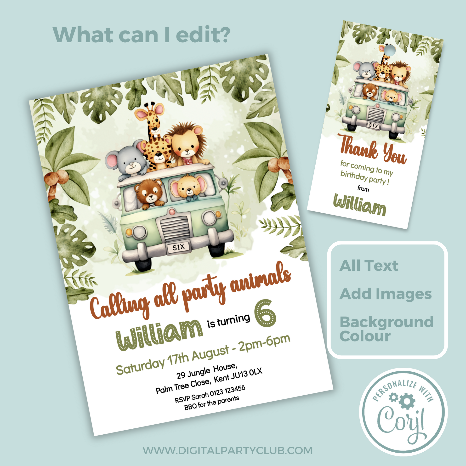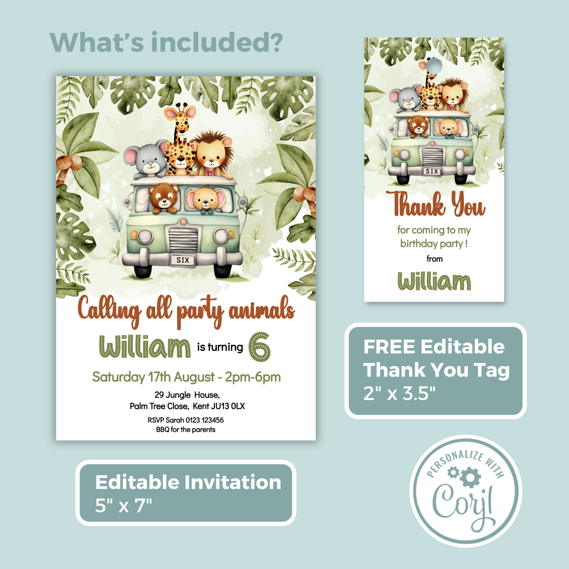 Editable Birthday Invitation and FREE Thank You Tag - Safari