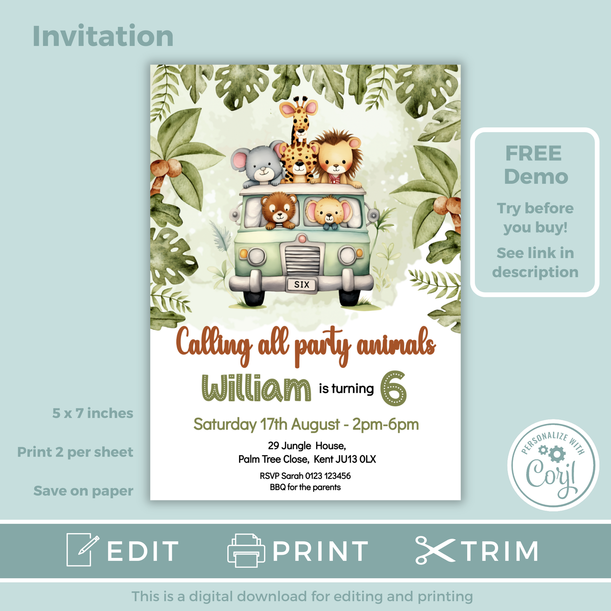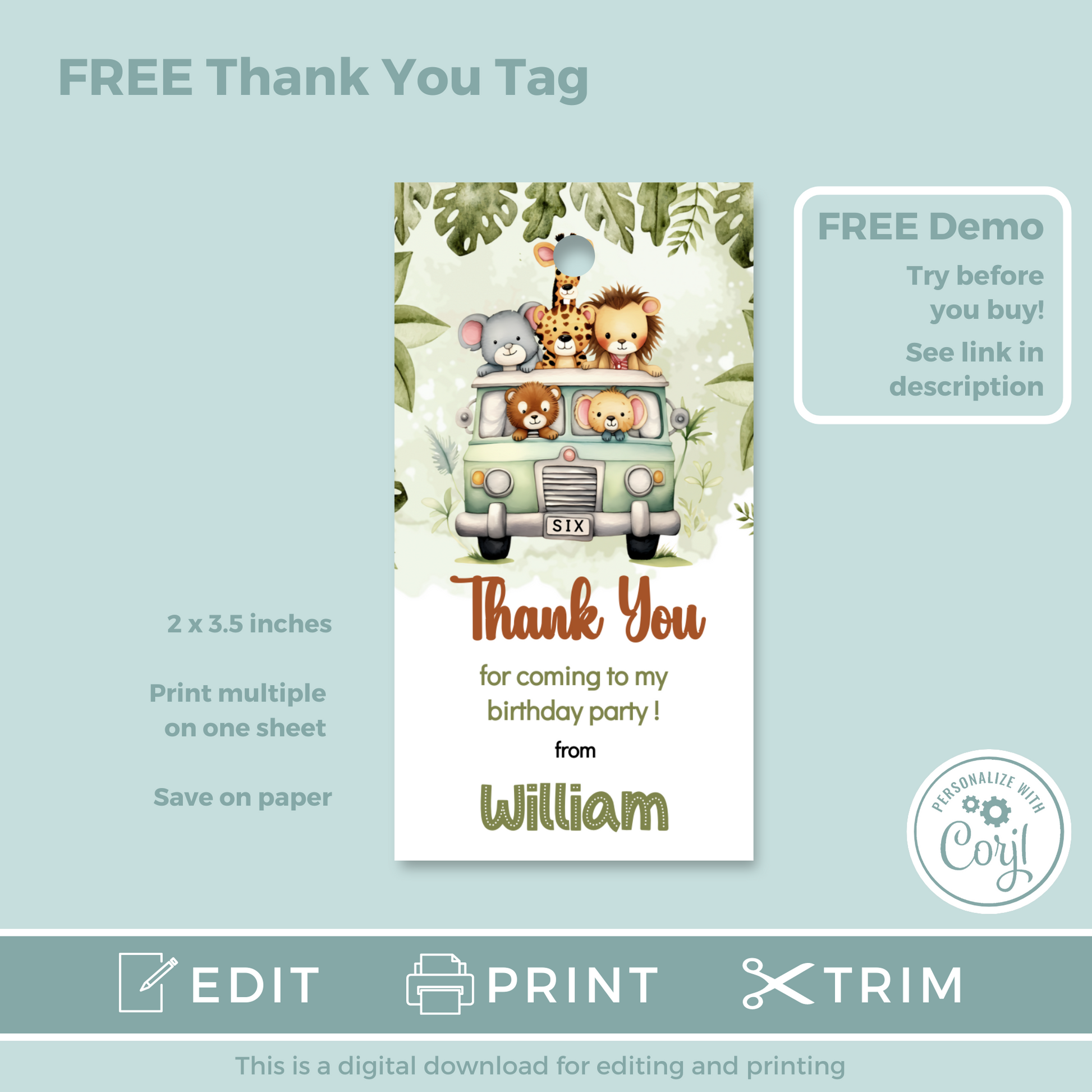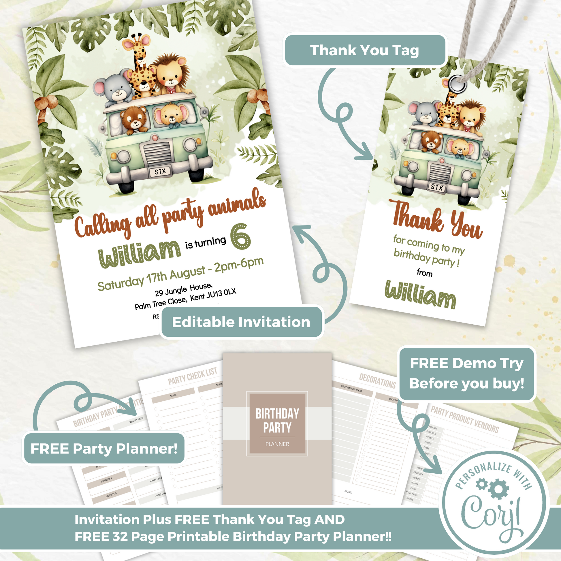 Editable Birthday Invitation and FREE Thank You Tag - Safari