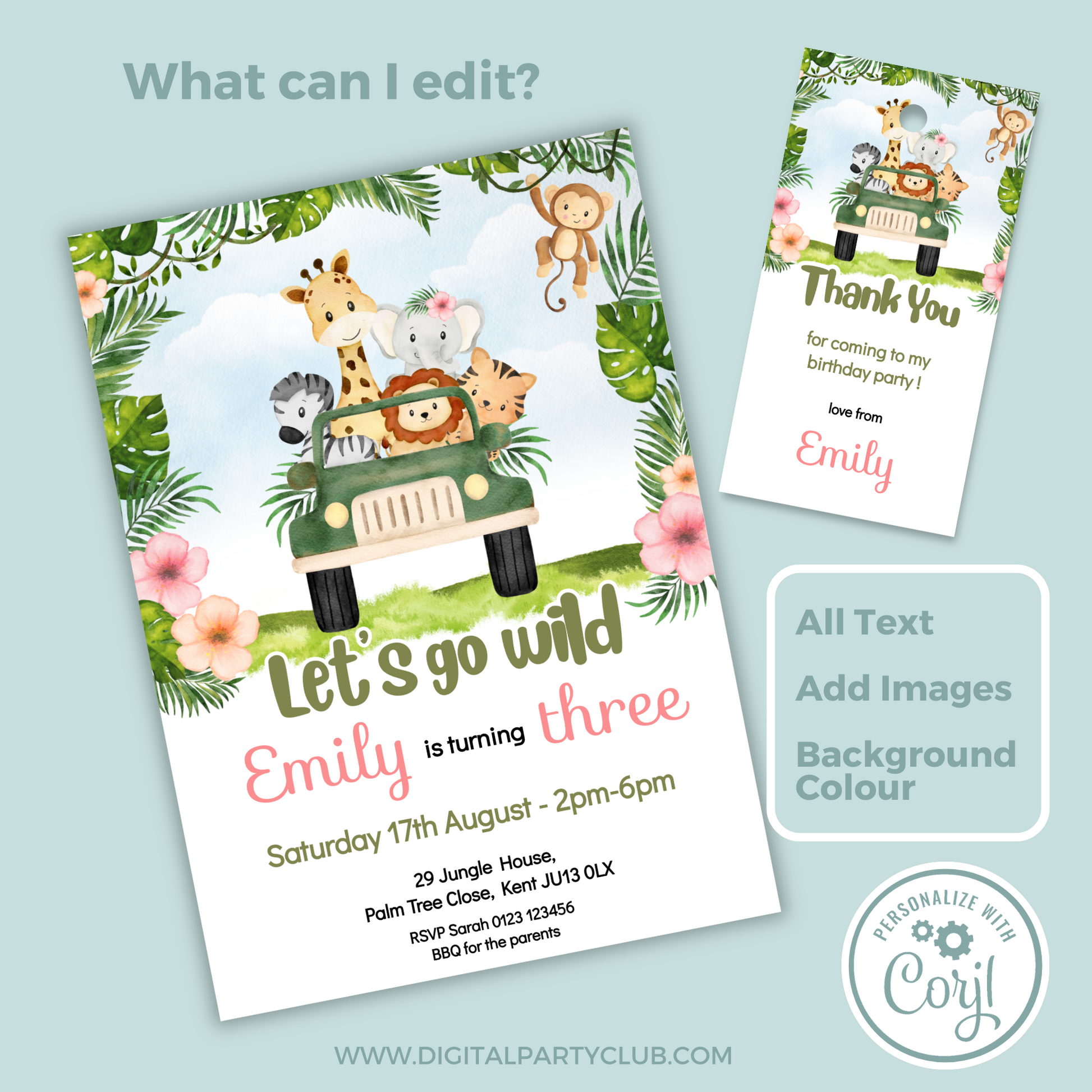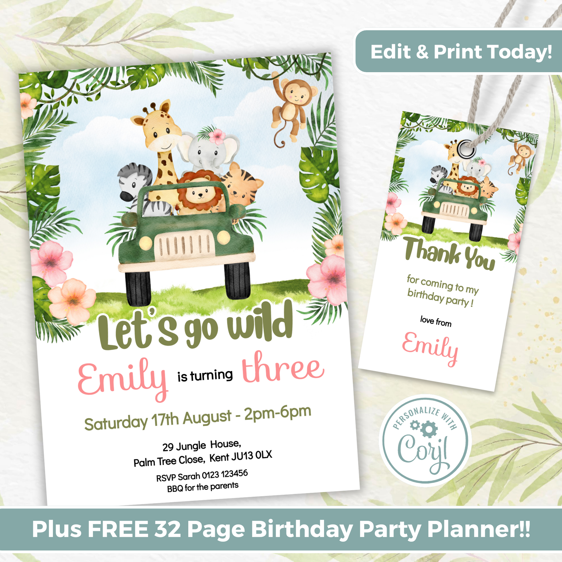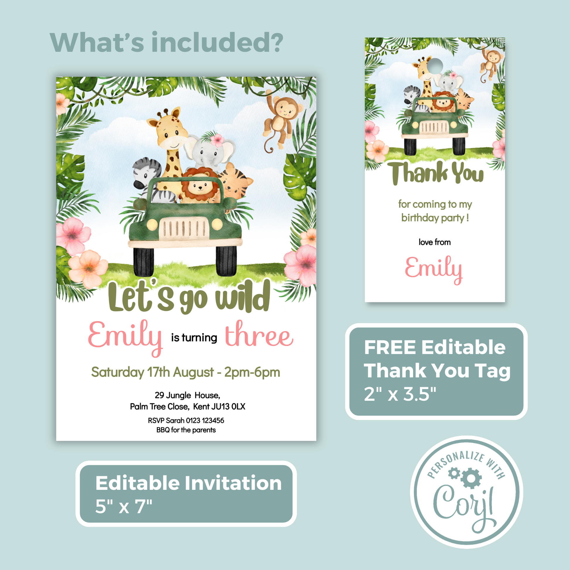 Editable Birthday Invitation and FREE Thank You Tag - Safari