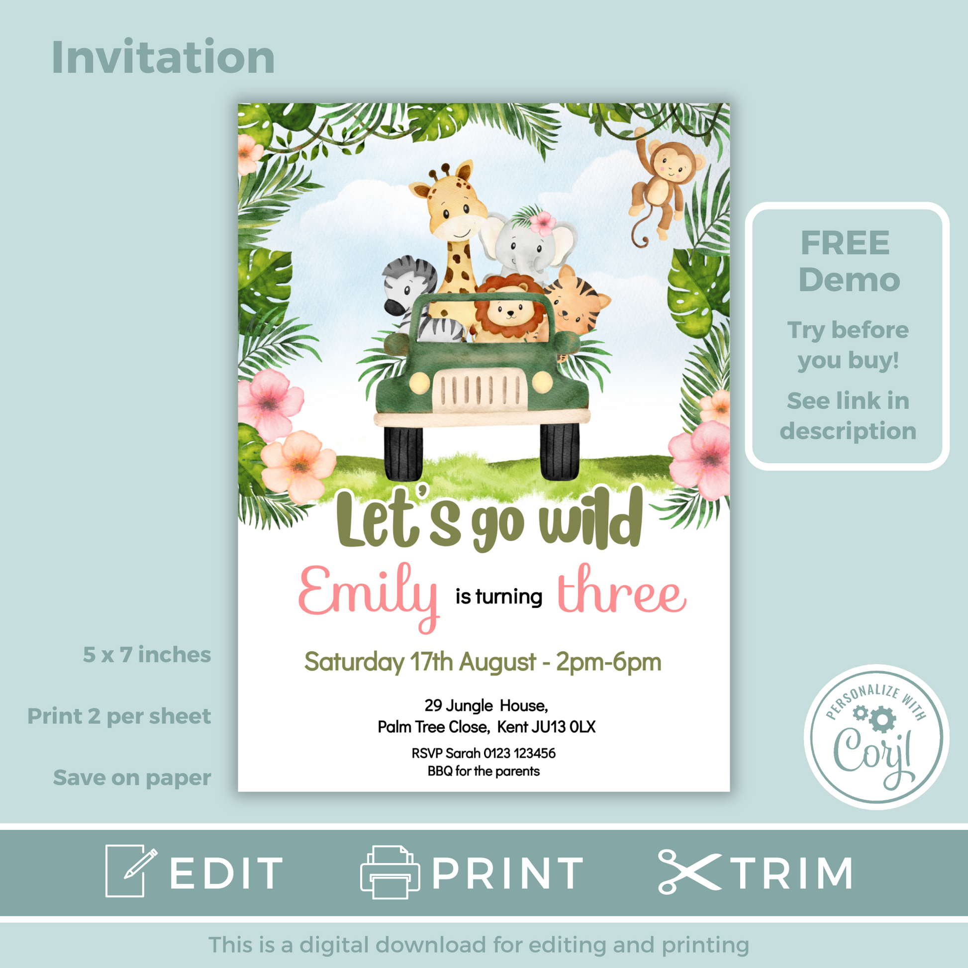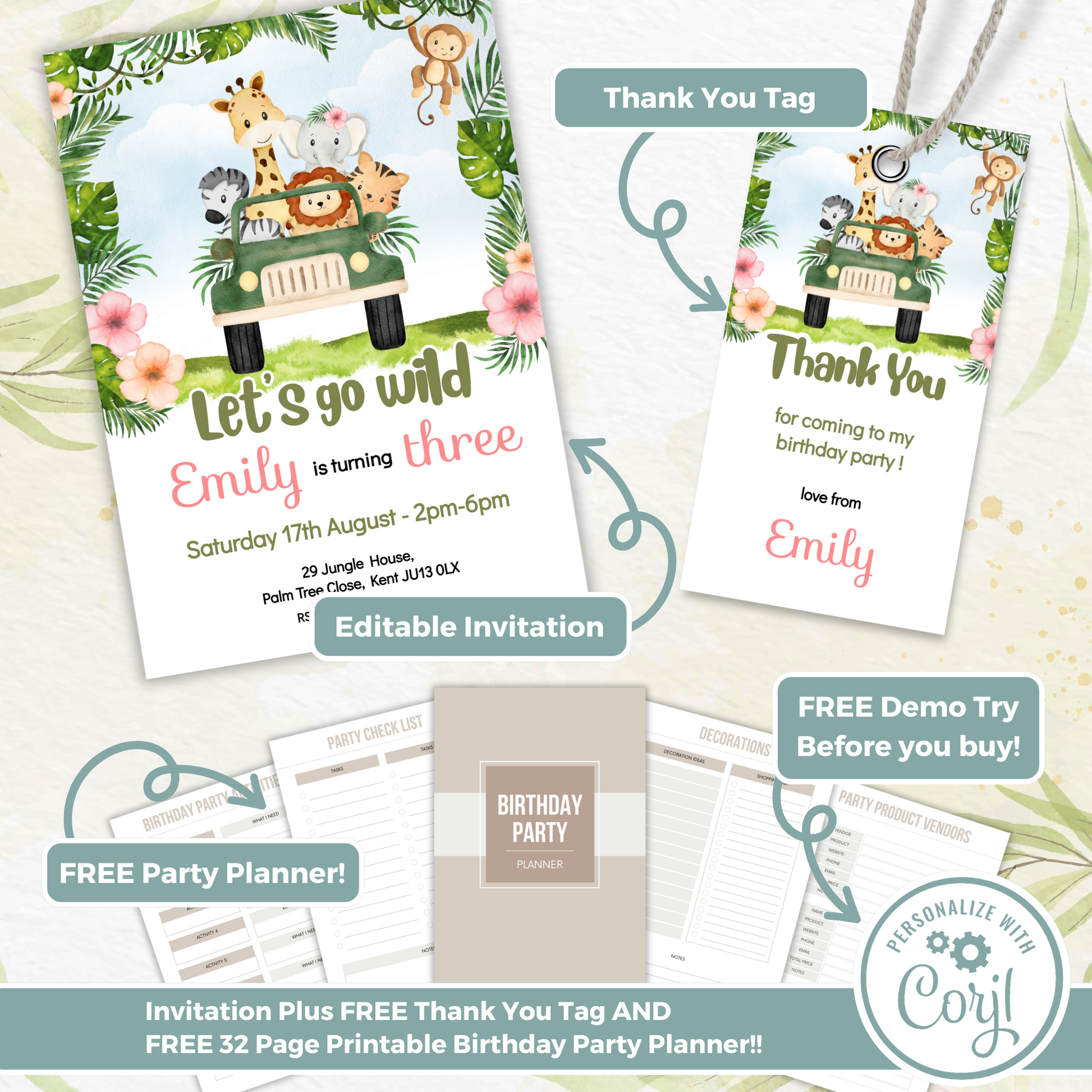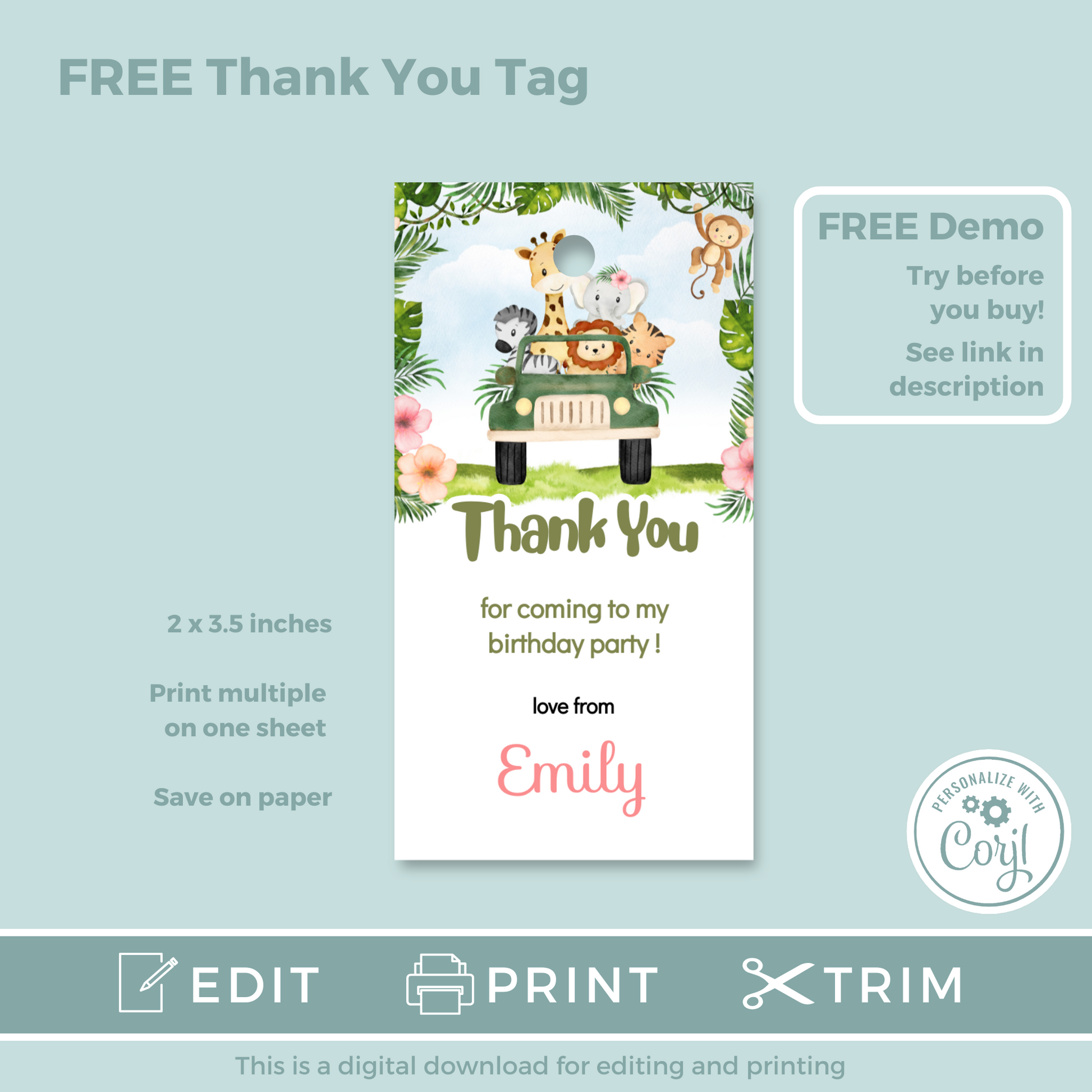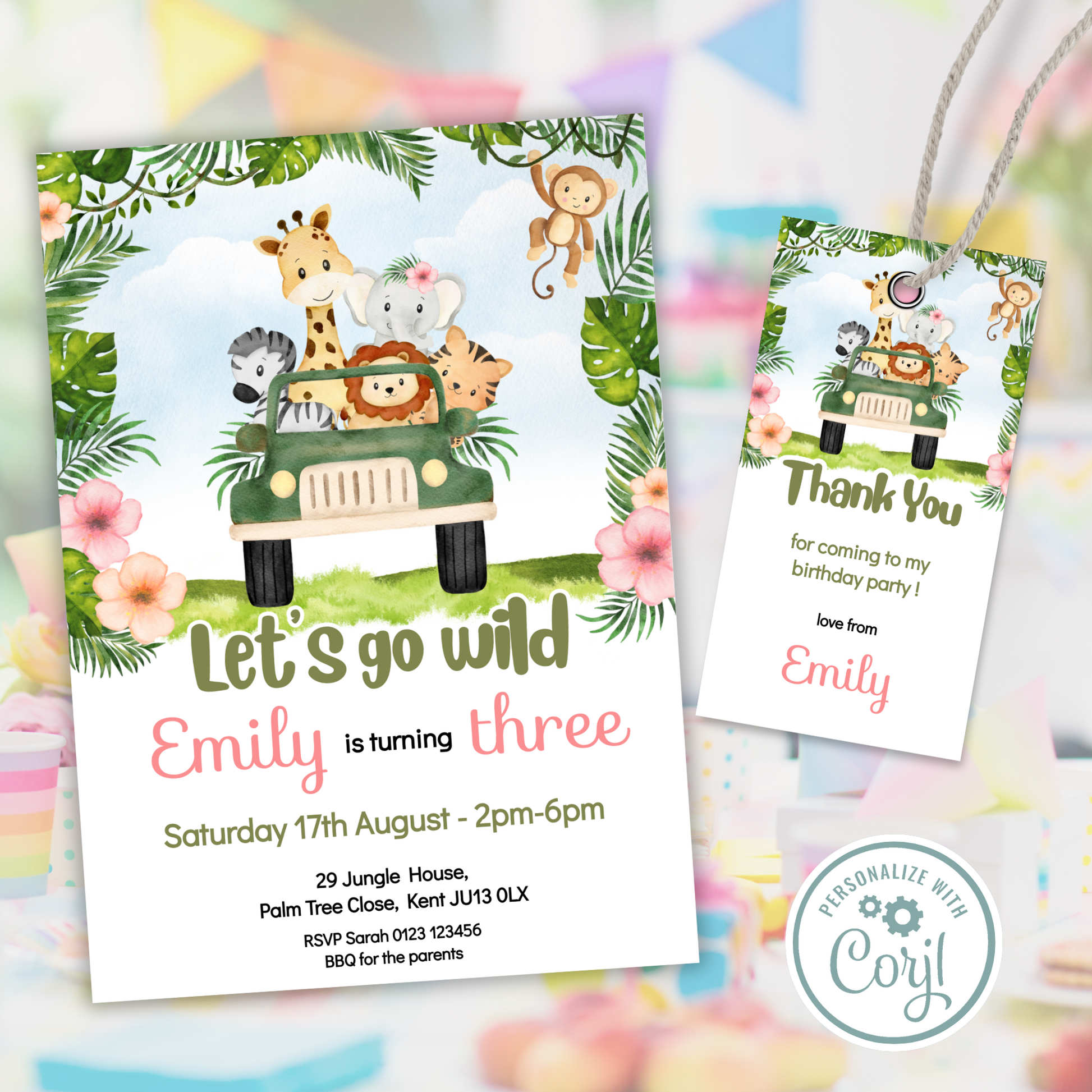Editable Birthday Invitation and FREE Thank You Tag - Safari