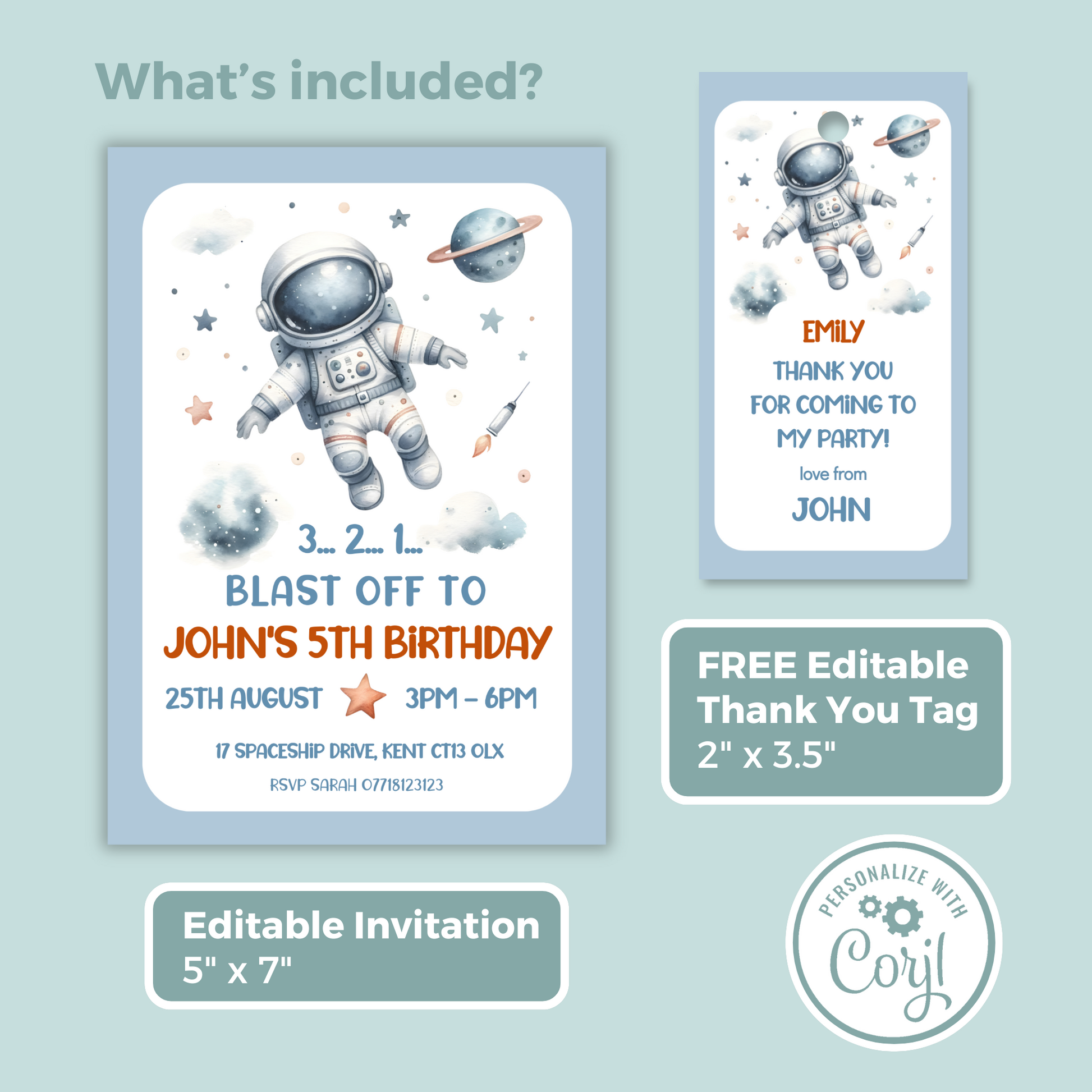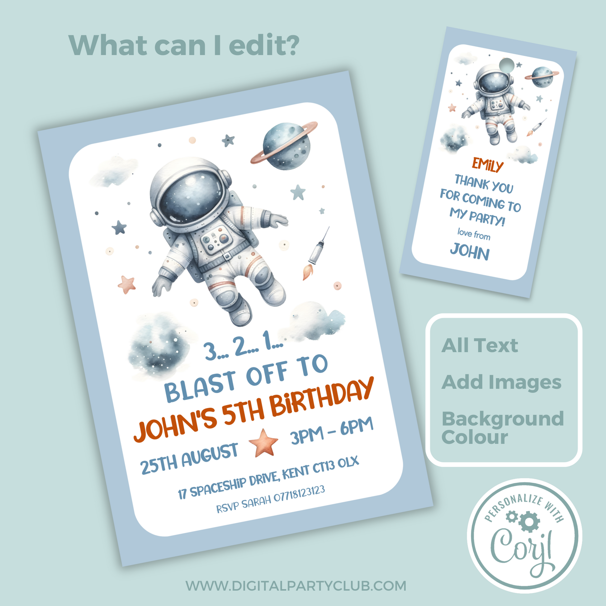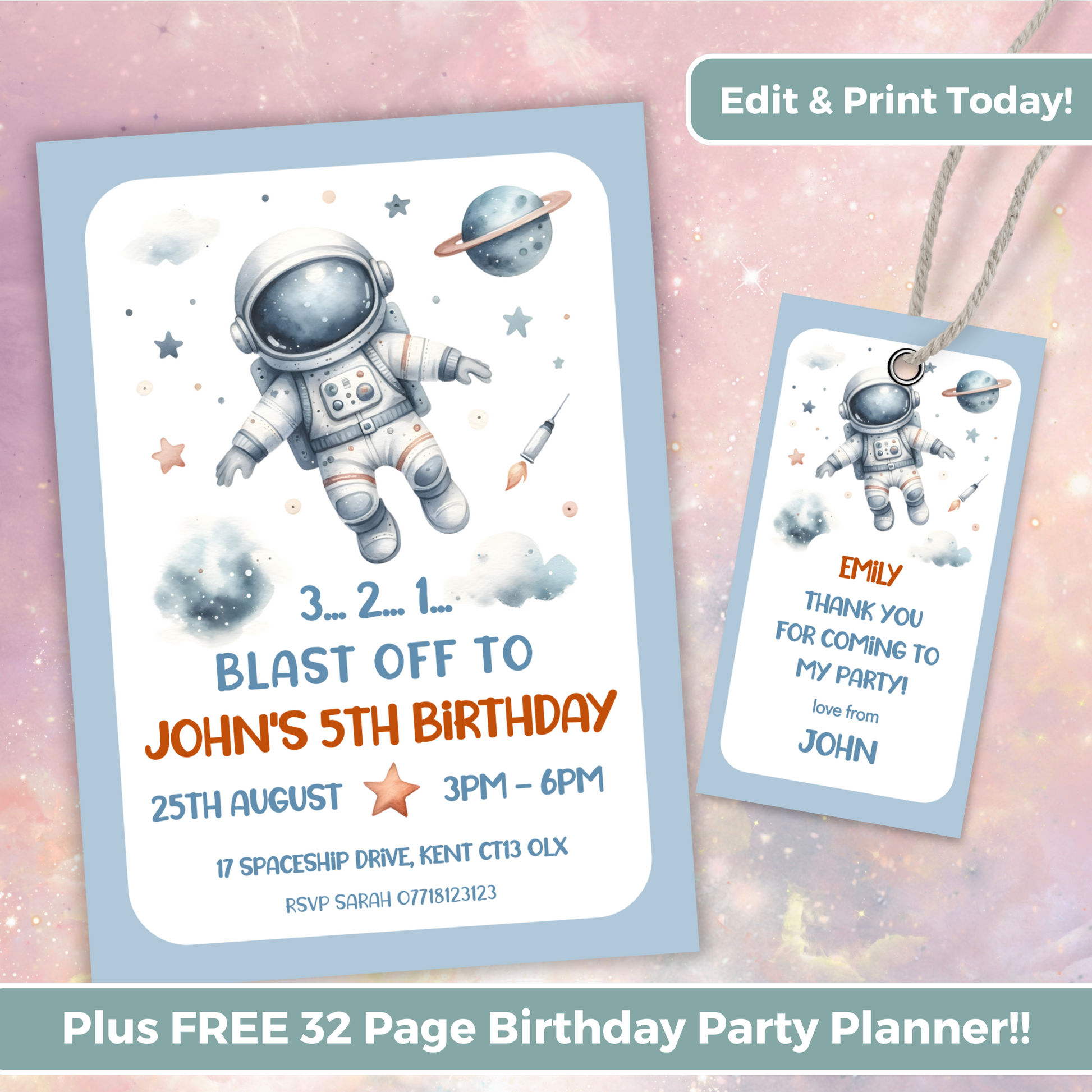 Editable Birthday Invitation and FREE Thank You Tag - Spaceman