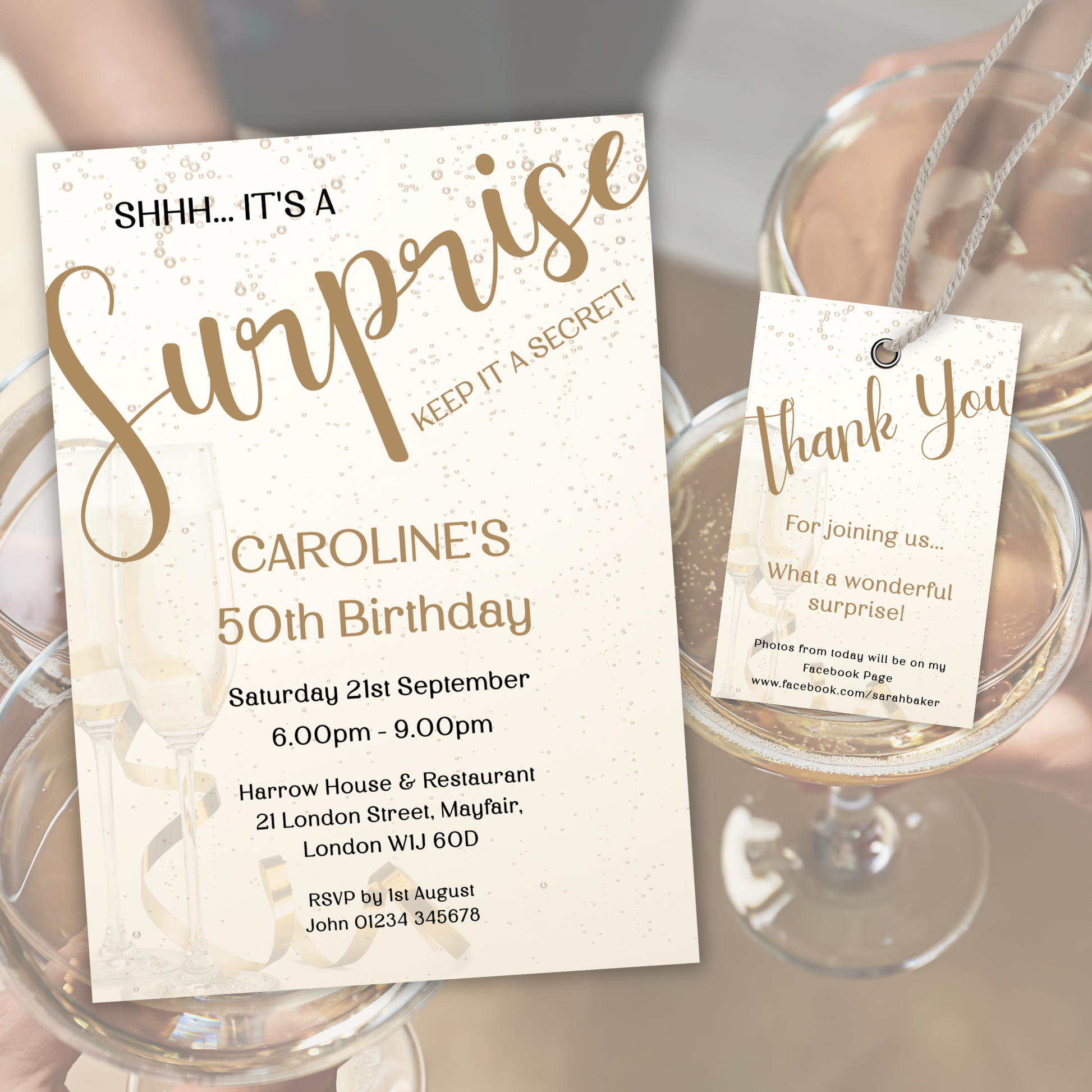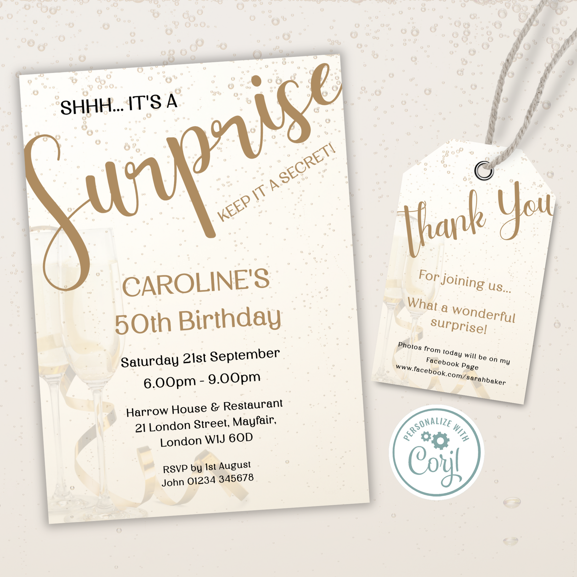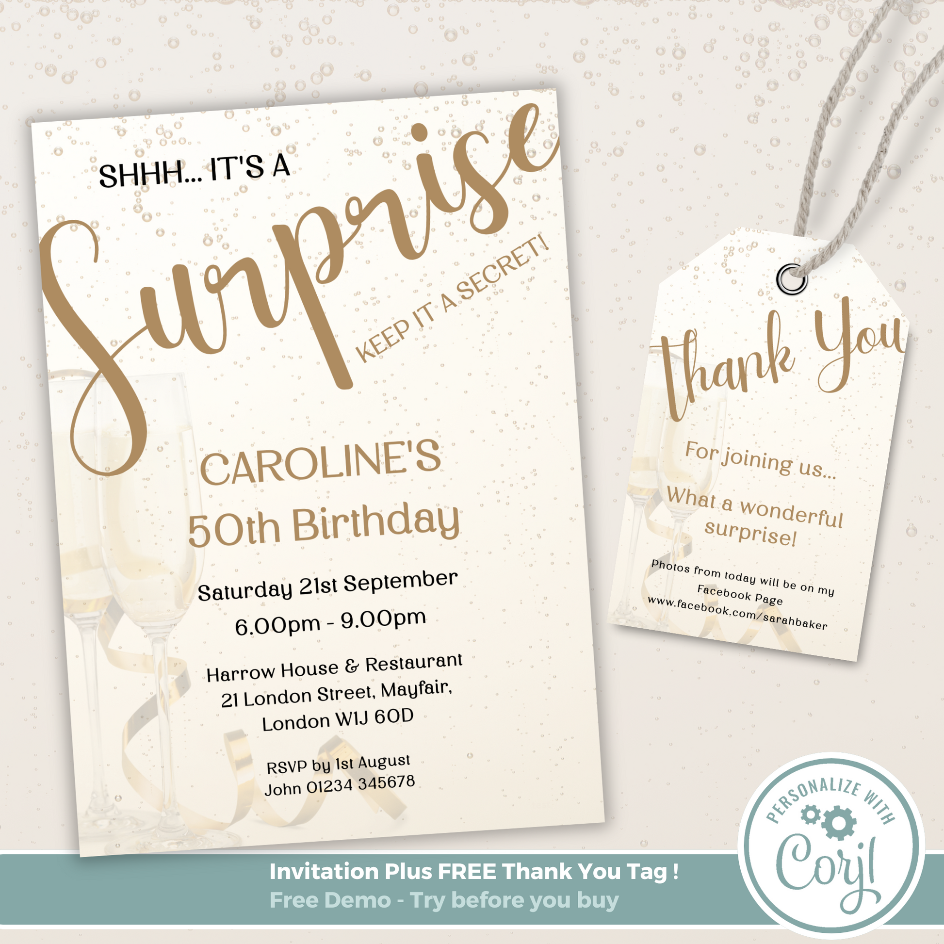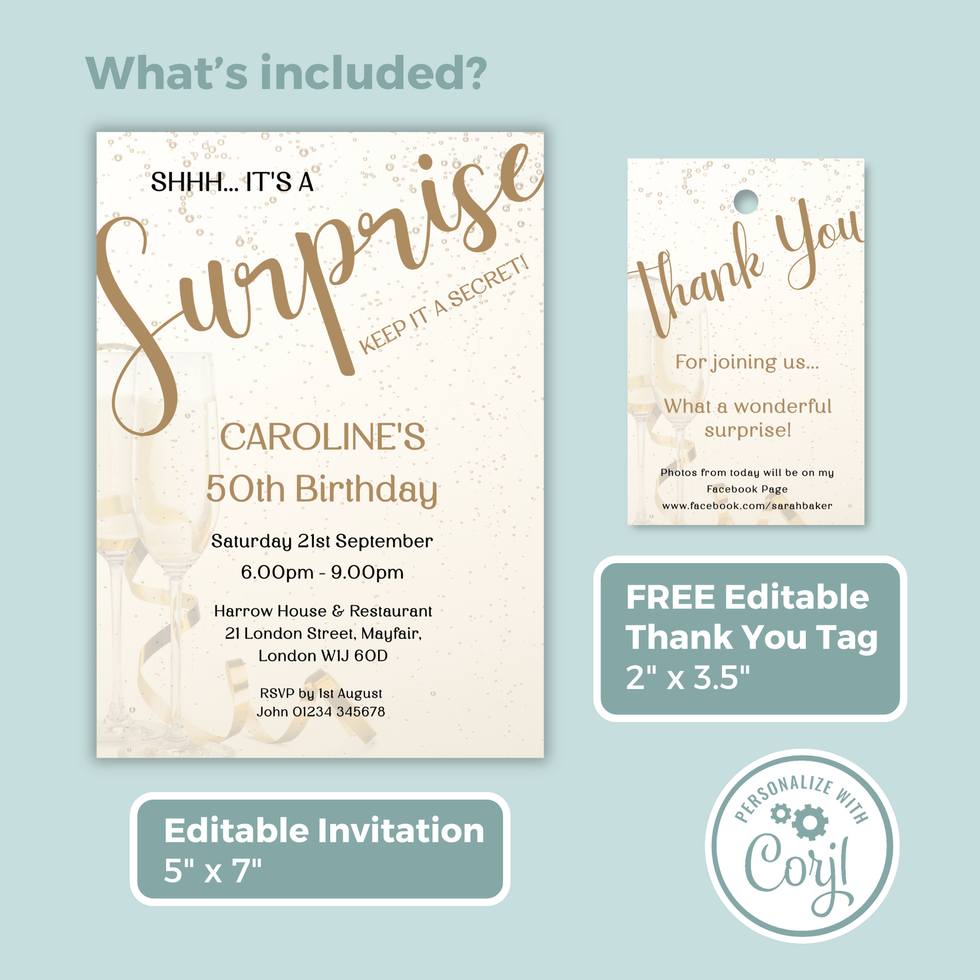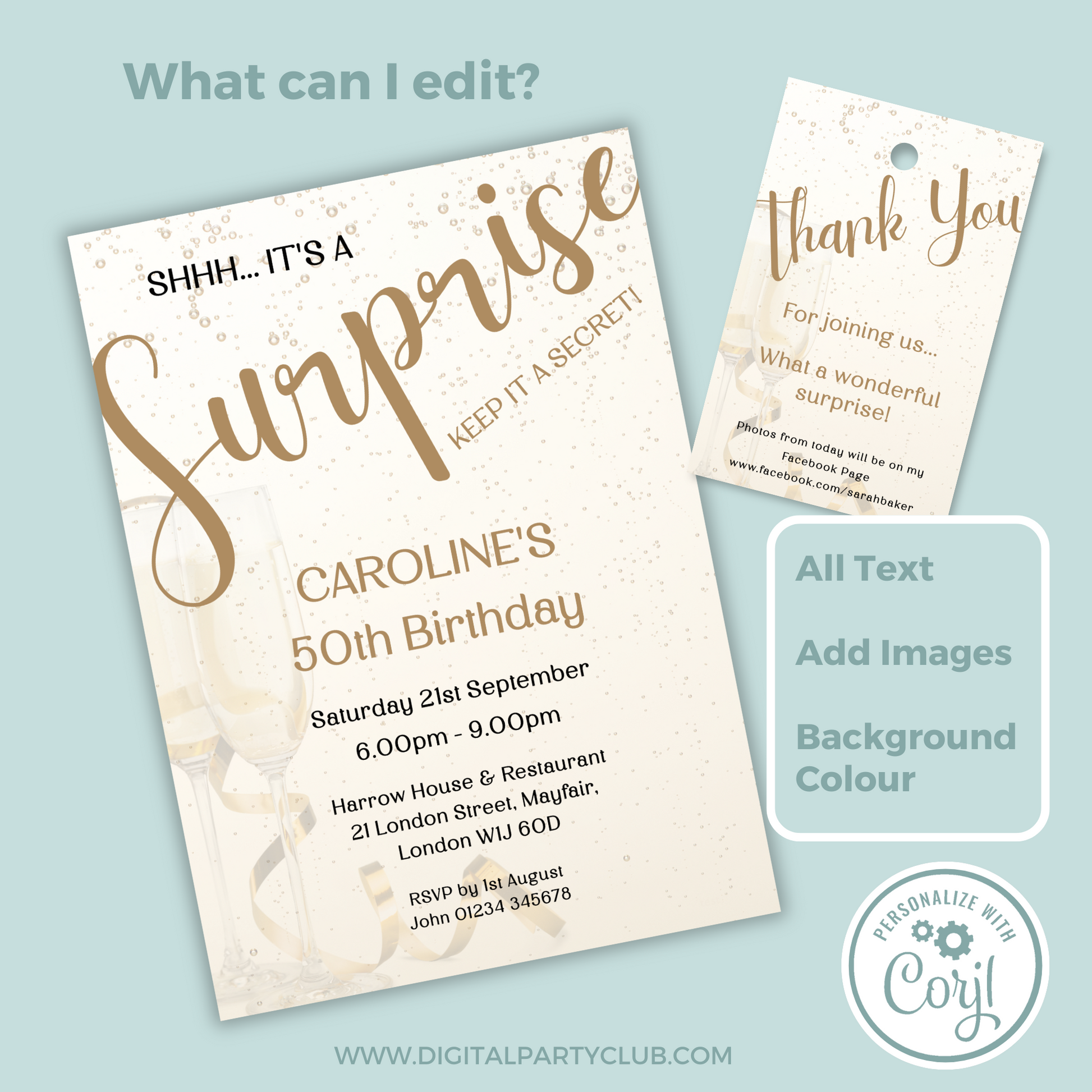 Editable Birthday Invitation and FREE Thank You Tag - Surprise Gold