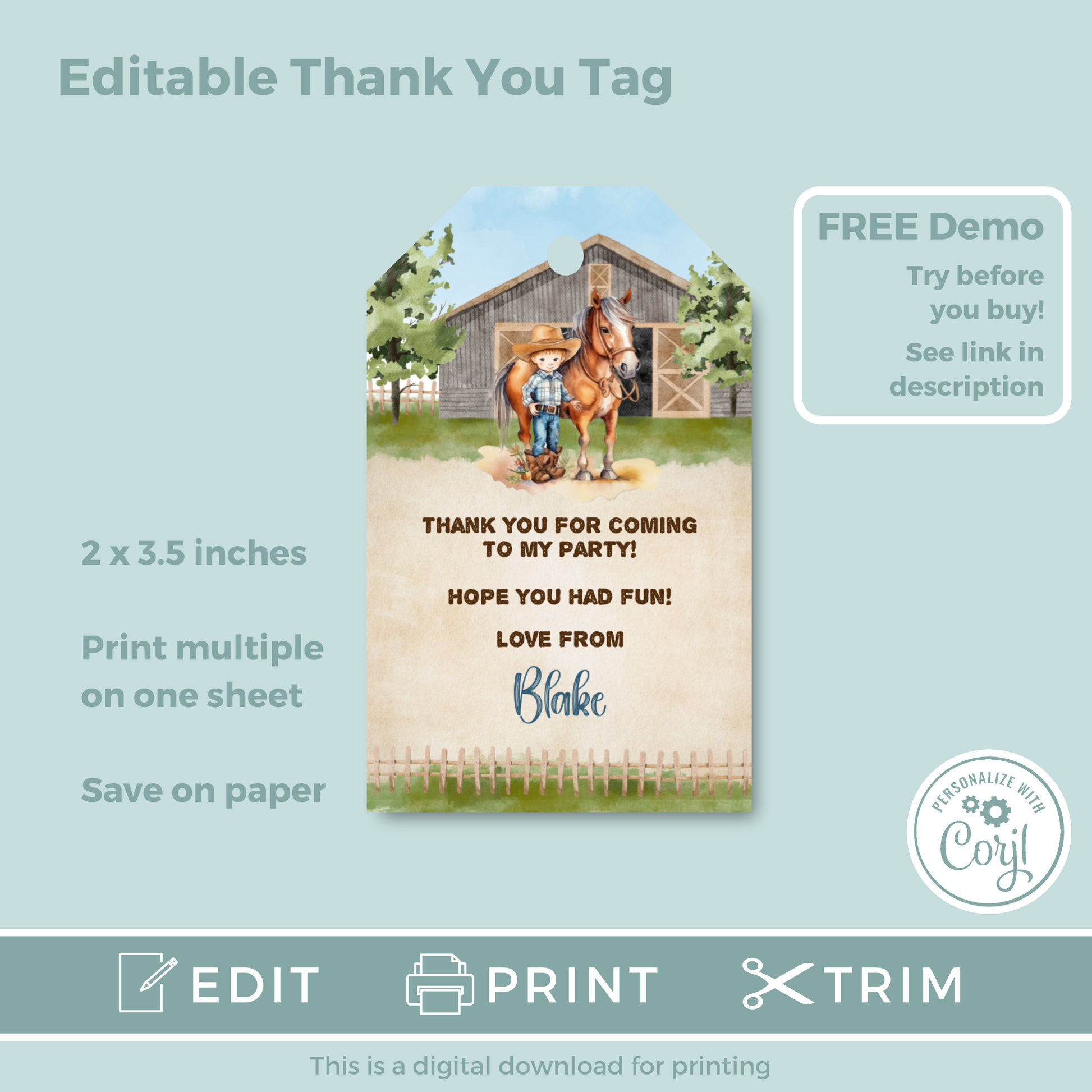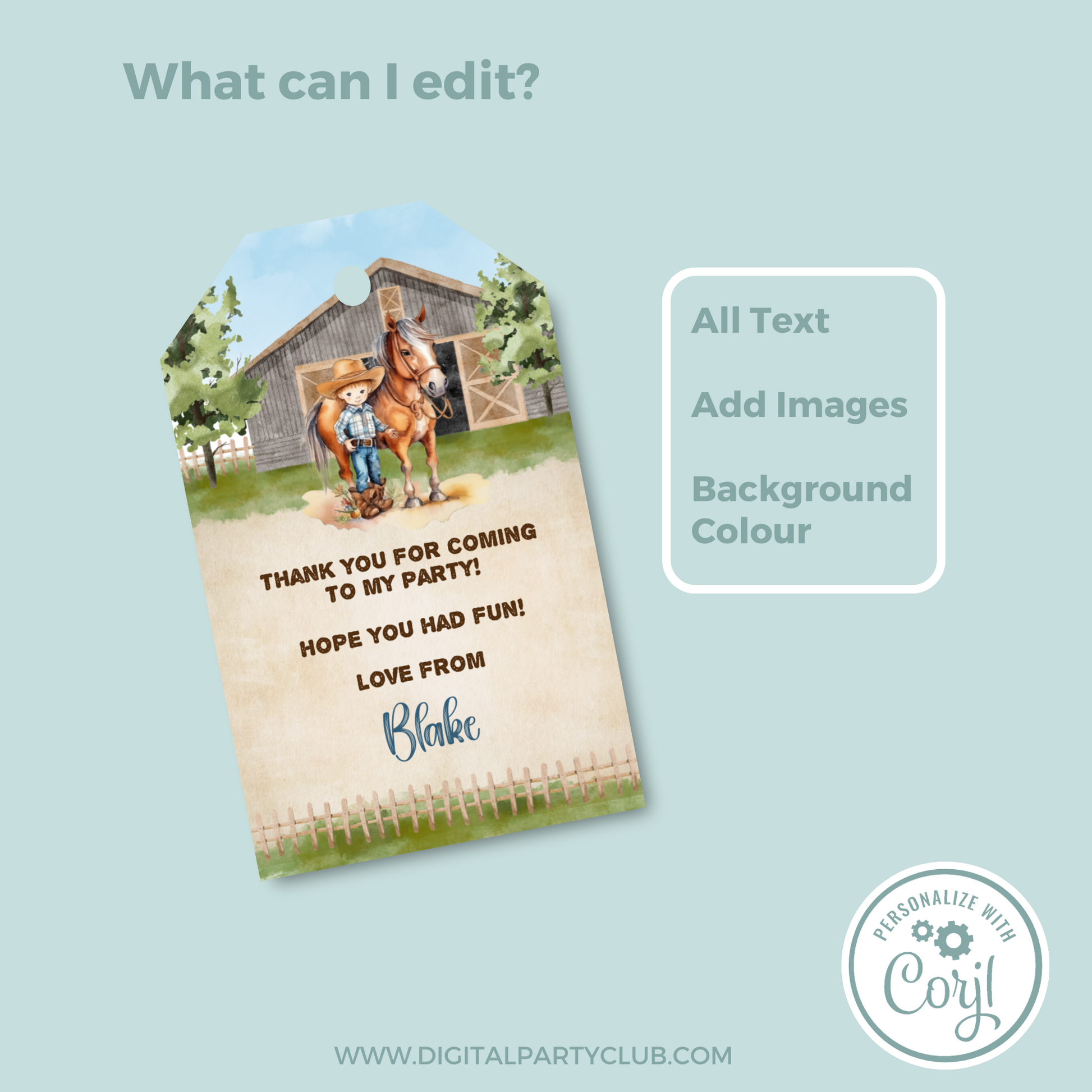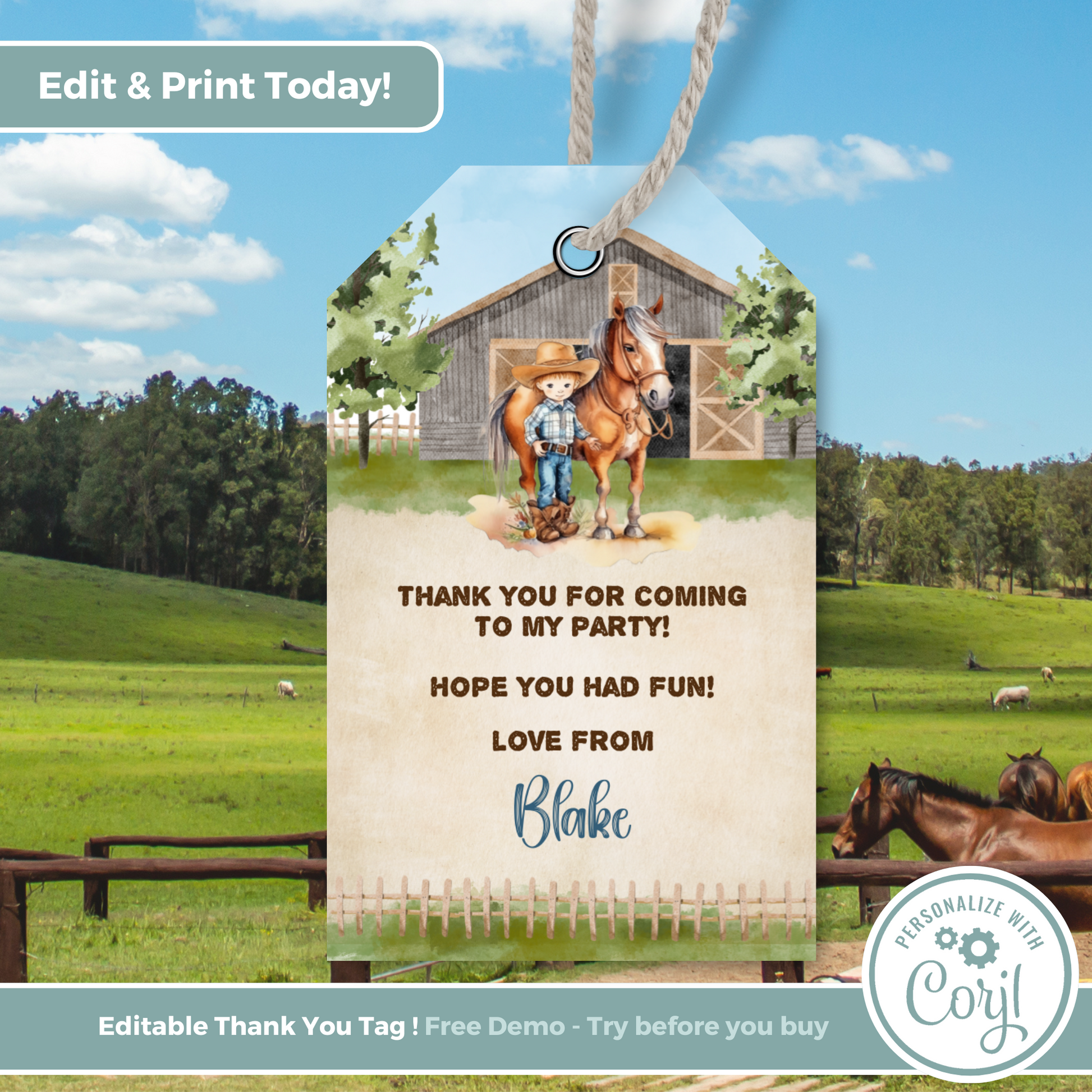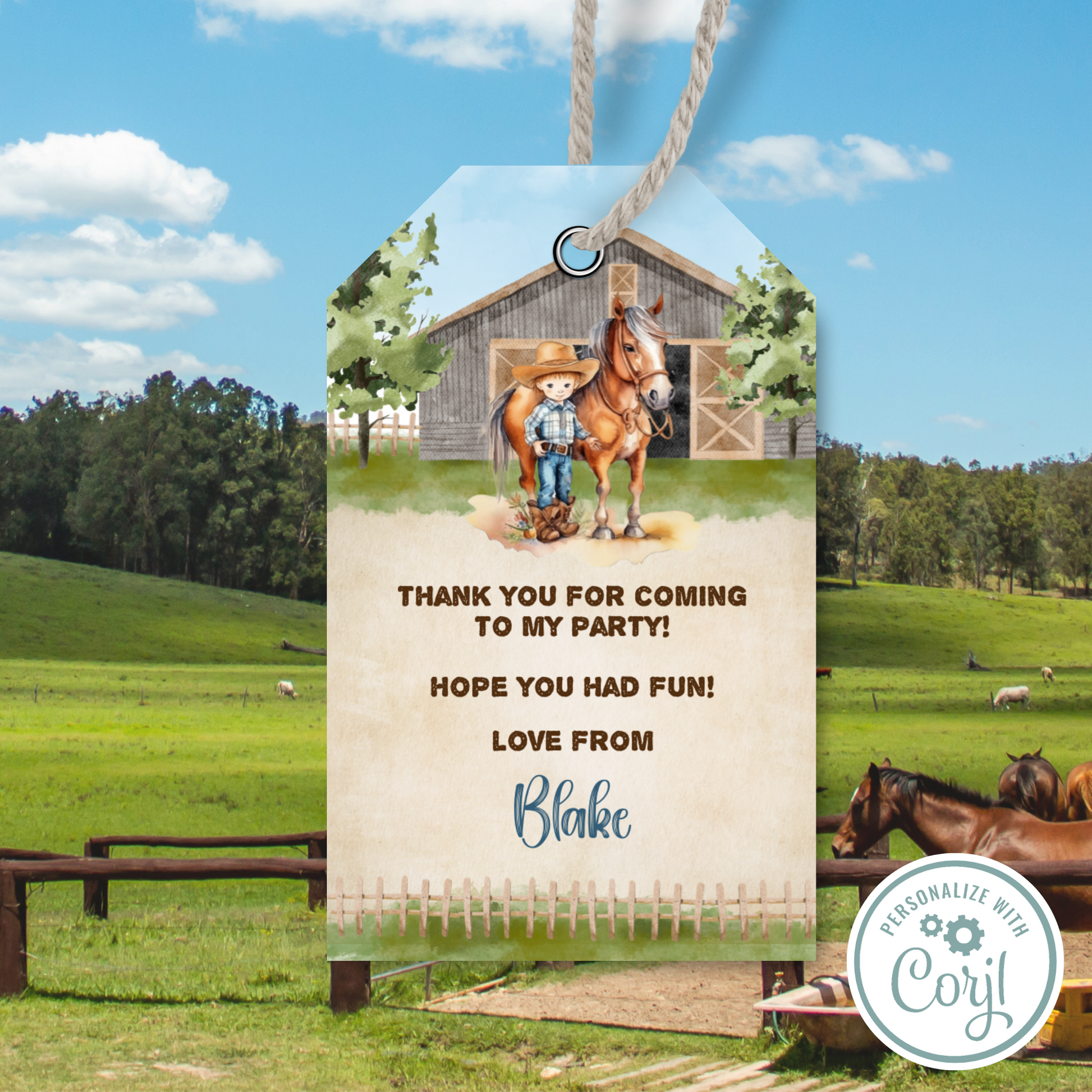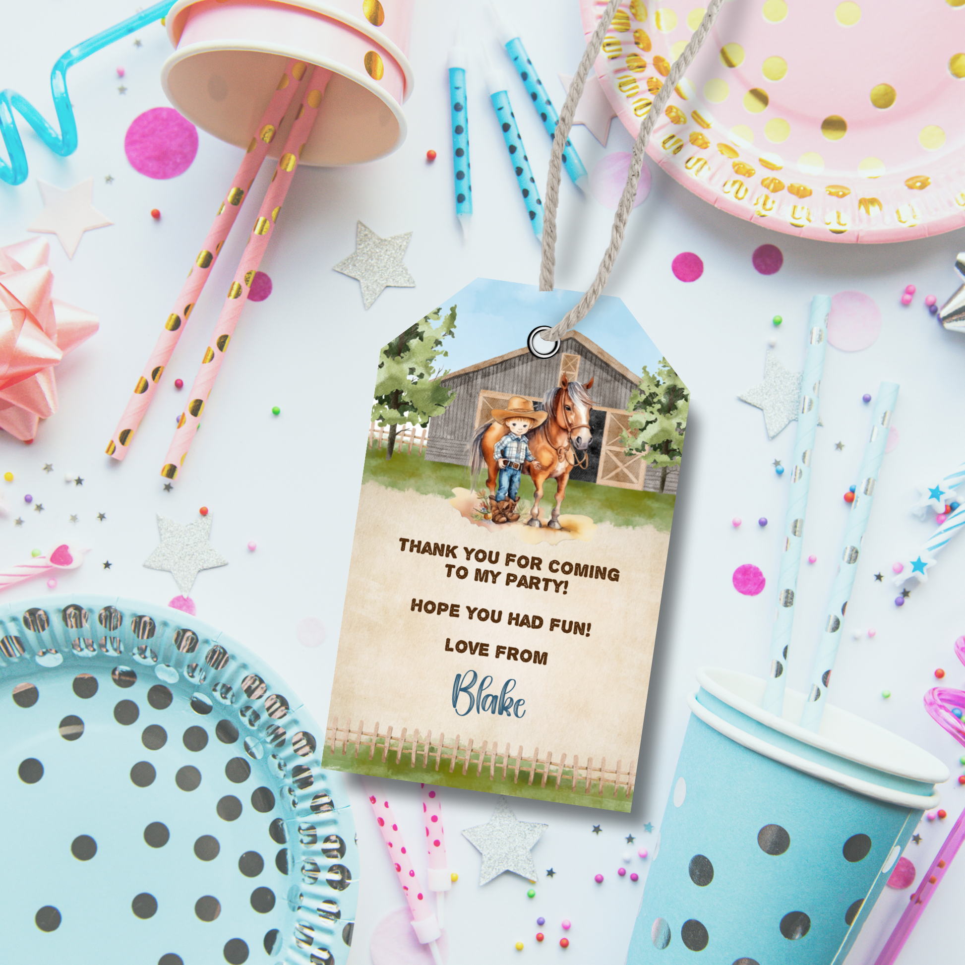 Editable Birthday Thank You Tag - Cowboy
