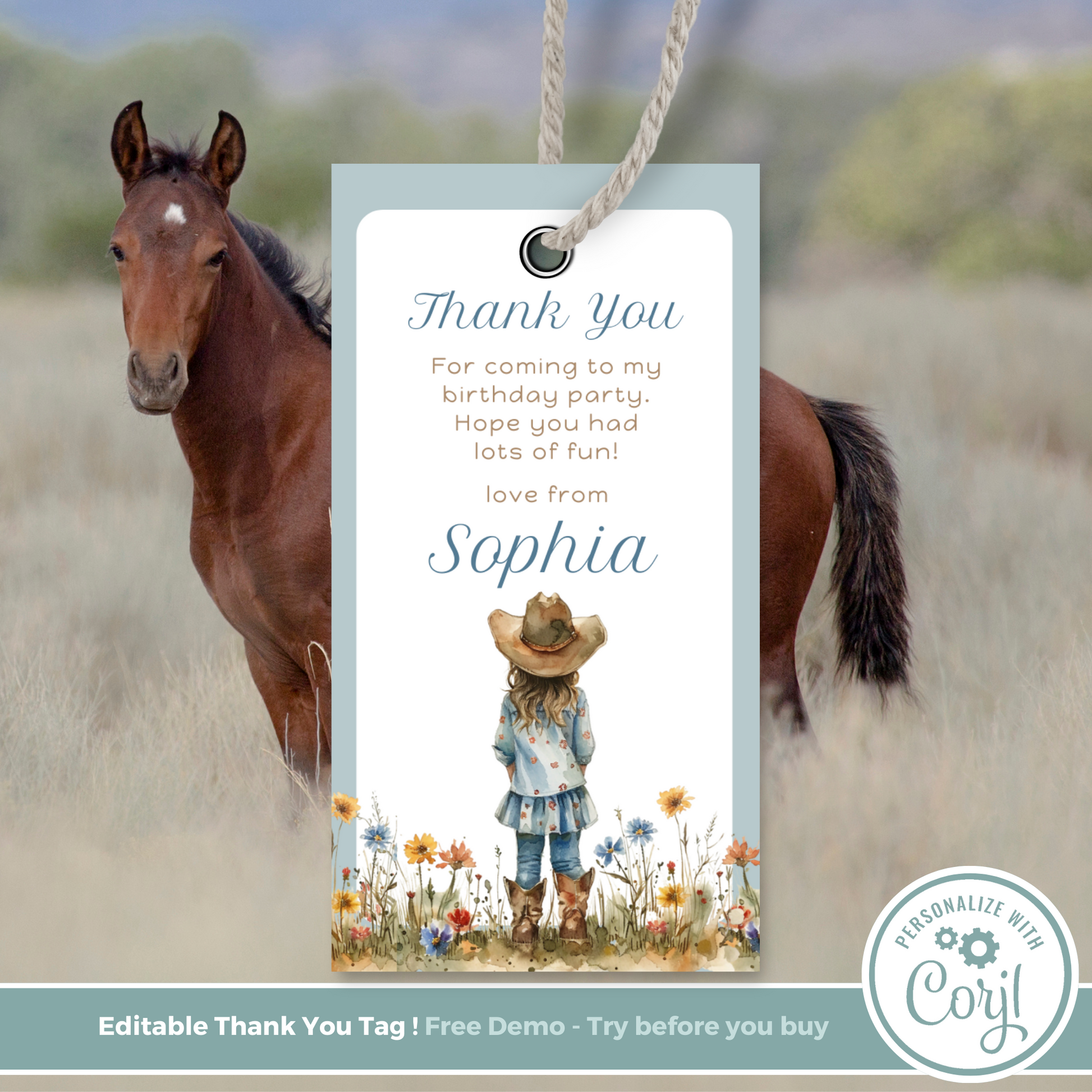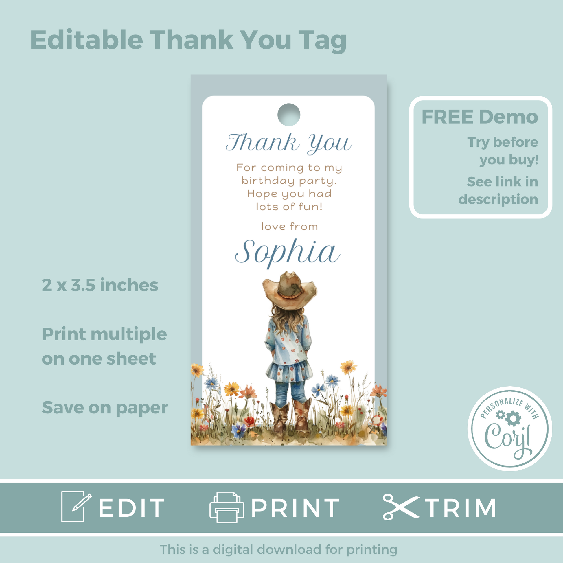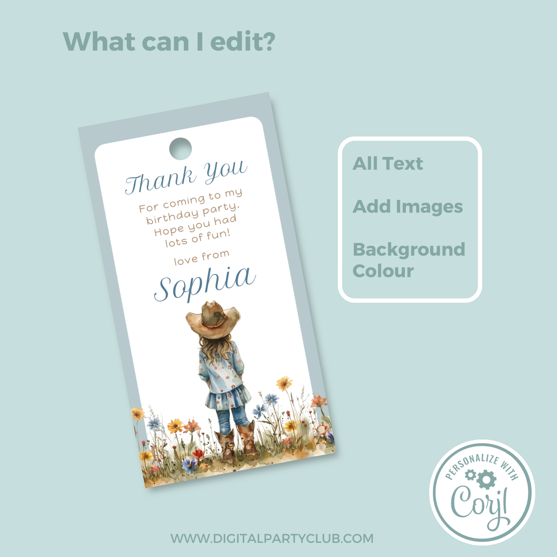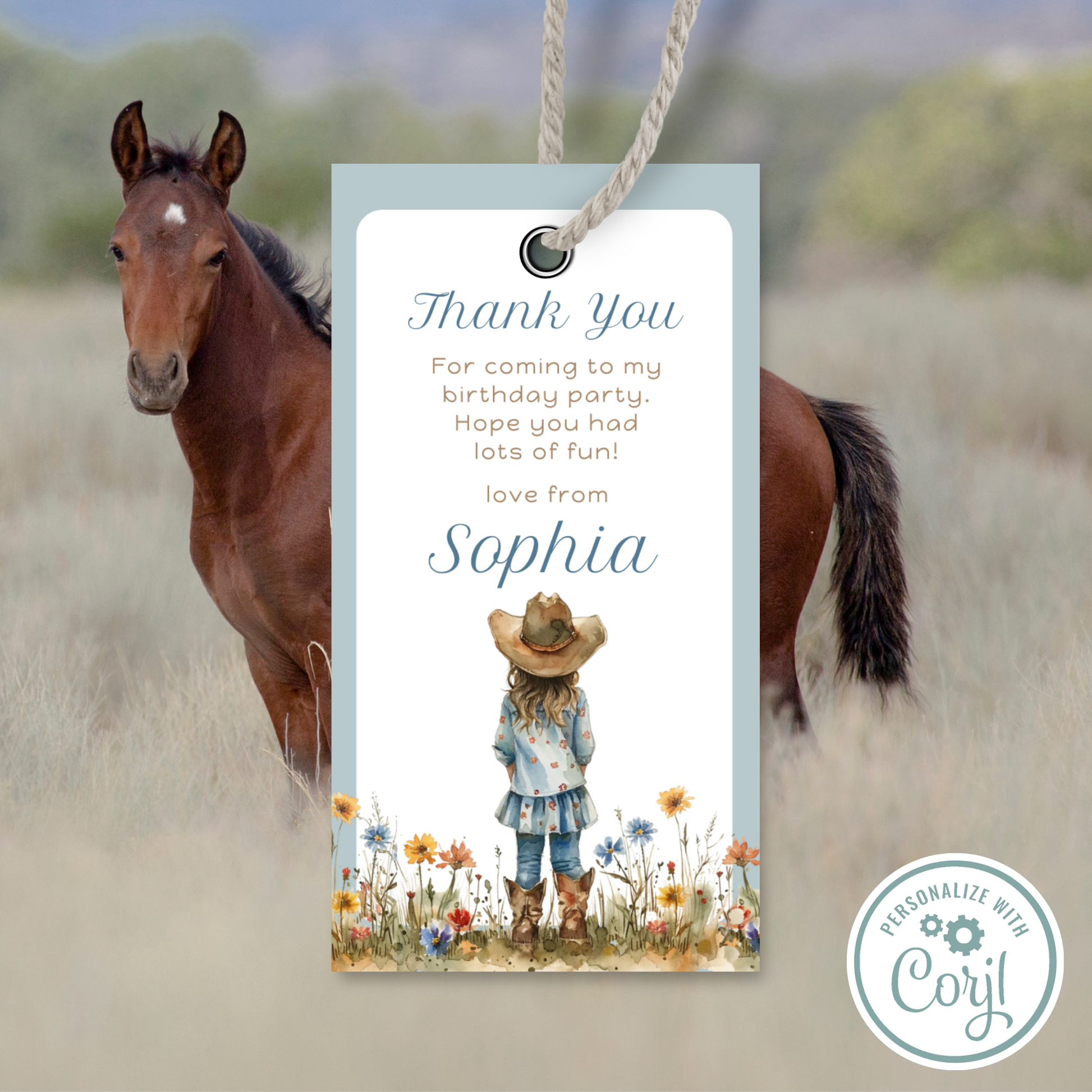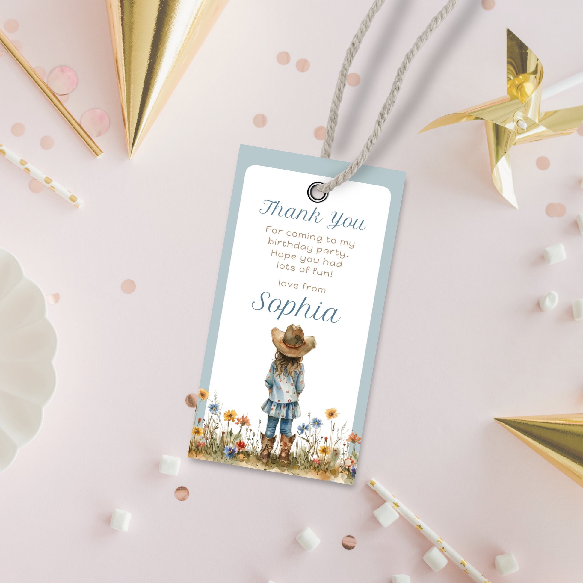Editable Birthday Thank You Tag - Cowgirl Blue