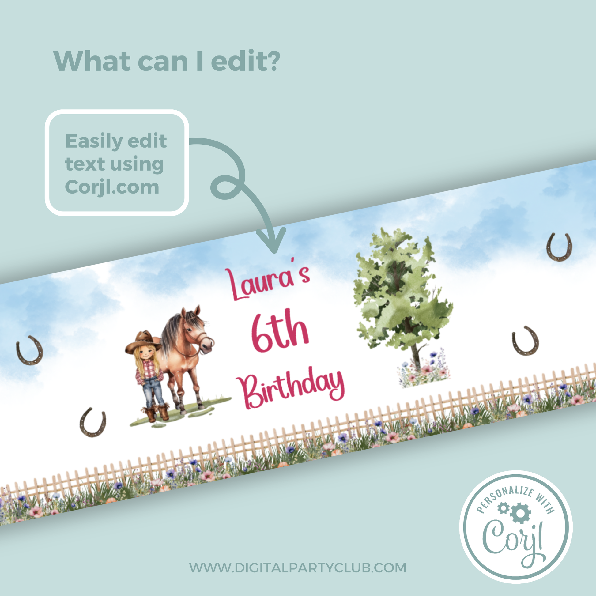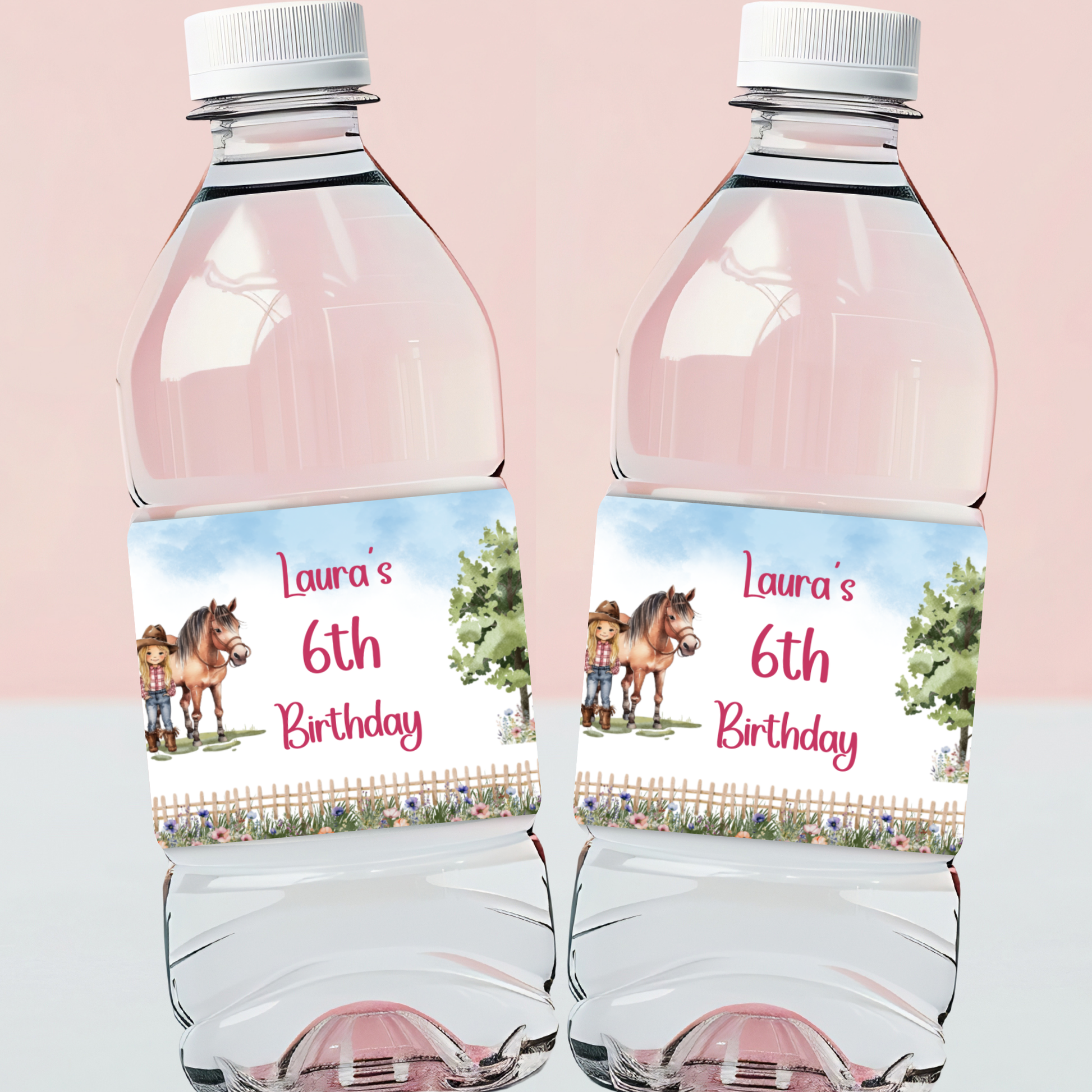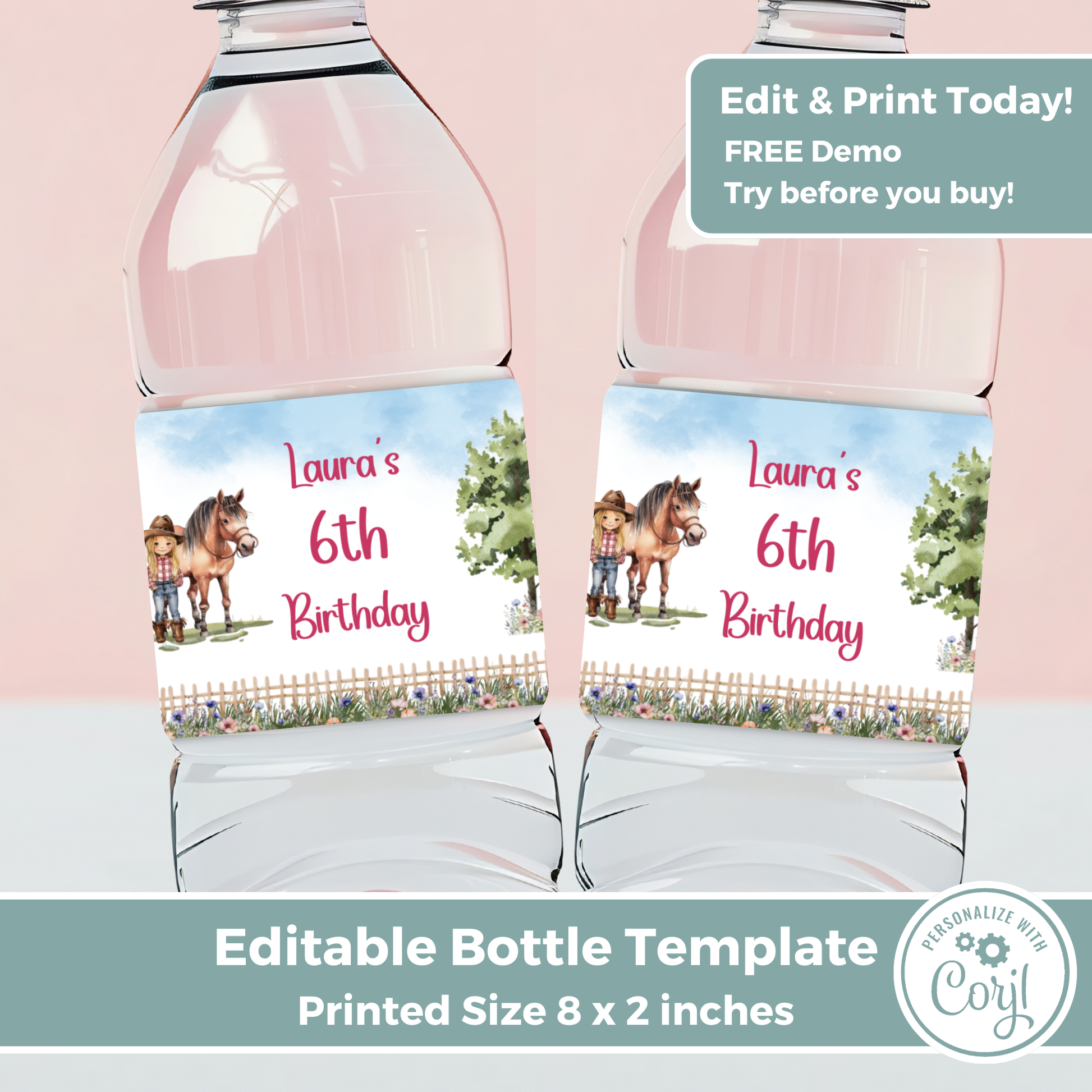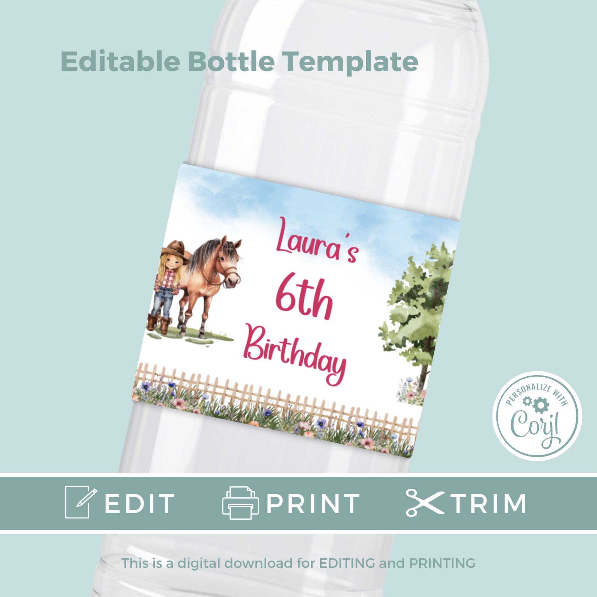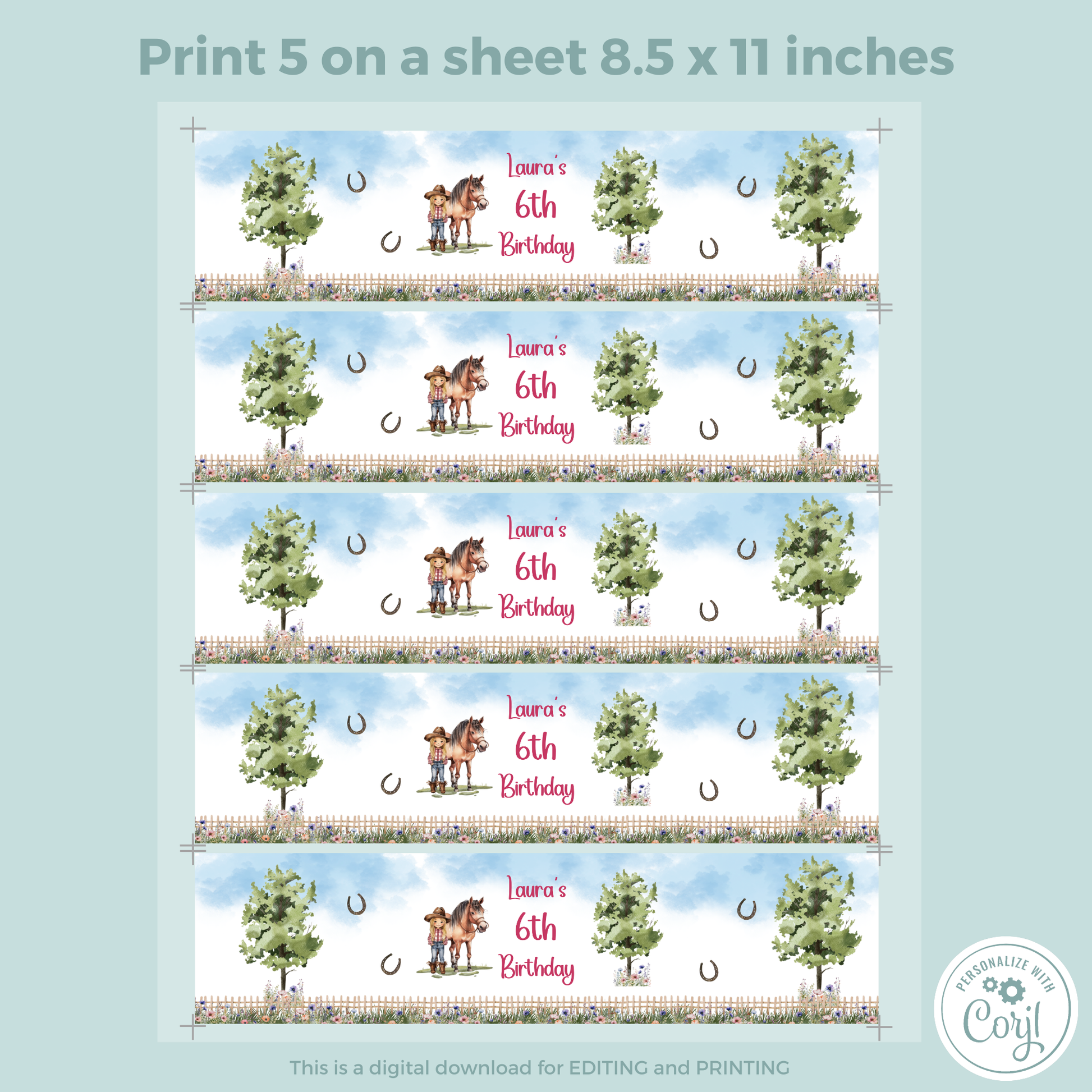 Editable Birthday Water Bottle Label - Saddle Up Girl