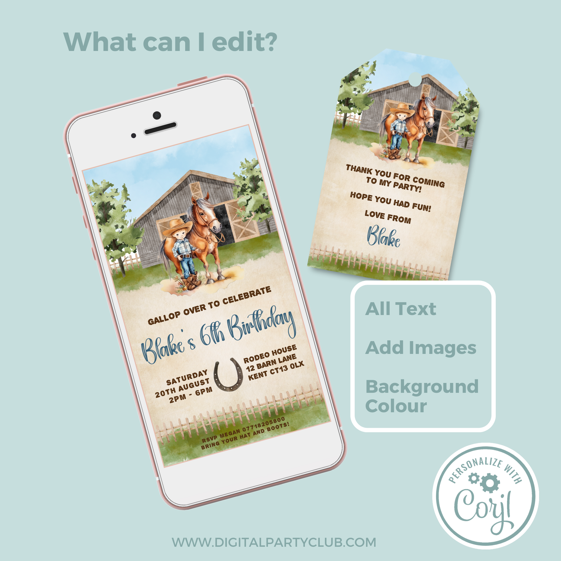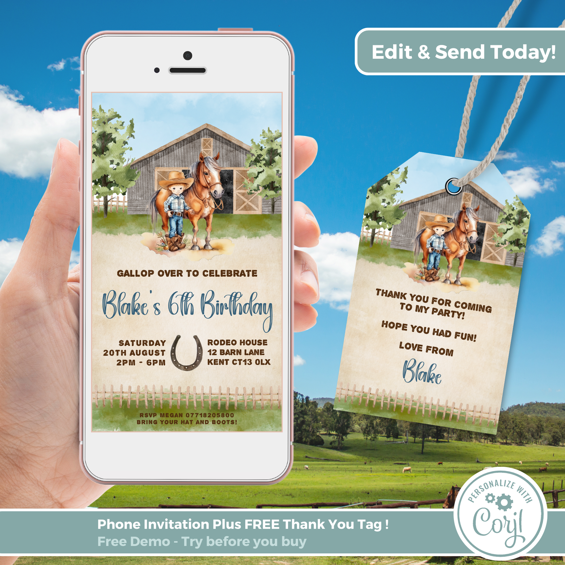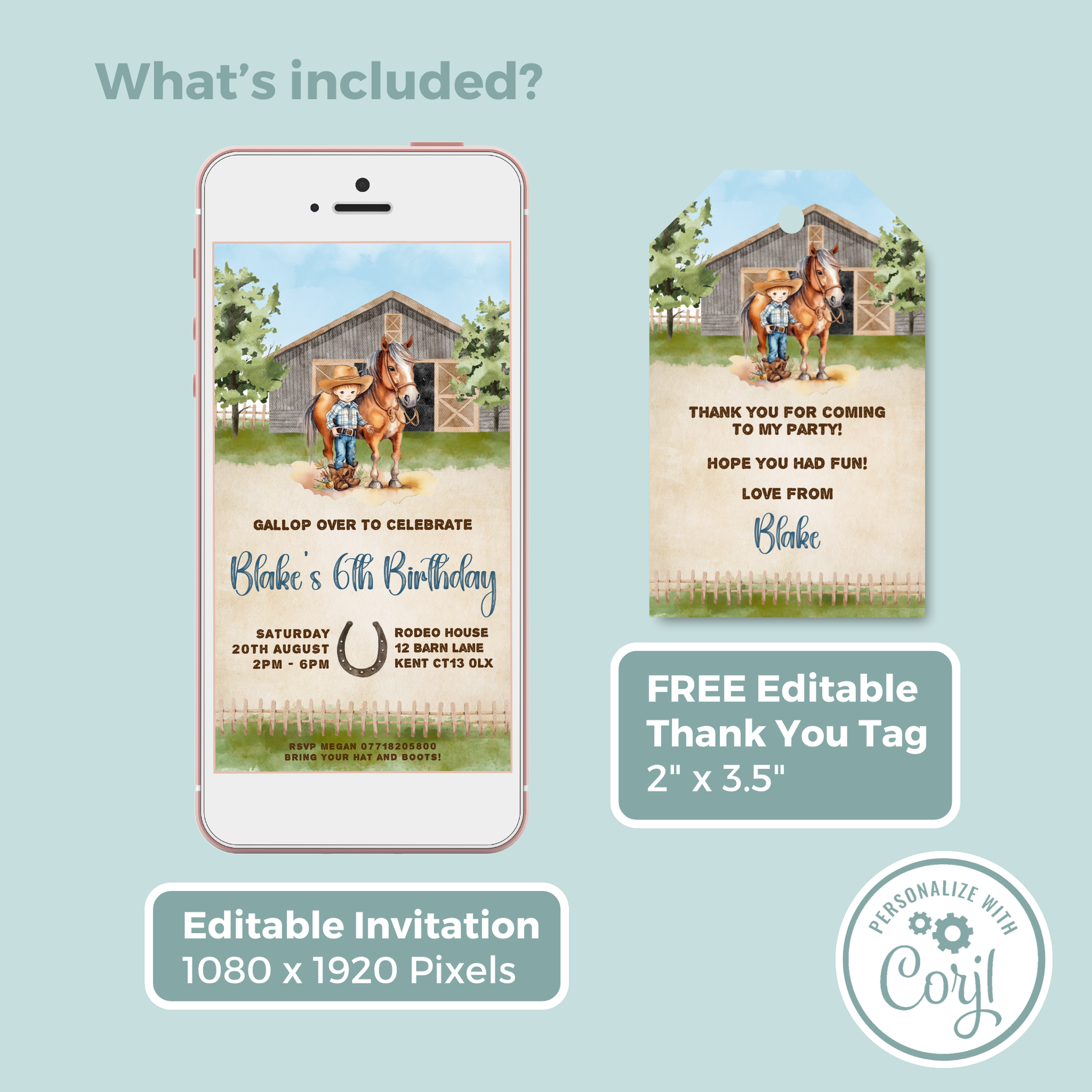 Editable Evite Birthday Invitation and FREE Thank You Tag - Cowboy