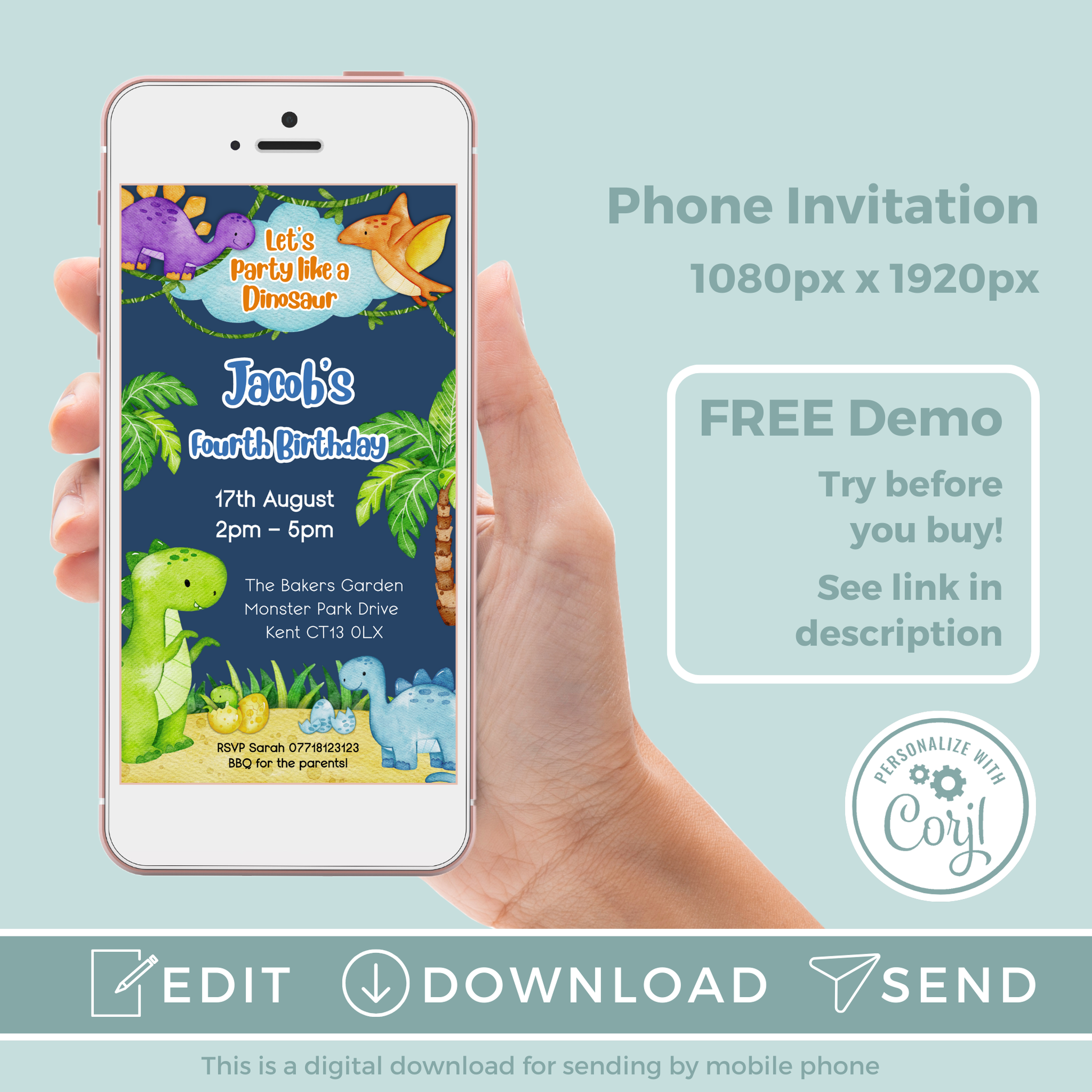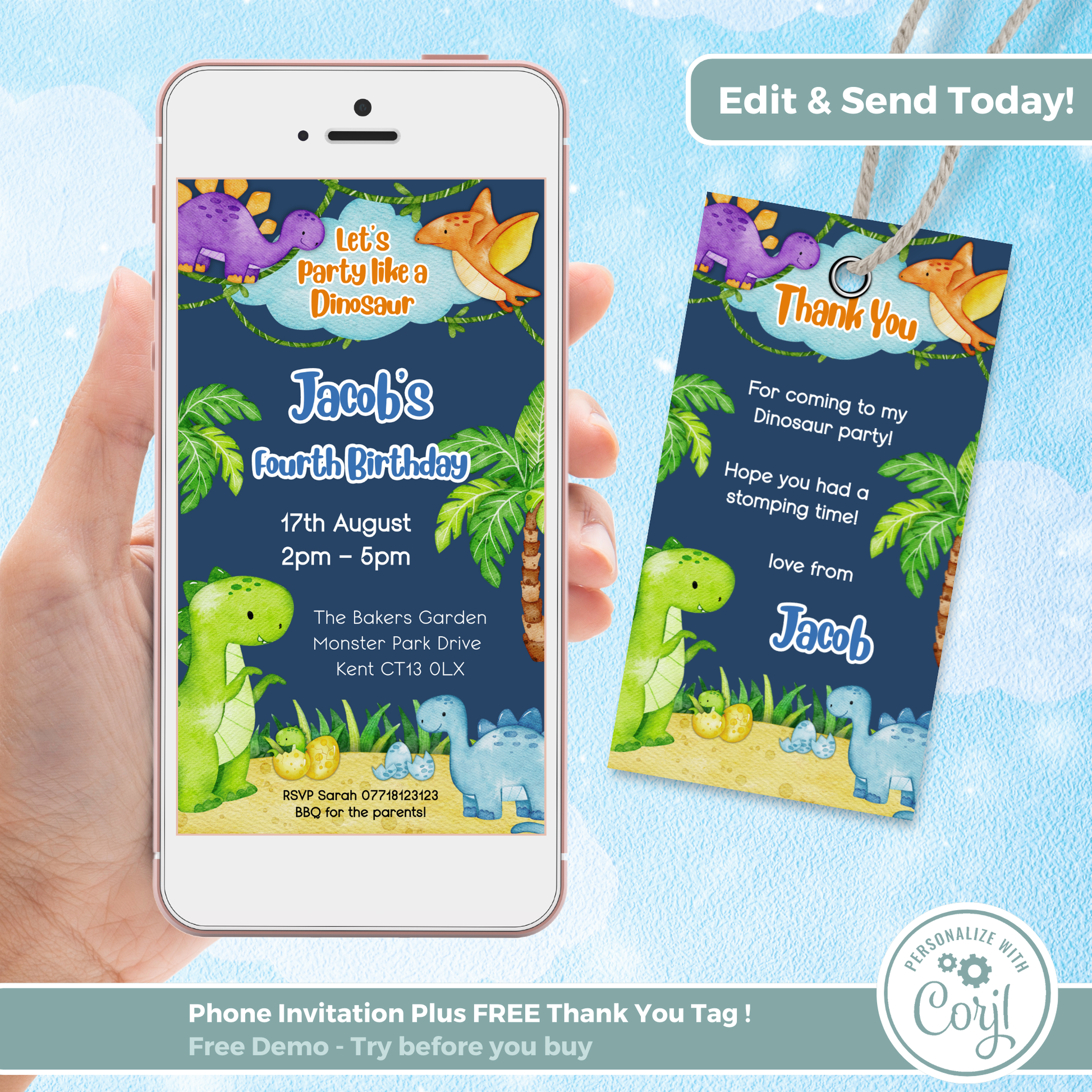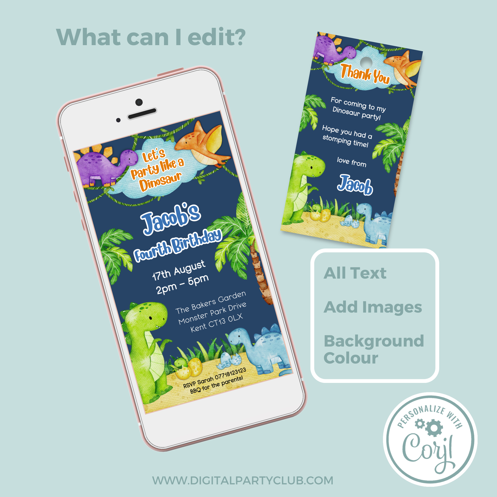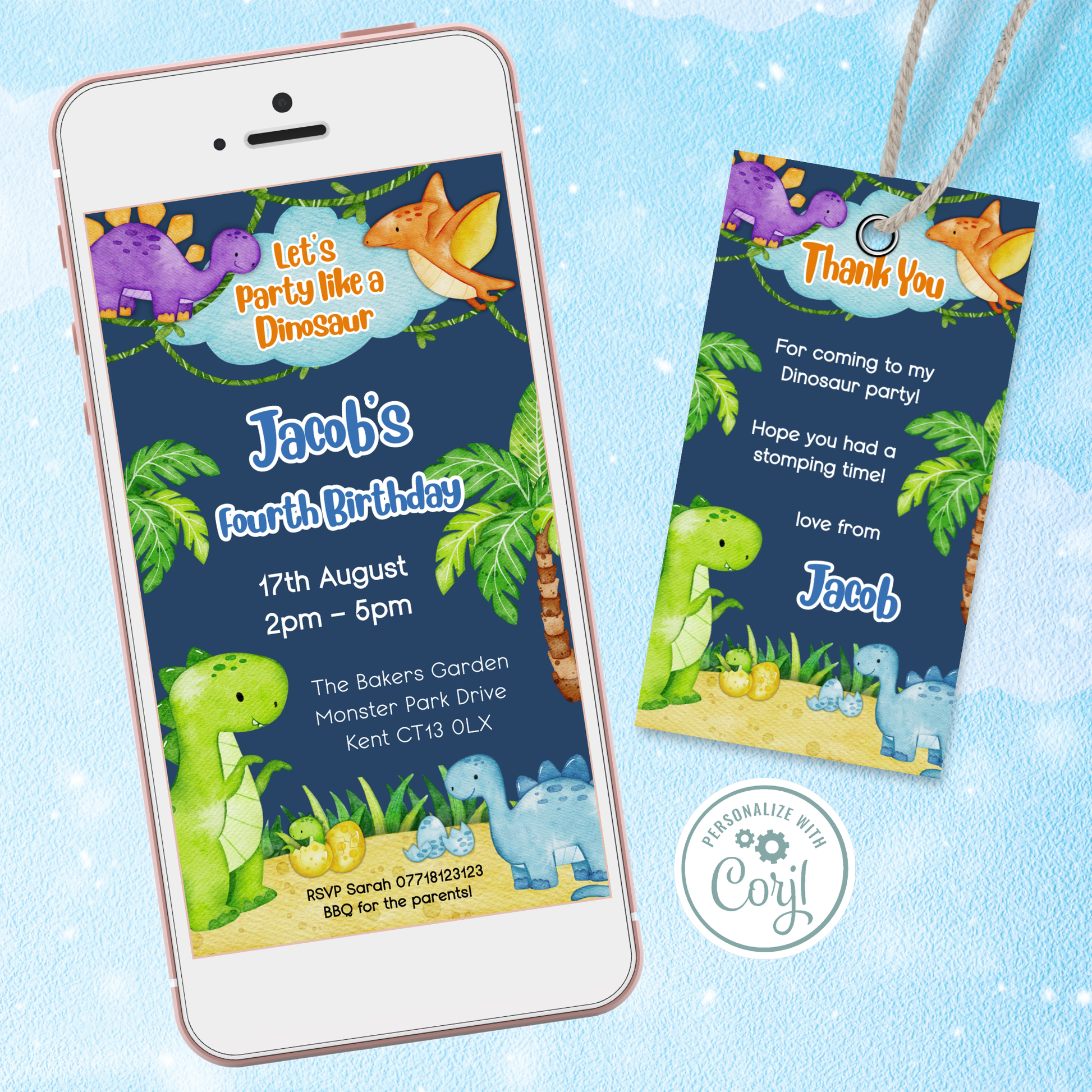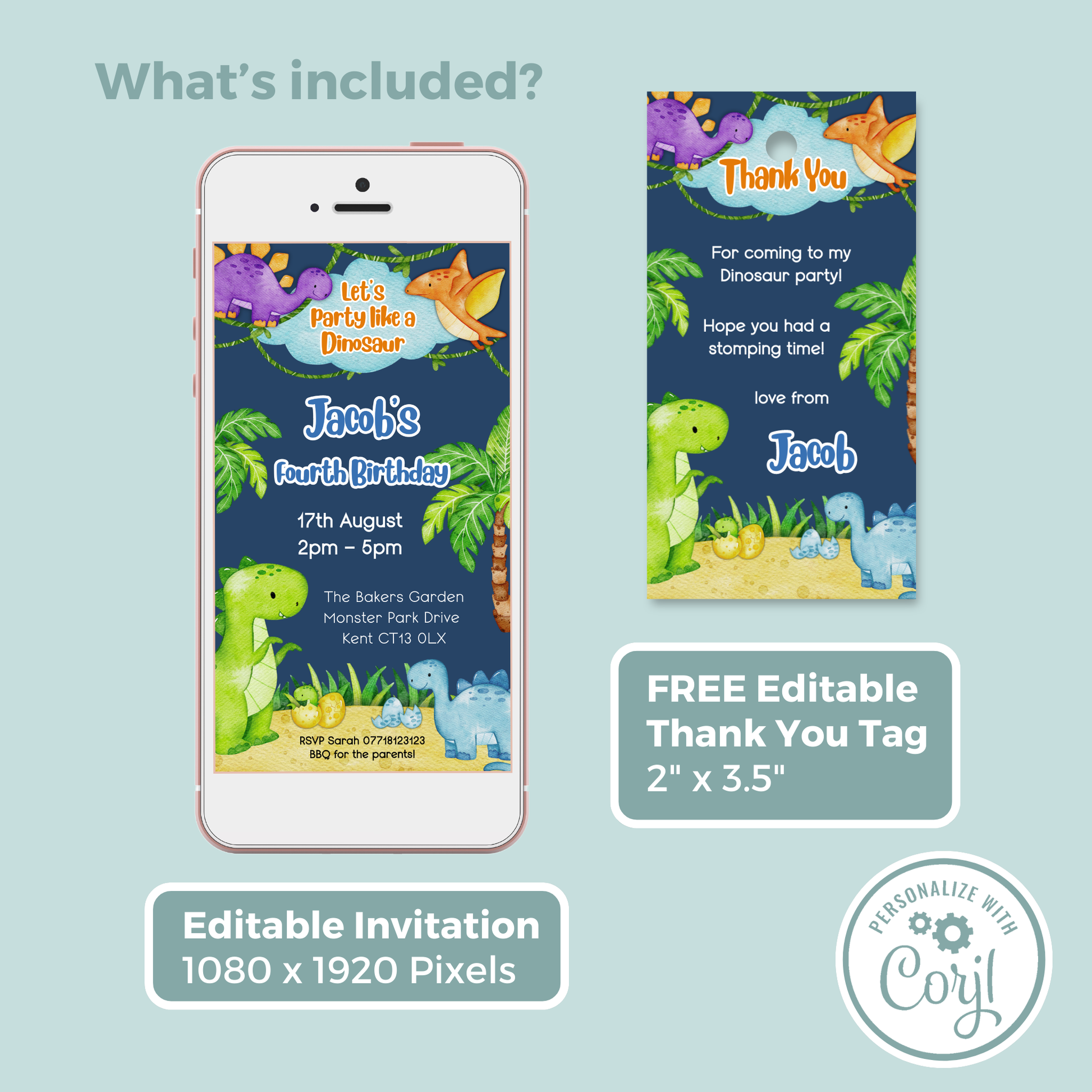 Editable Evite Birthday Invitation and FREE Thank You Tag - Dinosaur