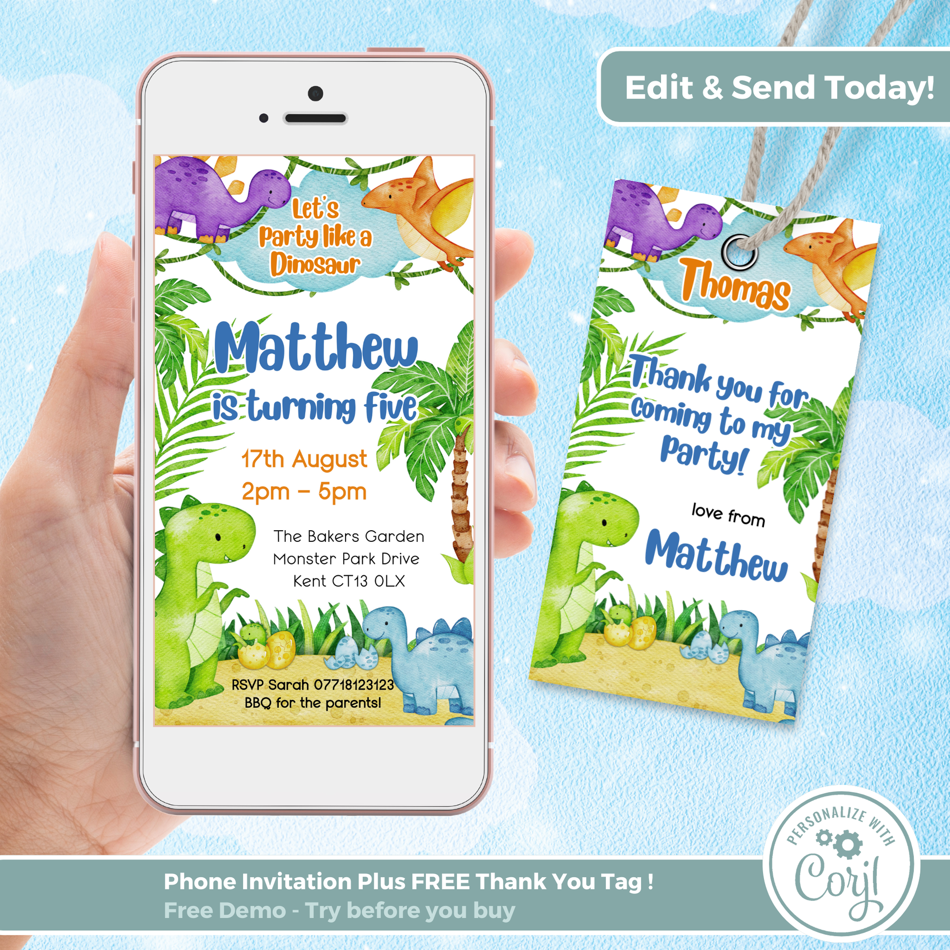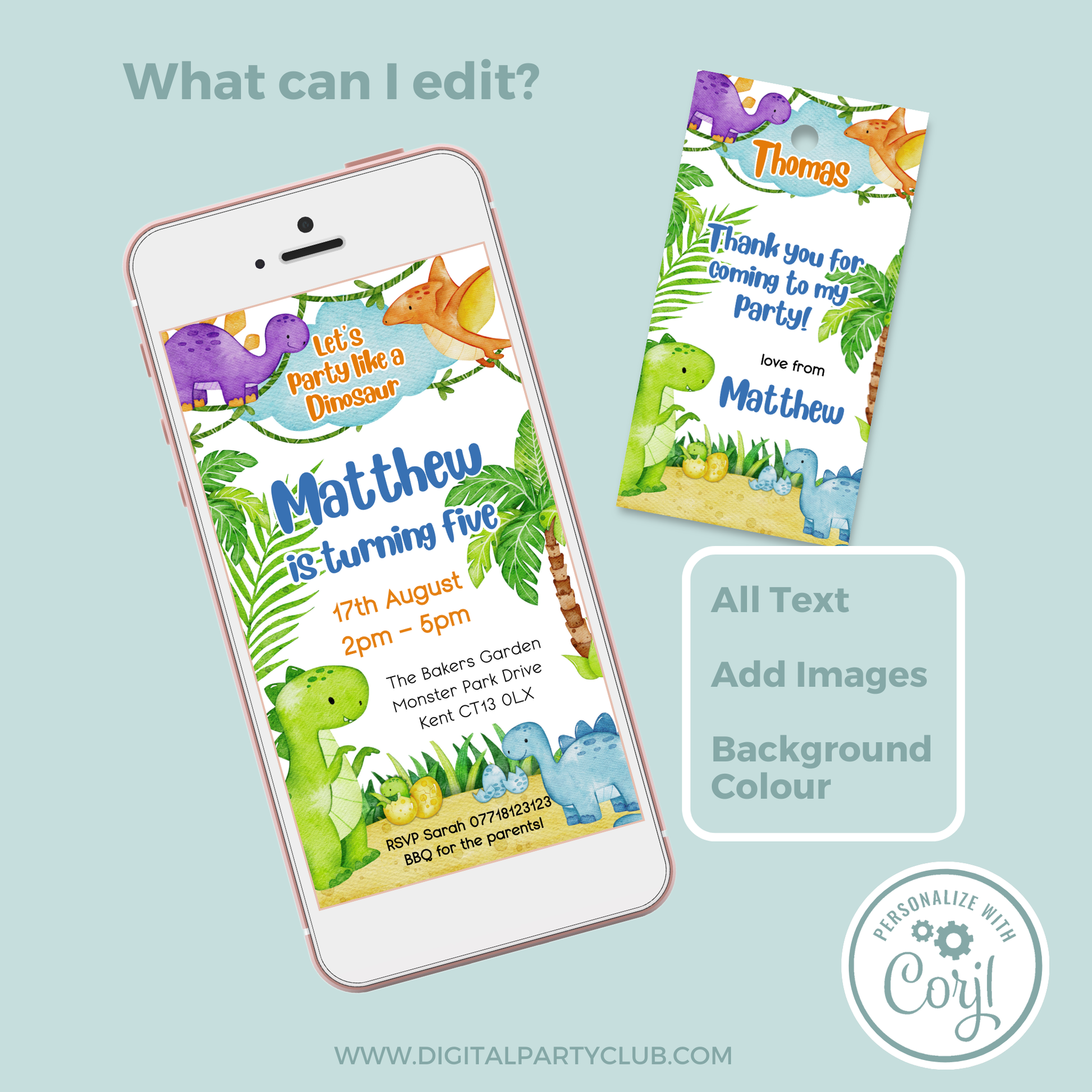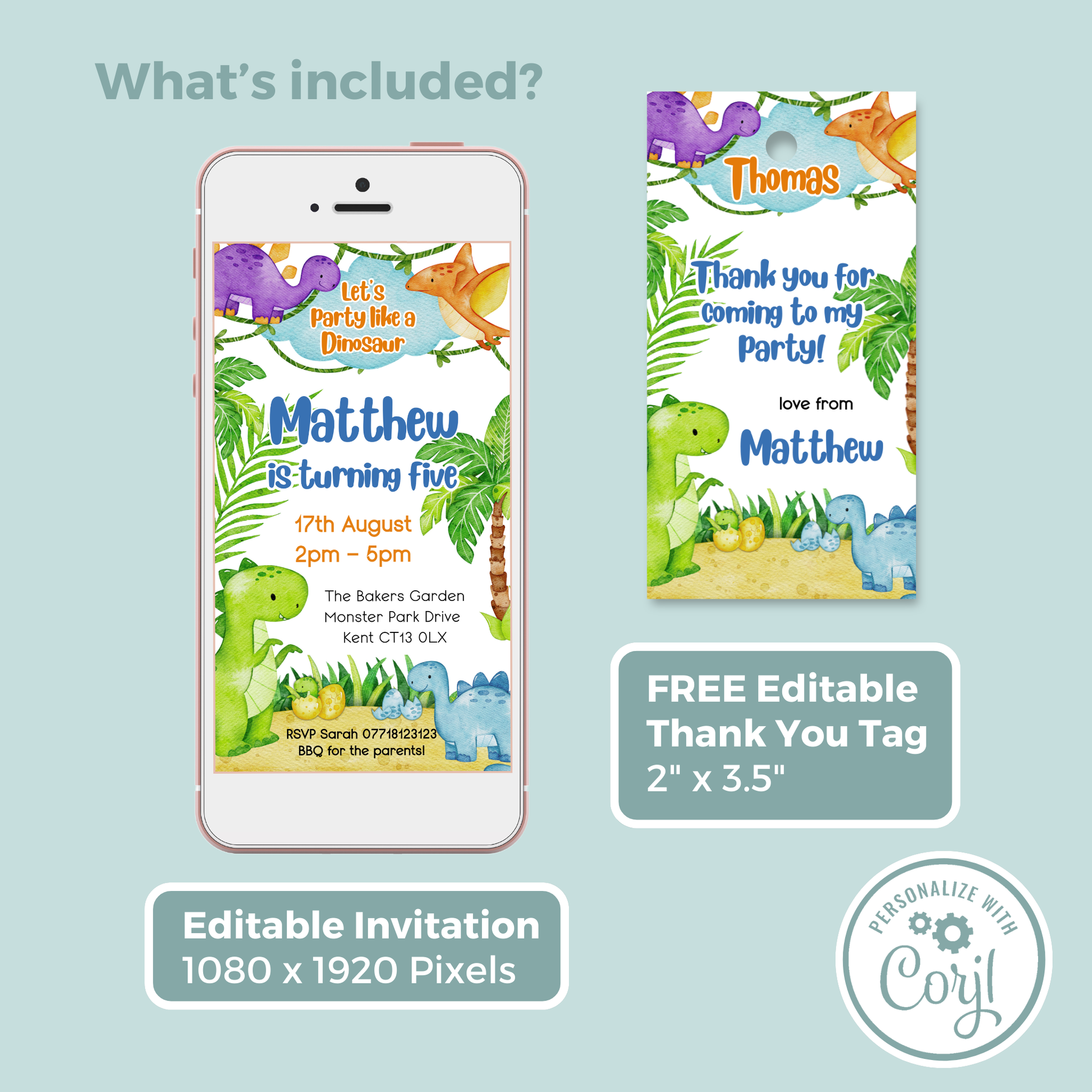 Editable Evite Birthday Invitation and FREE Thank You Tag - Dinosaur