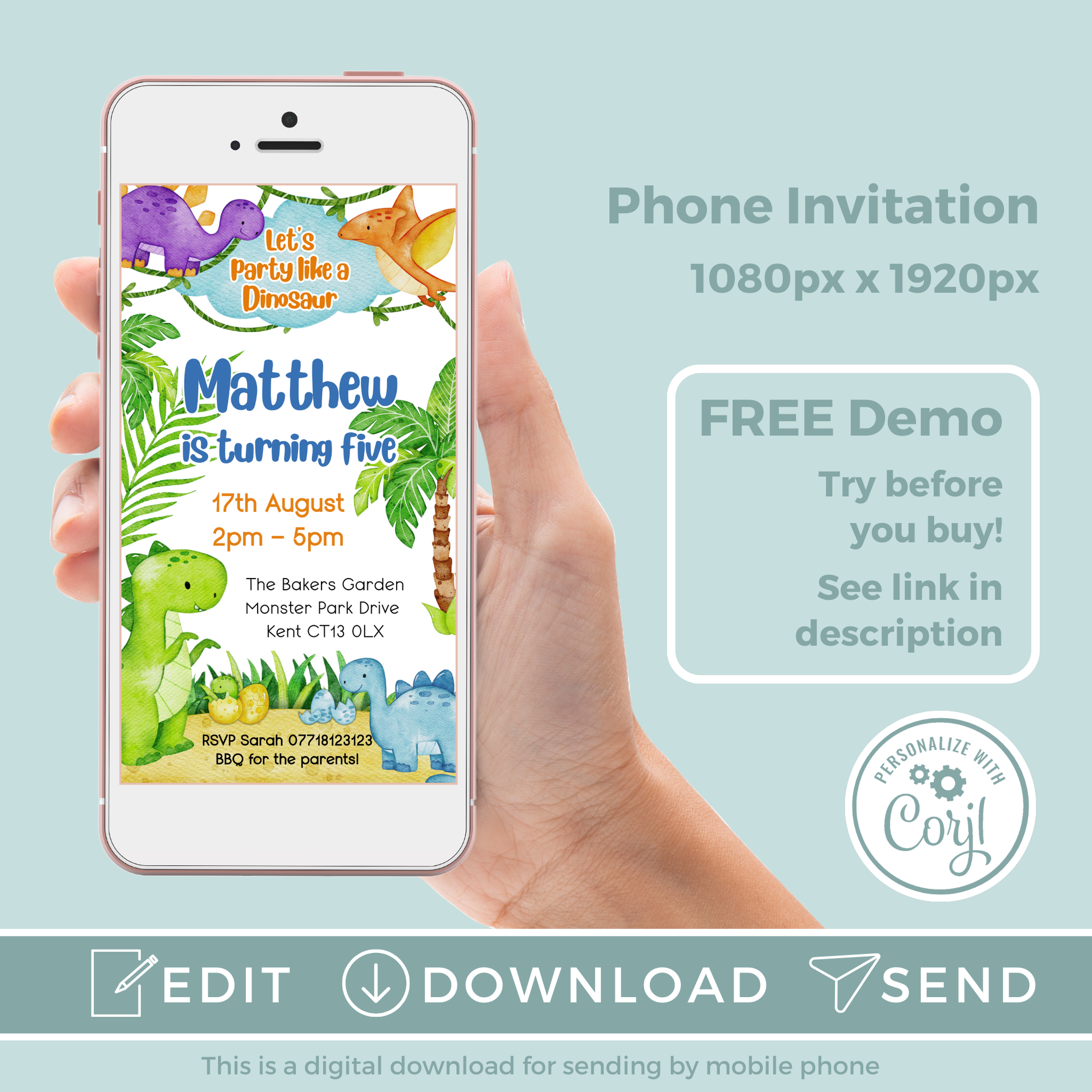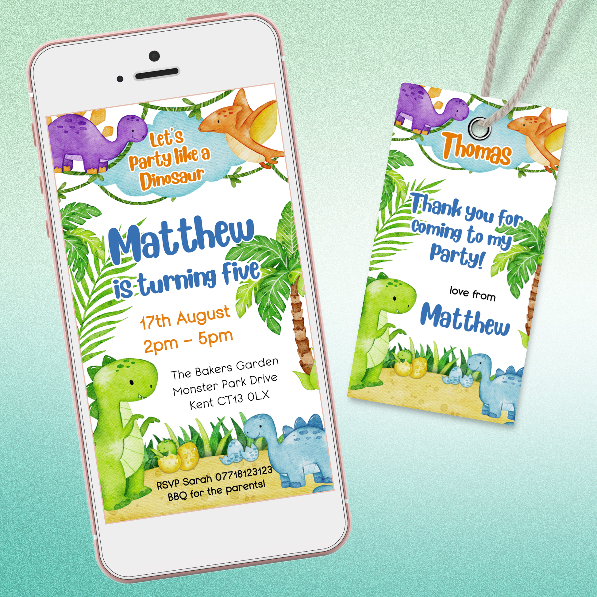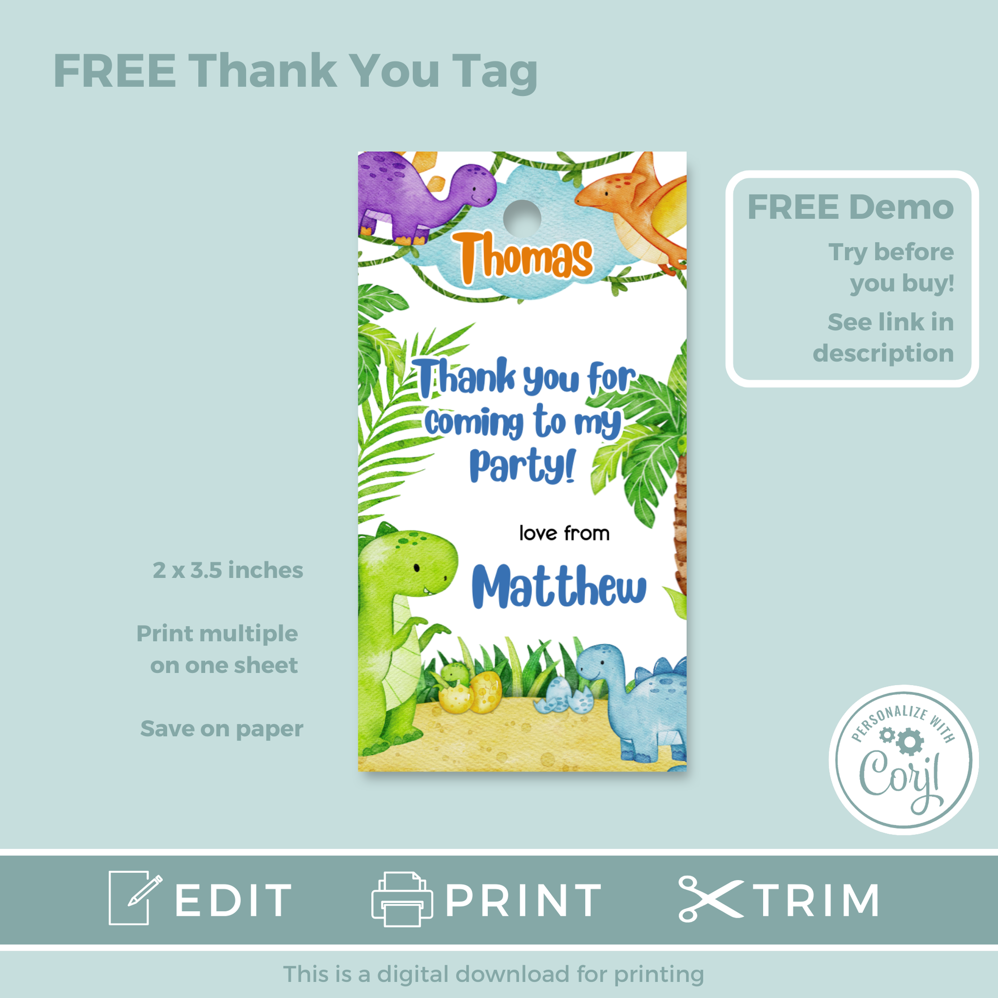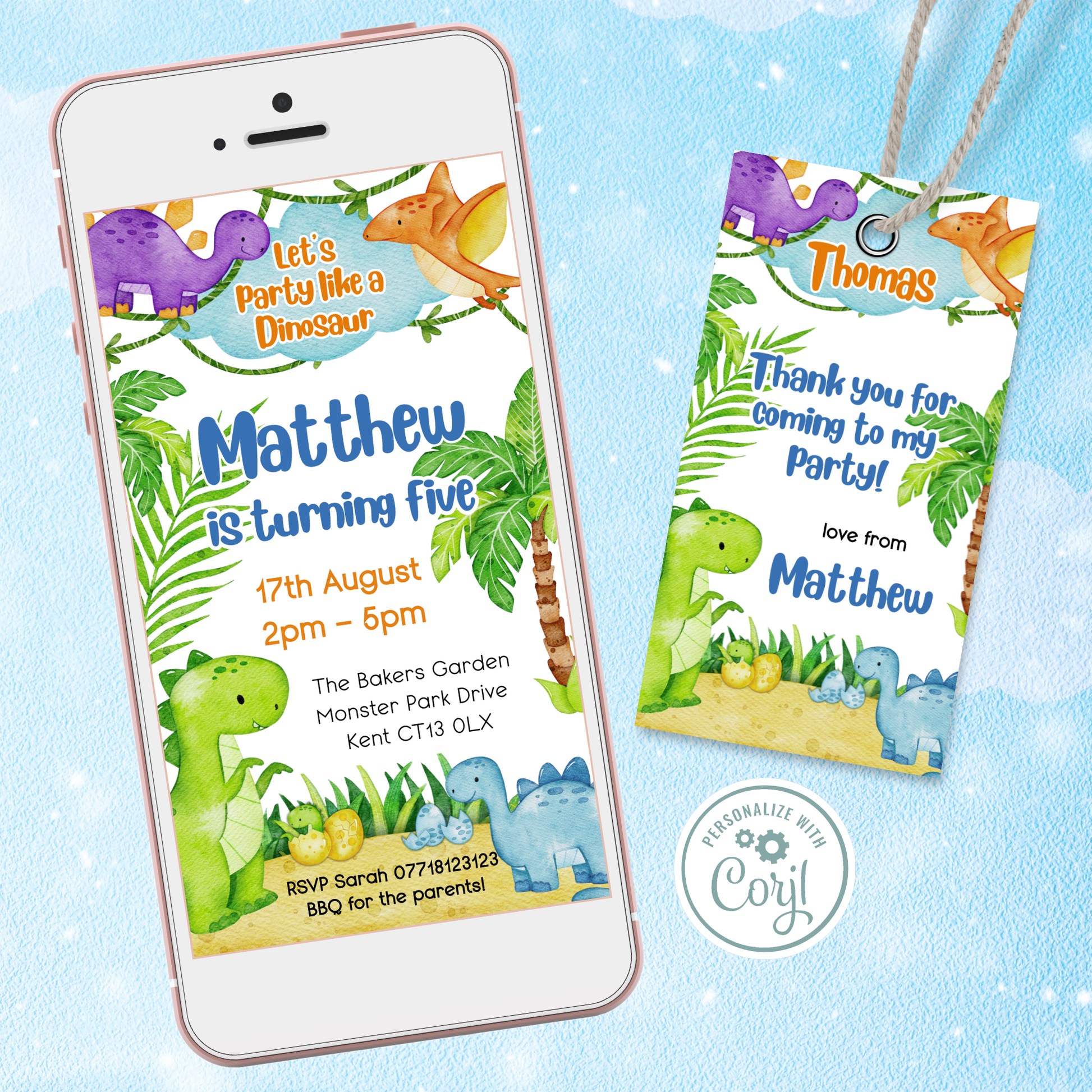 Editable Evite Birthday Invitation and FREE Thank You Tag - Dinosaur