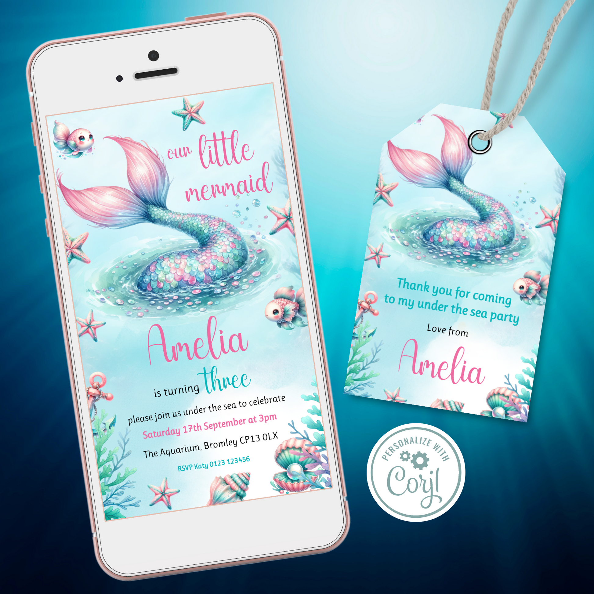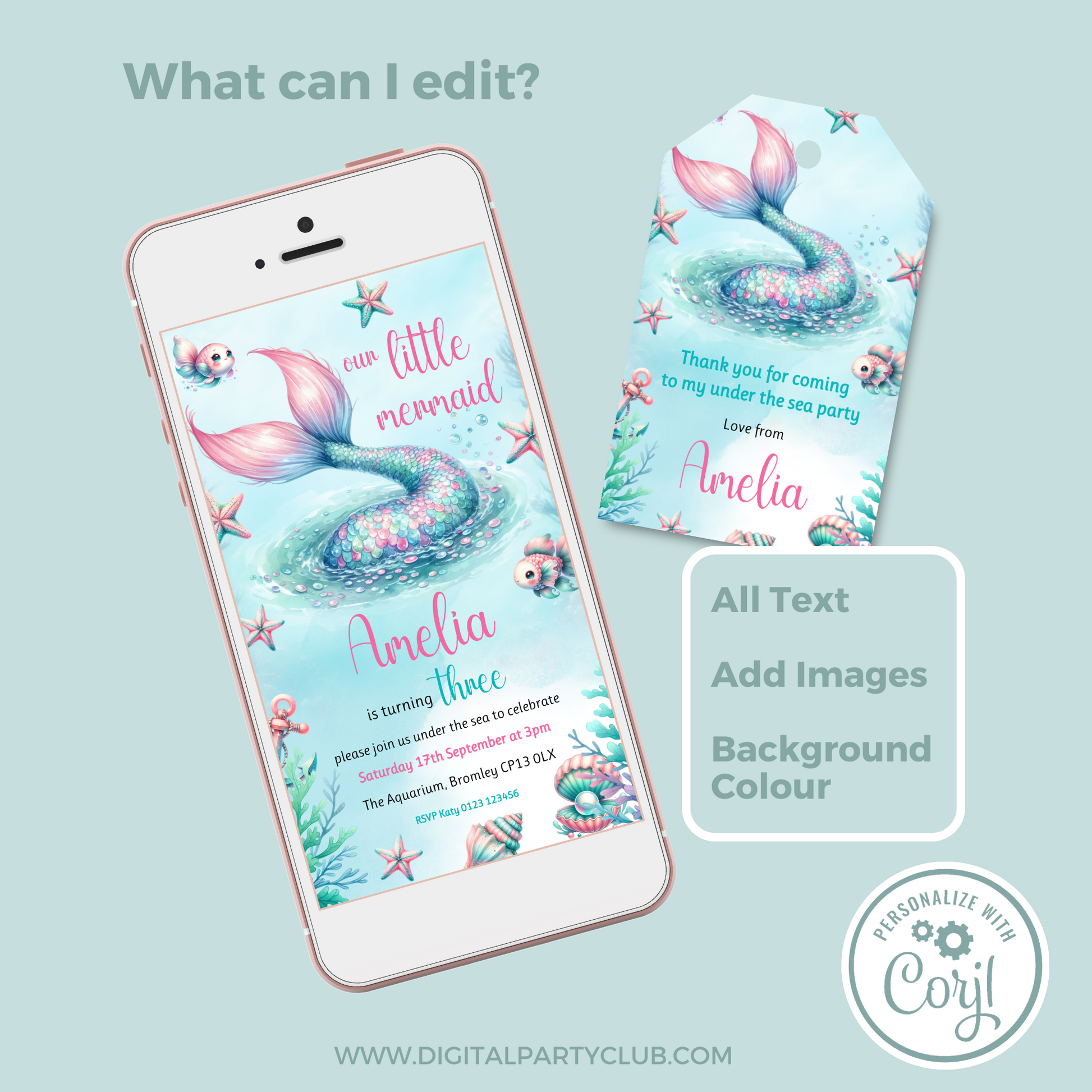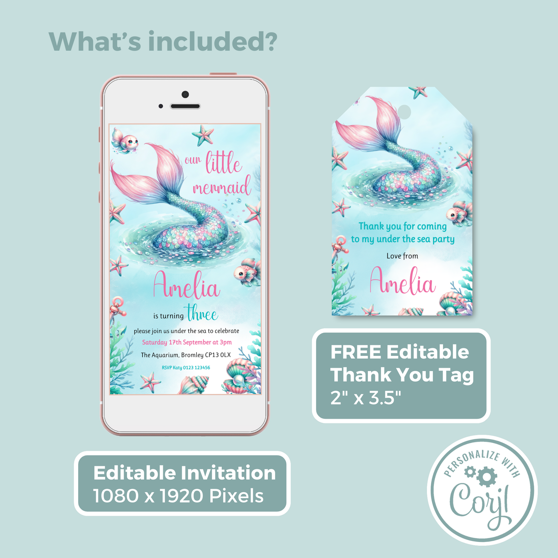 Editable Evite Birthday Invitation and FREE Thank You Tag - Mermaid Tail