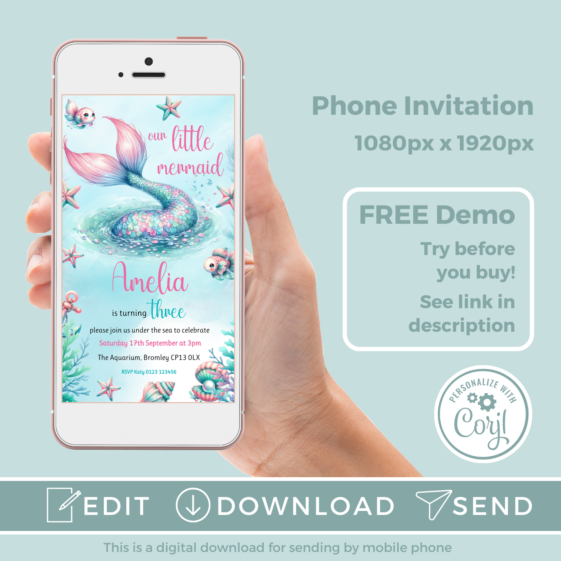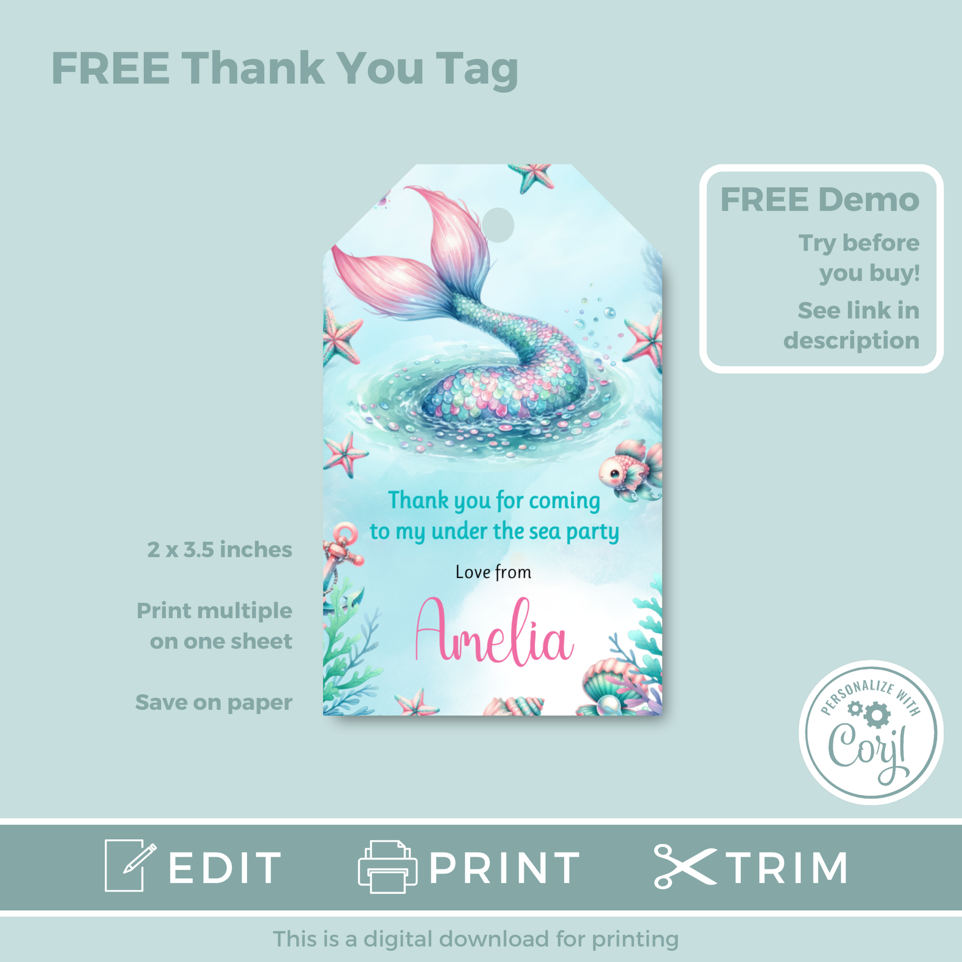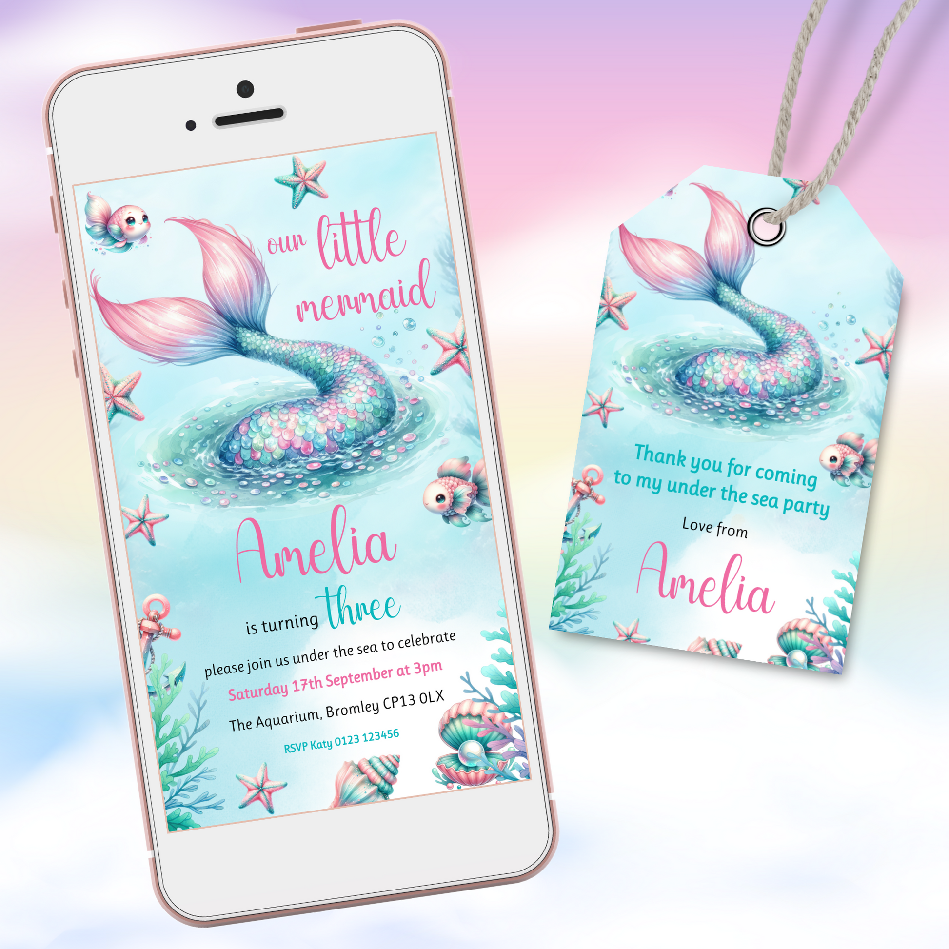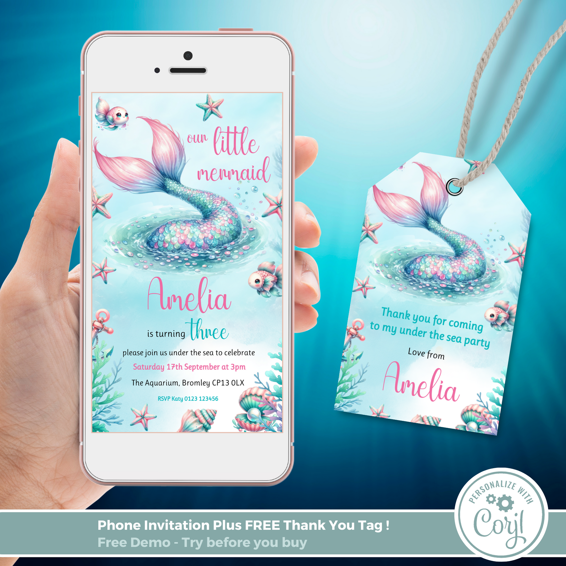 Editable Evite Birthday Invitation and FREE Thank You Tag - Mermaid Tail
