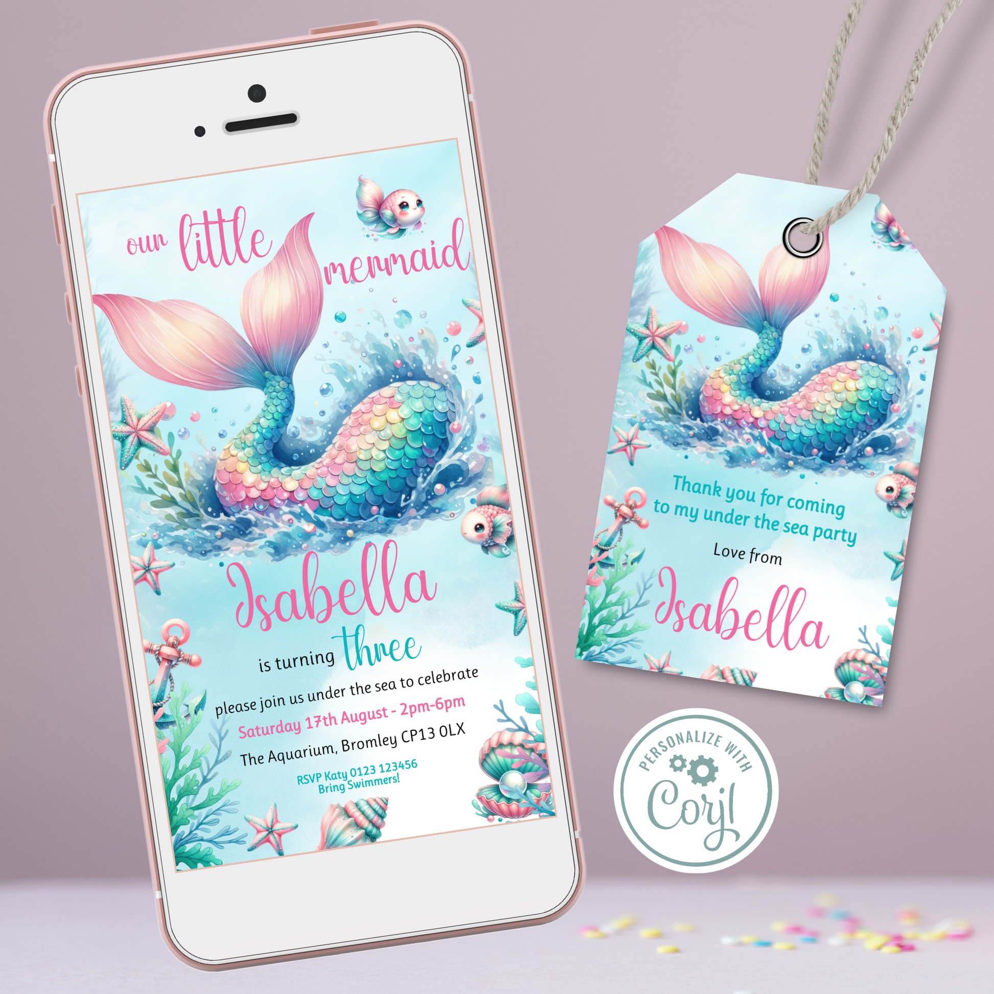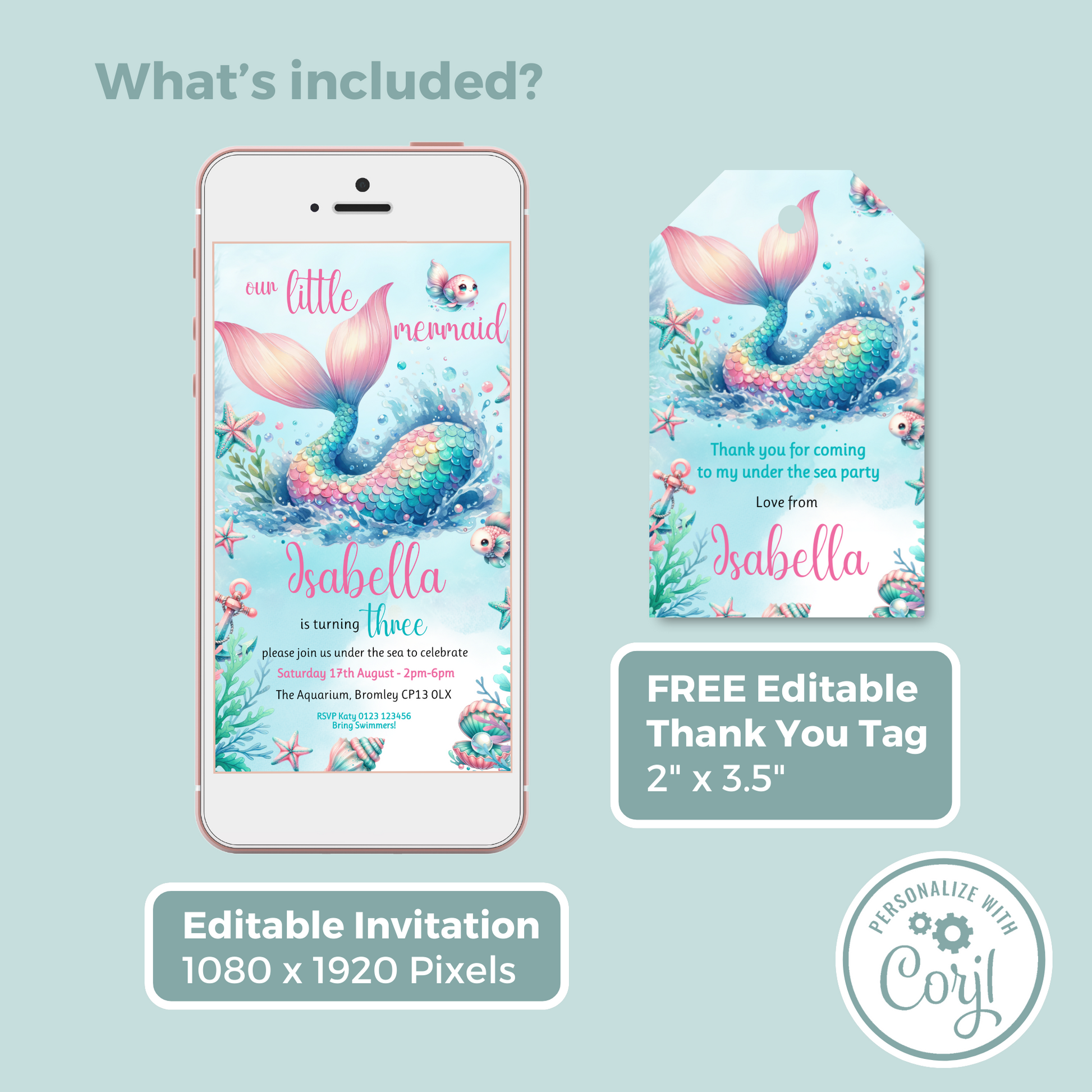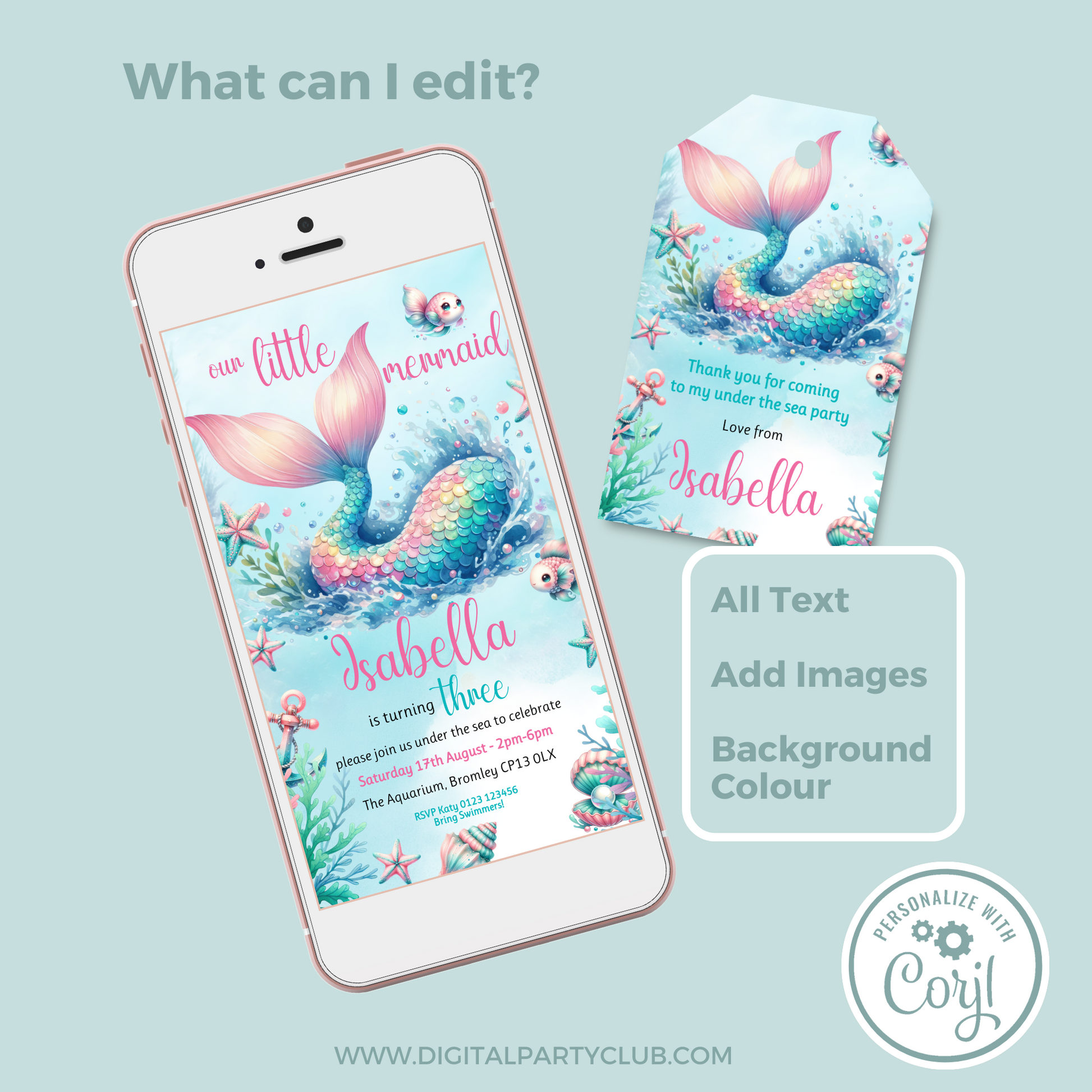 Editable Evite Birthday Invitation and FREE Thank You Tag - Mermaid Tail