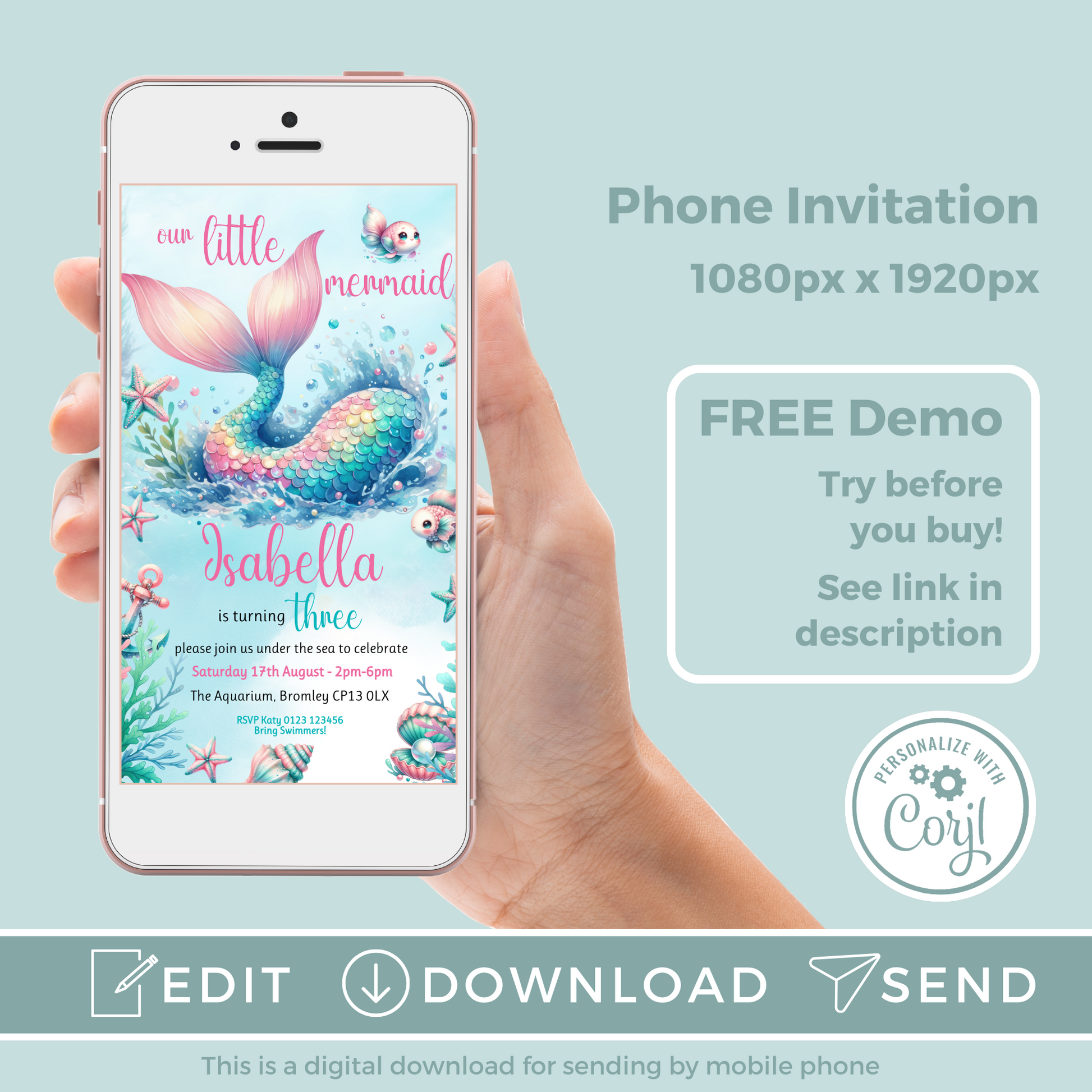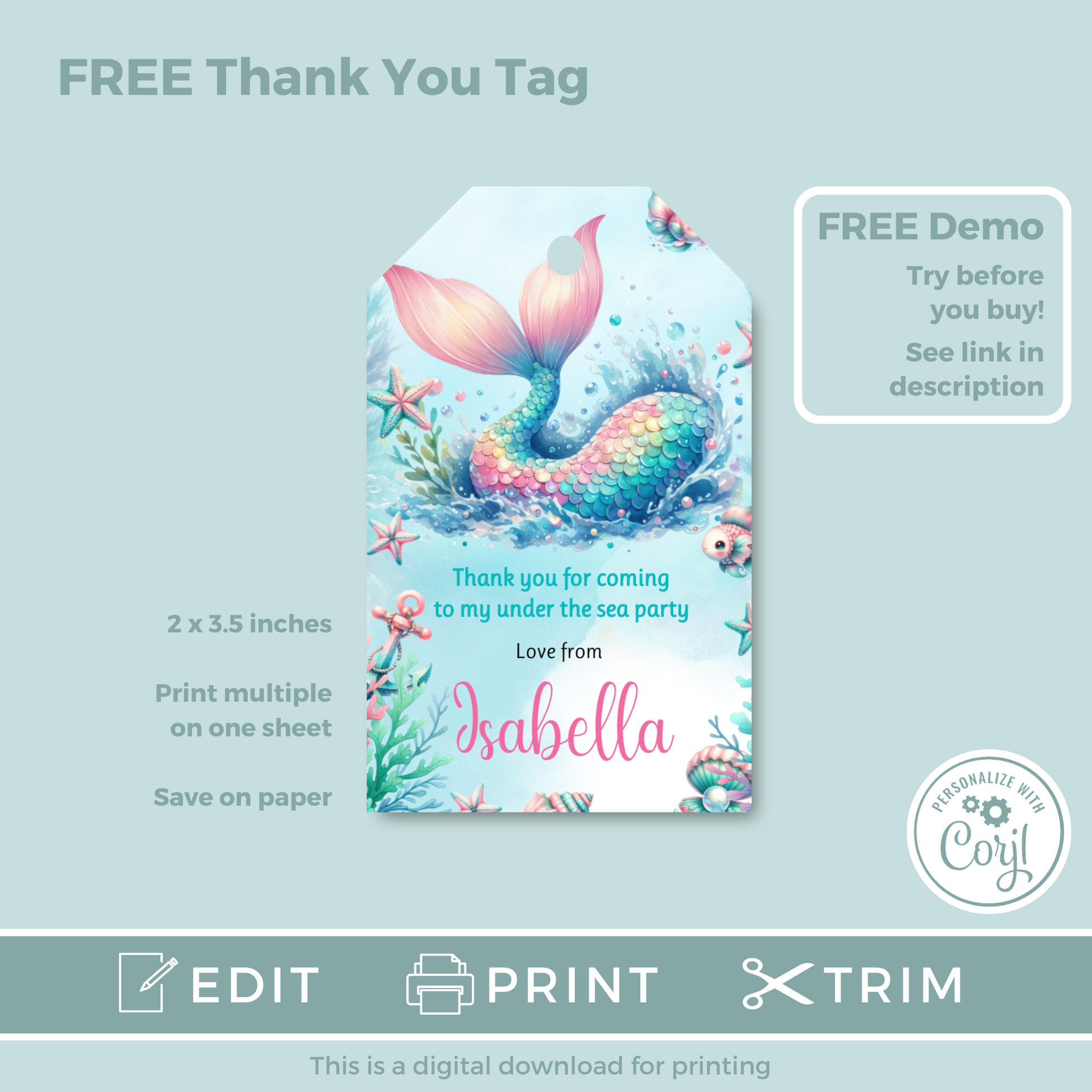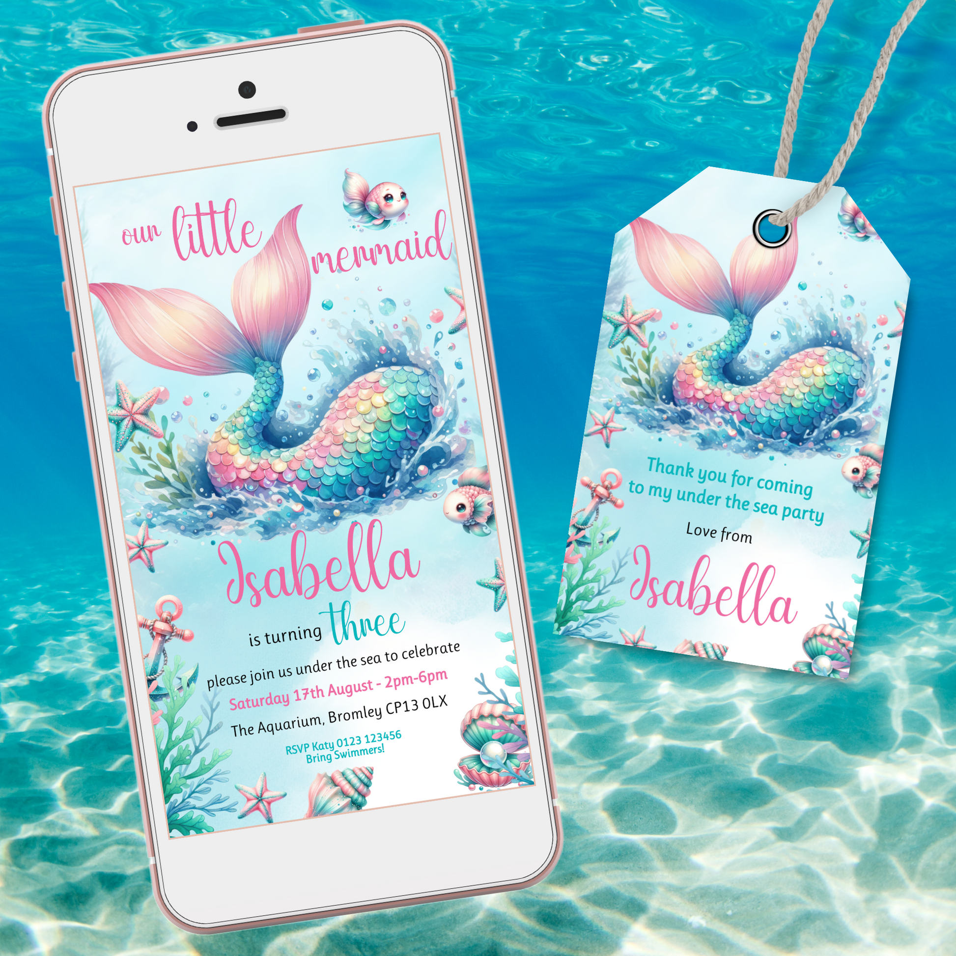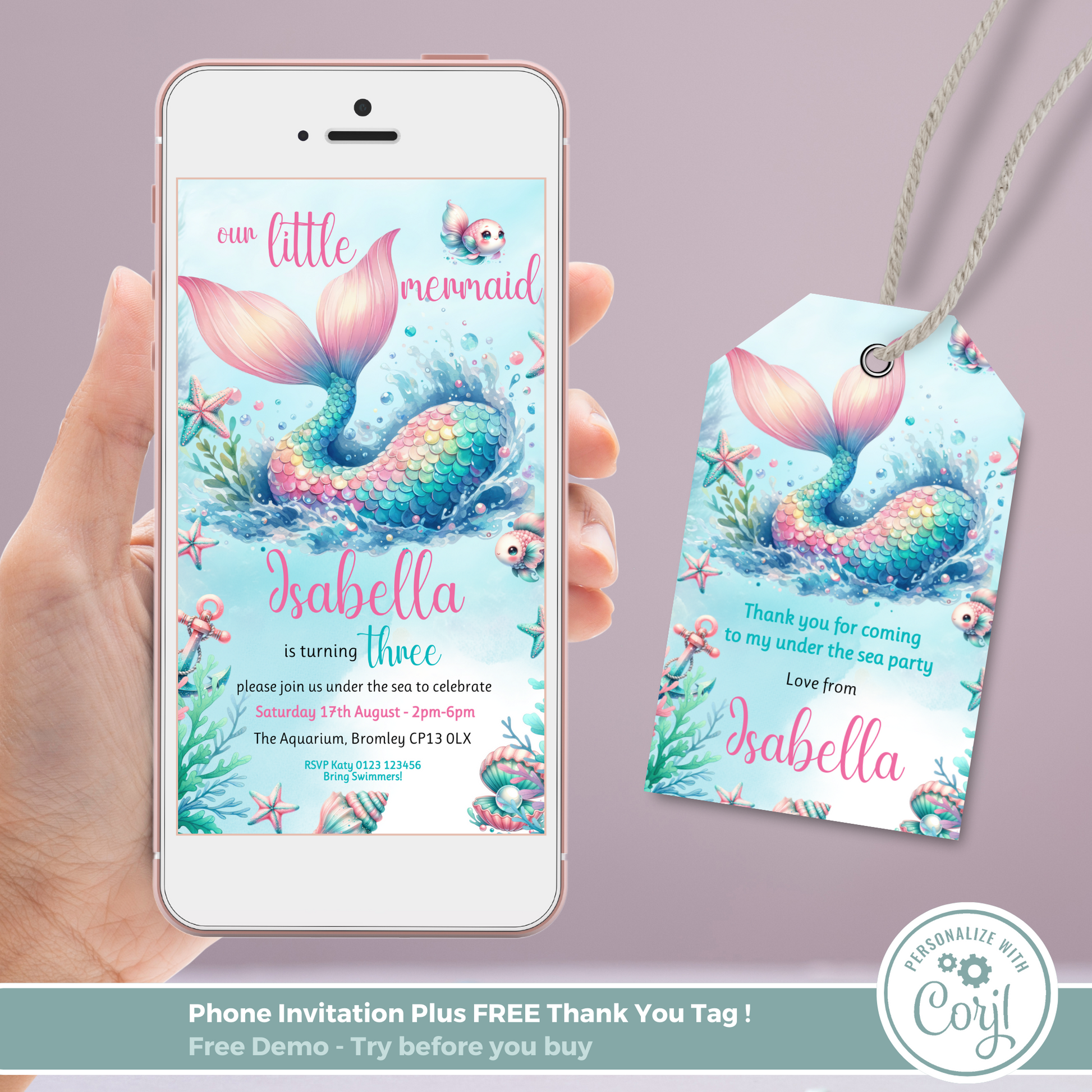 Editable Evite Birthday Invitation and FREE Thank You Tag - Mermaid Tail