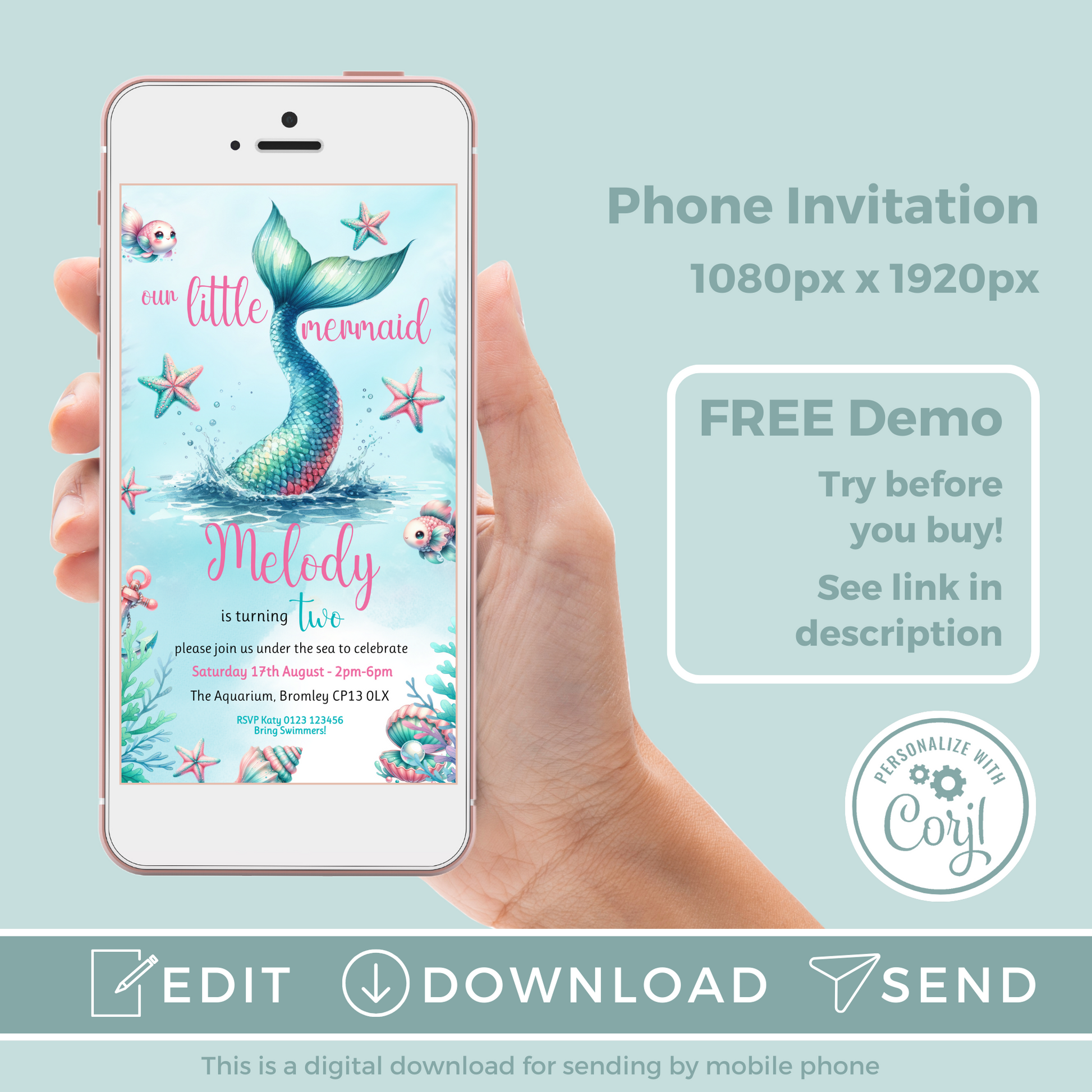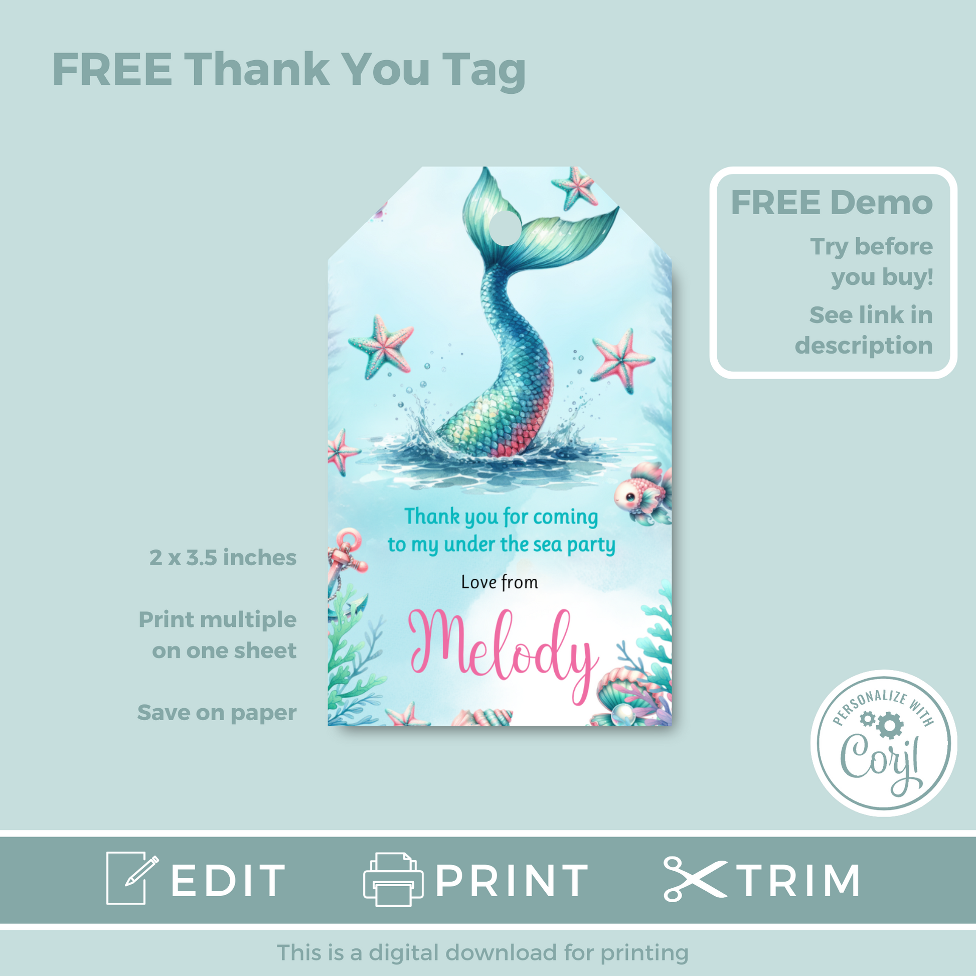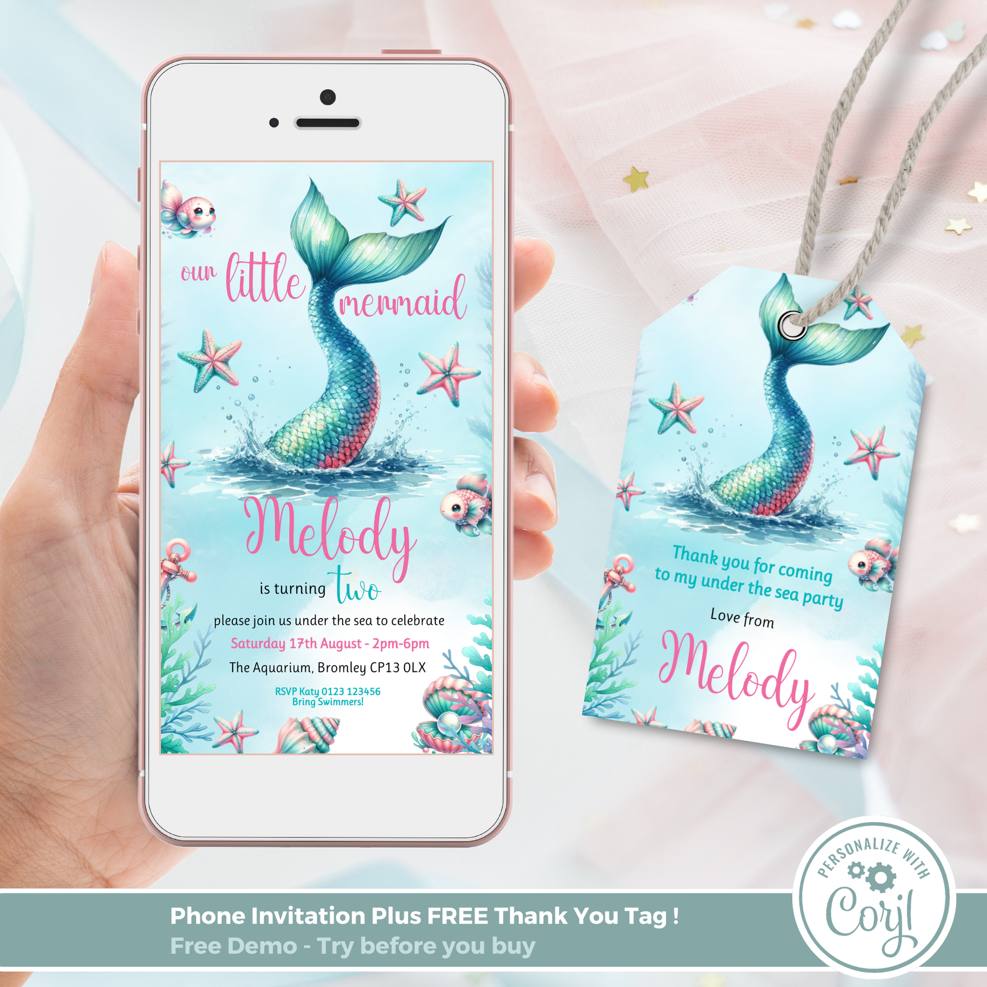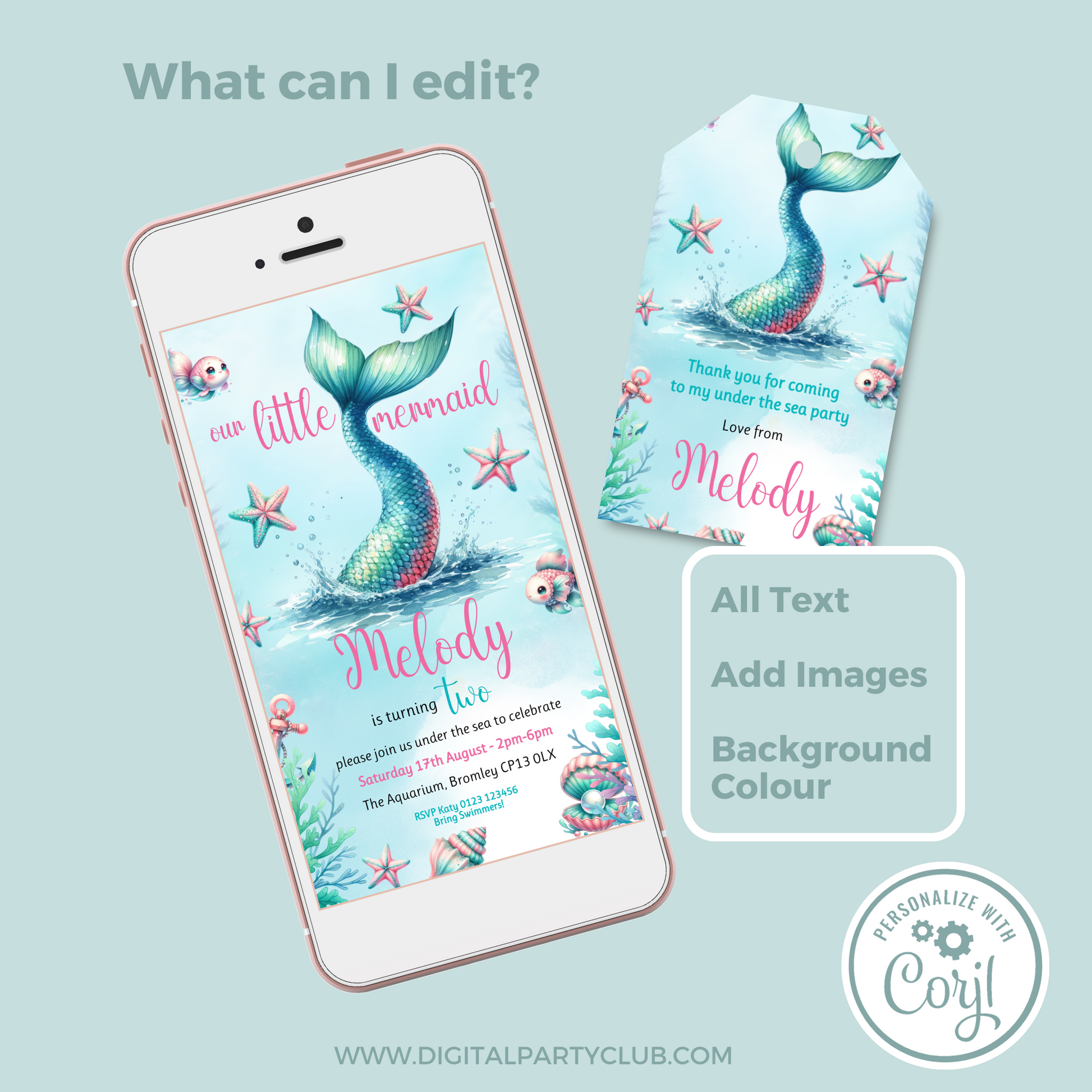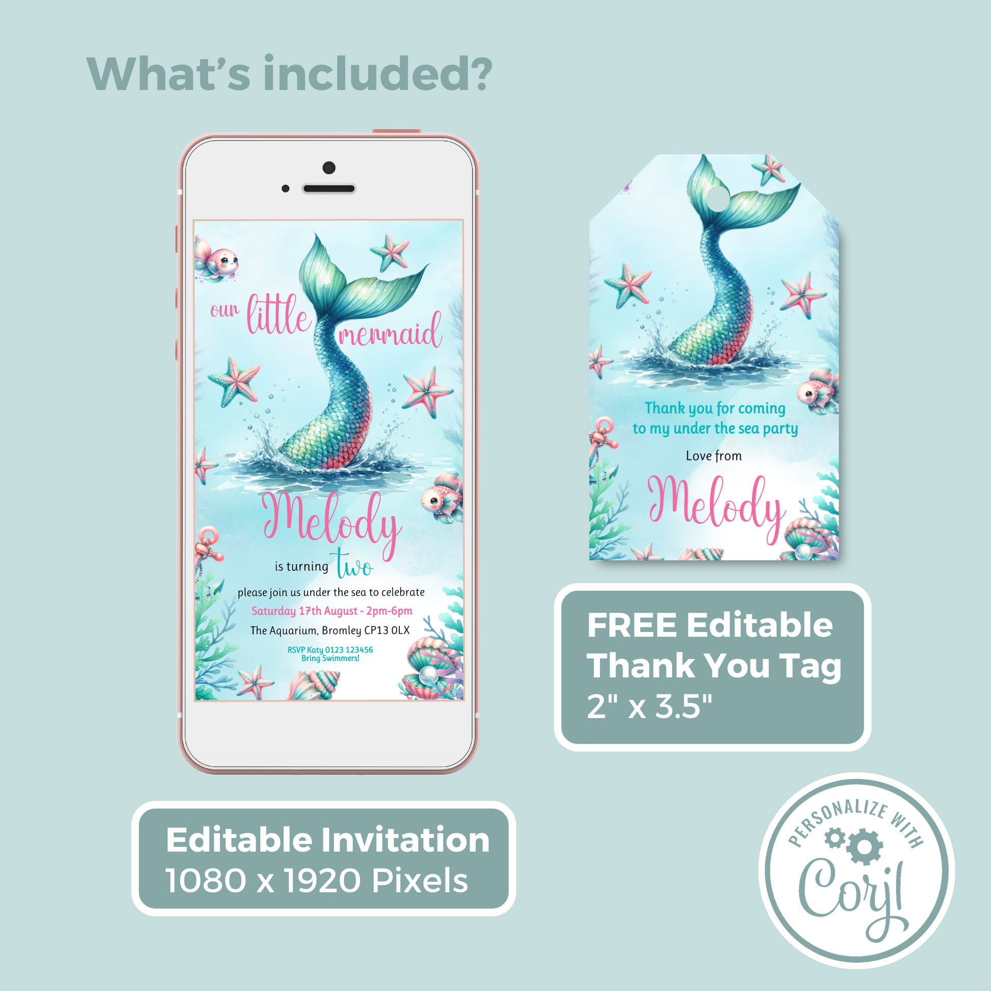 Editable Evite Birthday Invitation and FREE Thank You Tag - Mermaid Tail