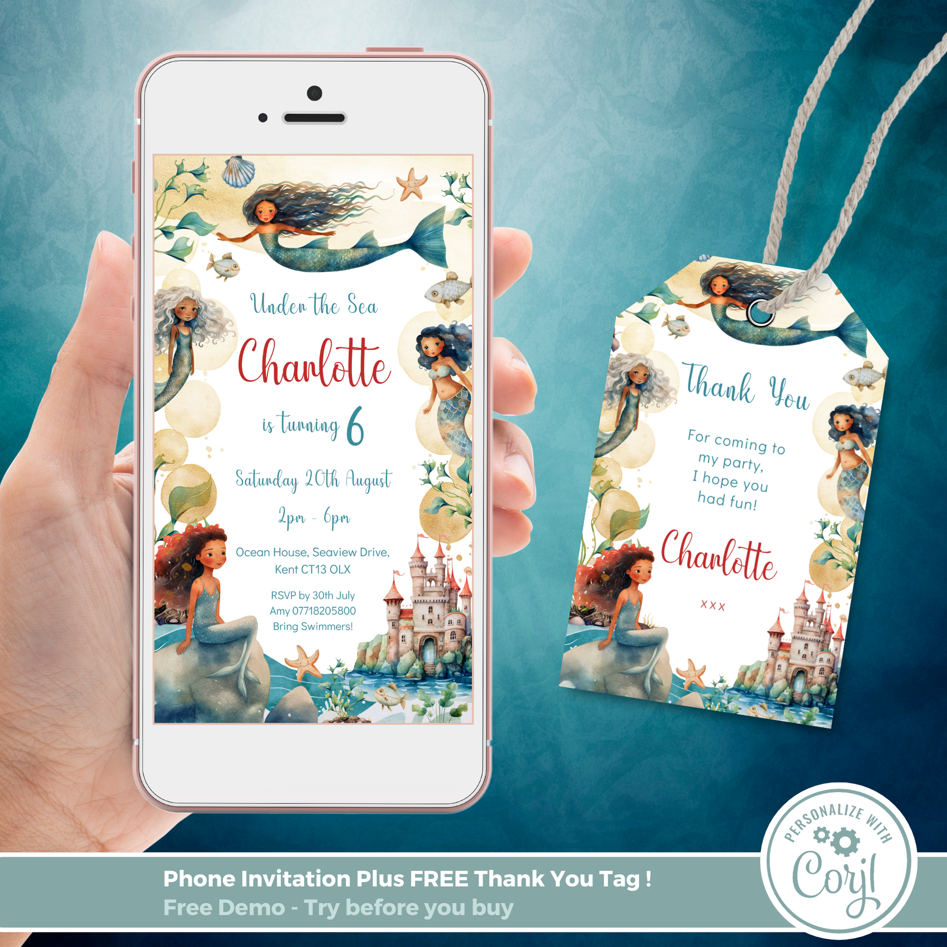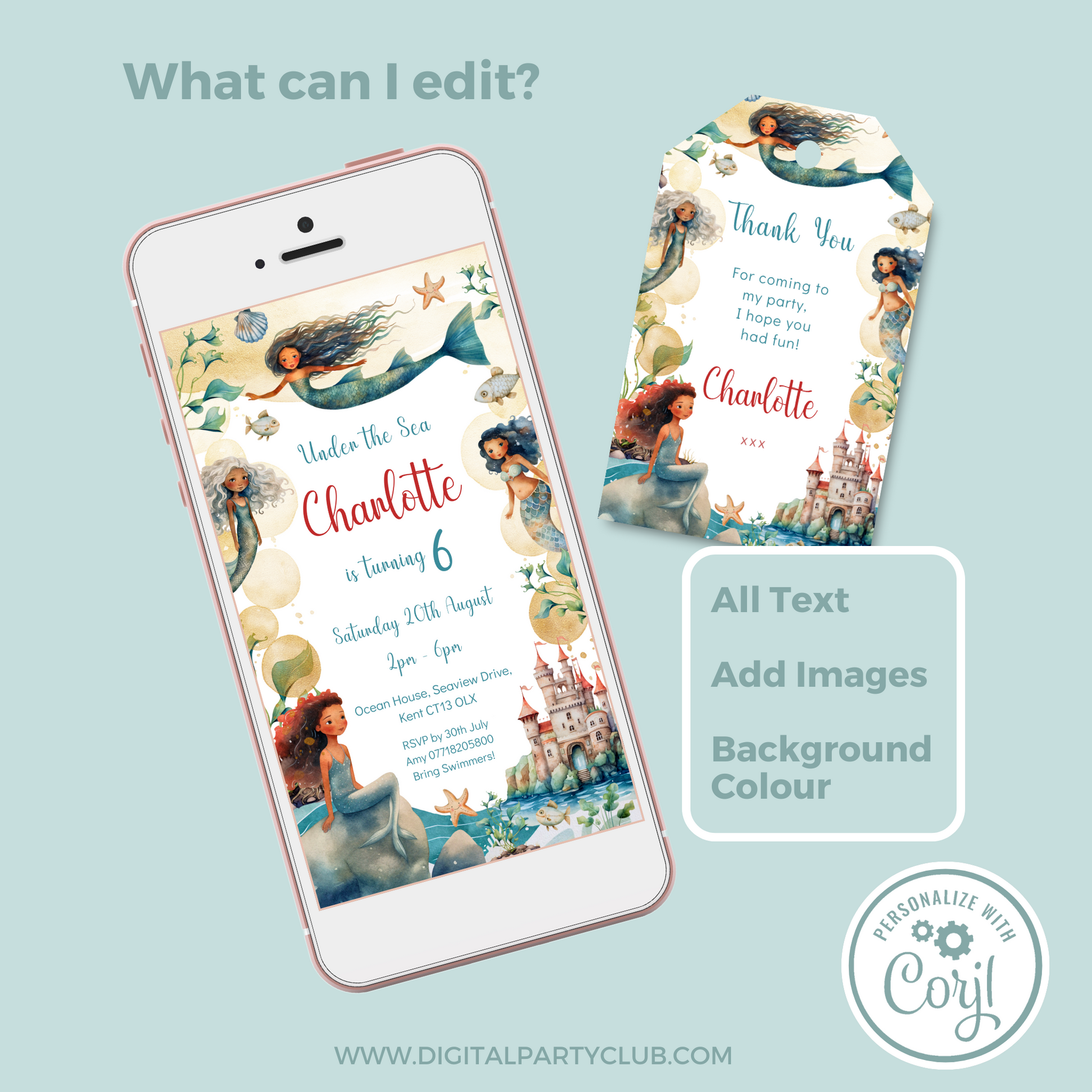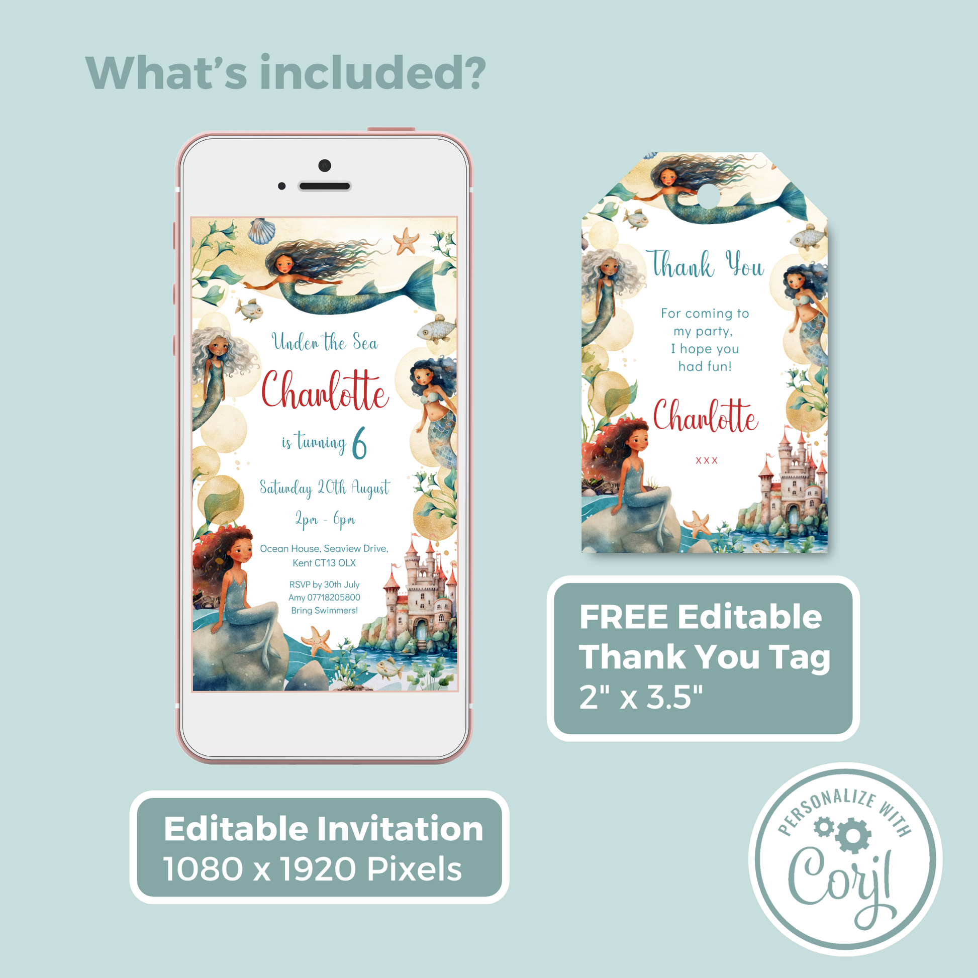 Editable Phone Birthday Invitation and FREE Thank You Tag - Mermaid