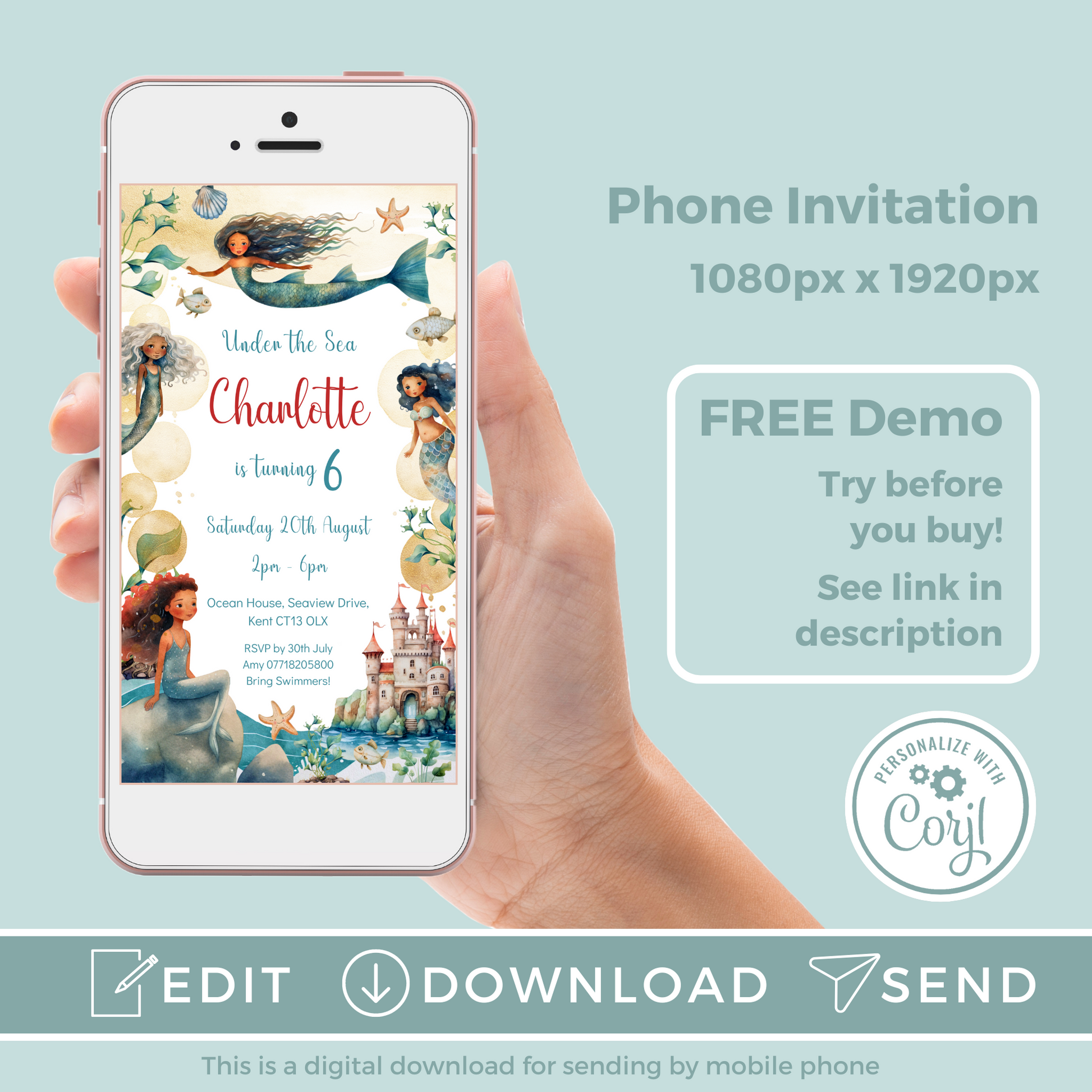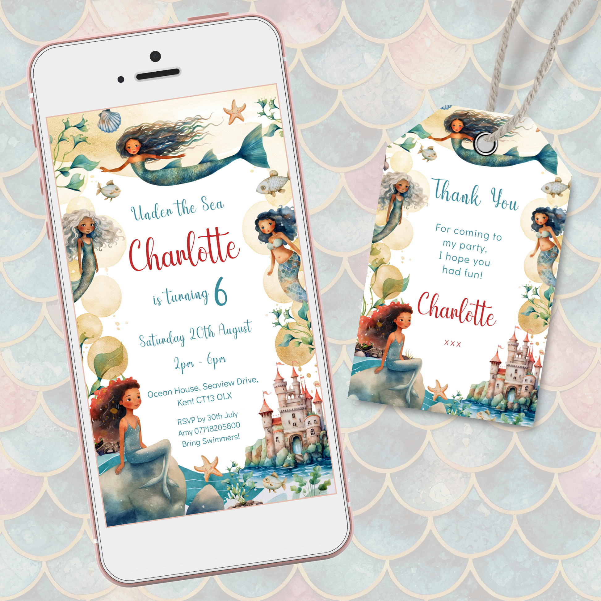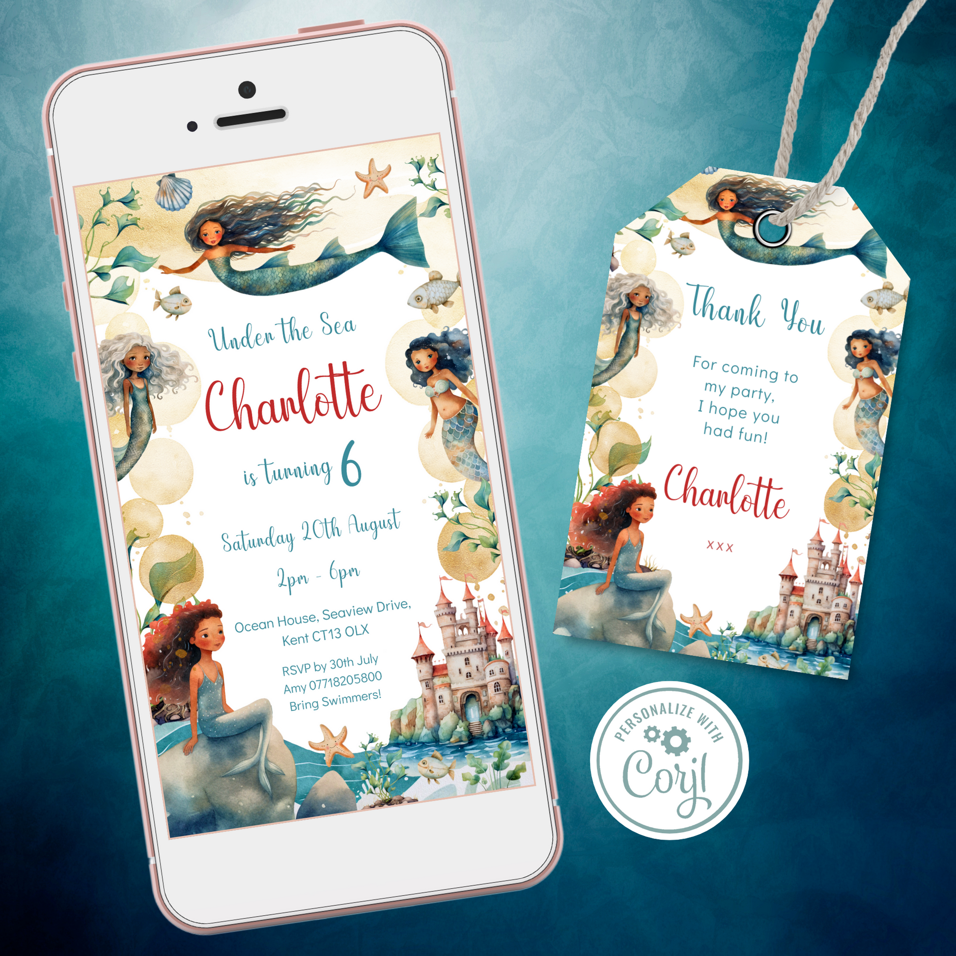 Editable Phone Birthday Invitation and FREE Thank You Tag - Mermaid