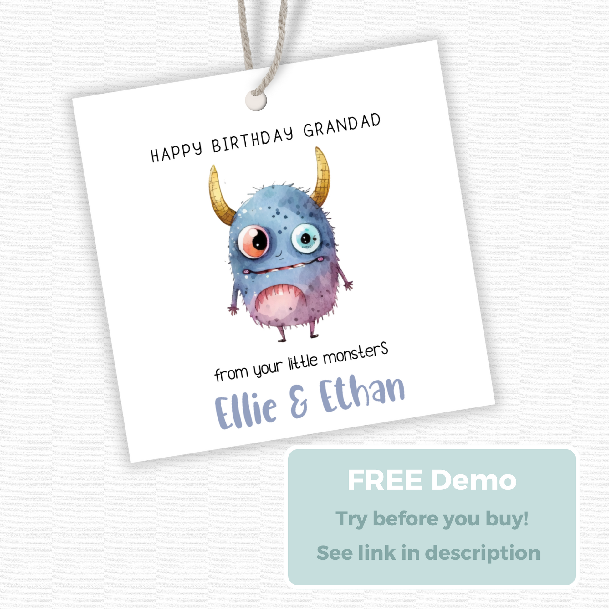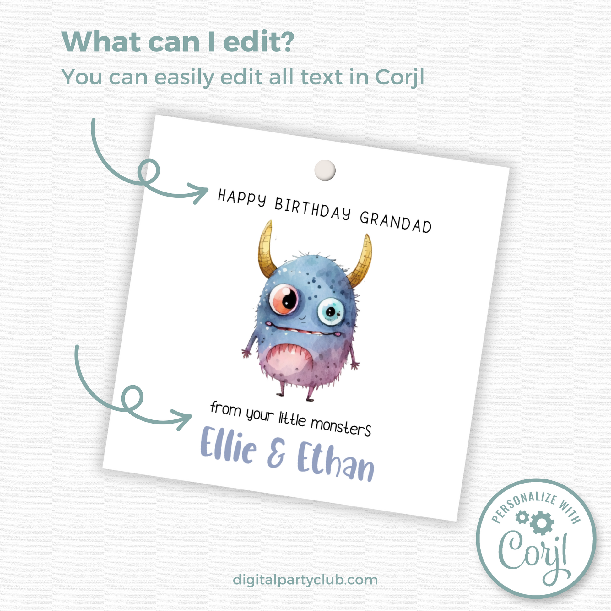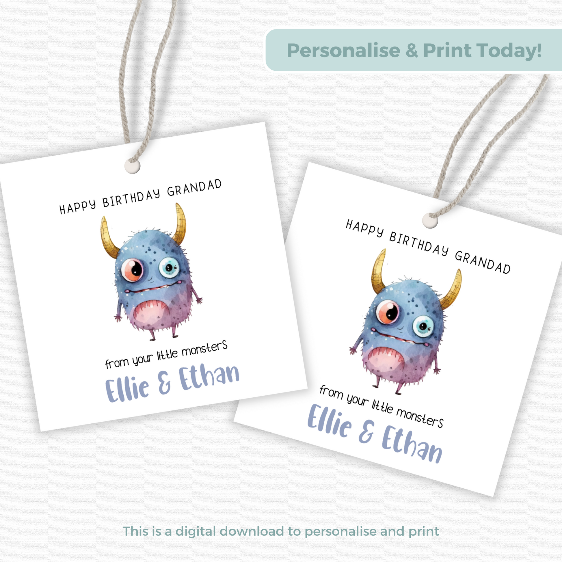 🎉 Surprise Grandad with this playful monster-themed birthday gift tag. The perfect finishing touch for any present from the grandkids. Designed to be cute, quirky, and totally memorable, this editable digital download lets you personalise names and message before printing.