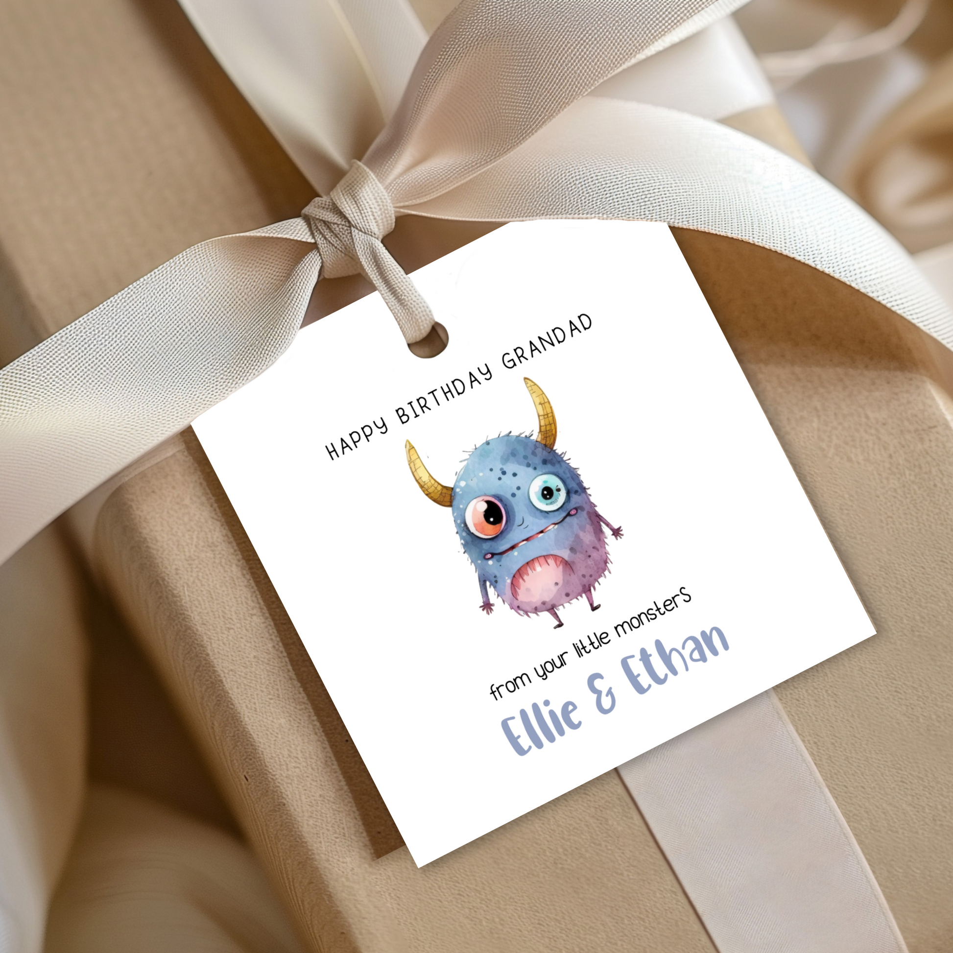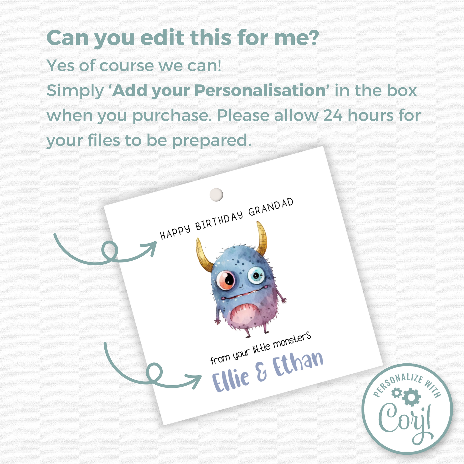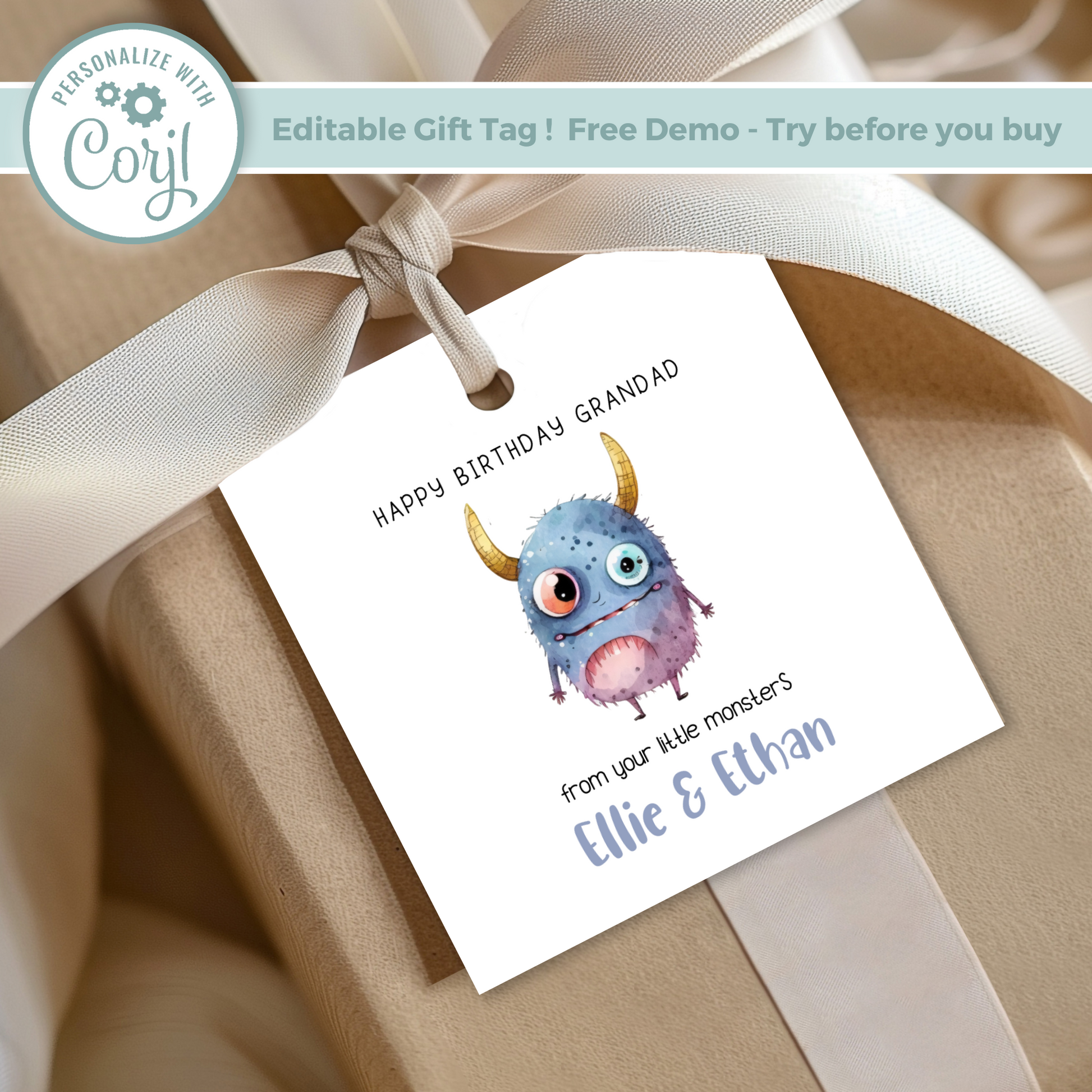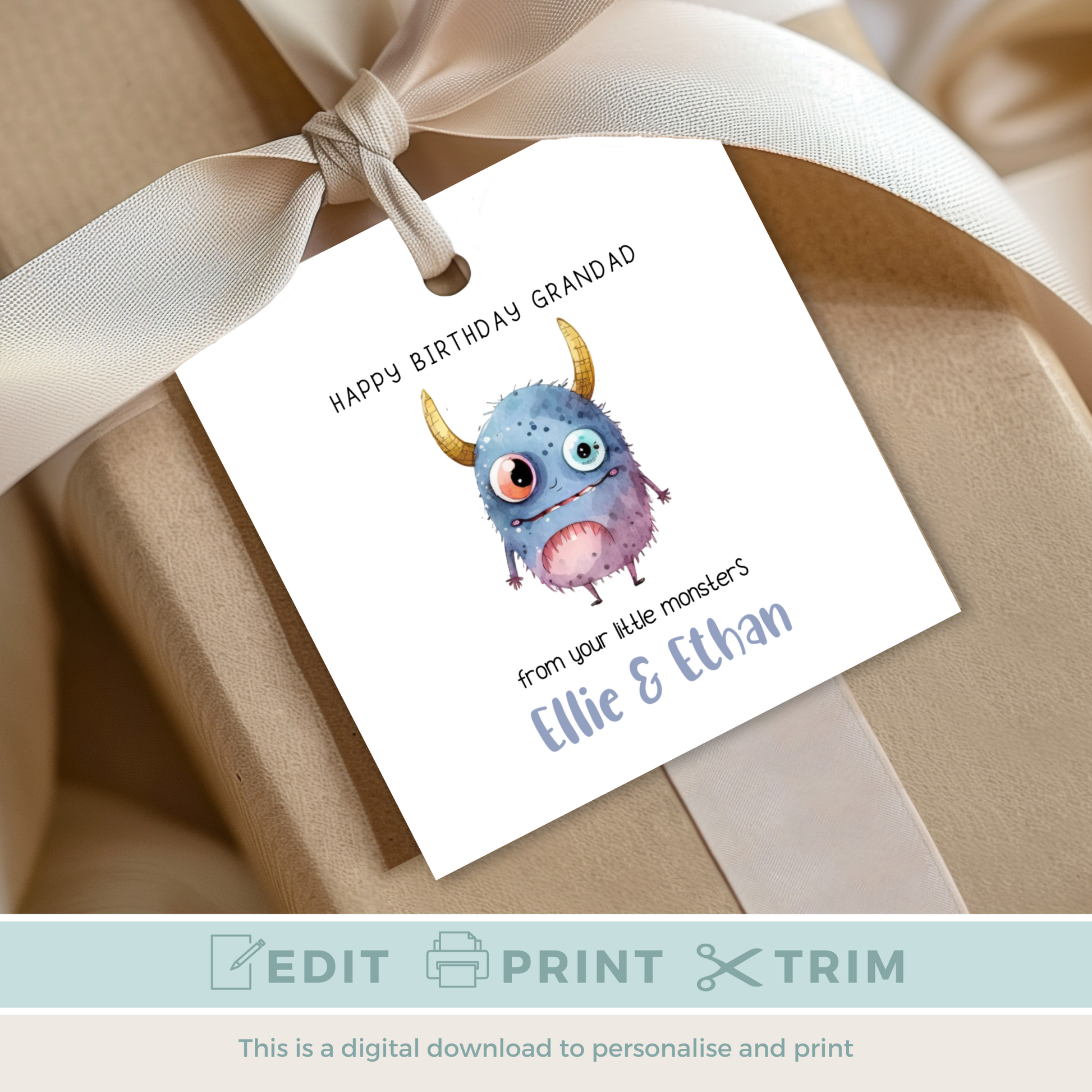 🎉 Surprise Grandad with this playful monster-themed birthday gift tag. The perfect finishing touch for any present from the grandkids. Designed to be cute, quirky, and totally memorable, this editable digital download lets you personalise names and message before printing.
