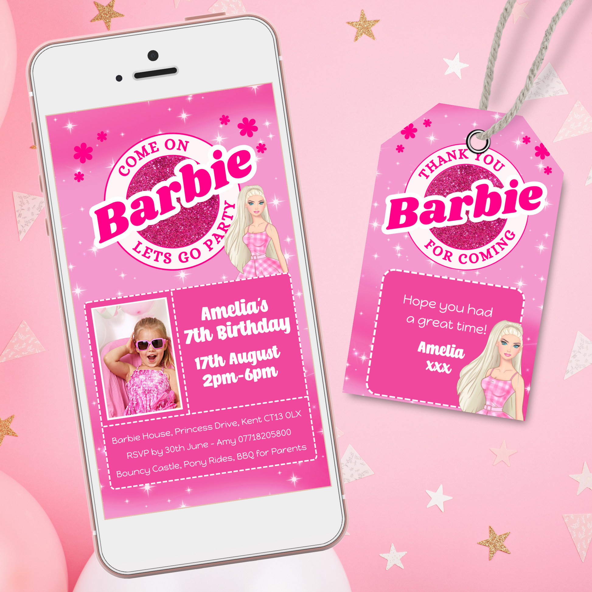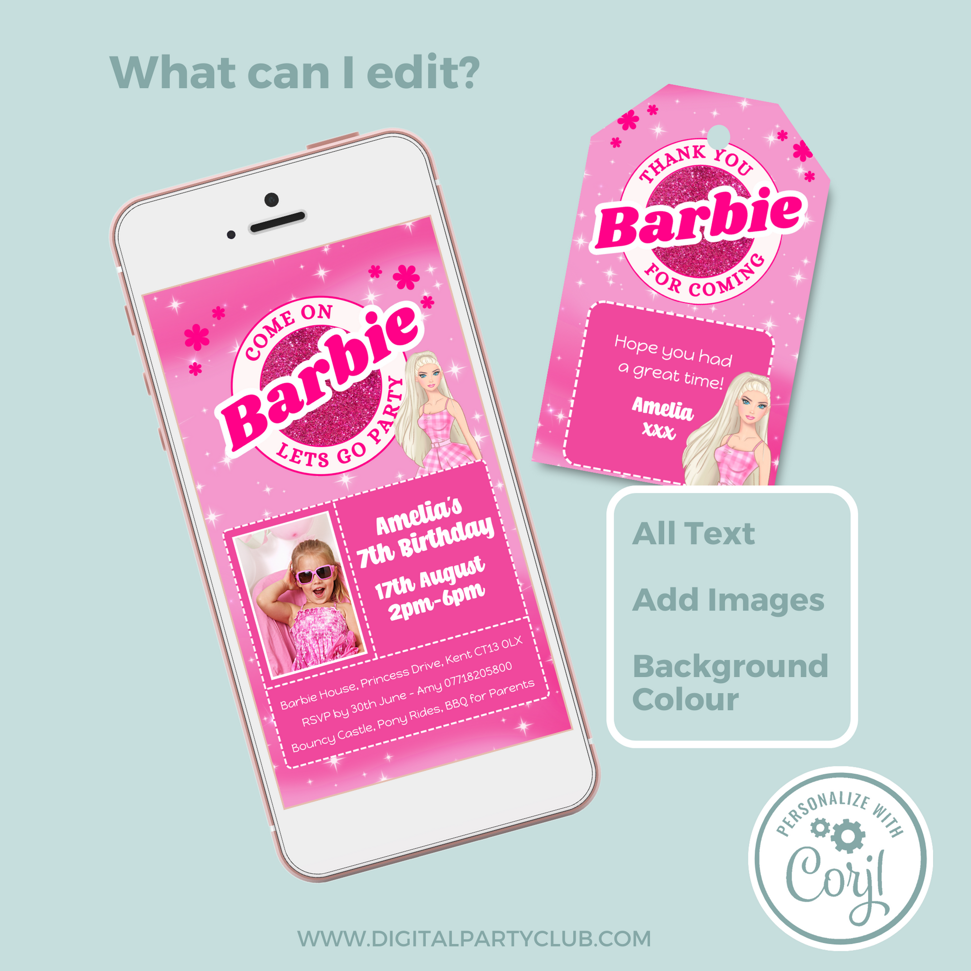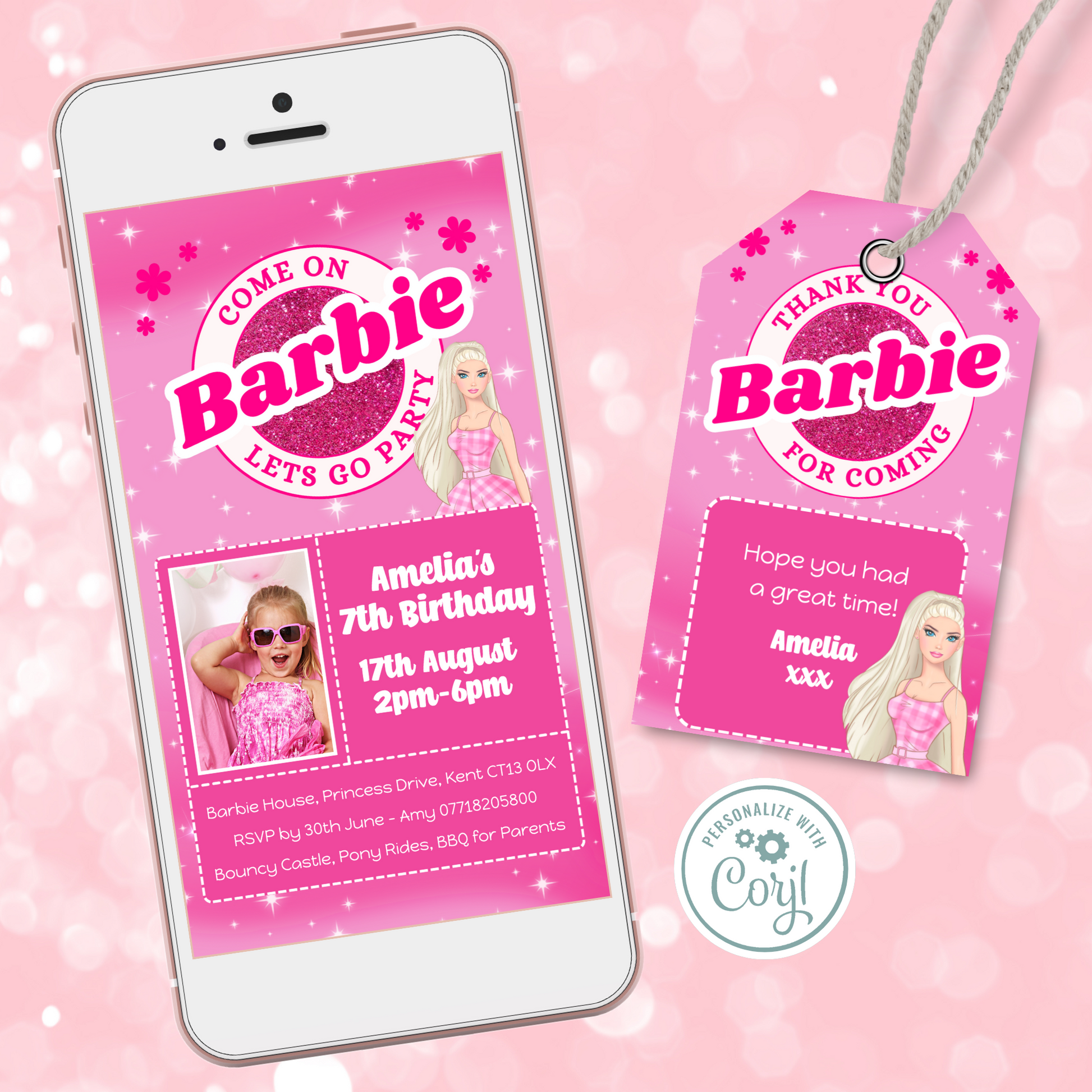 Editable Phone Birthday Invitation and FREE Thank You Tag - Barbie