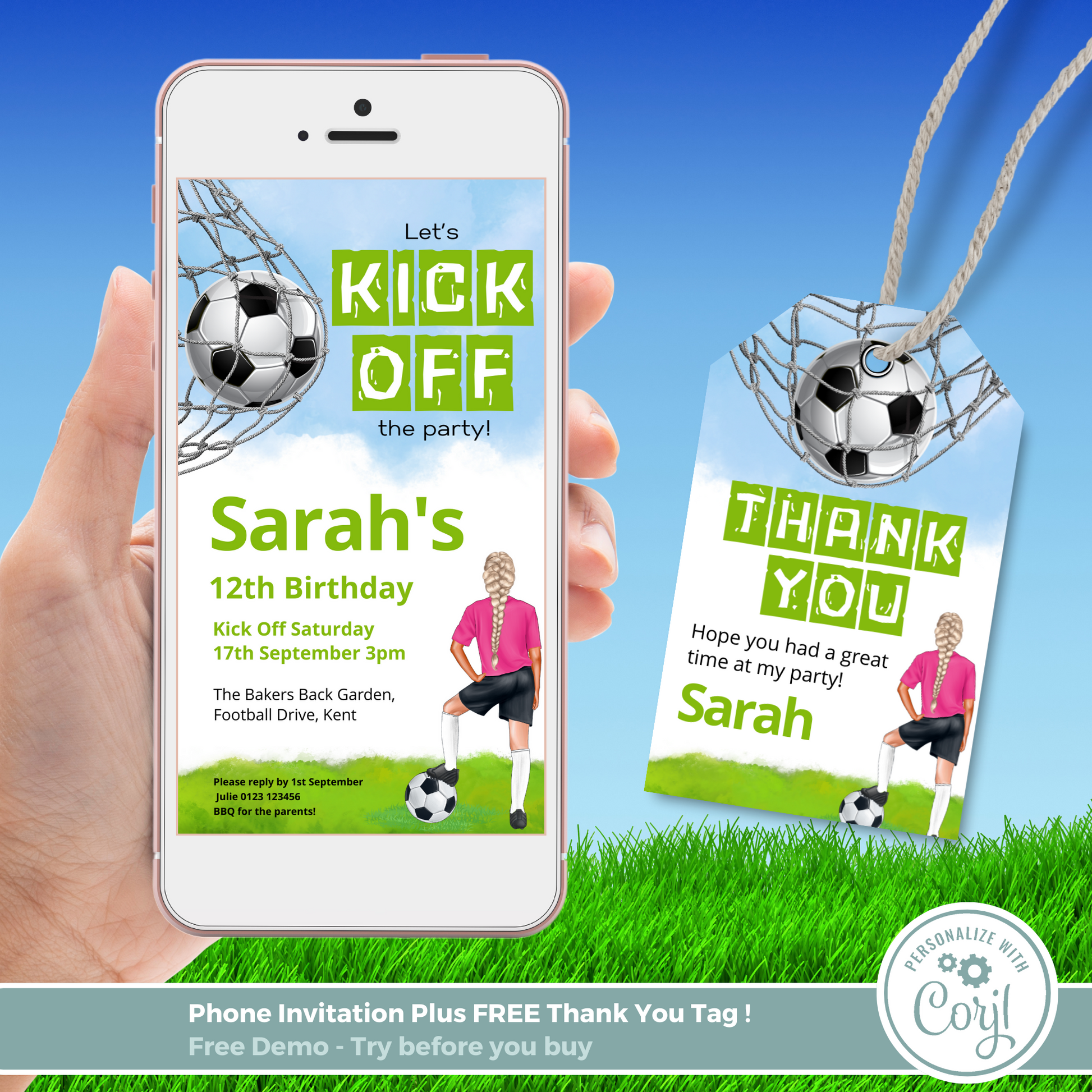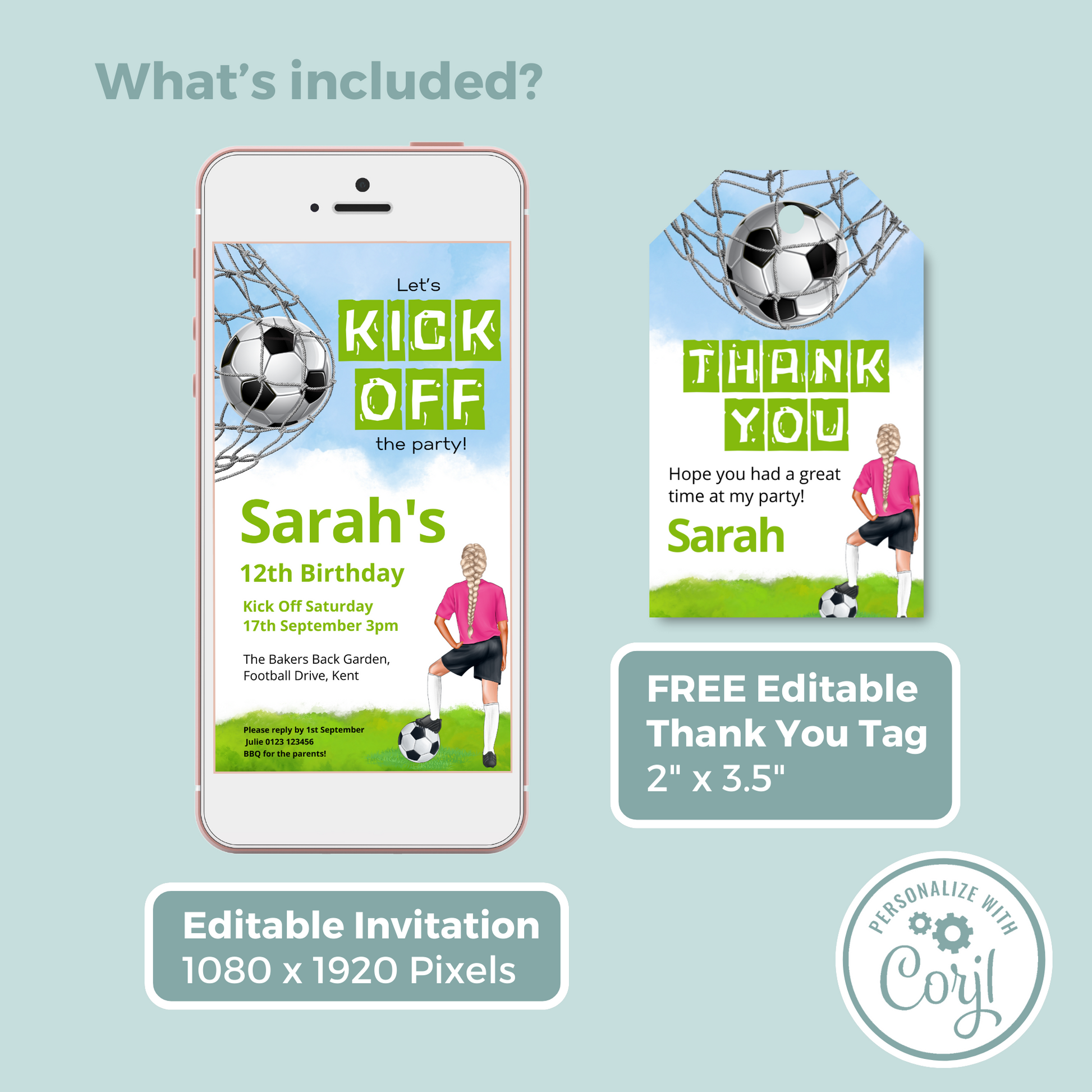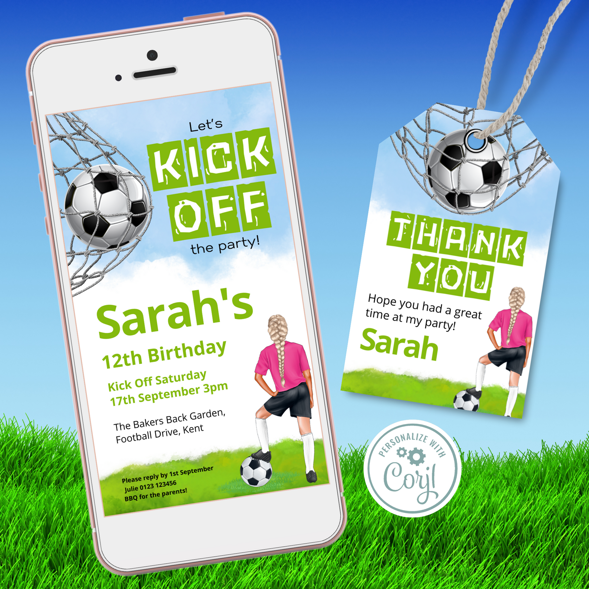 Editable Phone Birthday Invitation and FREE Thank You Tag - Football Girl Pink