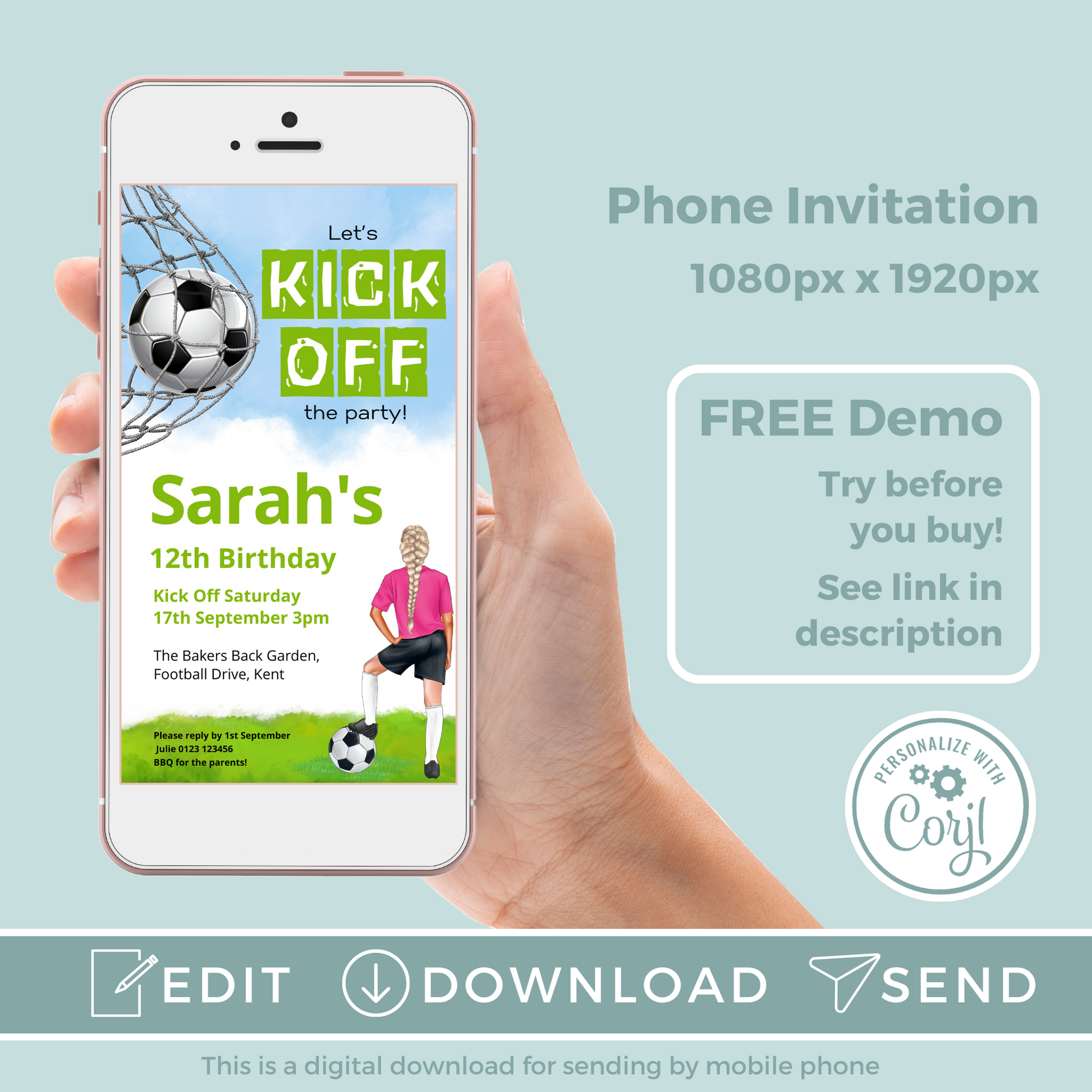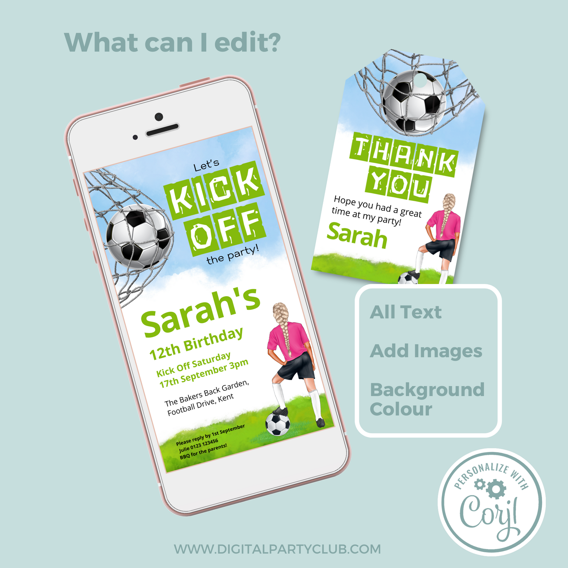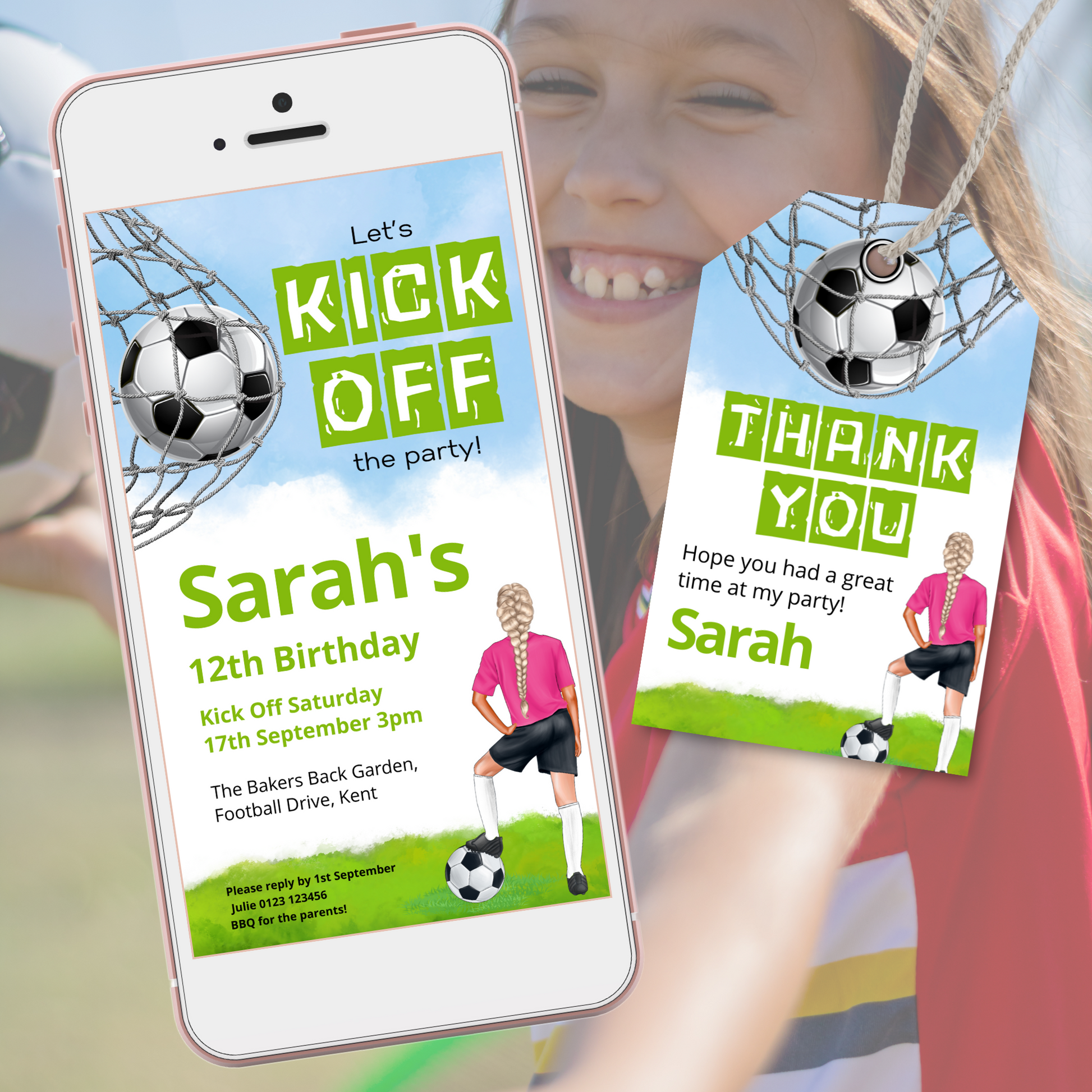 Editable Phone Birthday Invitation and FREE Thank You Tag - Football Girl Pink