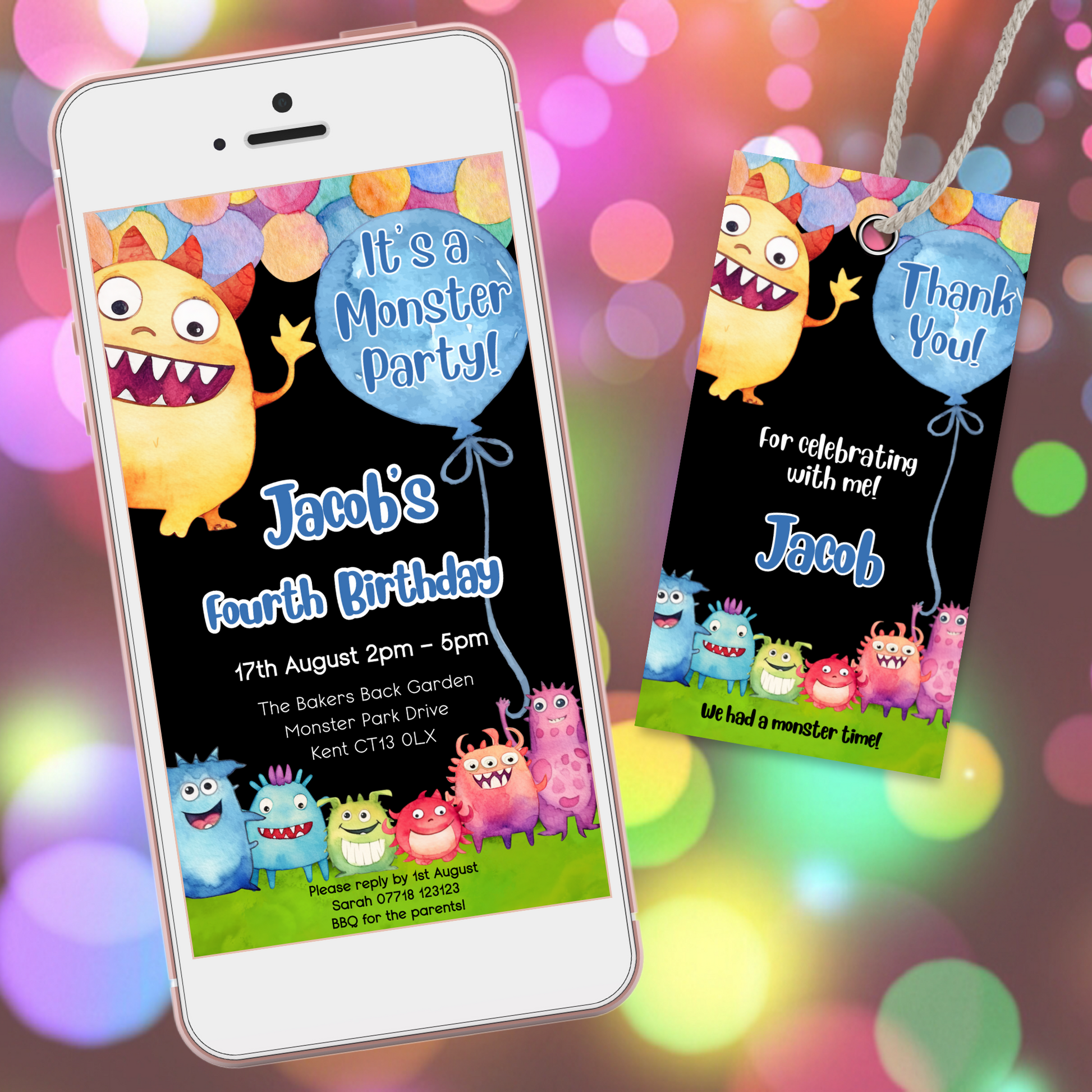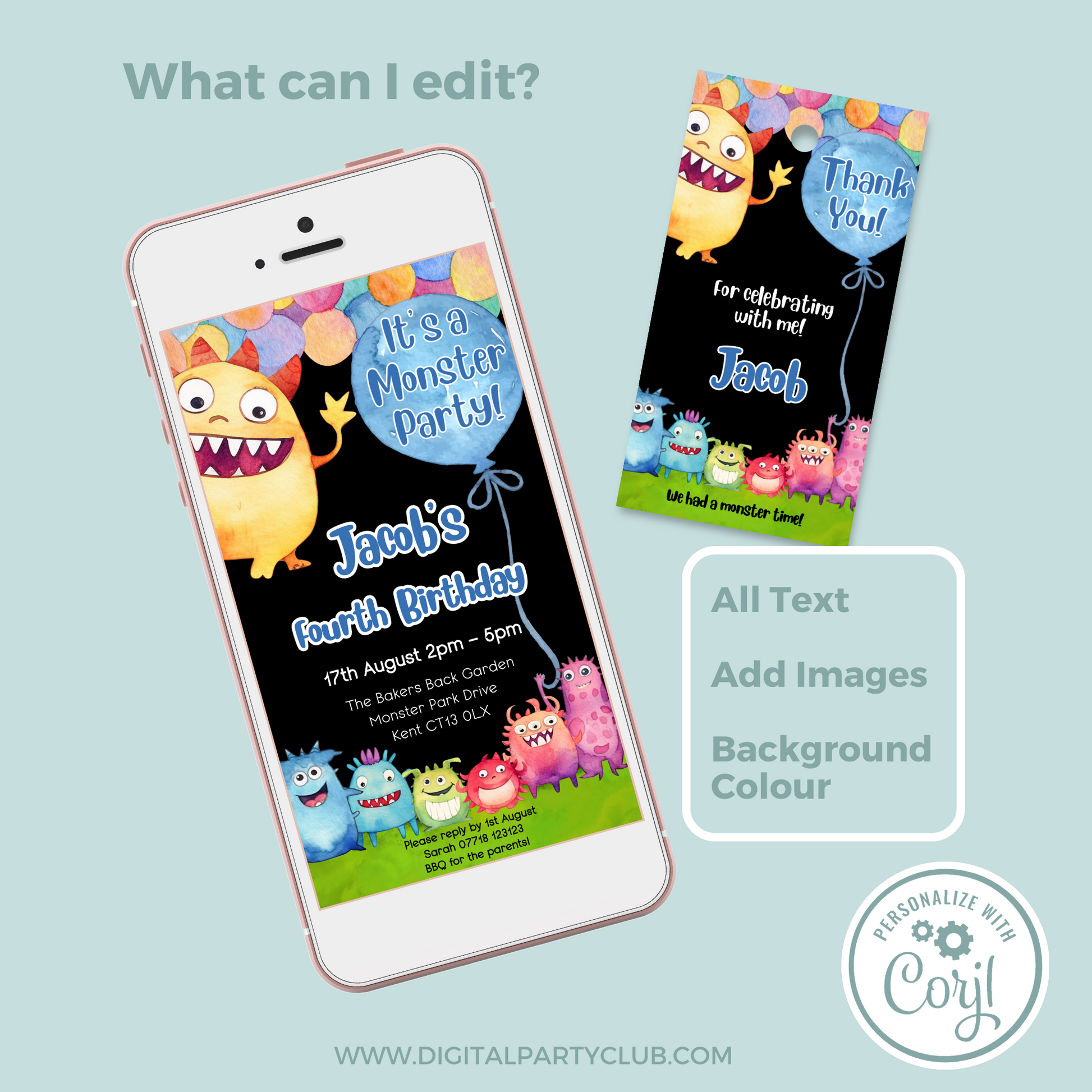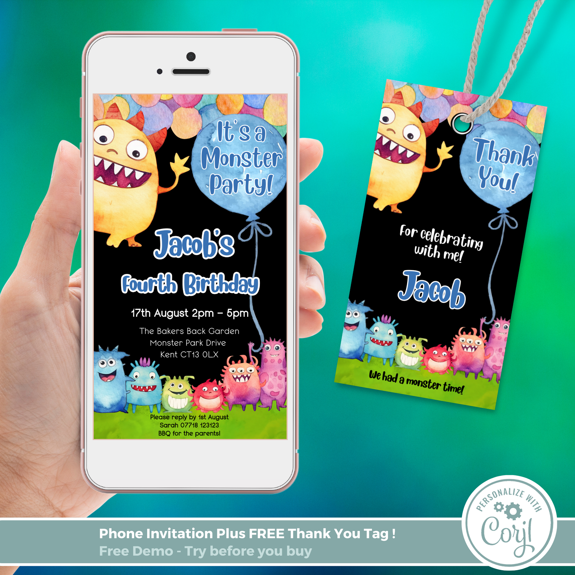Editable Phone Birthday Invitation and FREE Thank You Tag - Monster