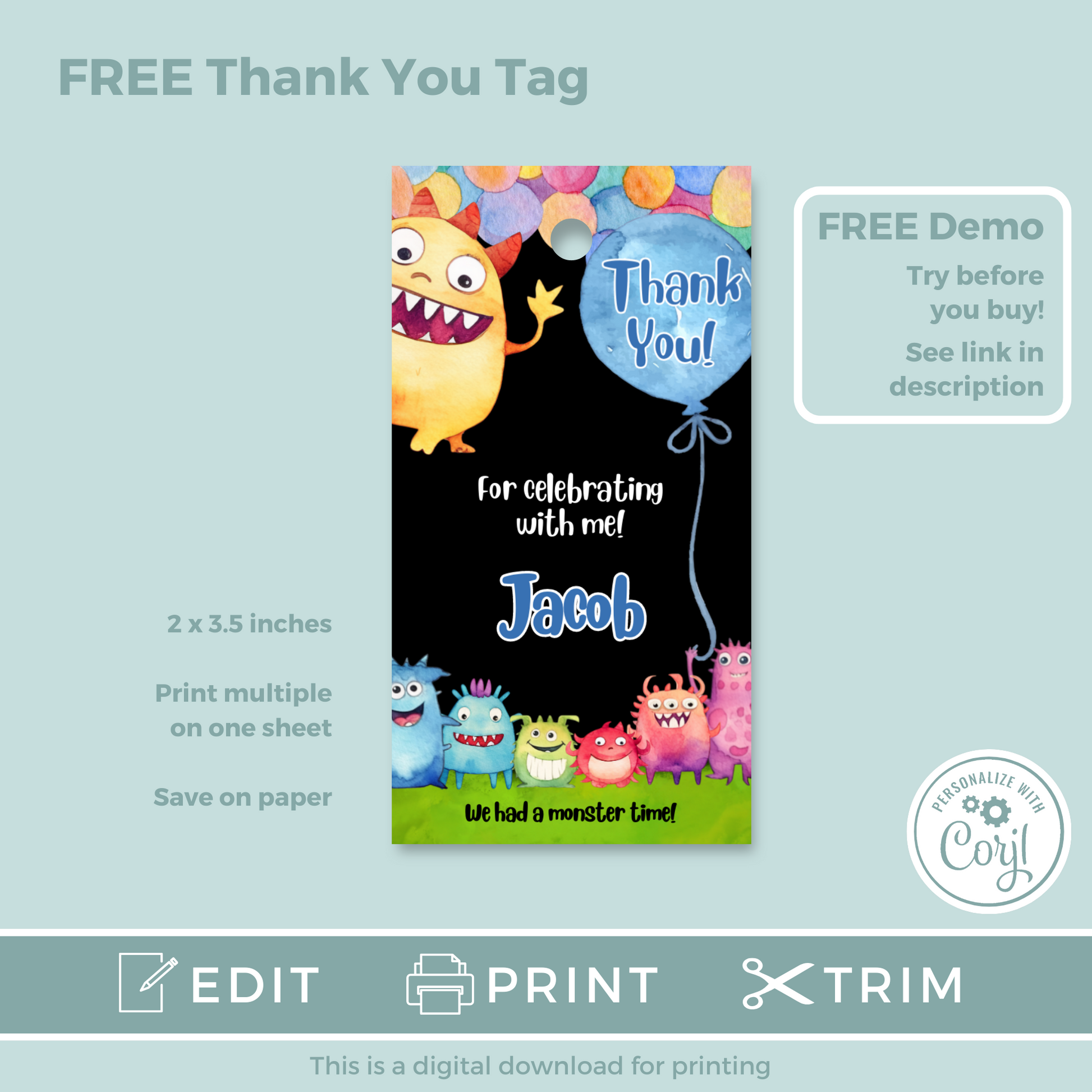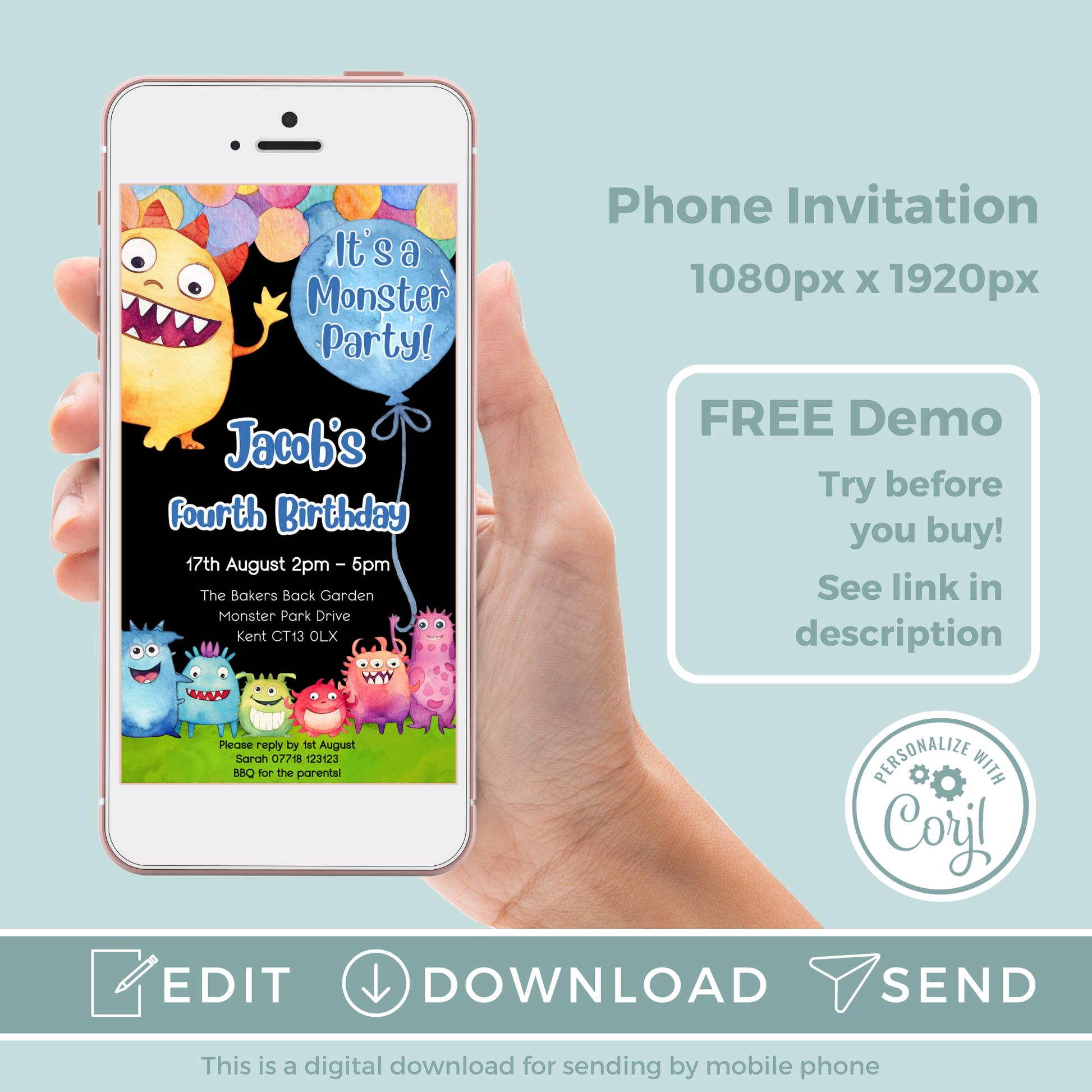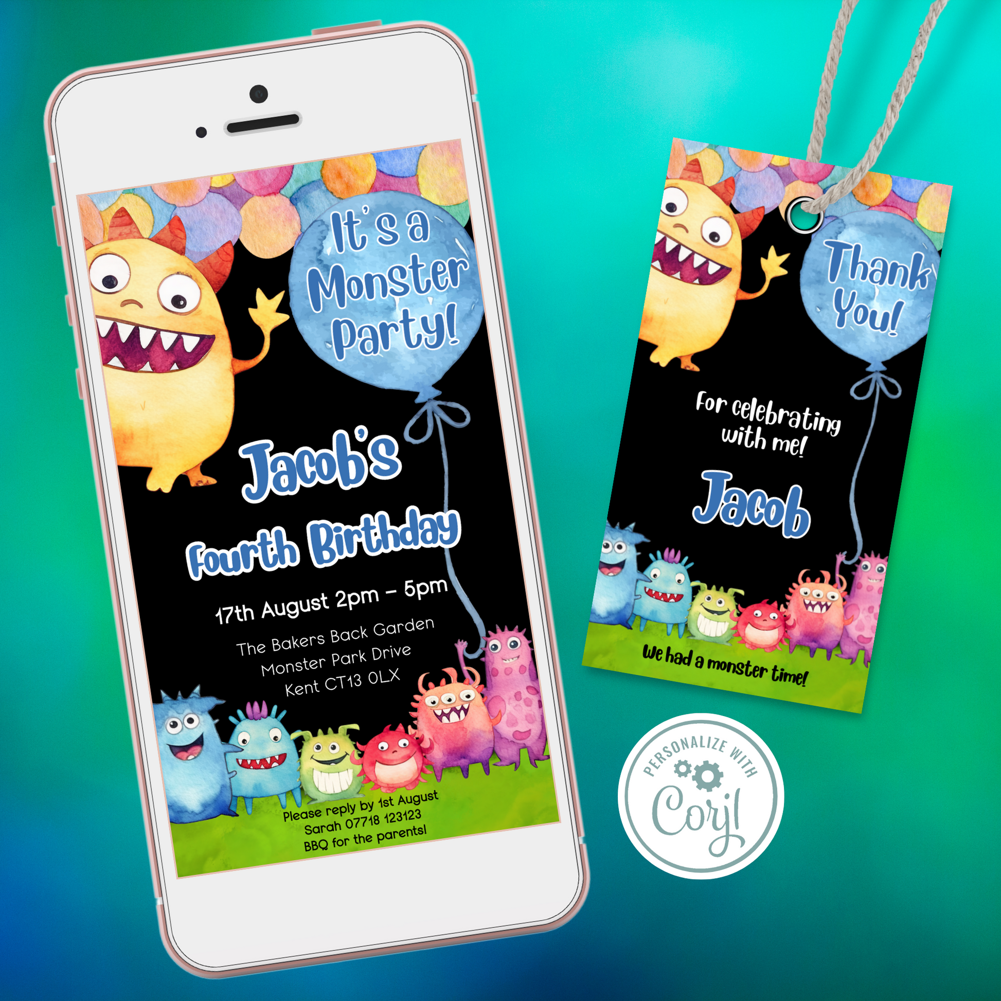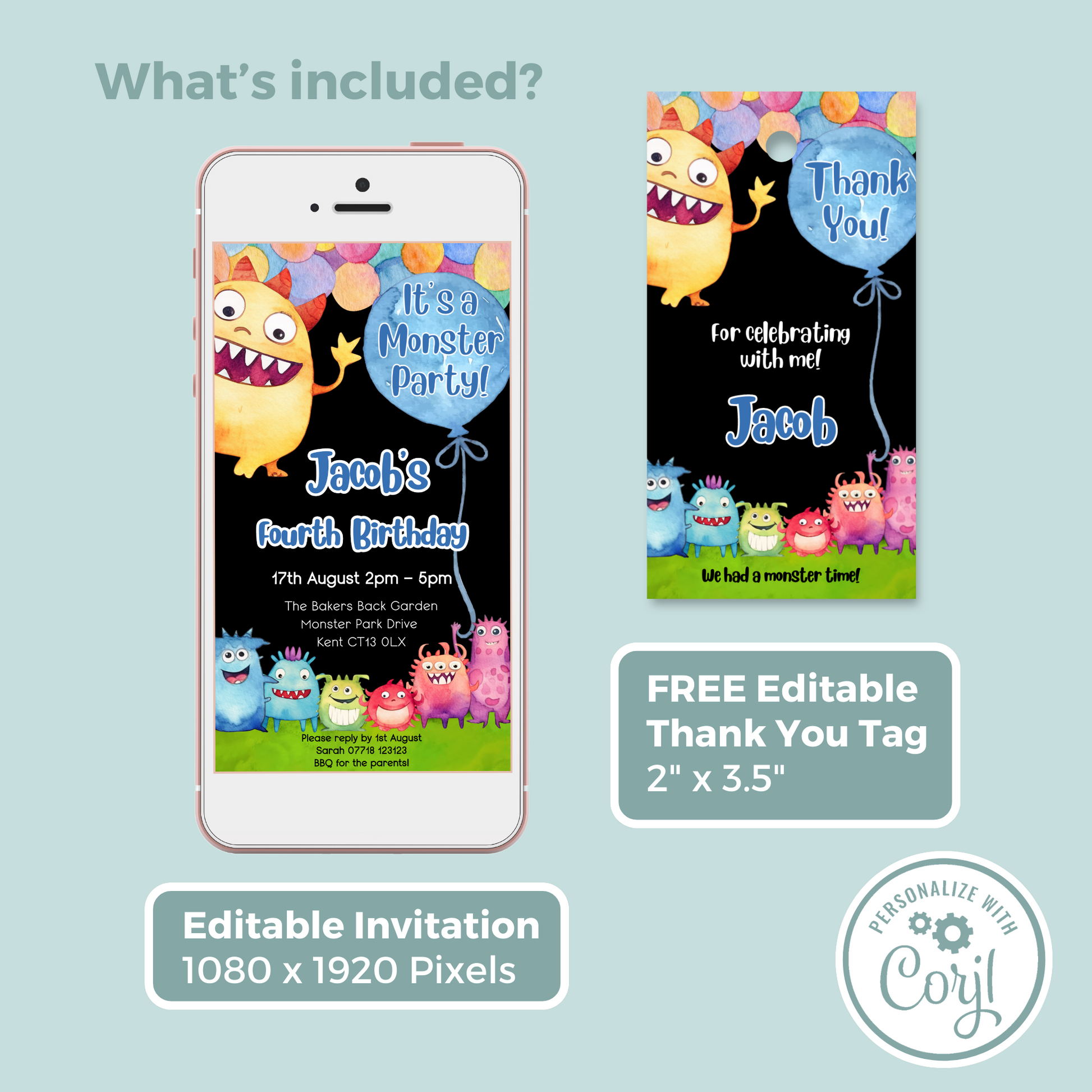 Editable Phone Birthday Invitation and FREE Thank You Tag - Monster