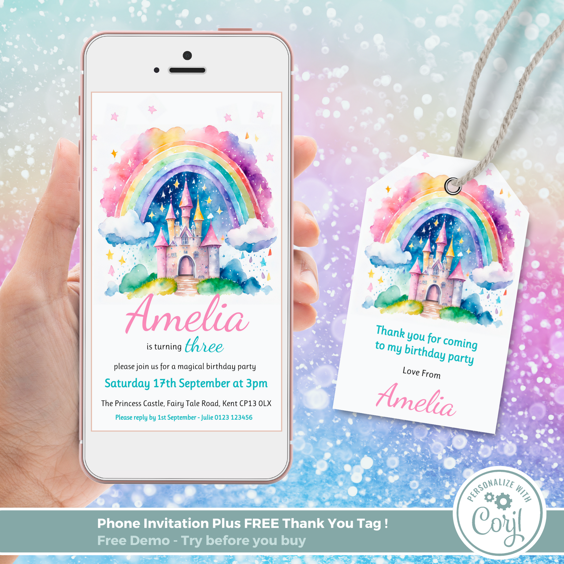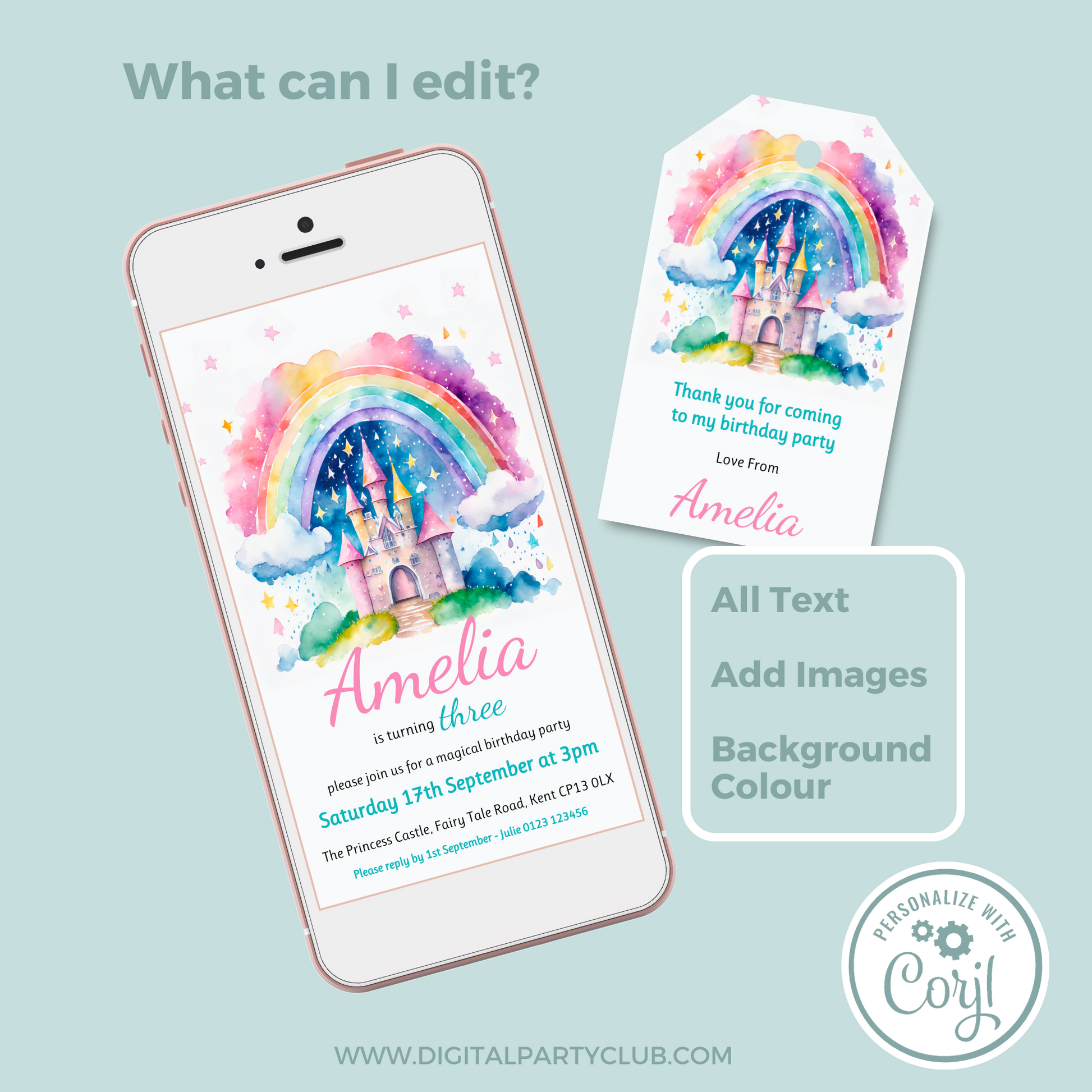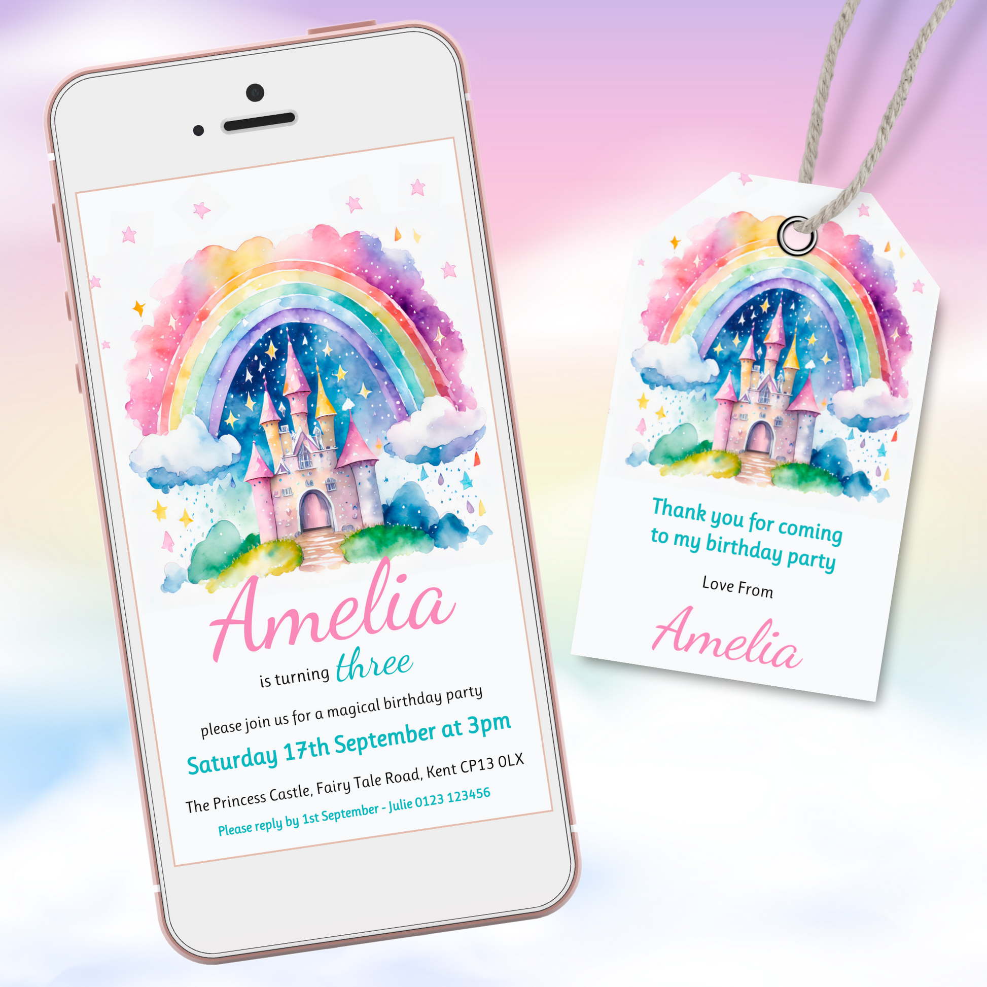 Editable Phone Birthday Invitation and FREE Thank You Tag - Rainbow Castle