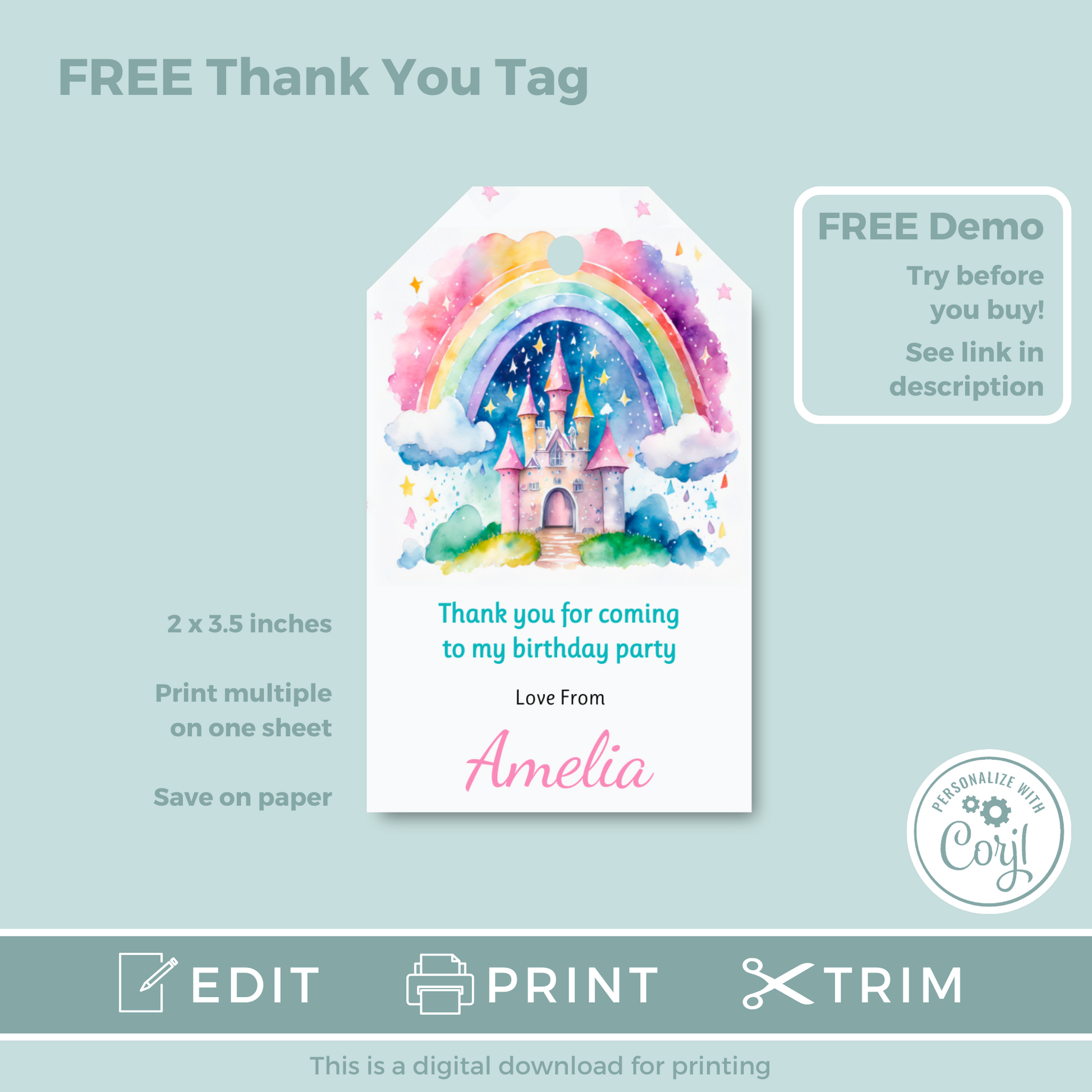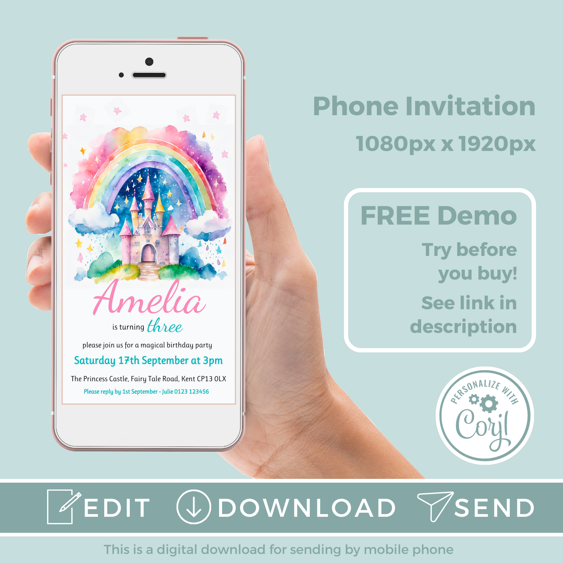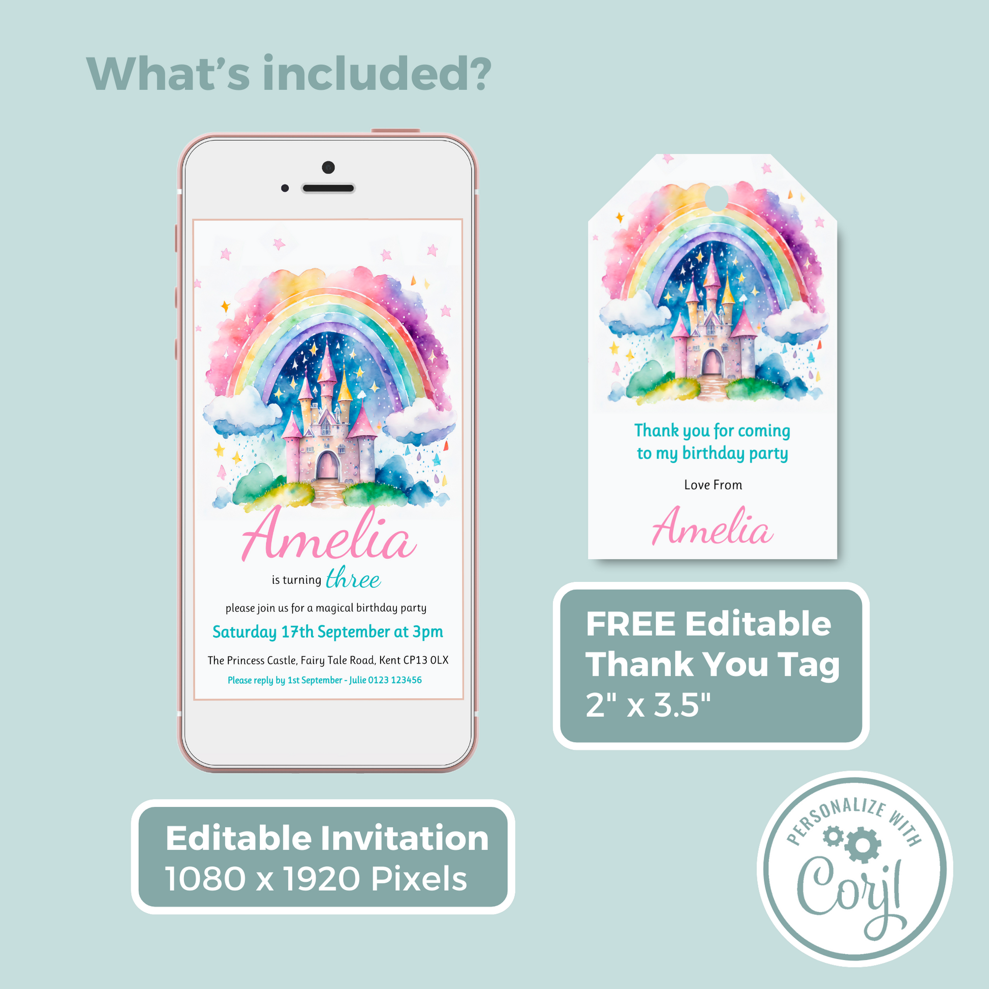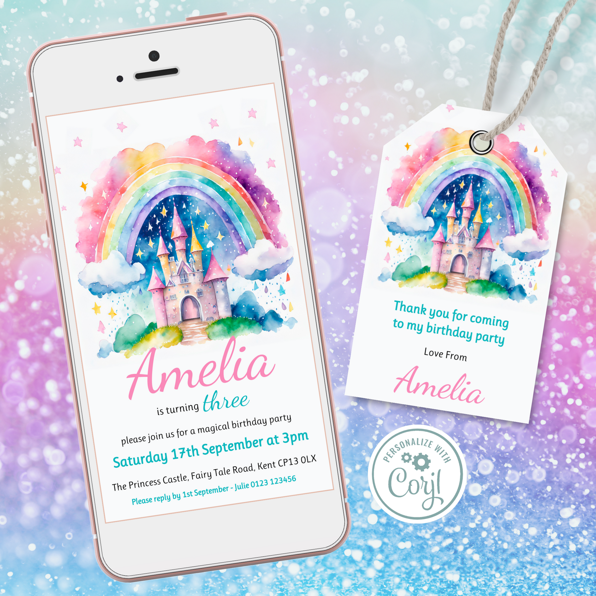 Editable Phone Birthday Invitation and FREE Thank You Tag - Rainbow Castle