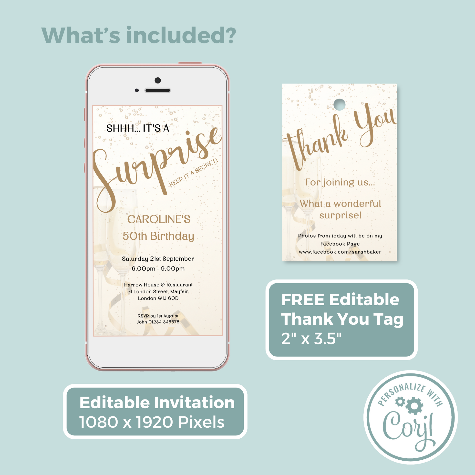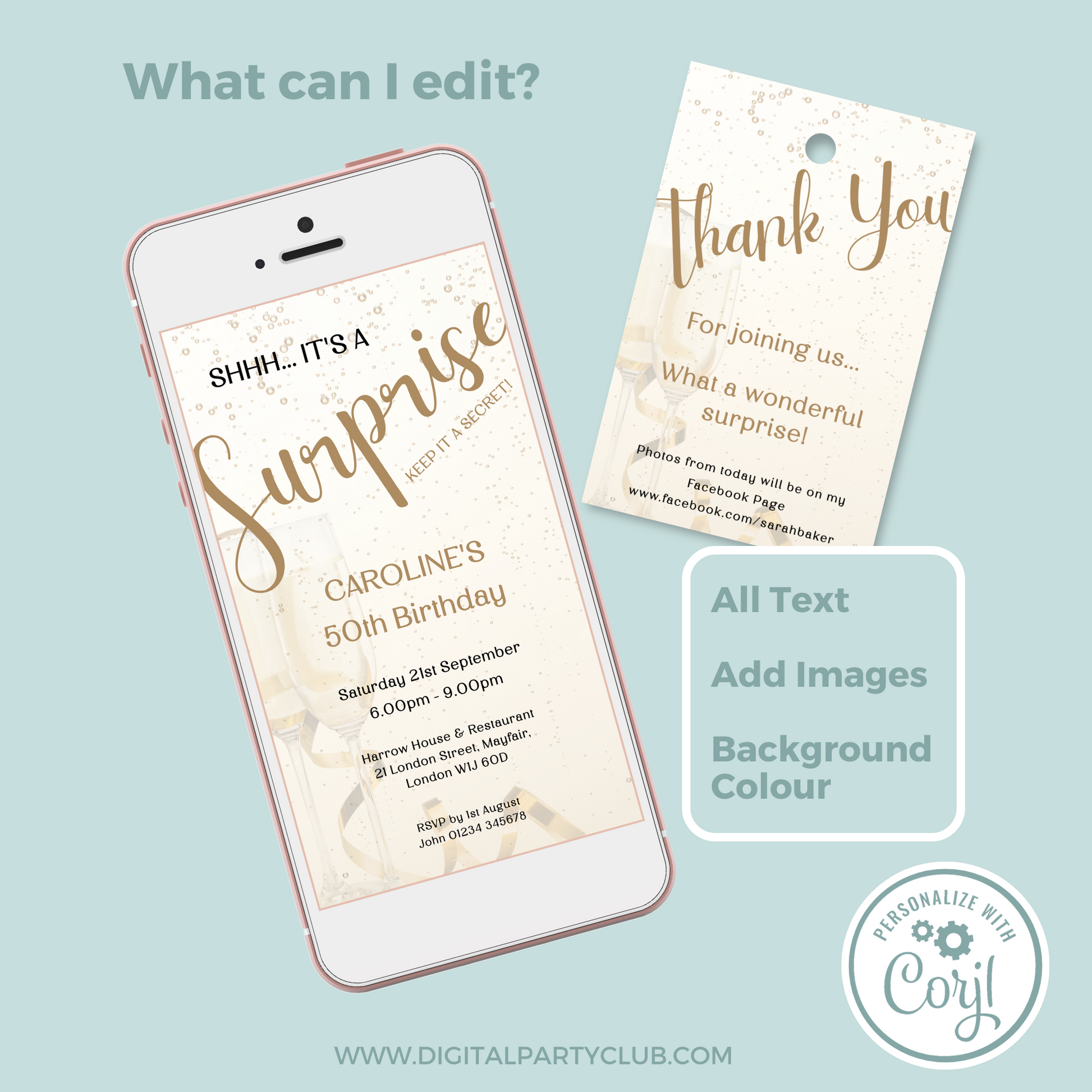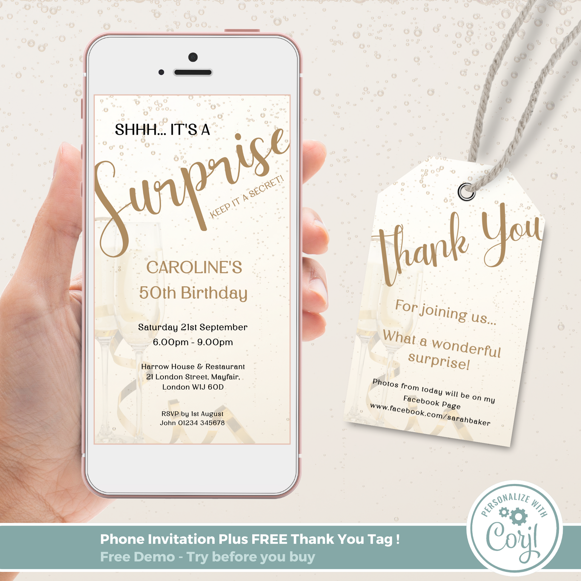 Editable Phone Birthday Invitation and FREE Thank You Tag - Surprise Gold