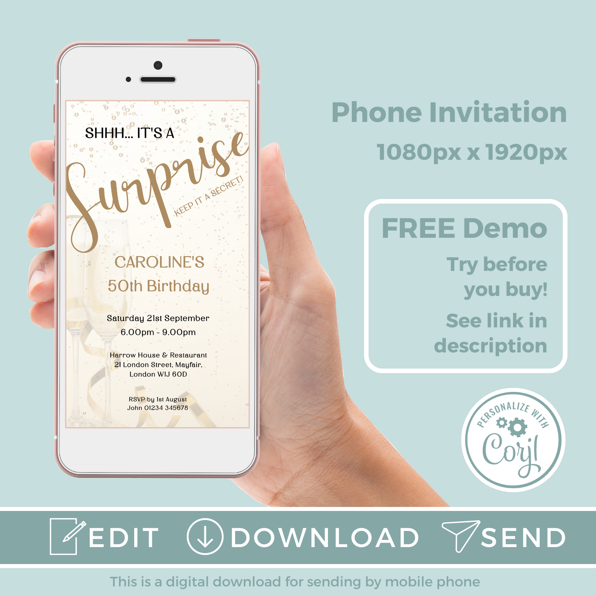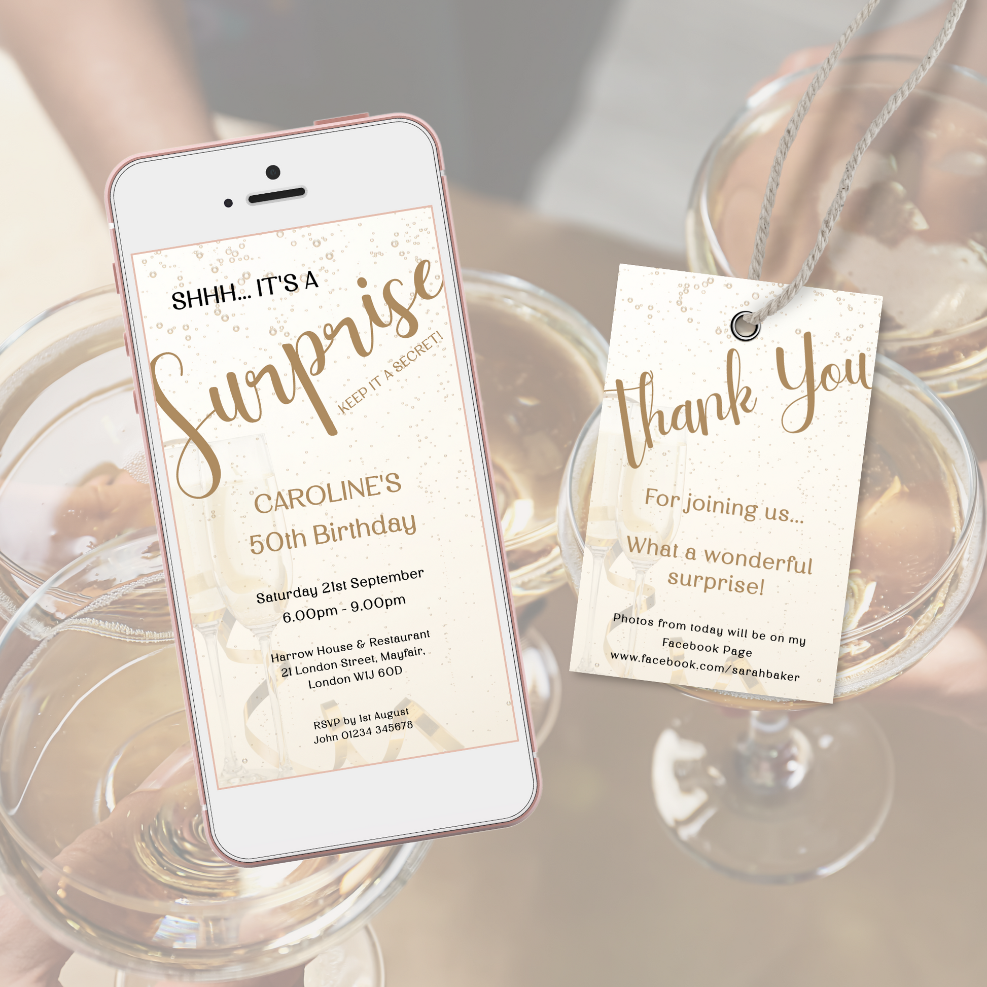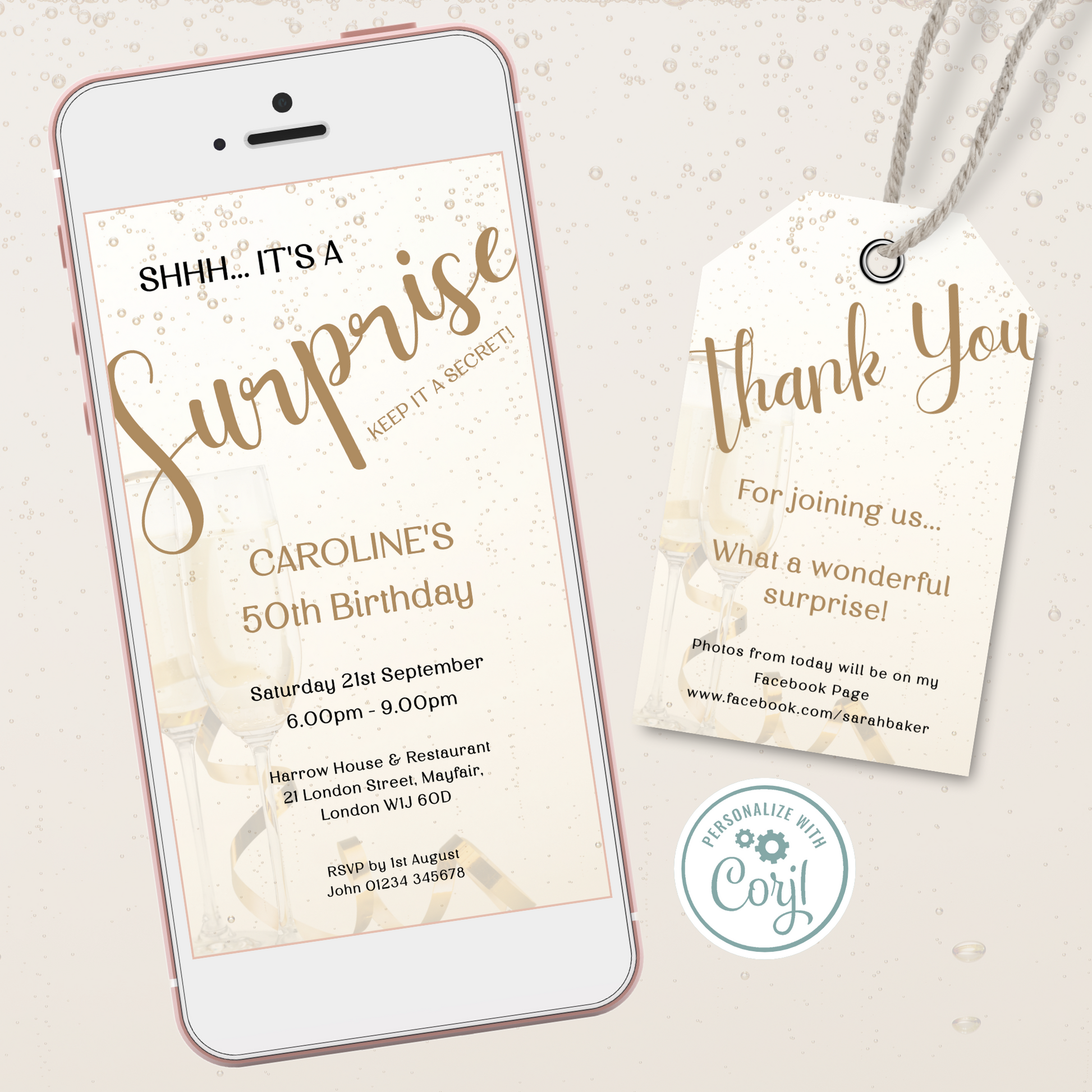 Editable Phone Birthday Invitation and FREE Thank You Tag - Surprise Gold