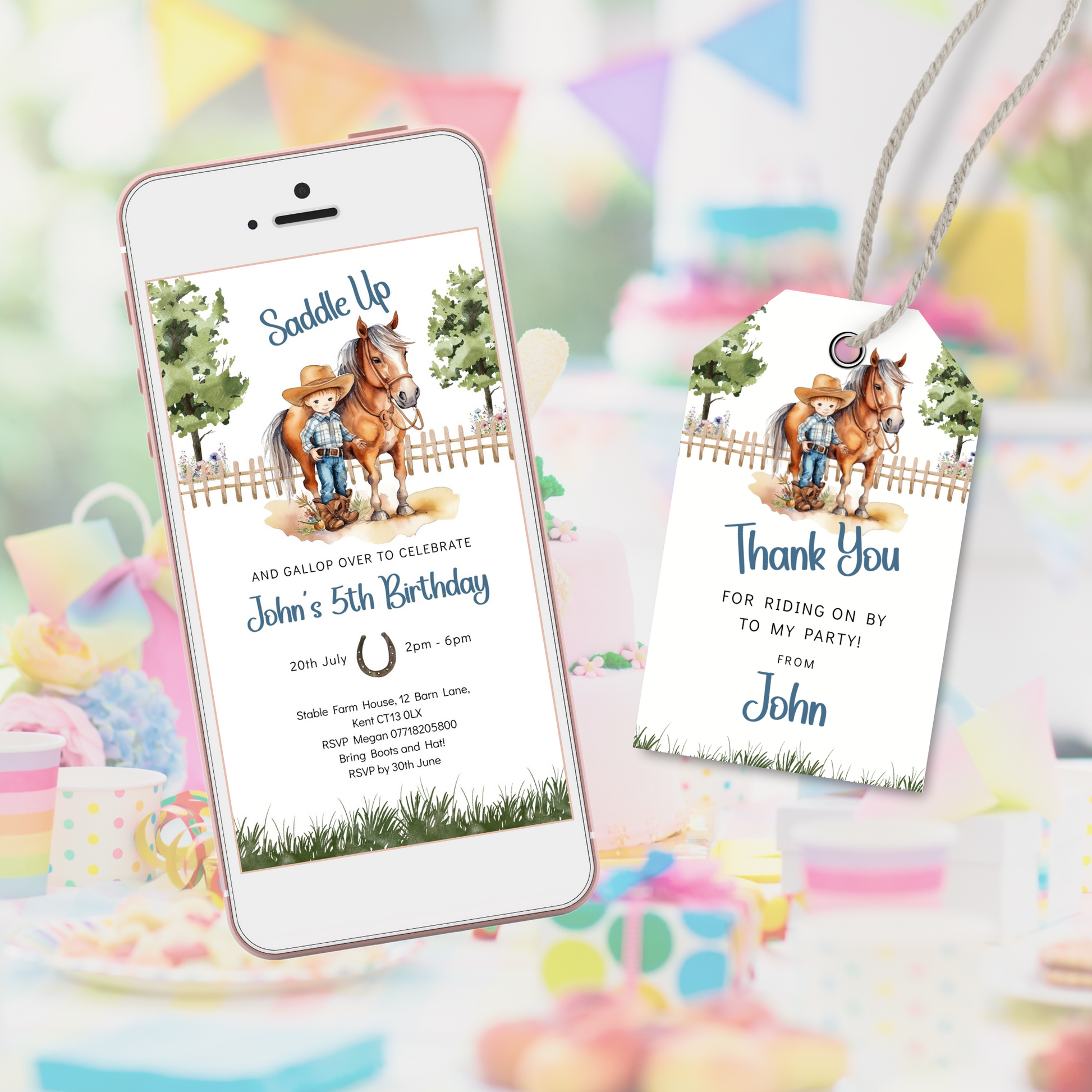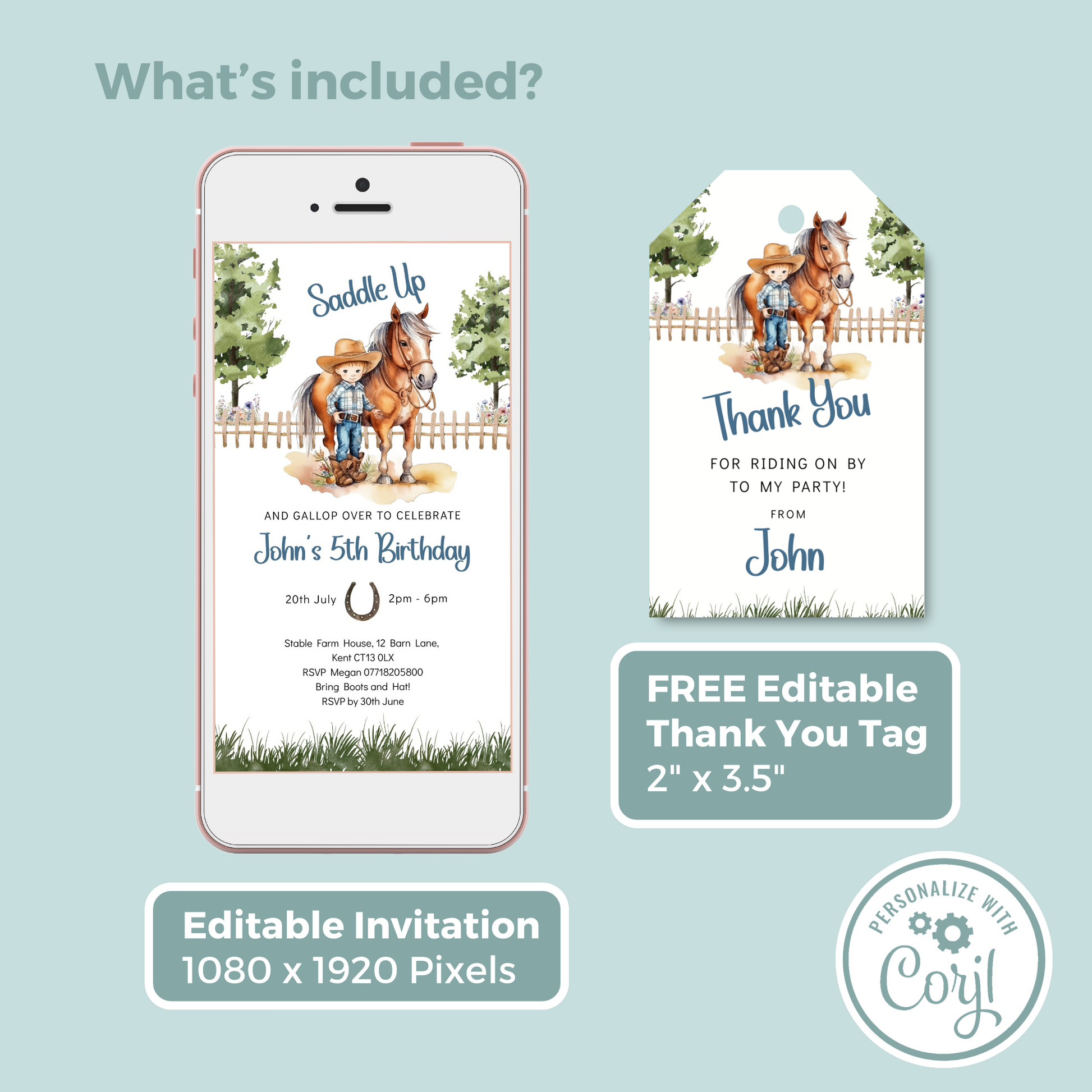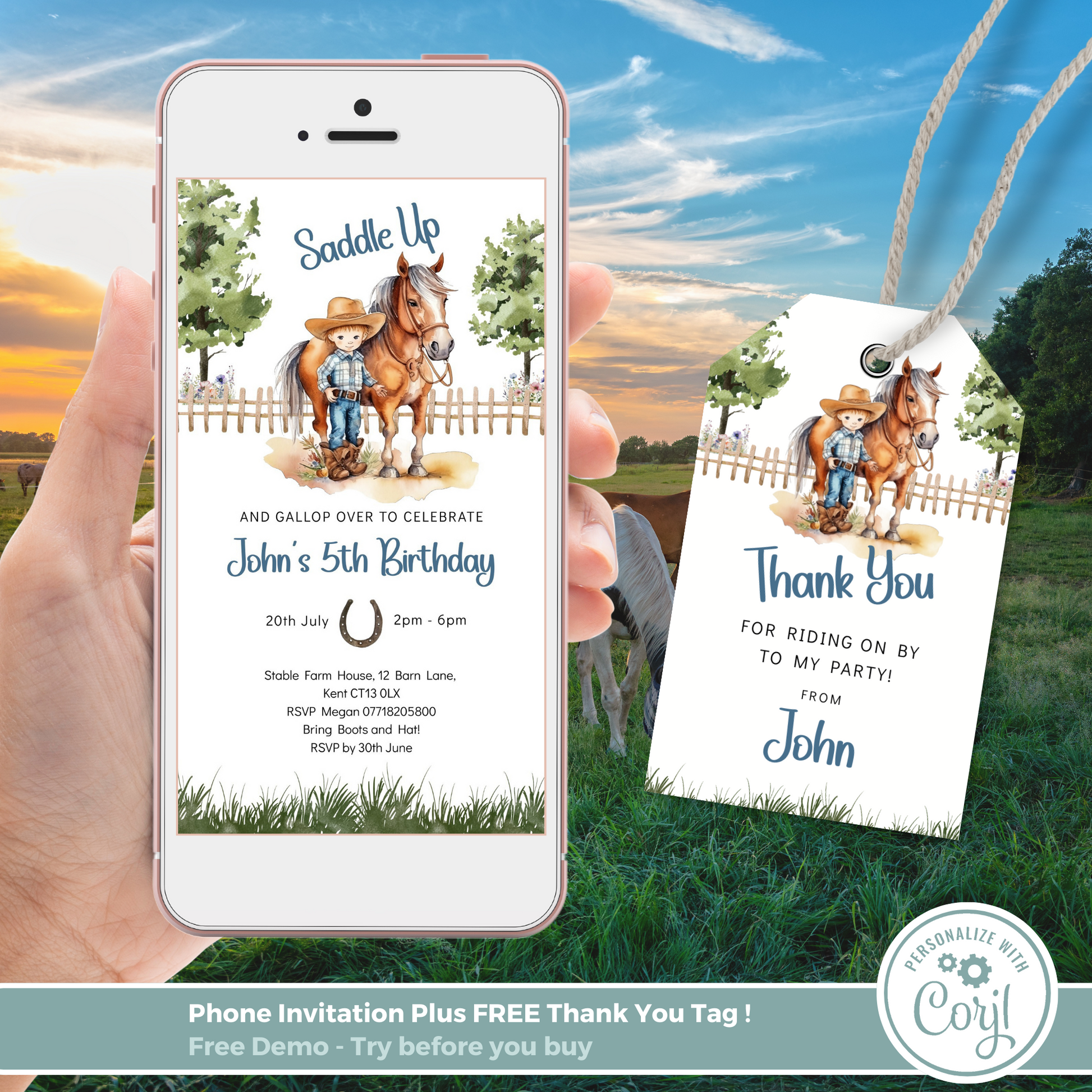 Editable Phone Birthday Invitation and FREE Thank You Tag - Saddle Up Boy
