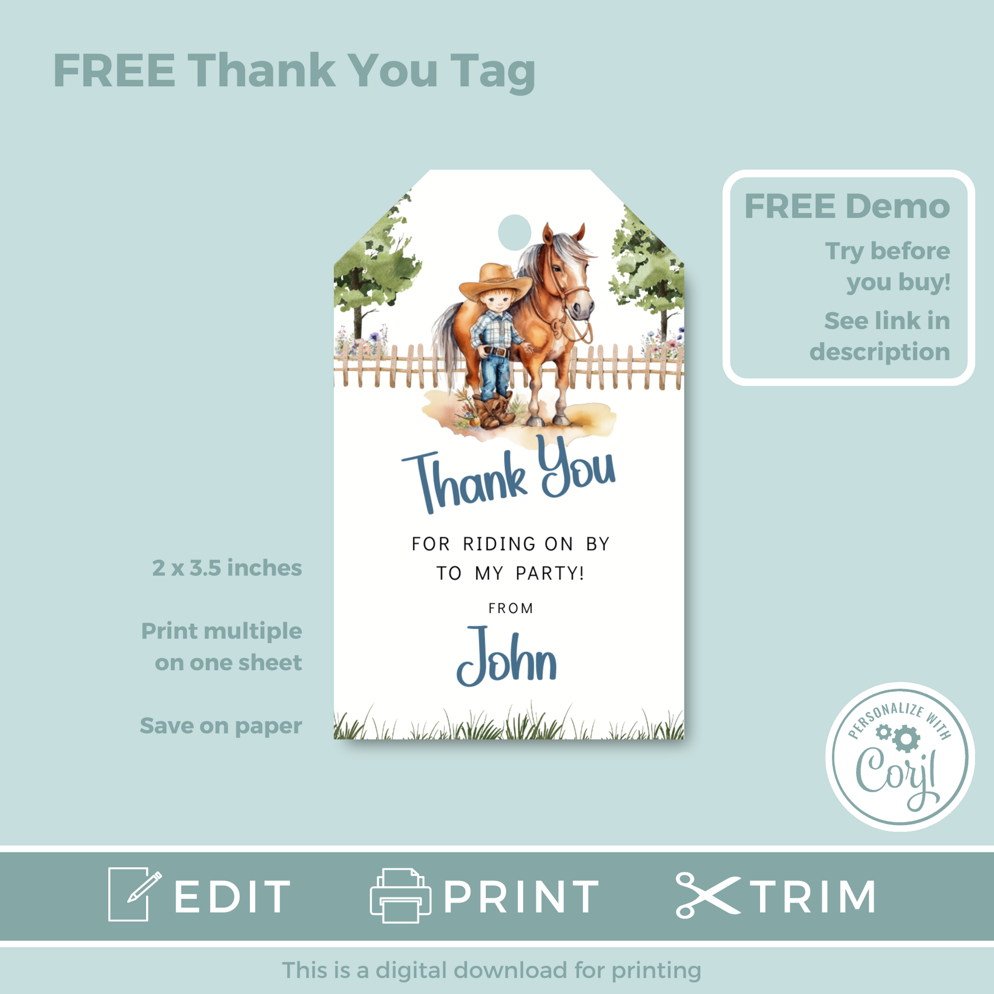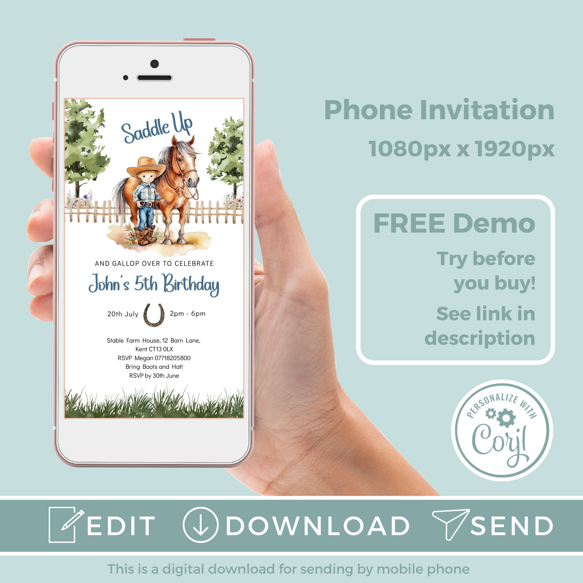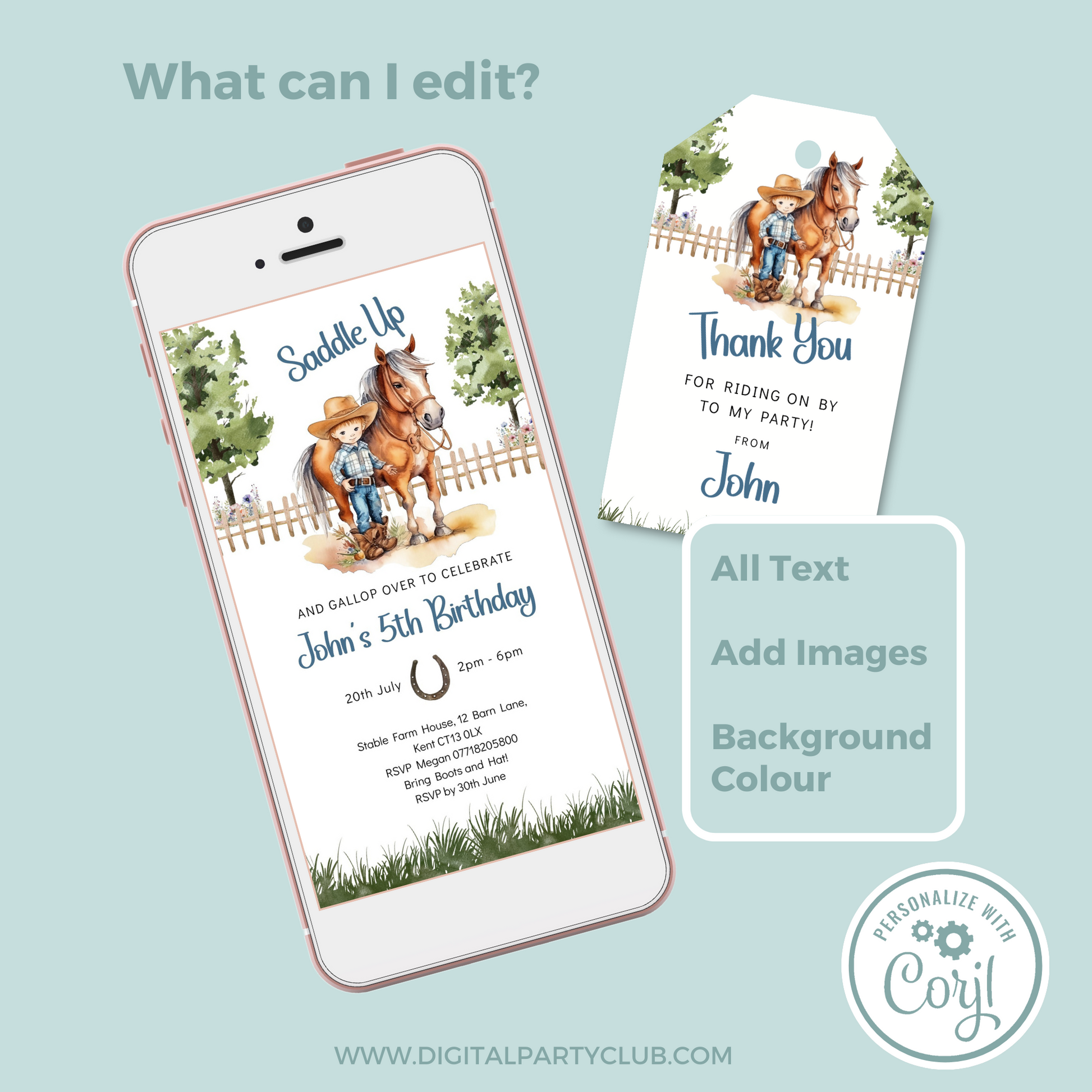 Editable Phone Birthday Invitation and FREE Thank You Tag - Saddle Up Boy