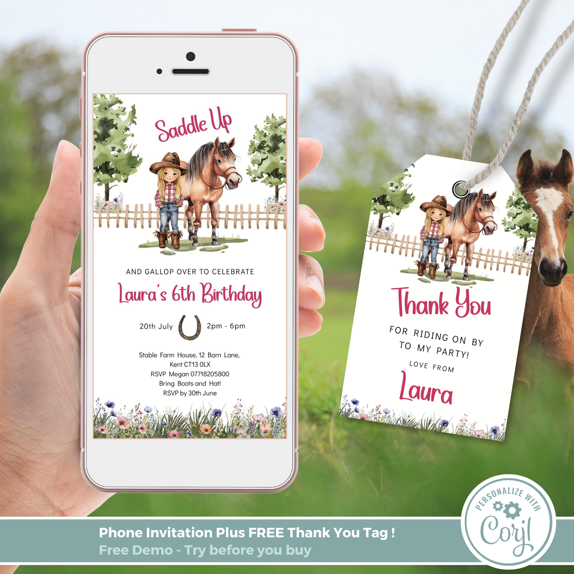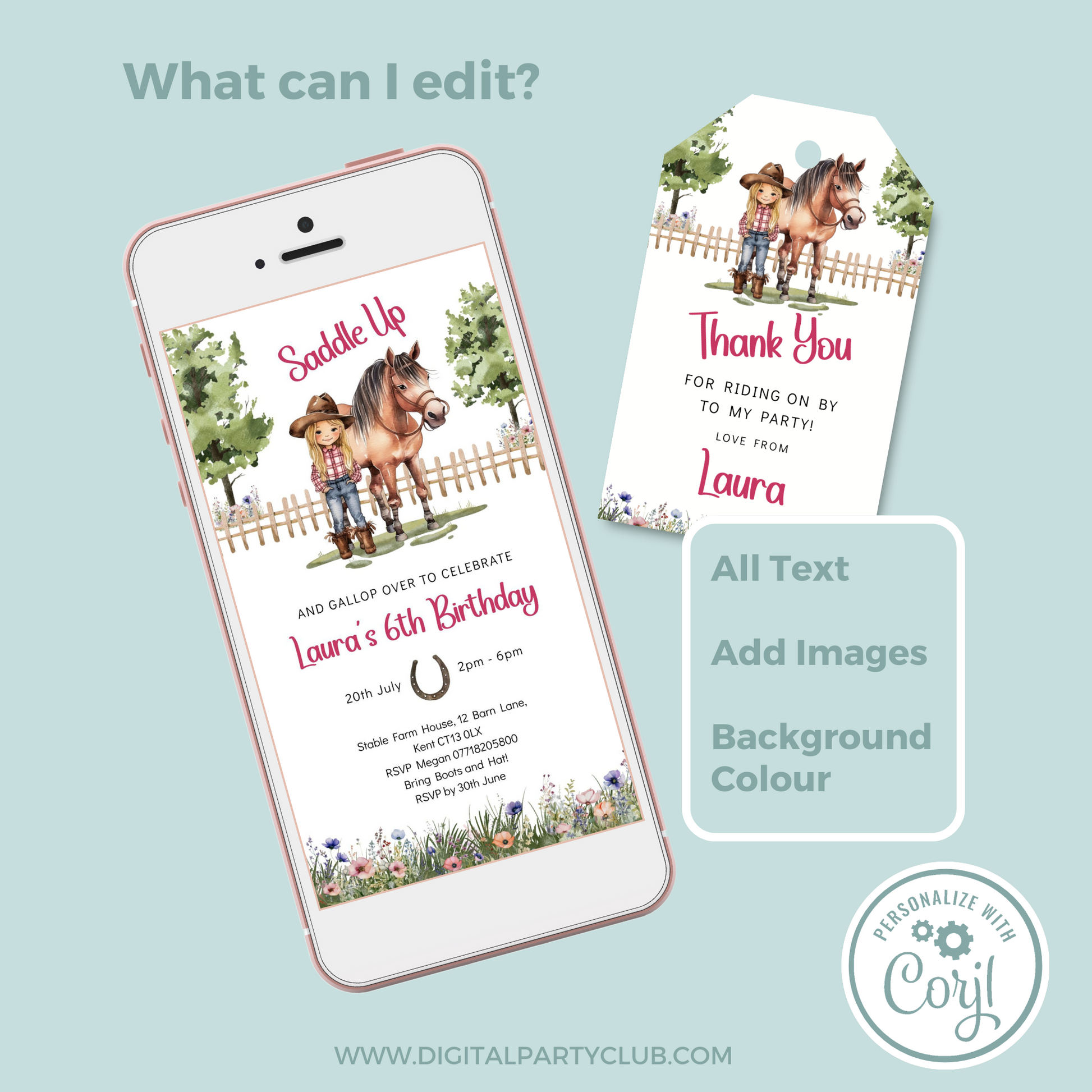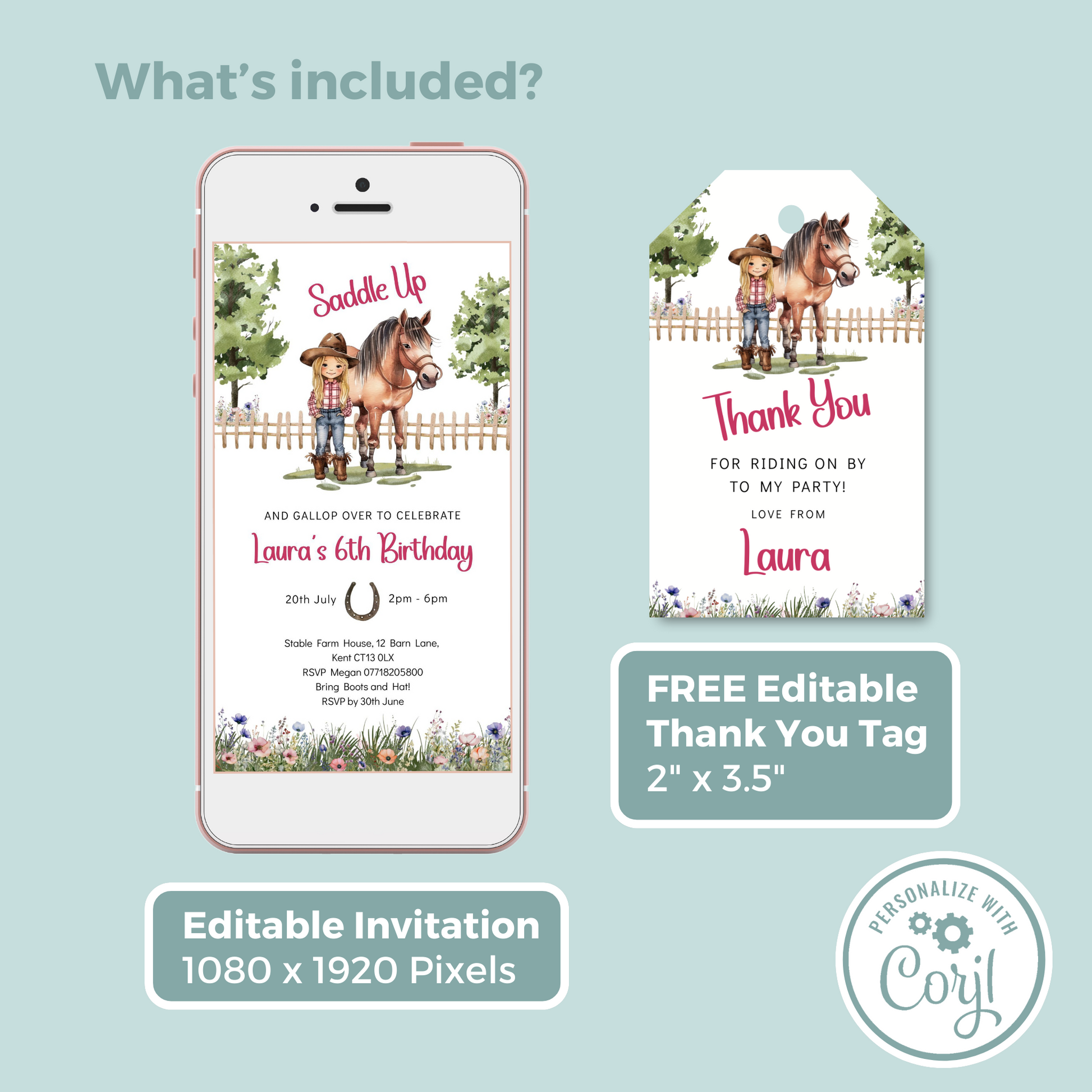 Editable Phone Birthday Invitation and FREE Thank You Tag - Saddle Up Girl