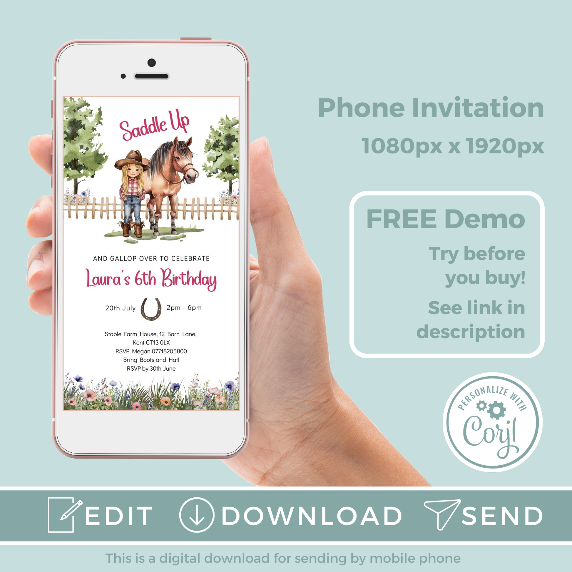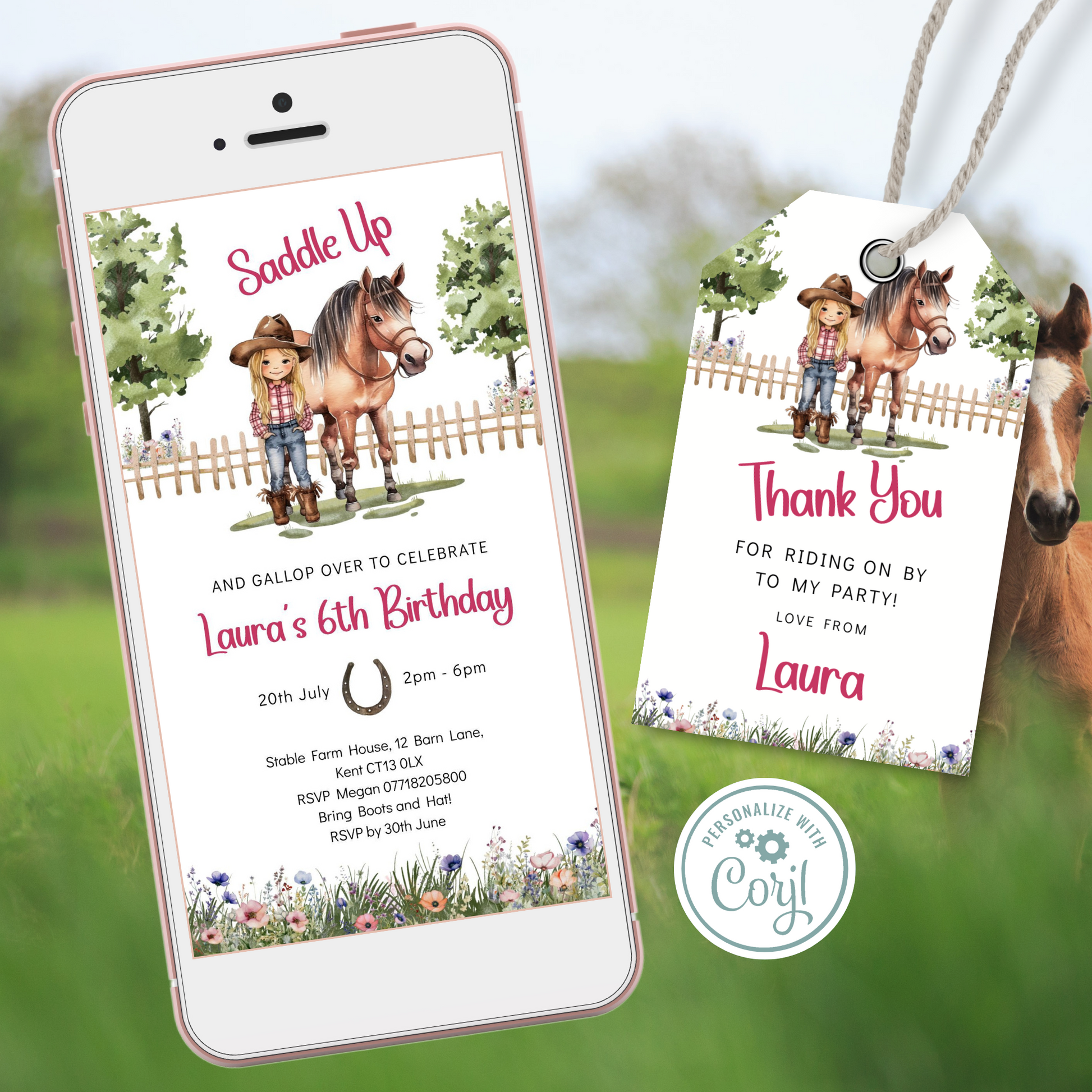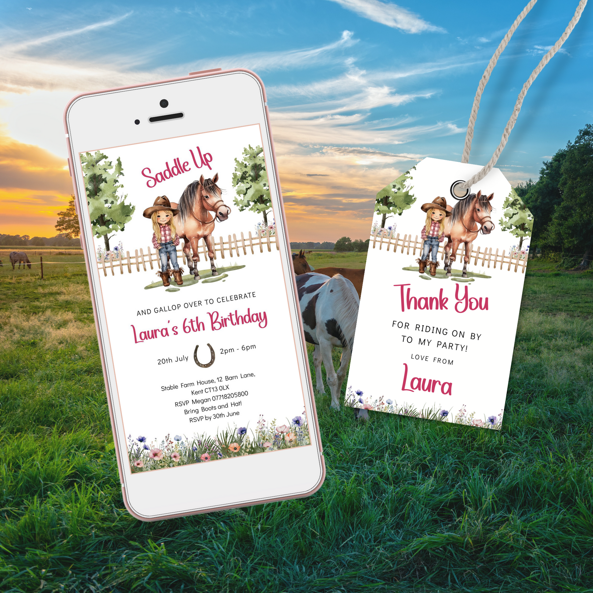 Editable Phone Birthday Invitation and FREE Thank You Tag - Saddle Up Girl