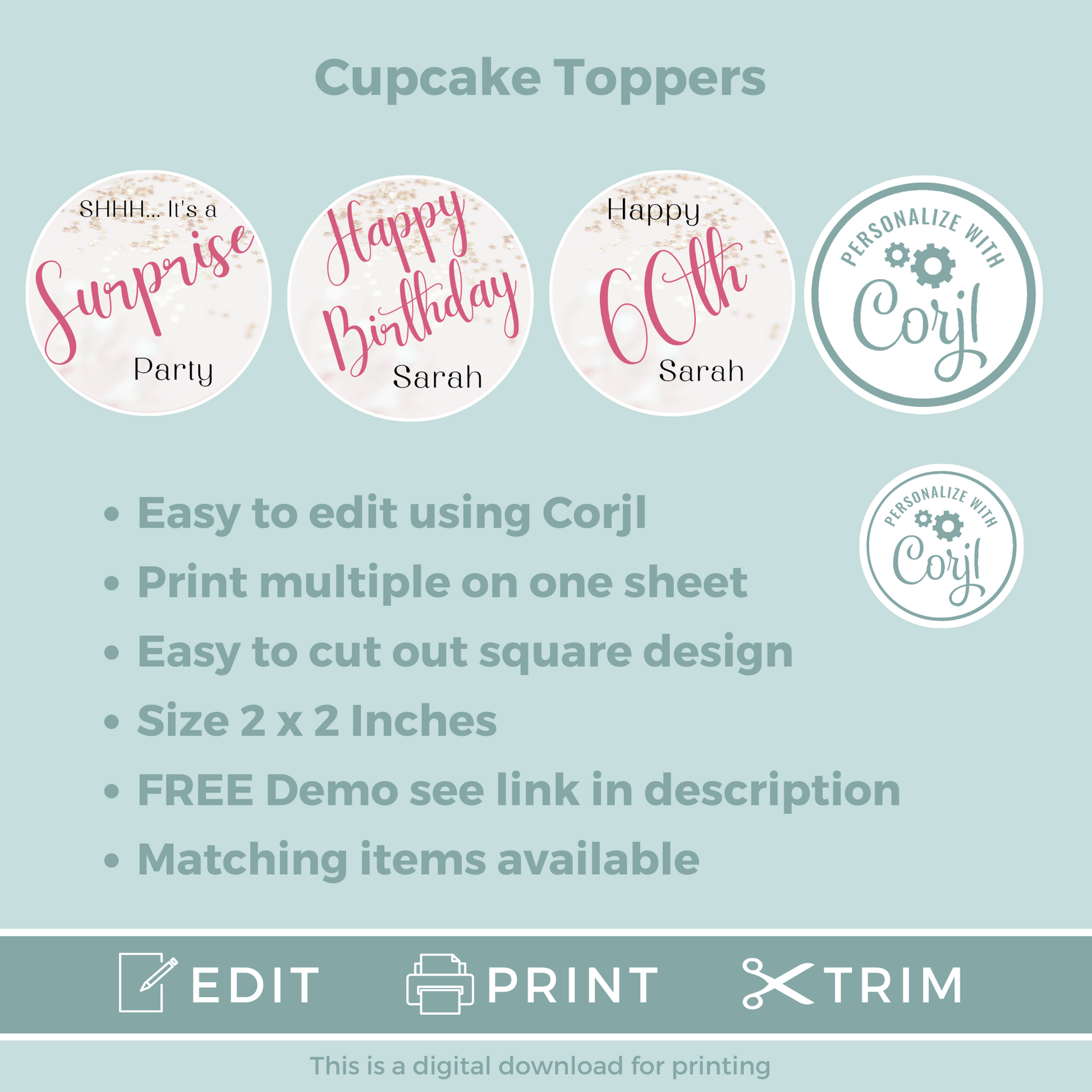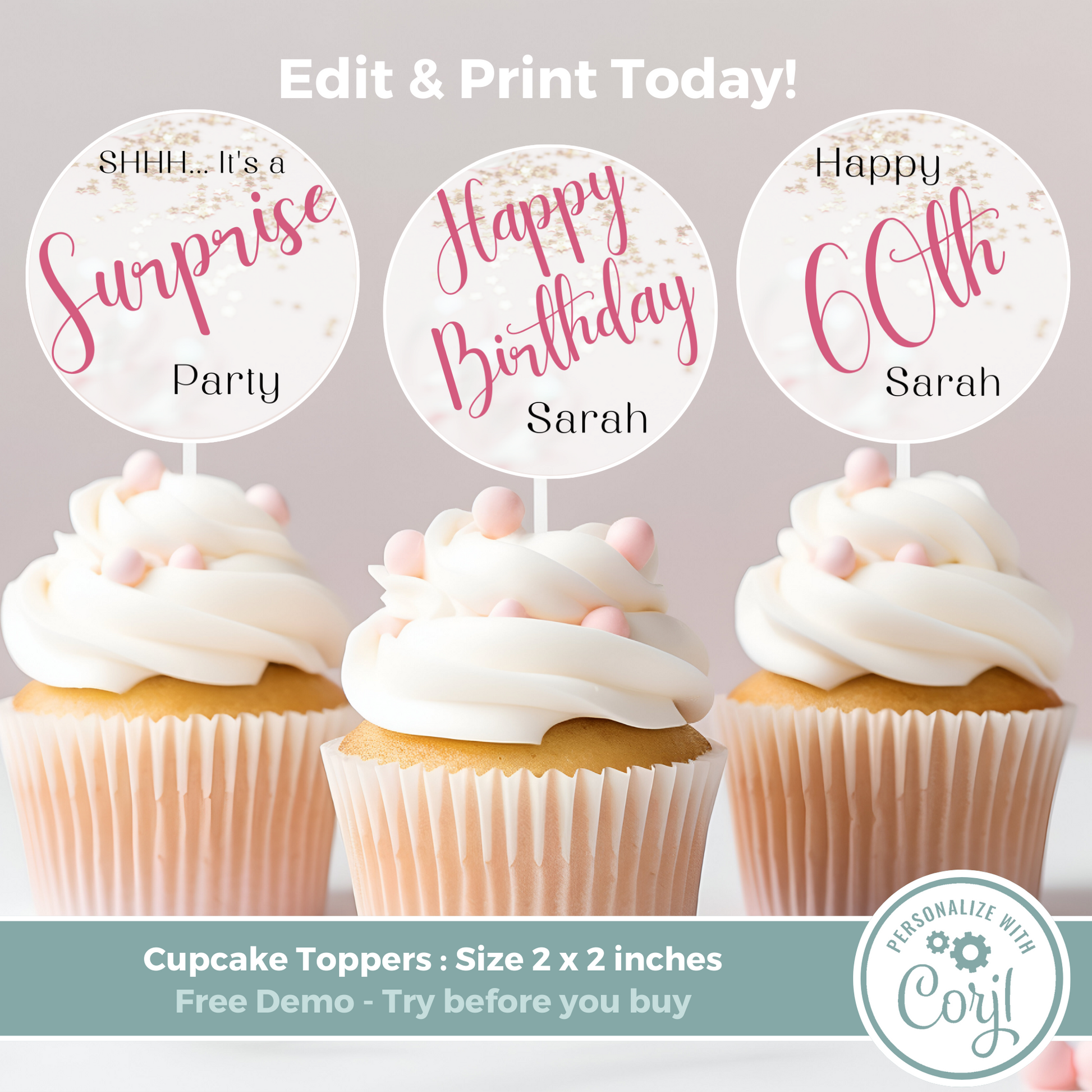 Editable Birthday Cupcake Toppers - Surprise Pink