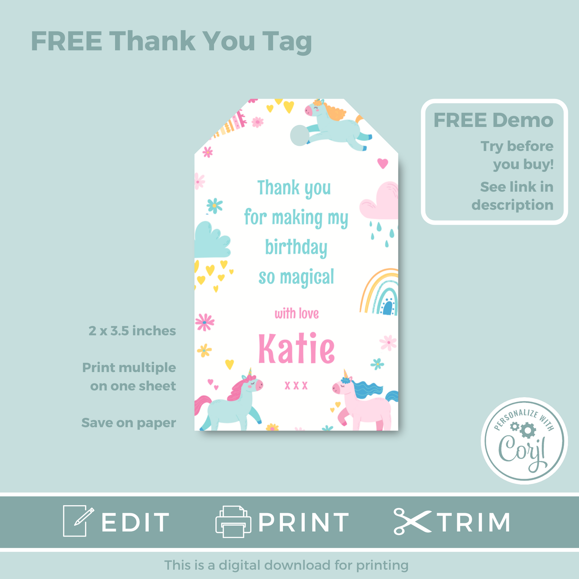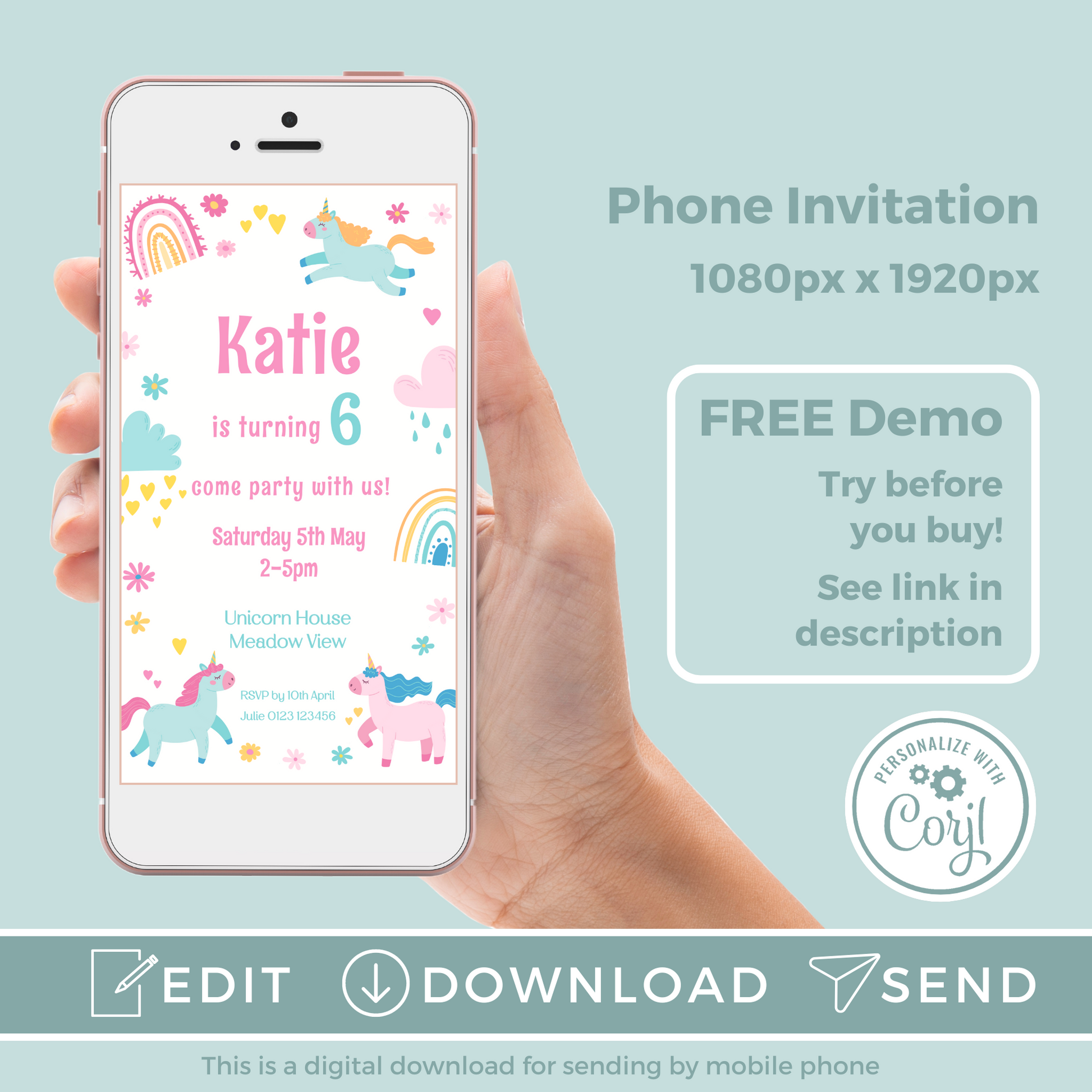 Editable Phone Birthday Invitation and FREE Thank You Tag - Unicorn