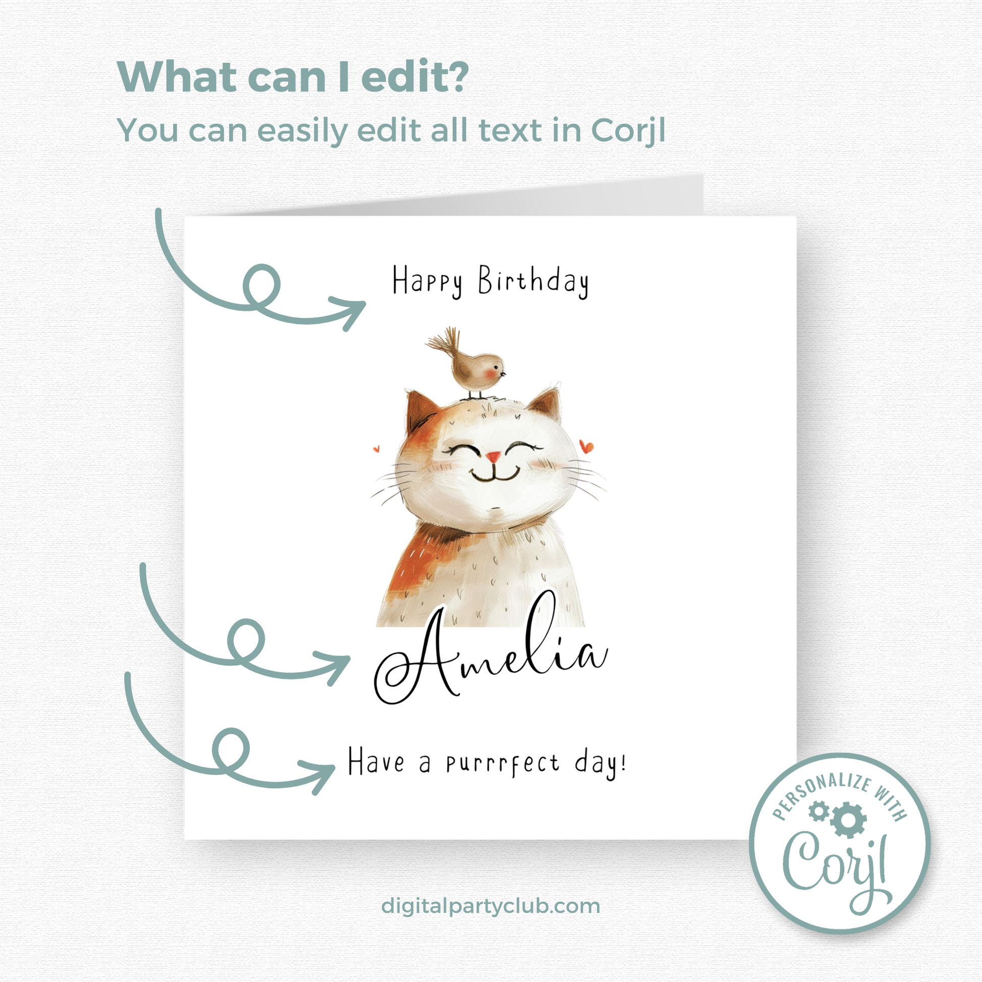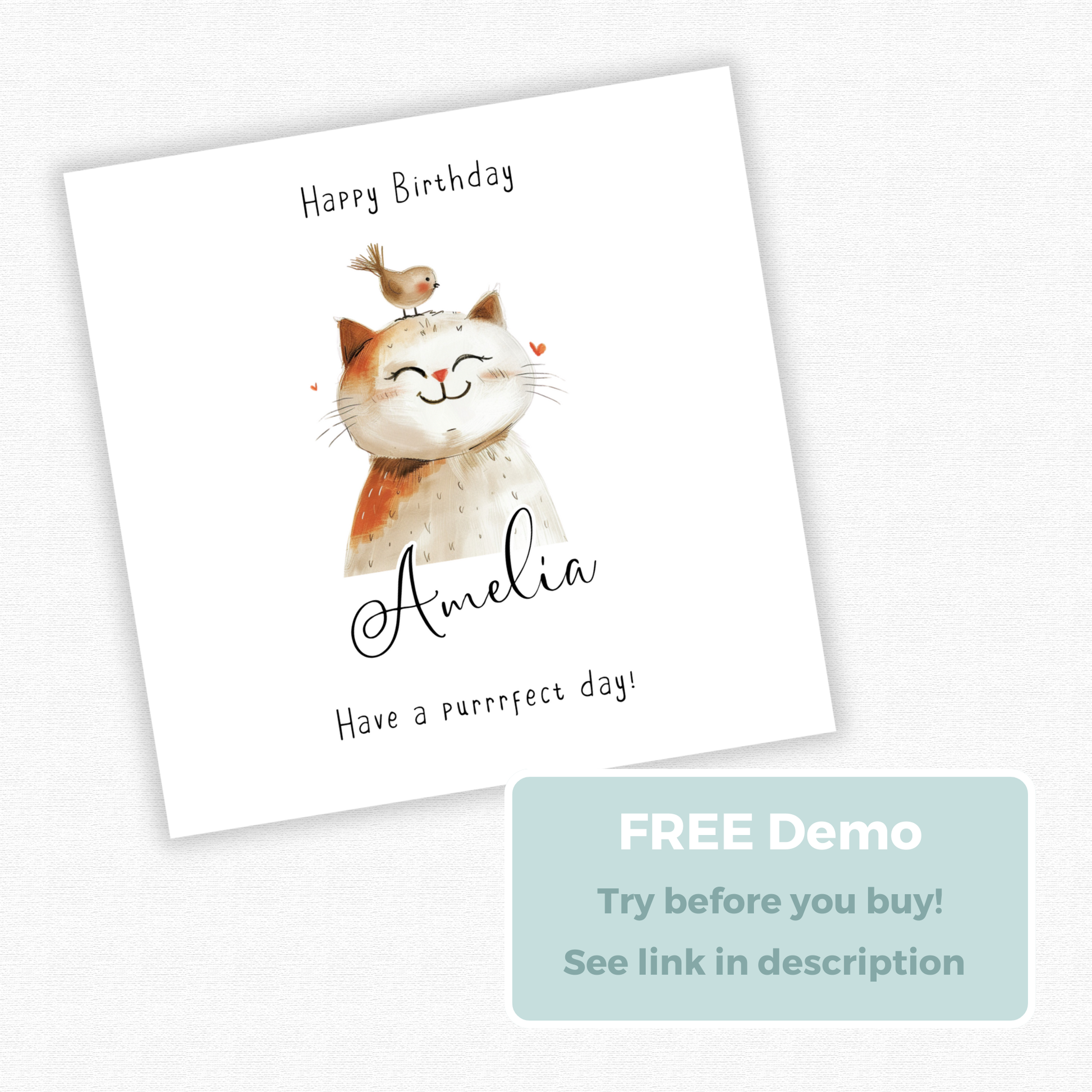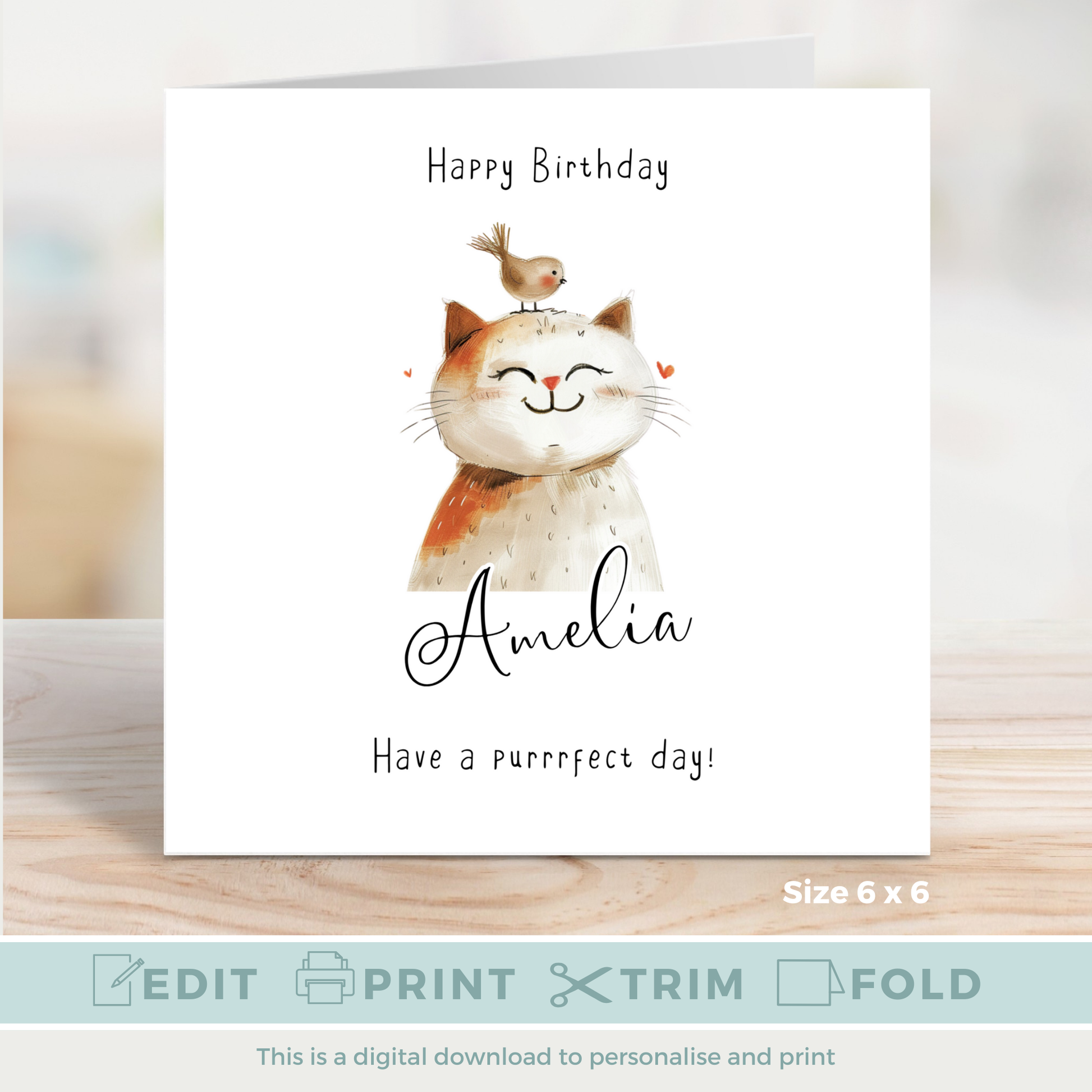 Editable Birthday Card - Cute Cat with Bird