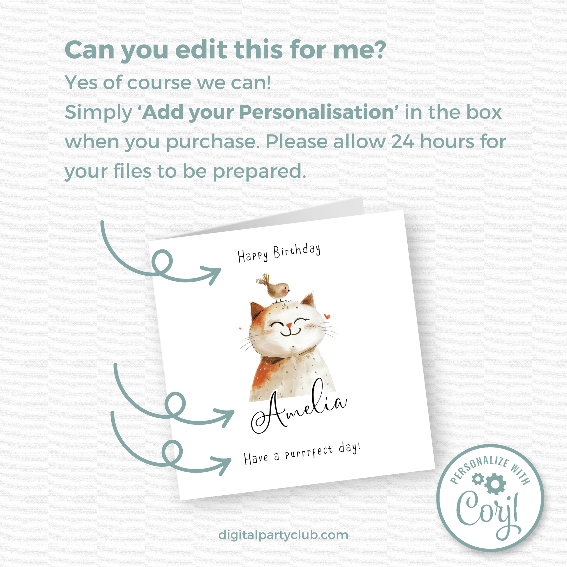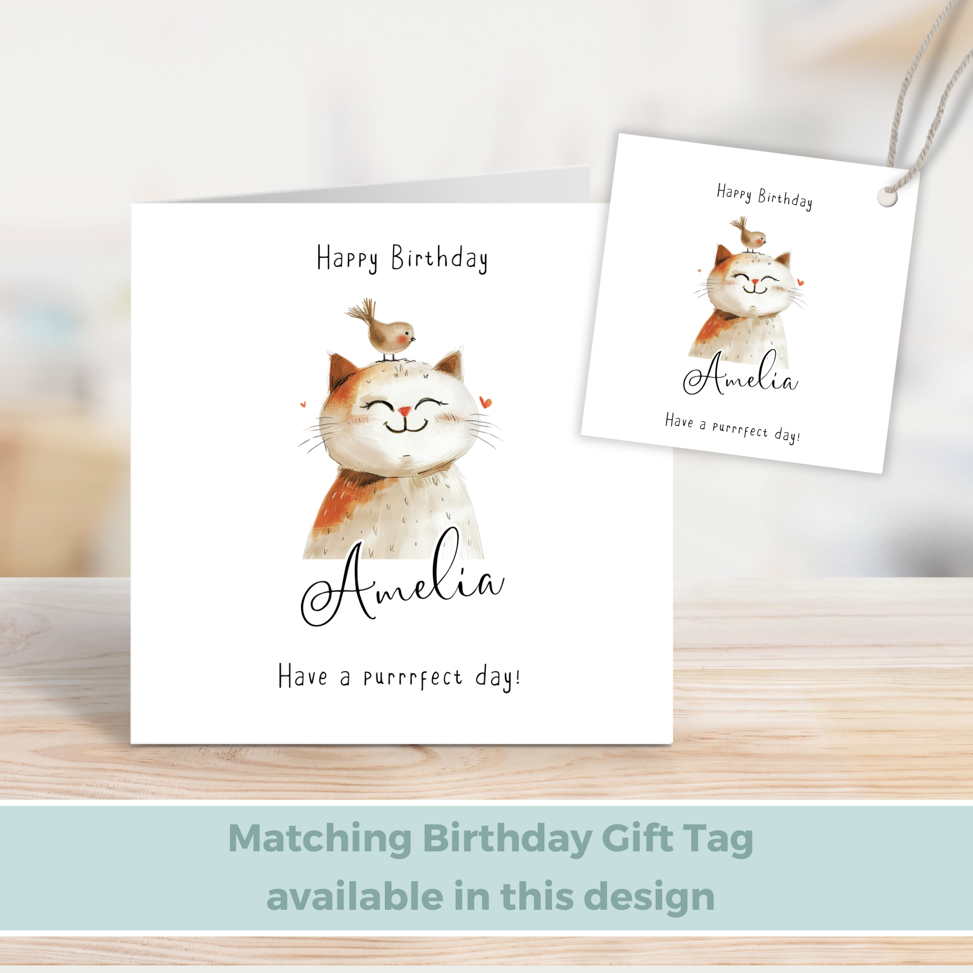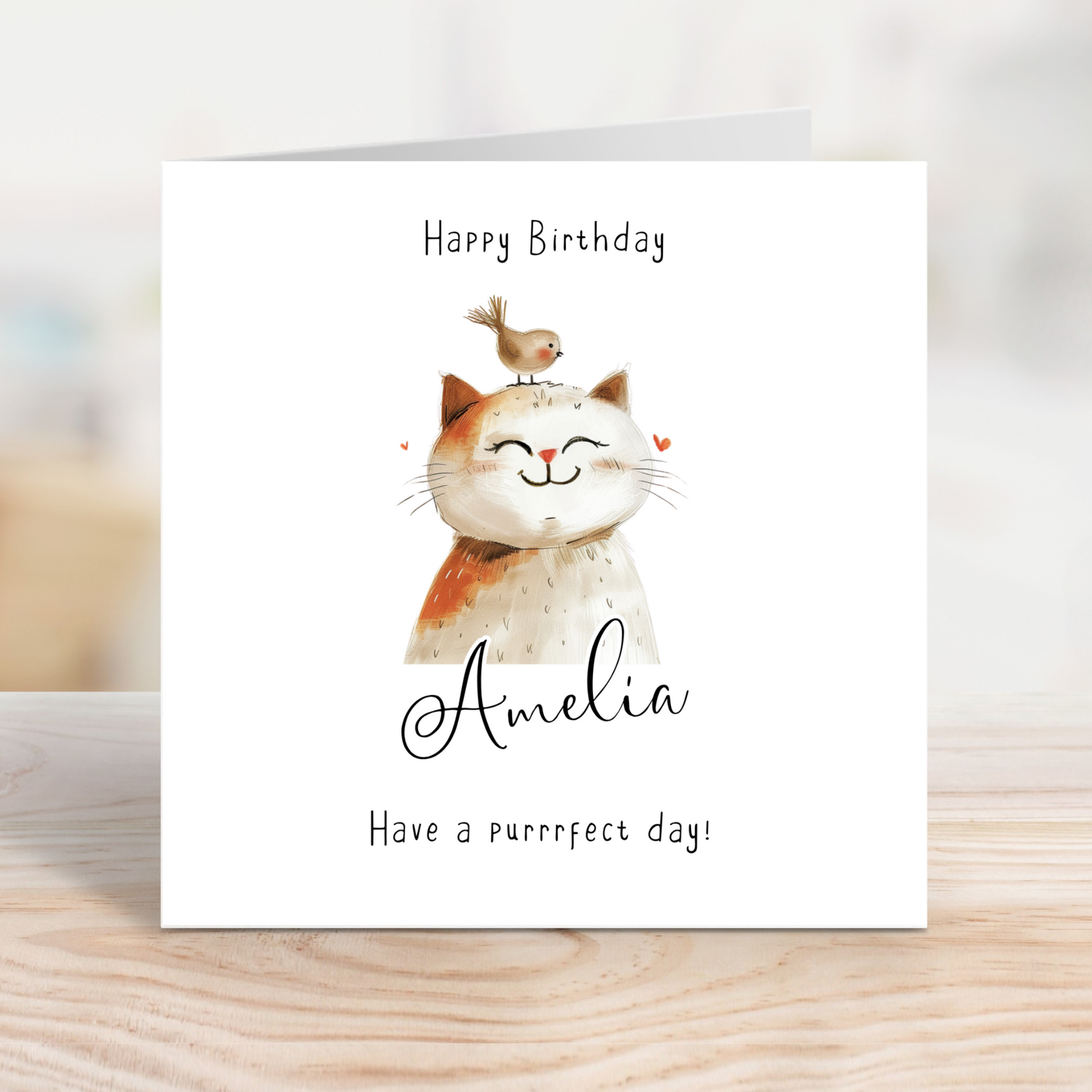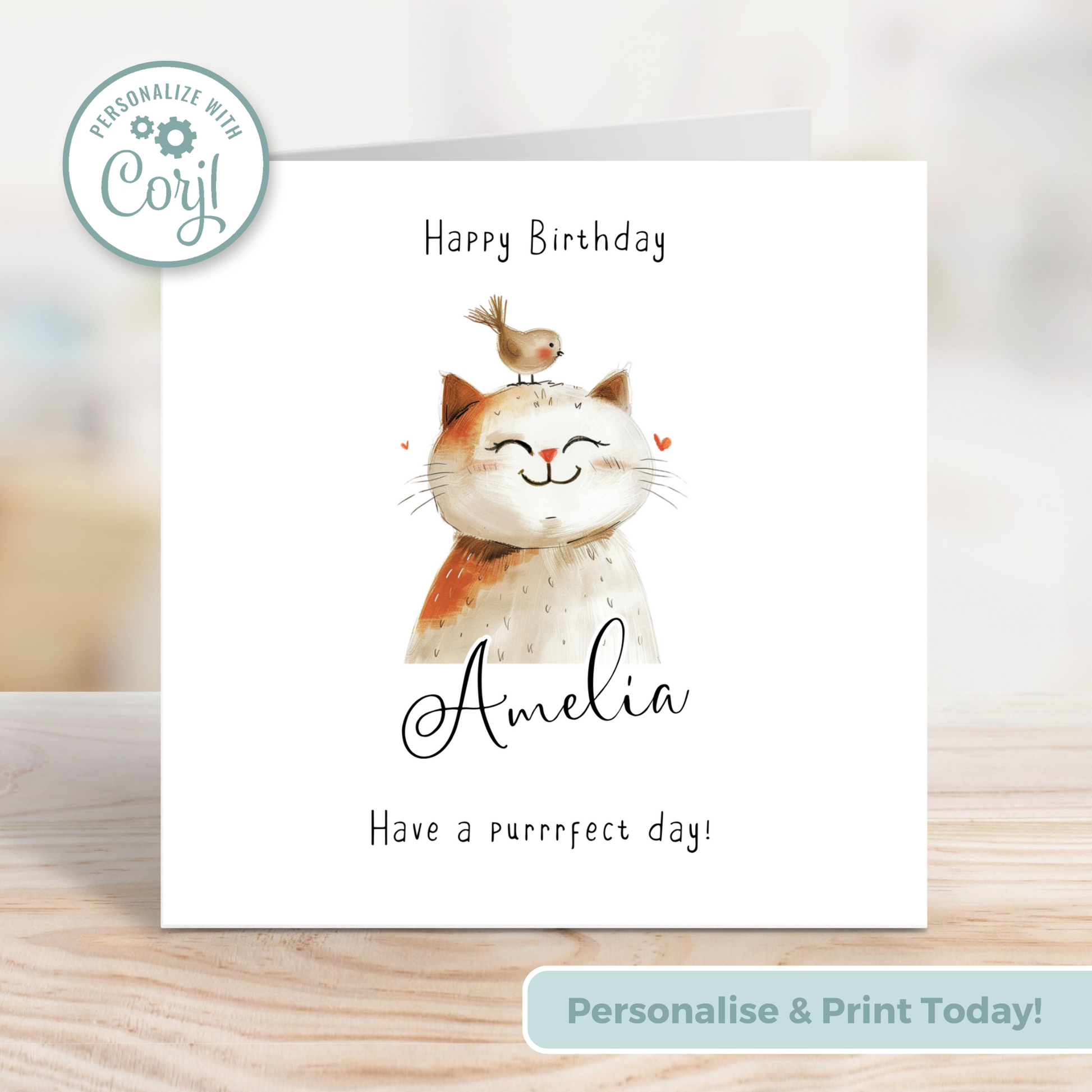 Editable Birthday Card - Cute Cat with Bird