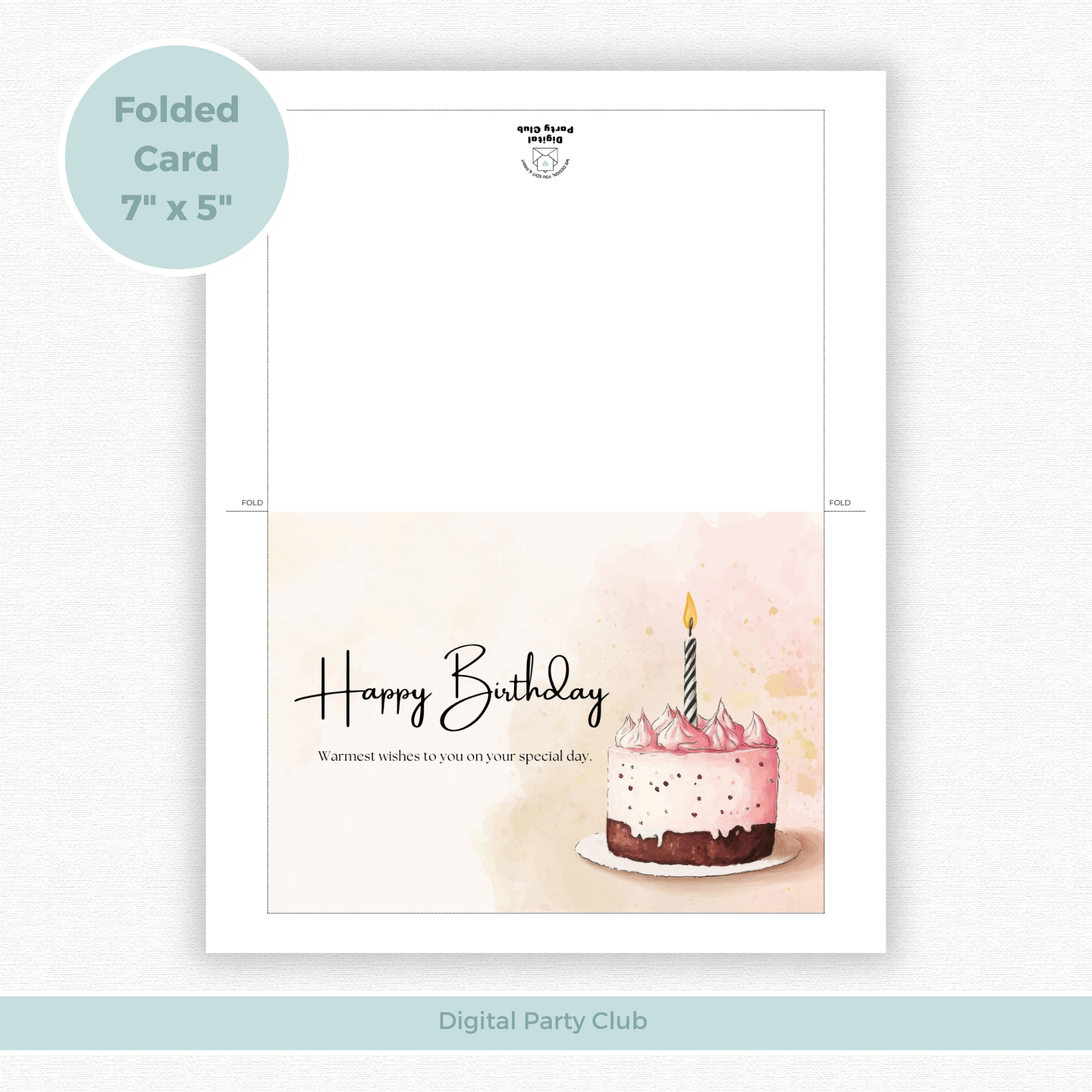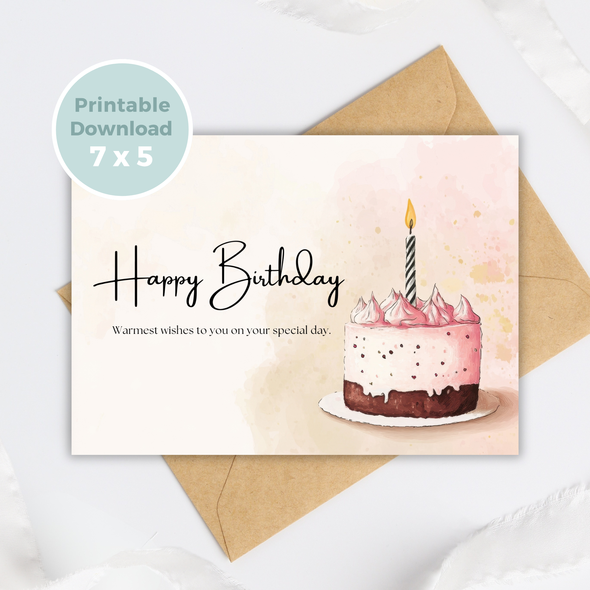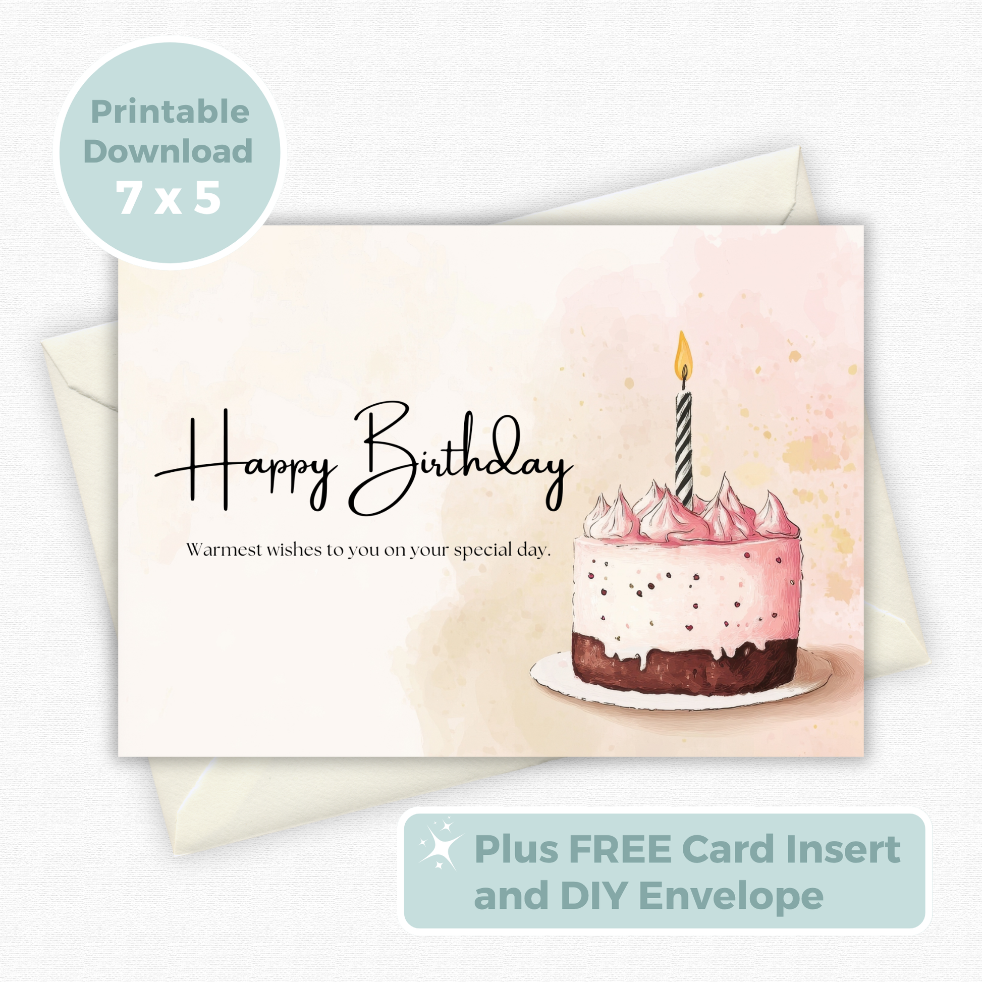 Celebrate in style with this elegant printable birthday card featuring a watercolour cake and heartfelt message.